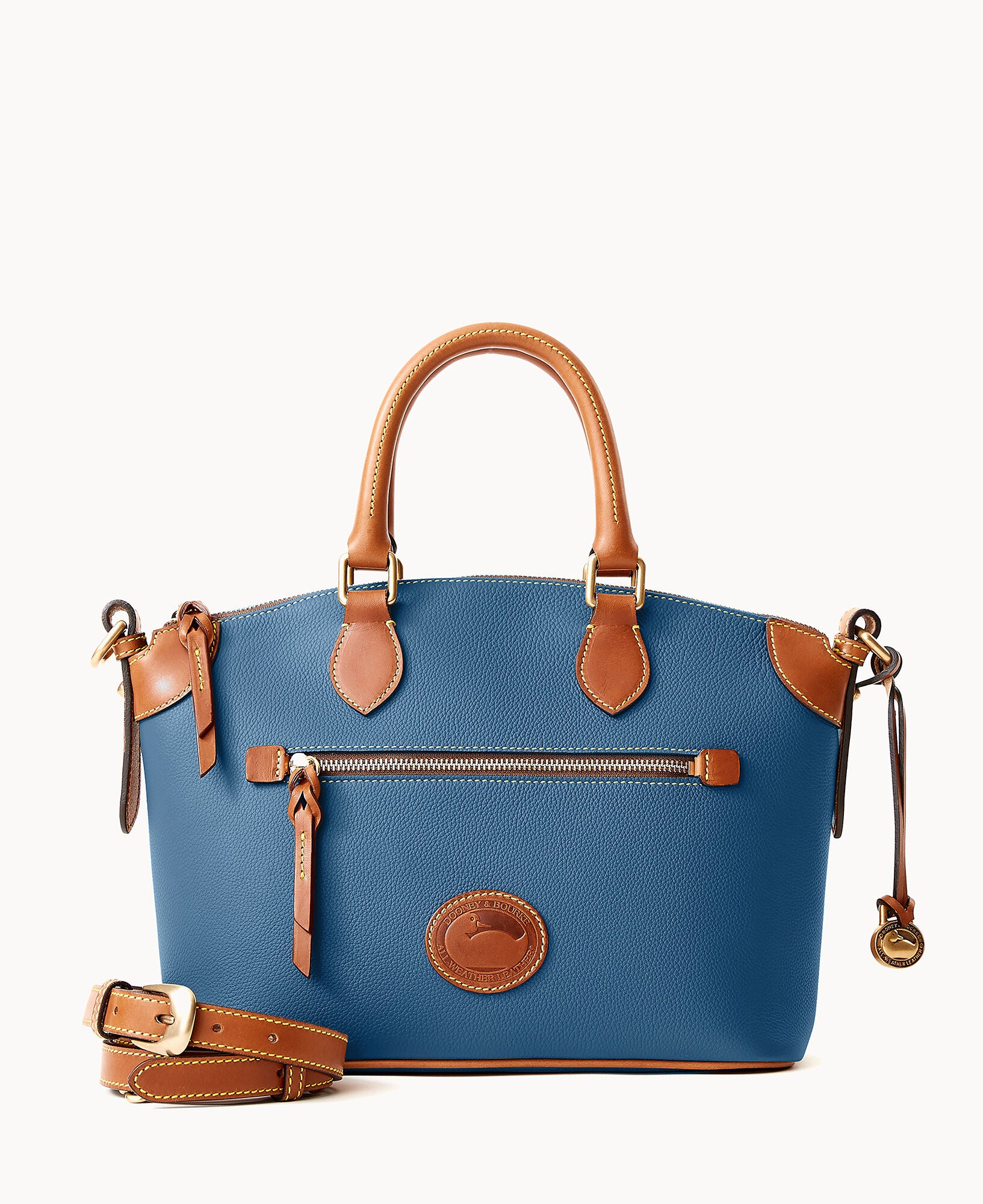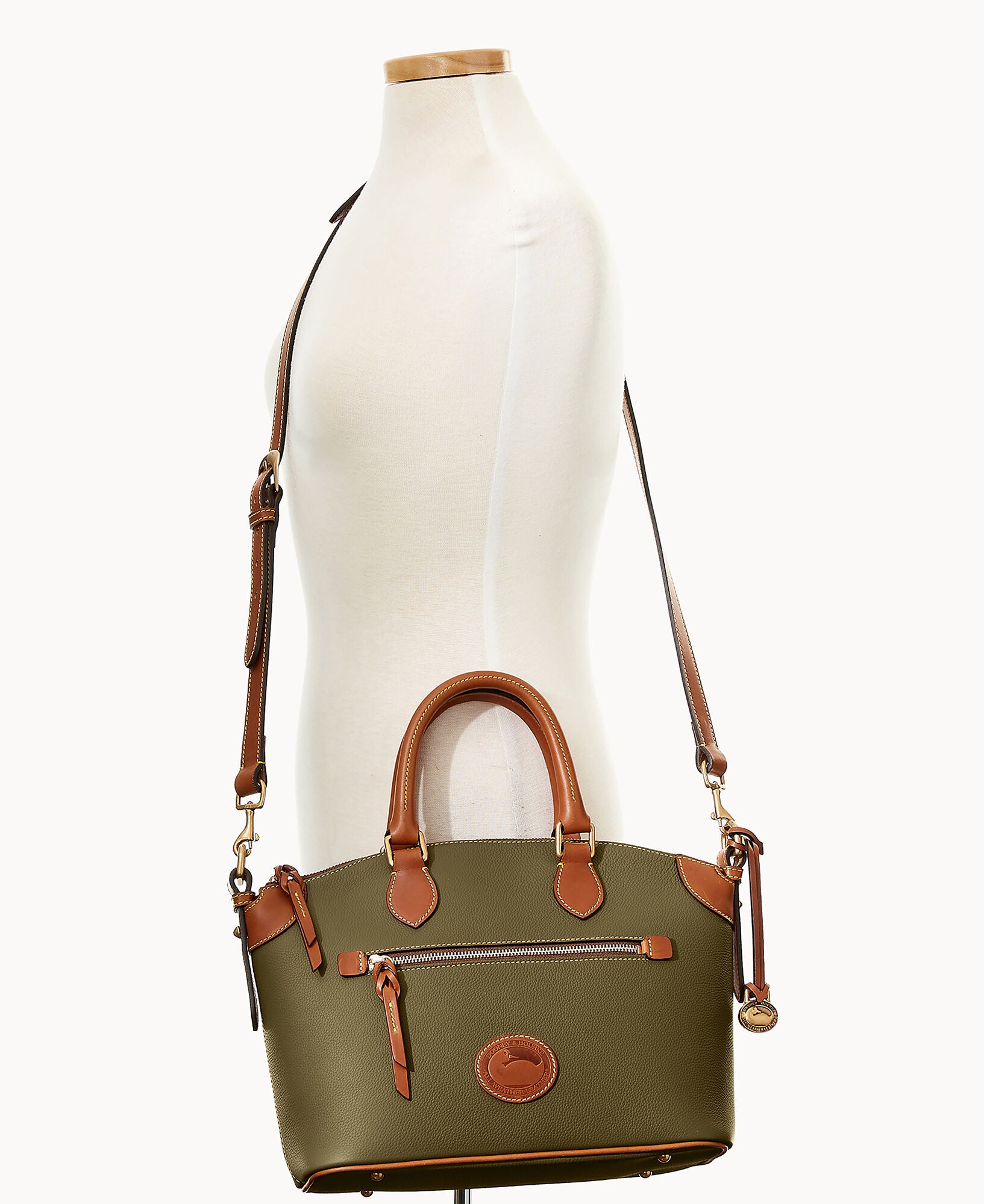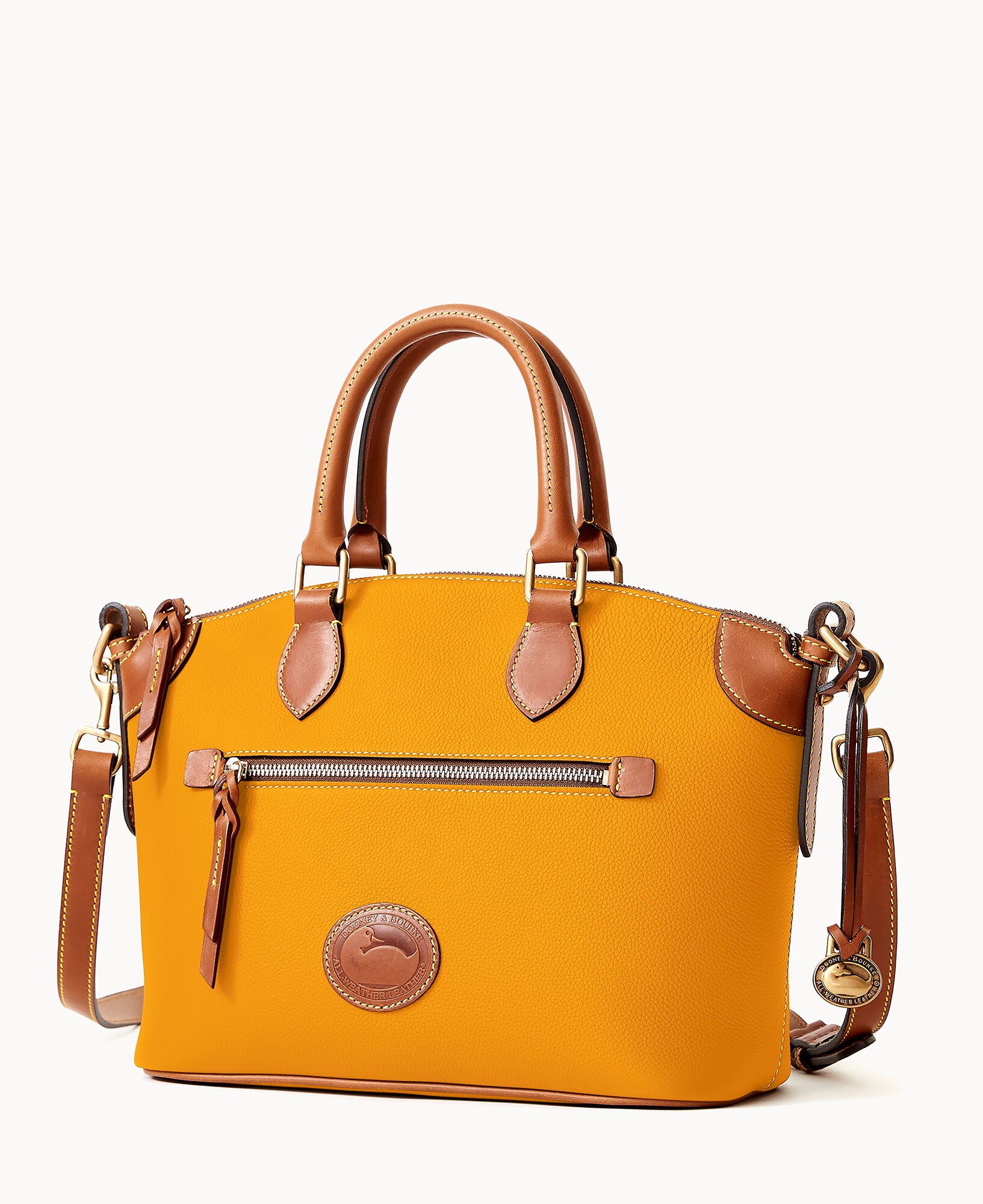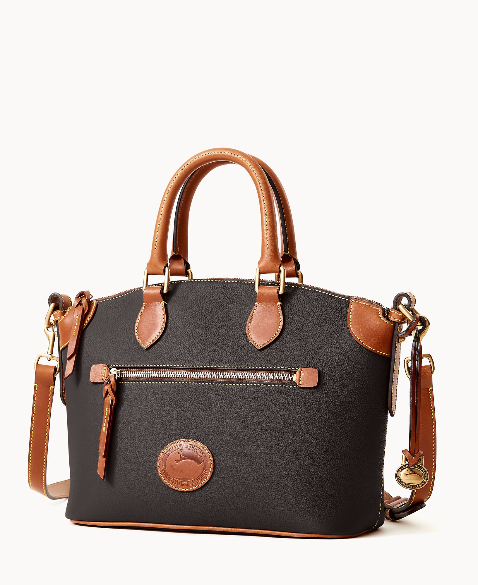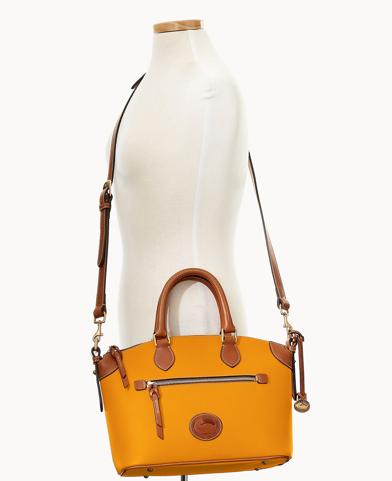 One outside zip pocket. One inside zip pocket. Two inside pockets. Handle drop length 4.25″. Adjustable, detachable shoulder strap. Strap drop length 25.5″. Lined. Feet. Zipper closure.