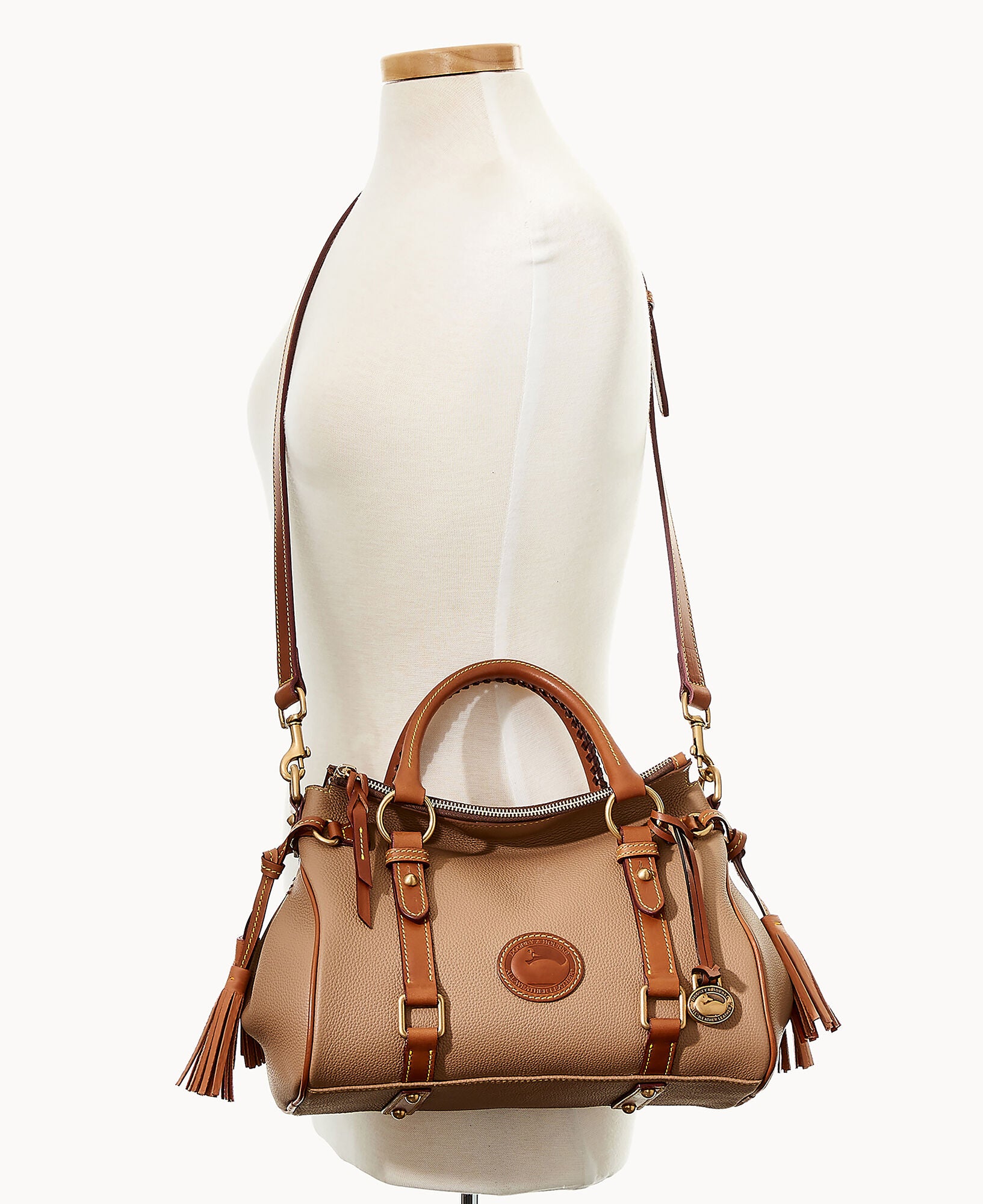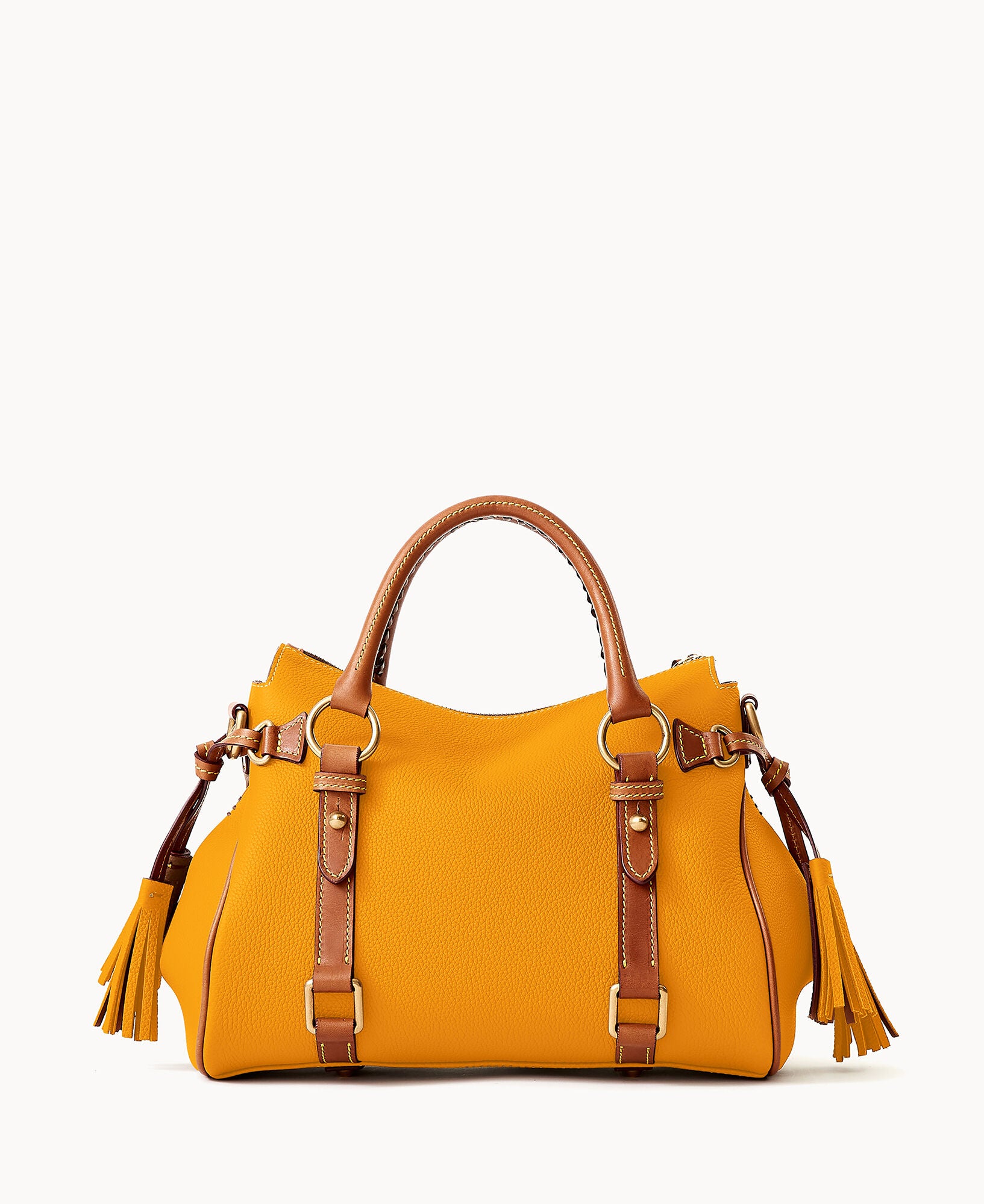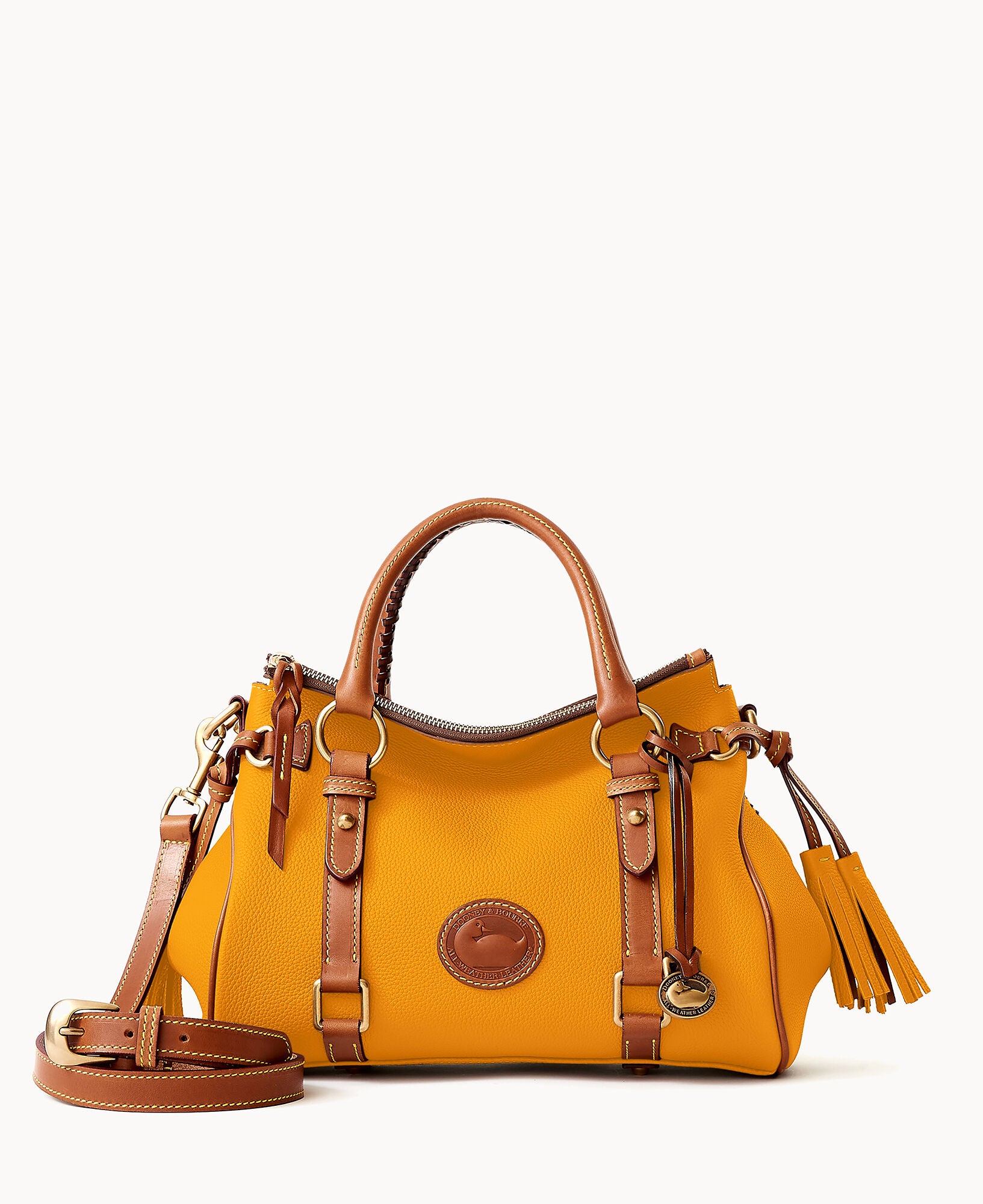 One inside zipper pocket. Two inside pockets. Handle drop length 5″. Adjustable, detachable shoulder strap. Strap drop length 19″. Lined. Feet. Zipper closure.