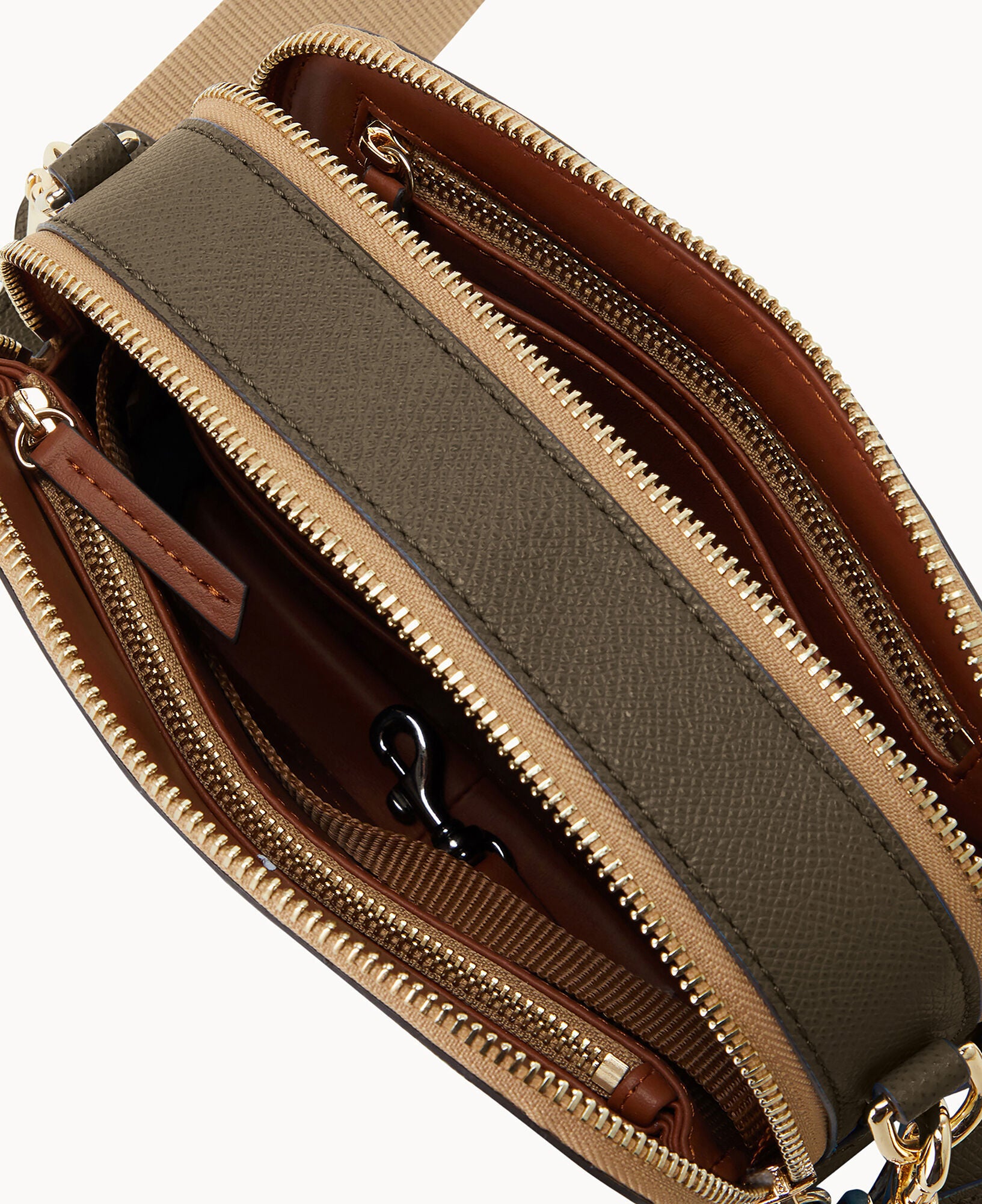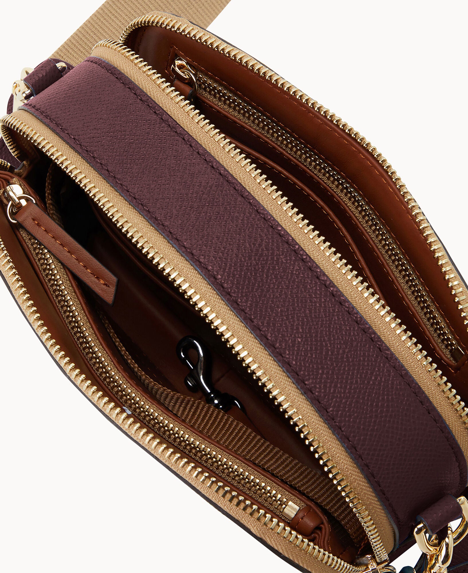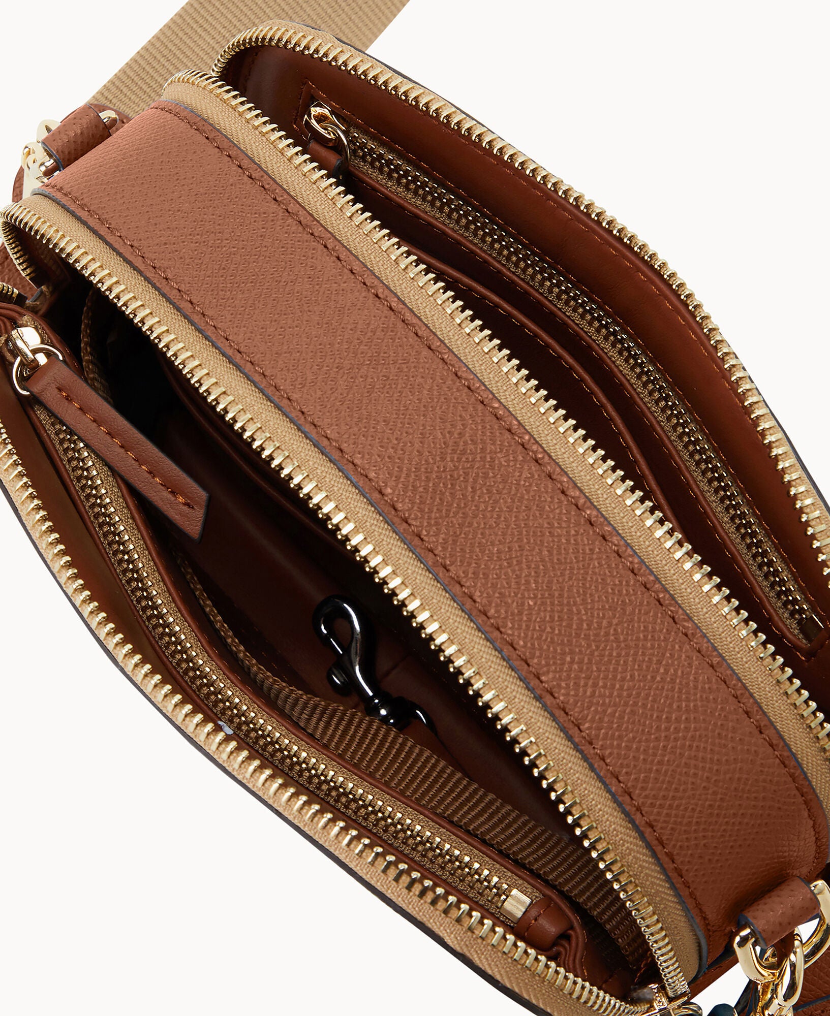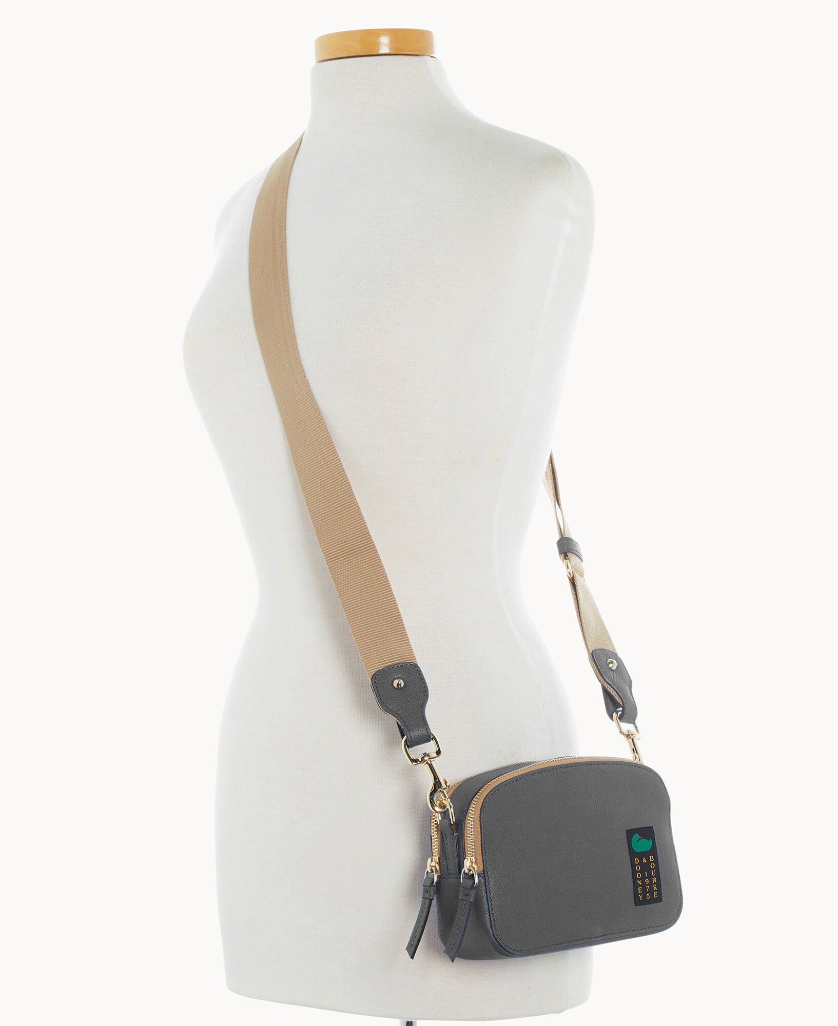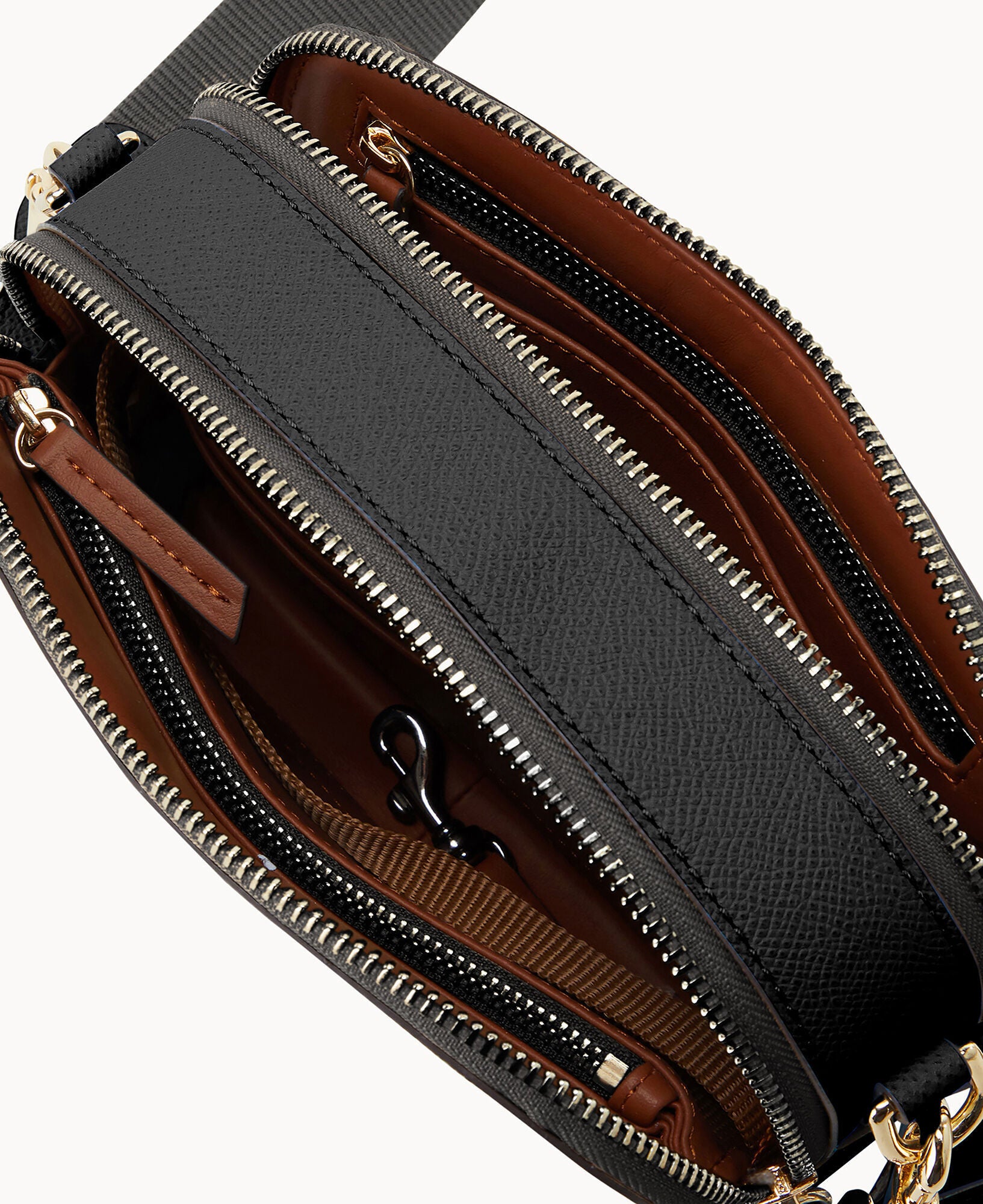 One outside pocket. Two zipper compartments. Two inside zip pockets. One inside pocket. Eight credit card slots. Inside key hook. Lined. Adjustable, detachable shoulder strap 26.75″.