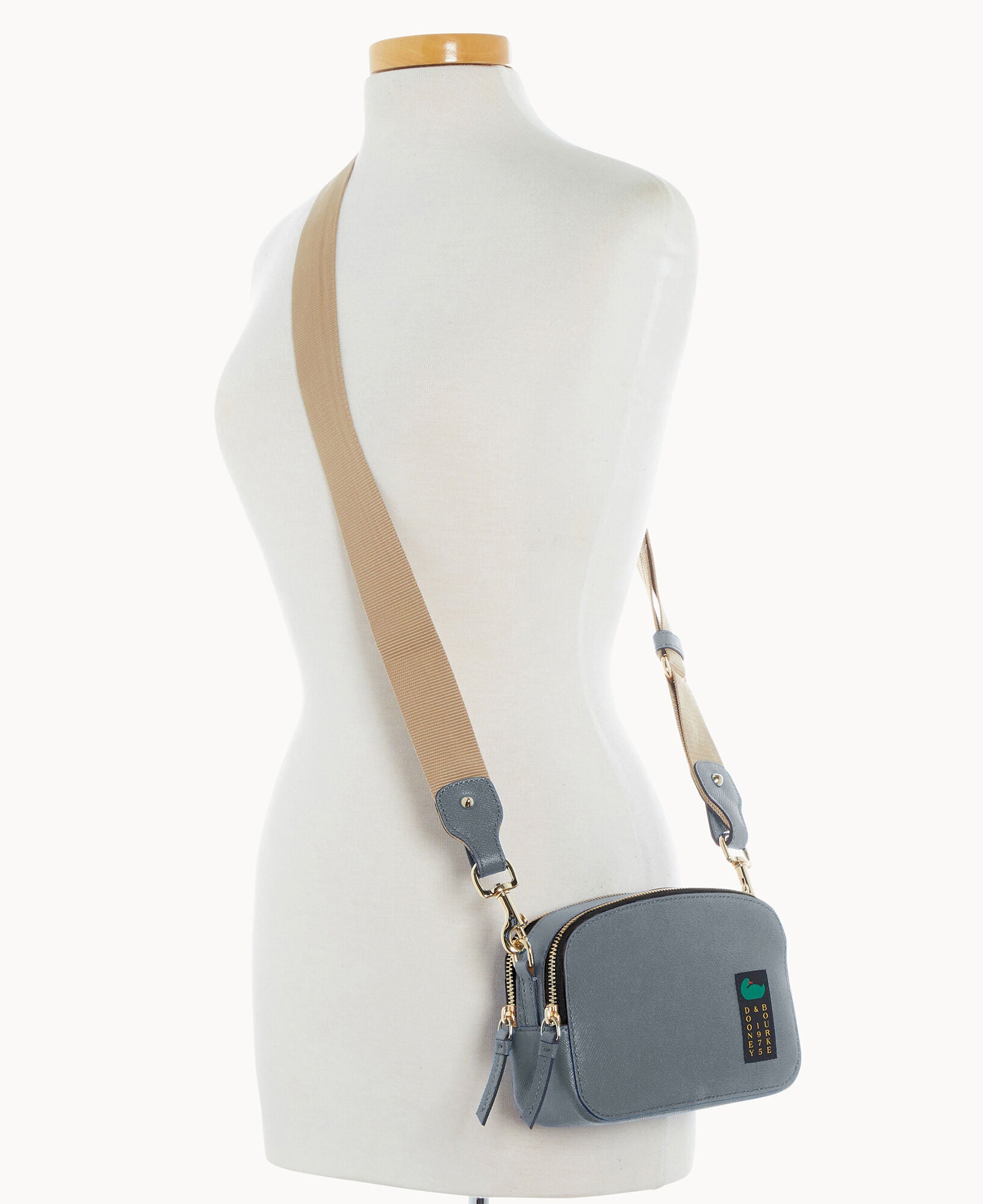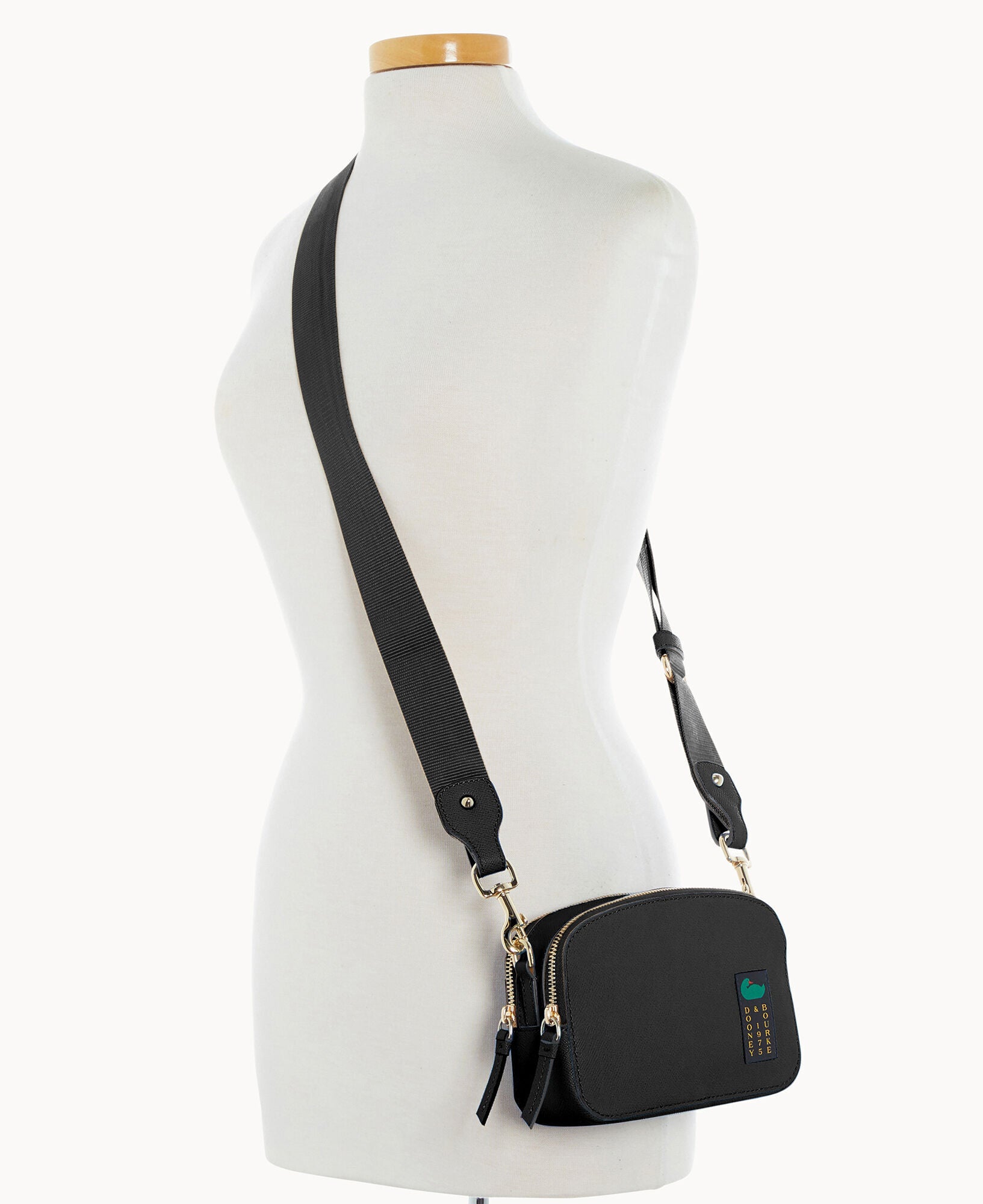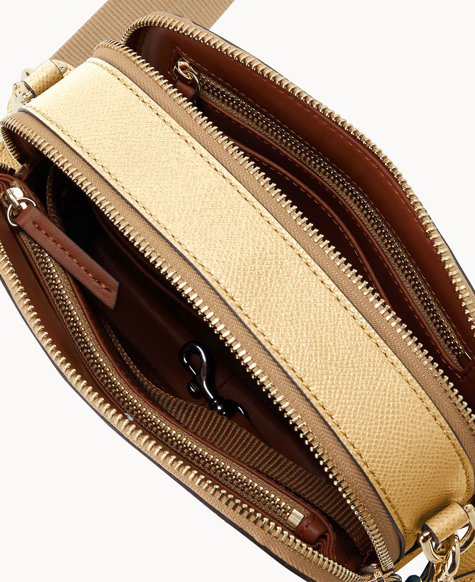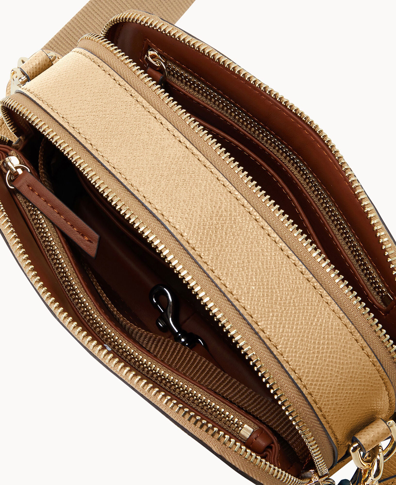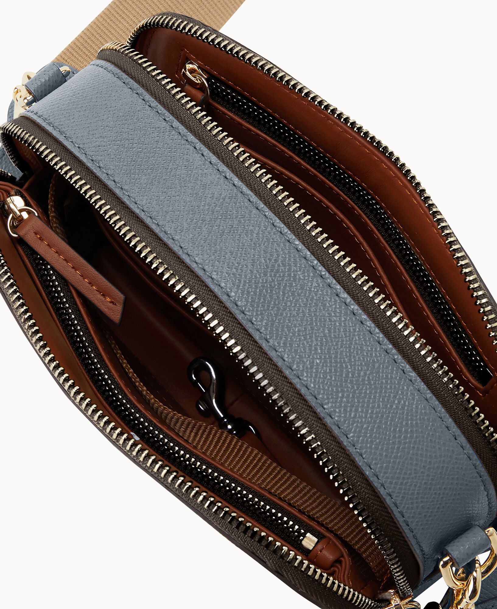 One outside pocket. Two zipper compartments. Two inside zip pockets. One inside pocket. Eight credit card slots. Inside key hook. Lined. Adjustable, detachable shoulder strap 26.75″.