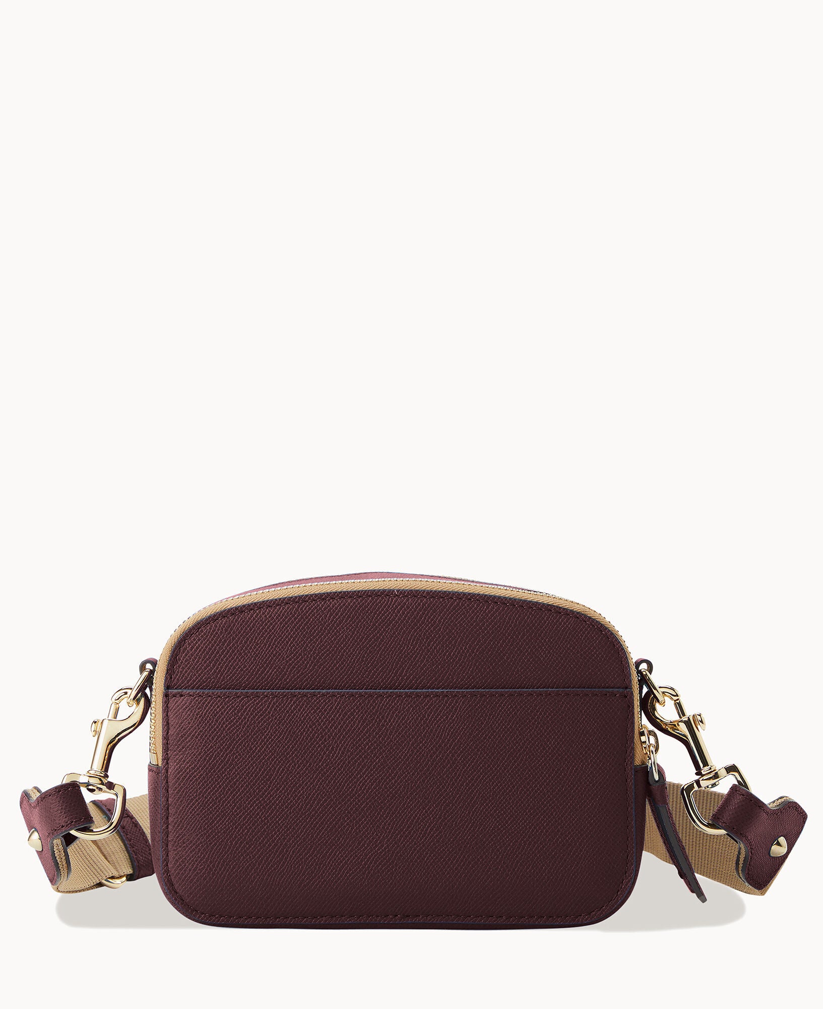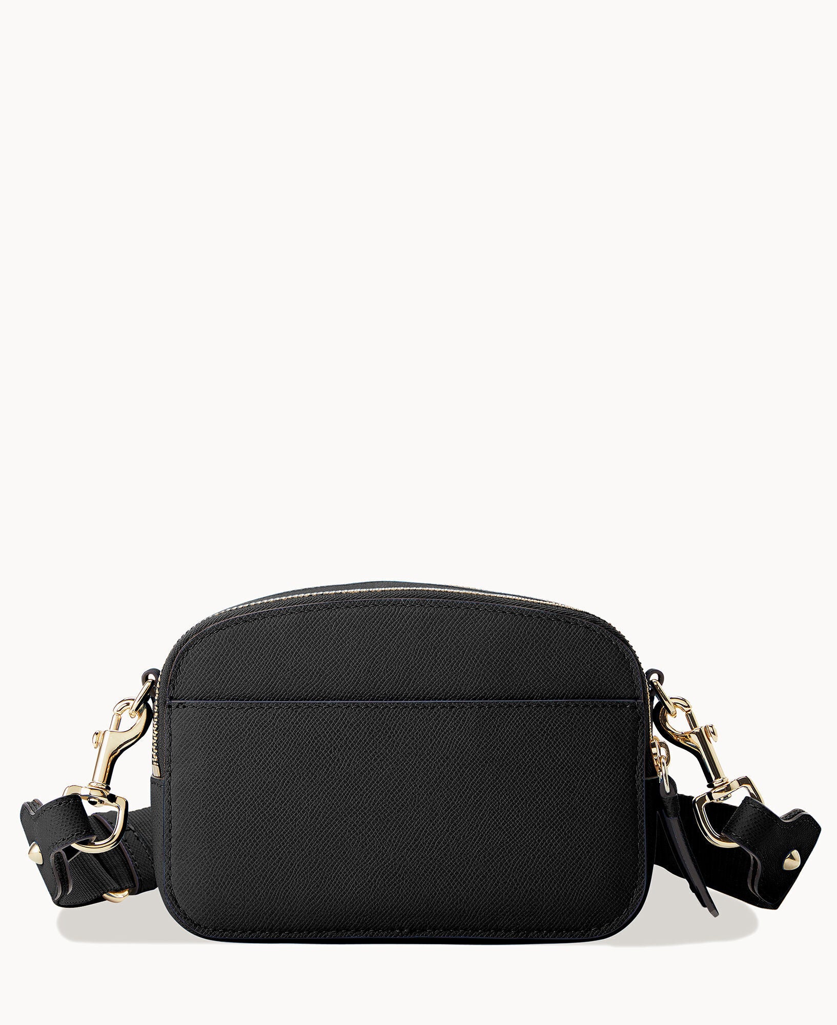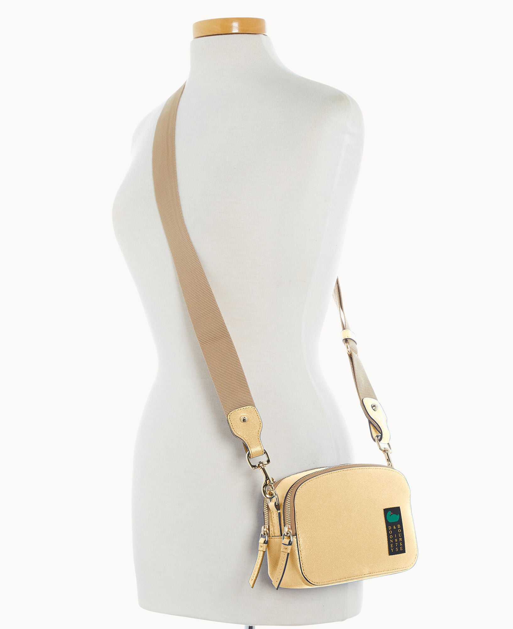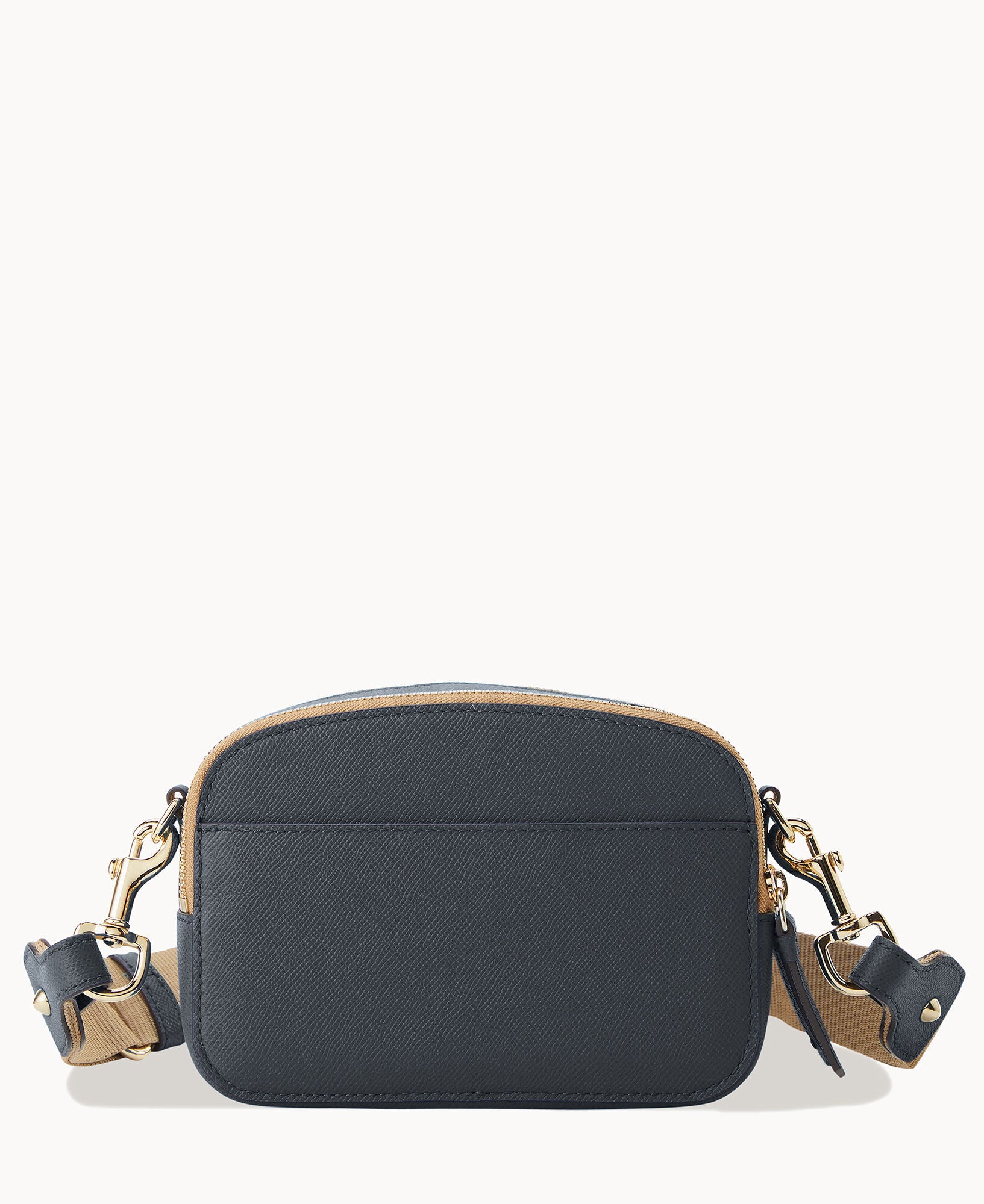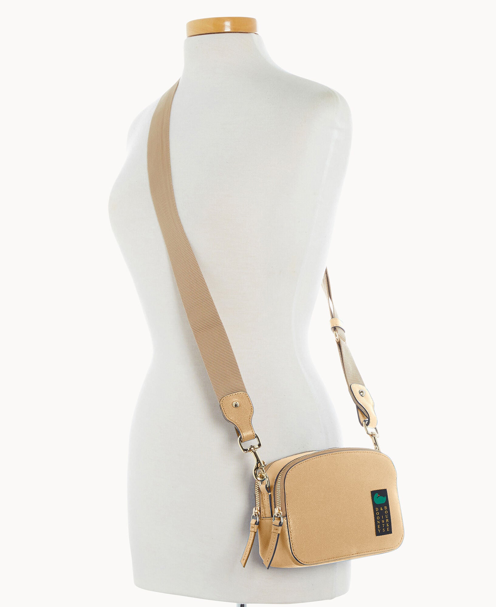 One outside pocket. Two zipper compartments. Two inside zip pockets. One inside pocket. Eight credit card slots. Inside key hook. Lined. Adjustable, detachable shoulder strap 26.75″.