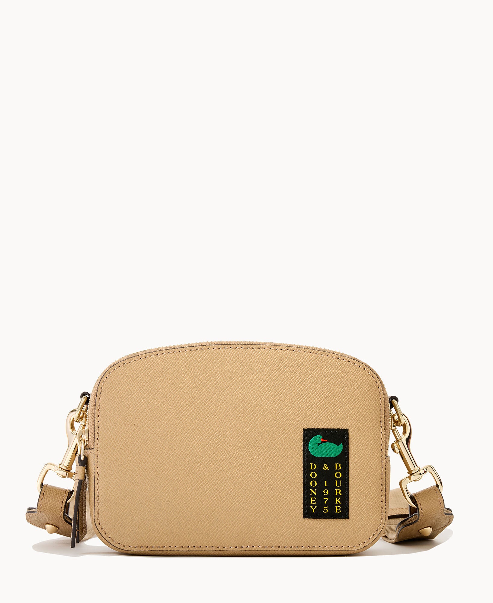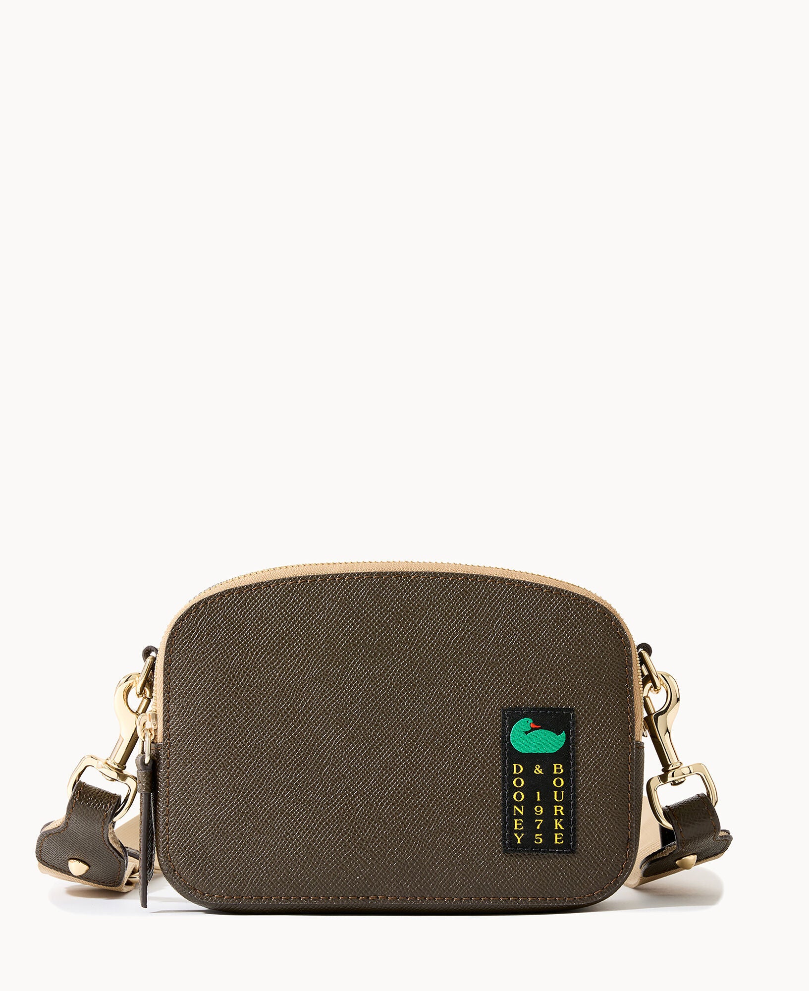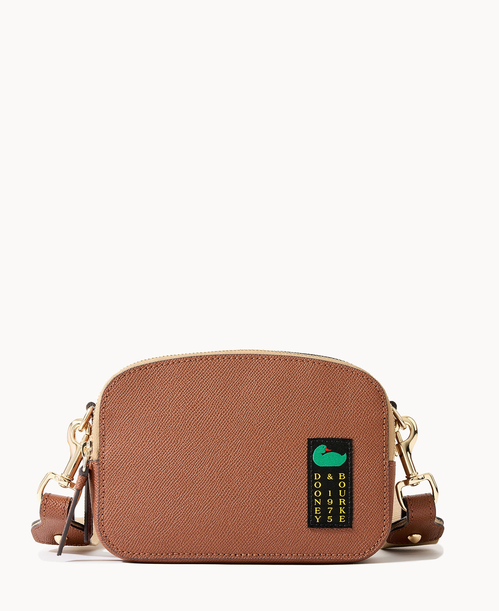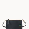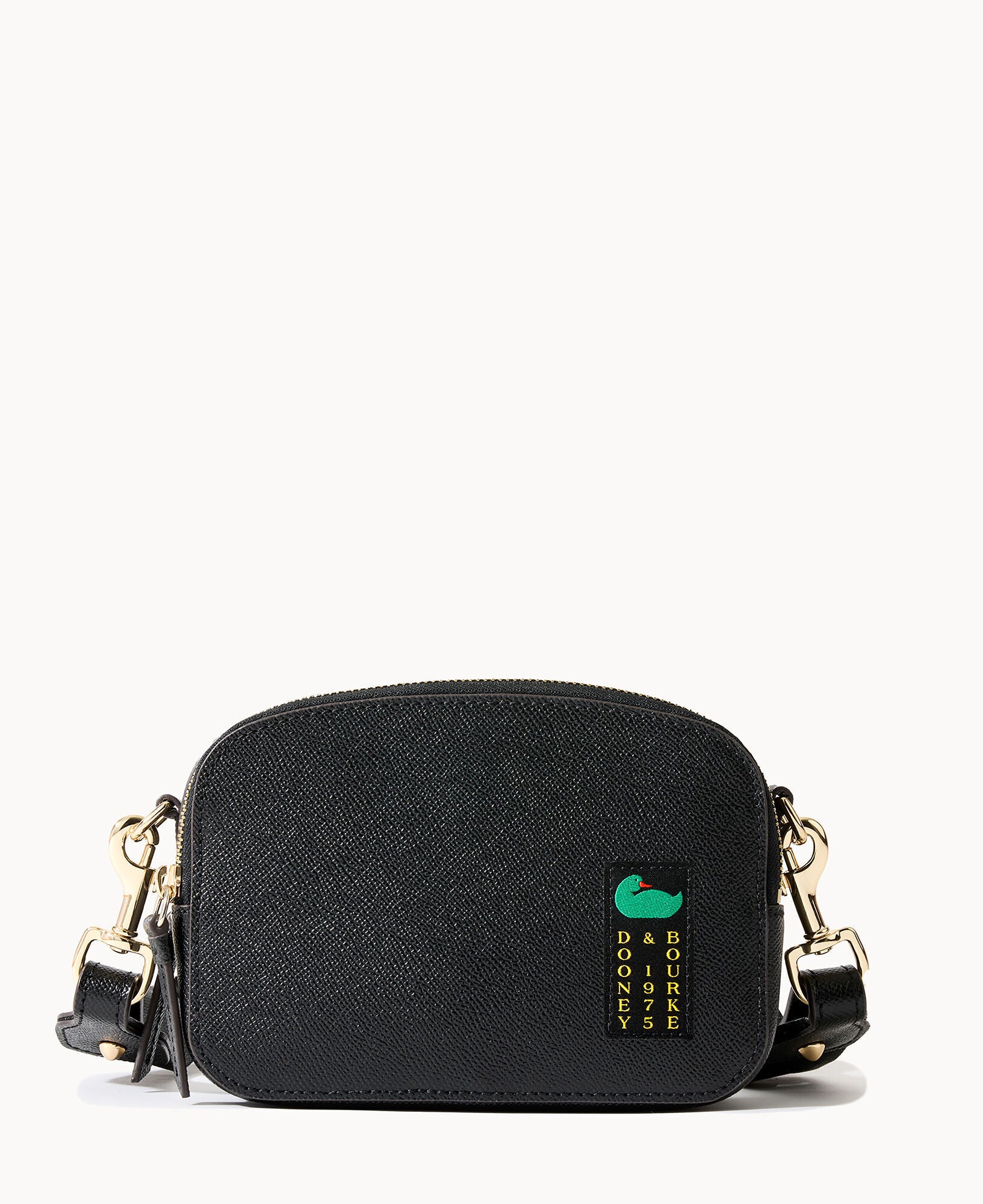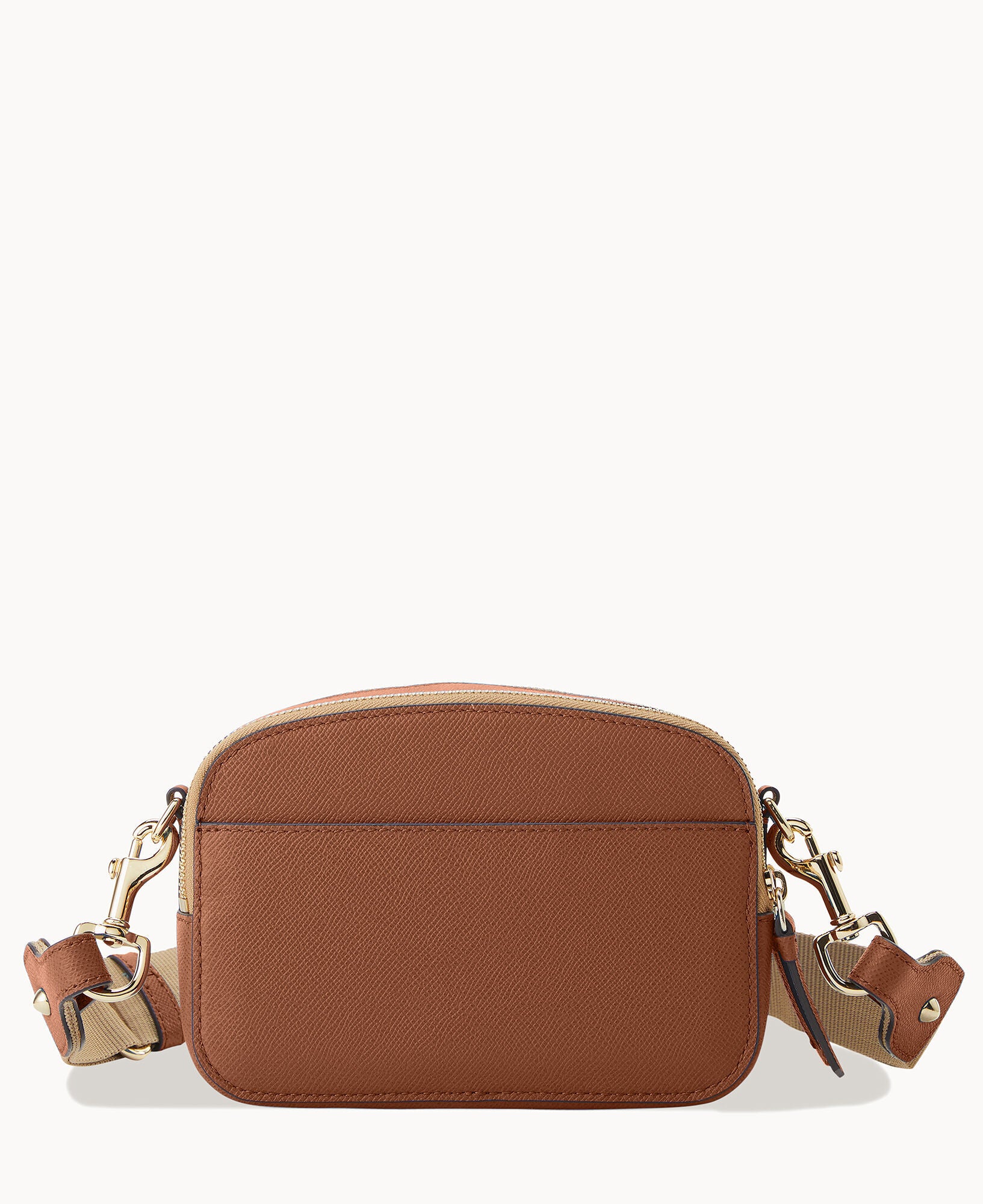 One outside pocket. Two zipper compartments. Two inside zip pockets. One inside pocket. Eight credit card slots. Inside key hook. Lined. Adjustable, detachable shoulder strap 26.75″.