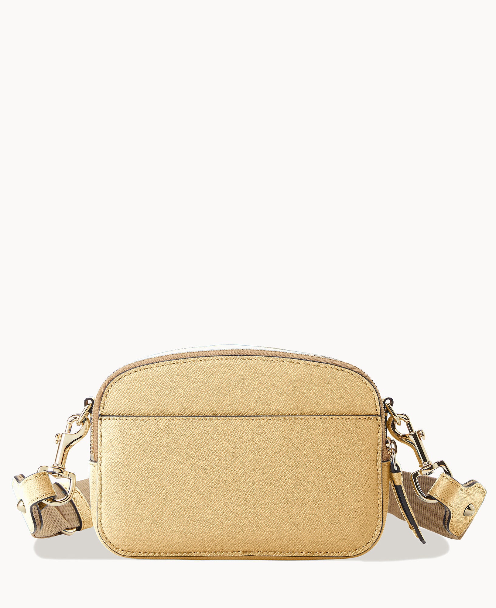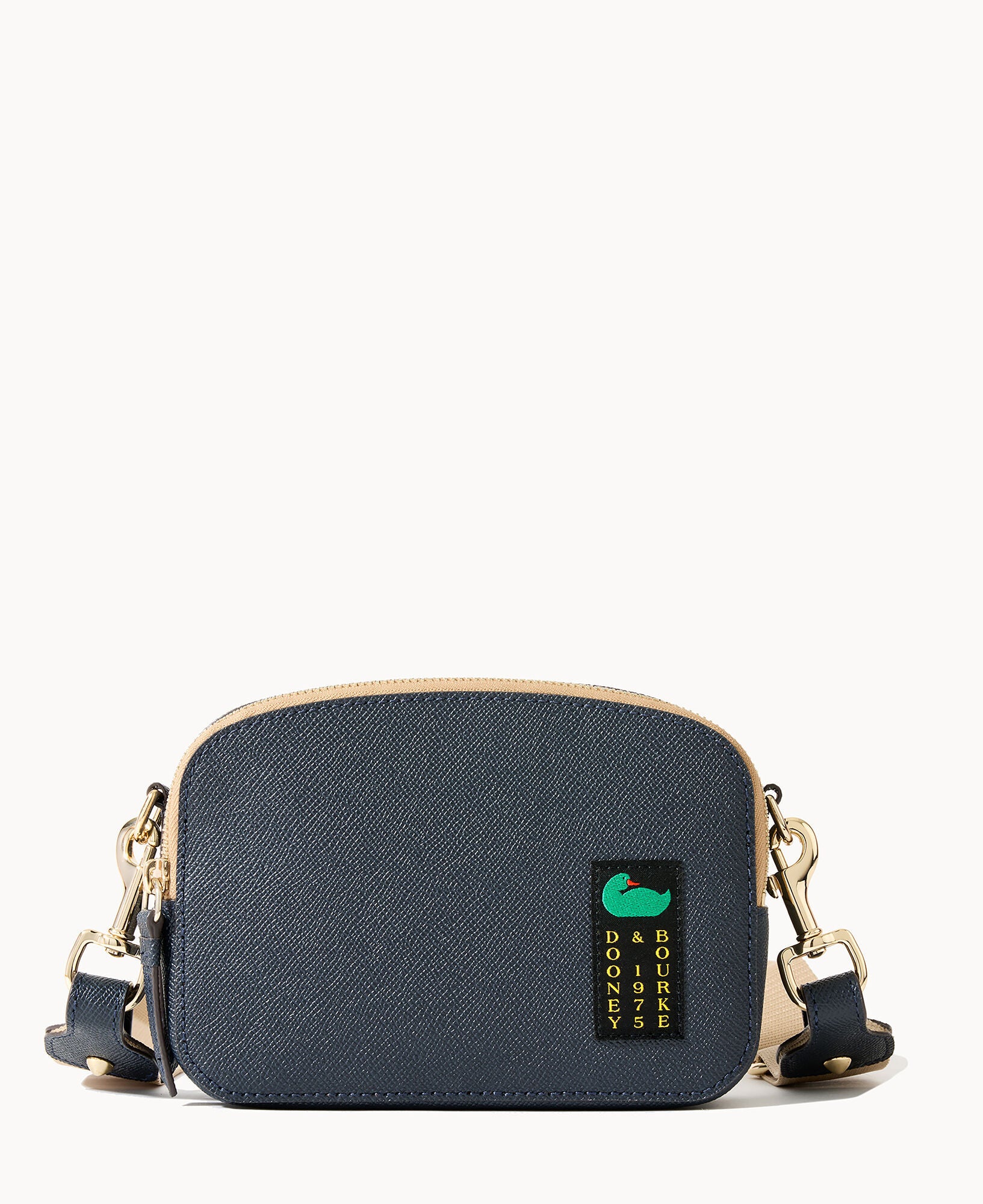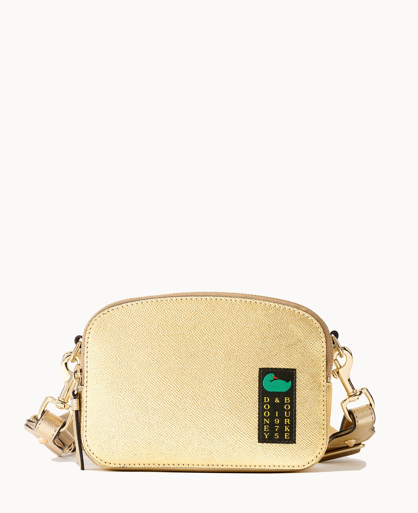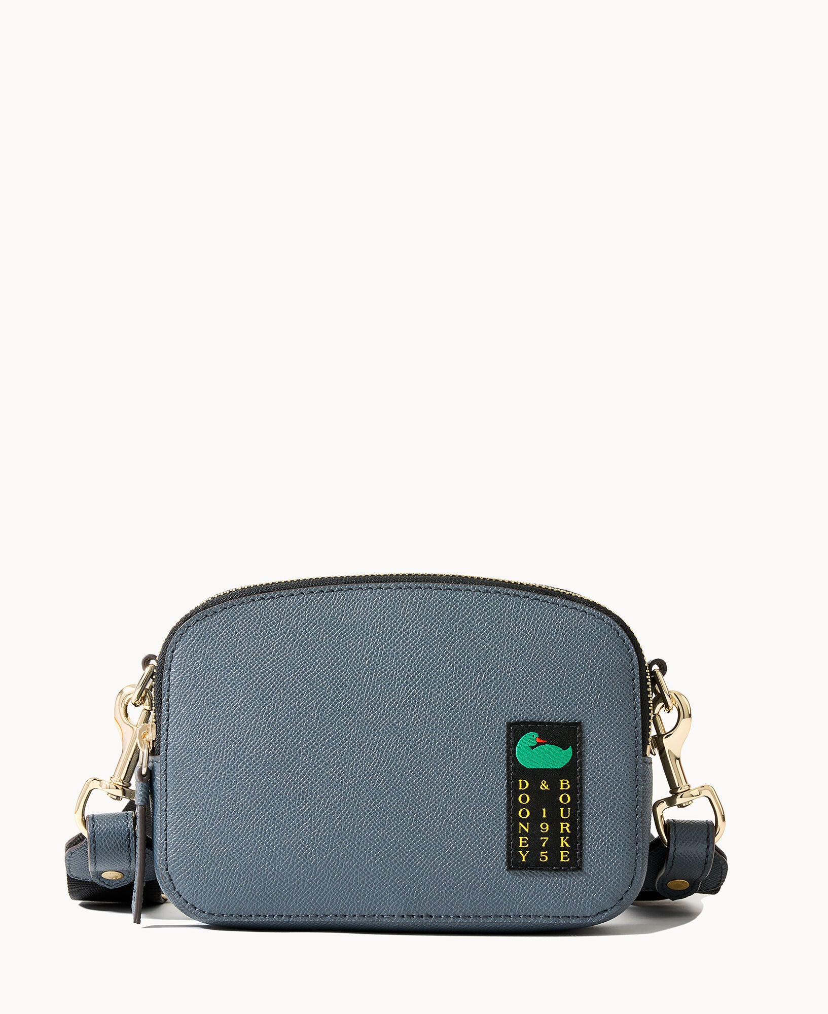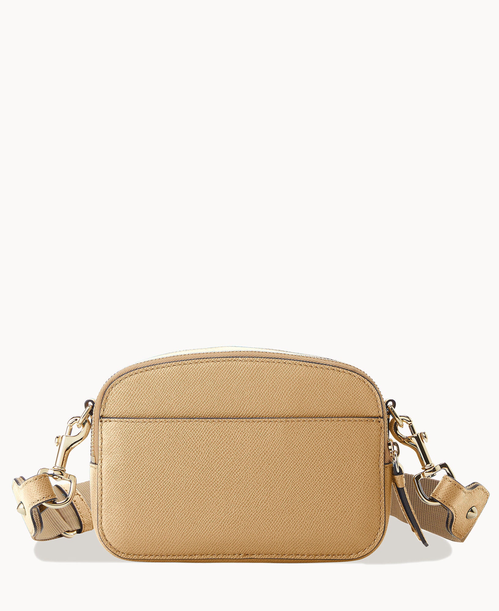 One outside pocket. Two zipper compartments. Two inside zip pockets. One inside pocket. Eight credit card slots. Inside key hook. Lined. Adjustable, detachable shoulder strap 26.75″.