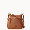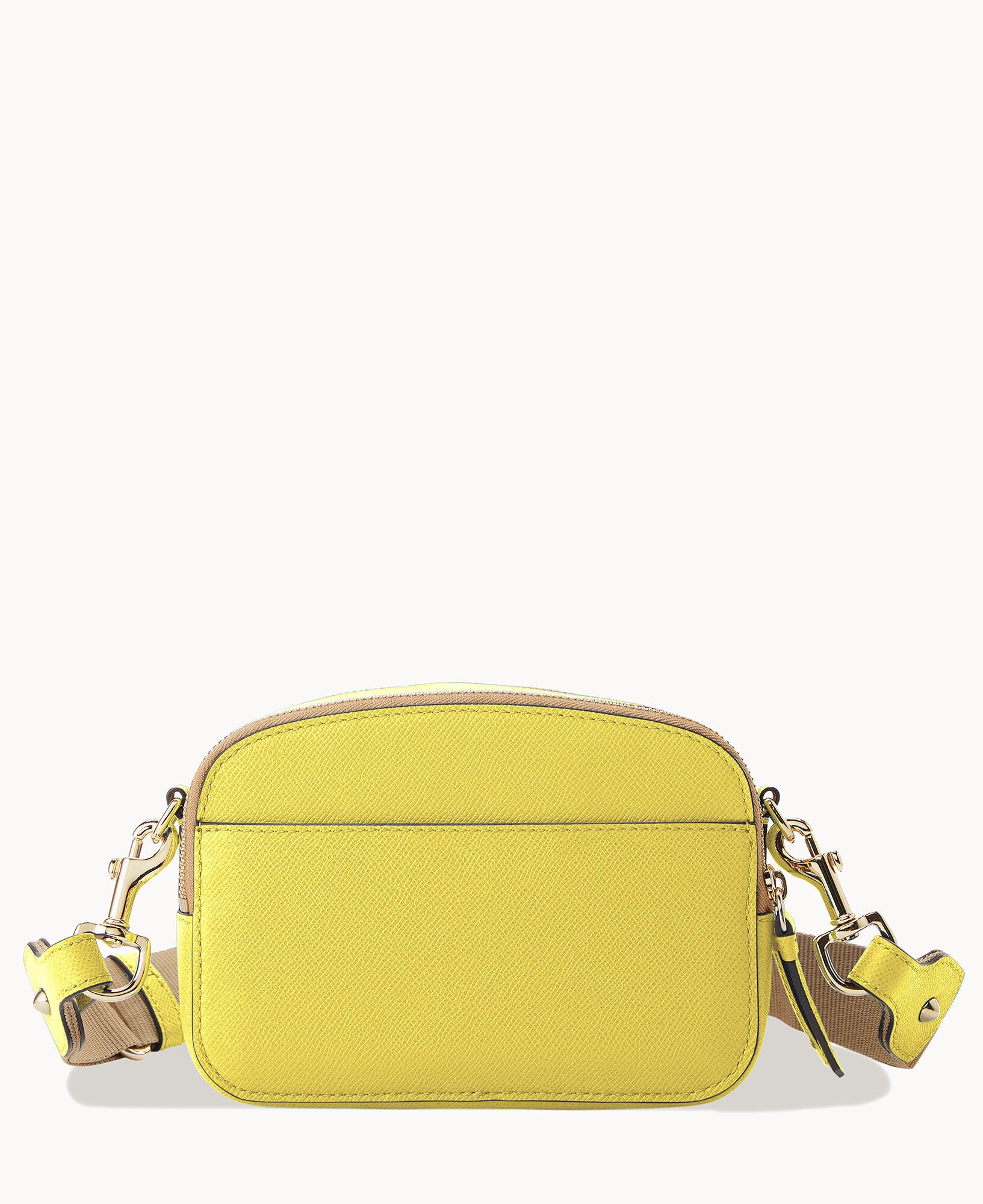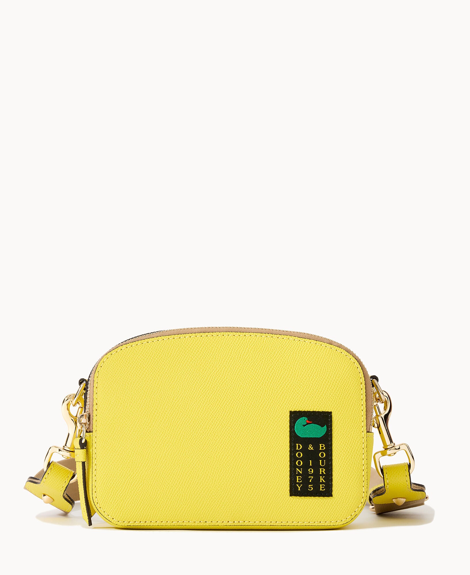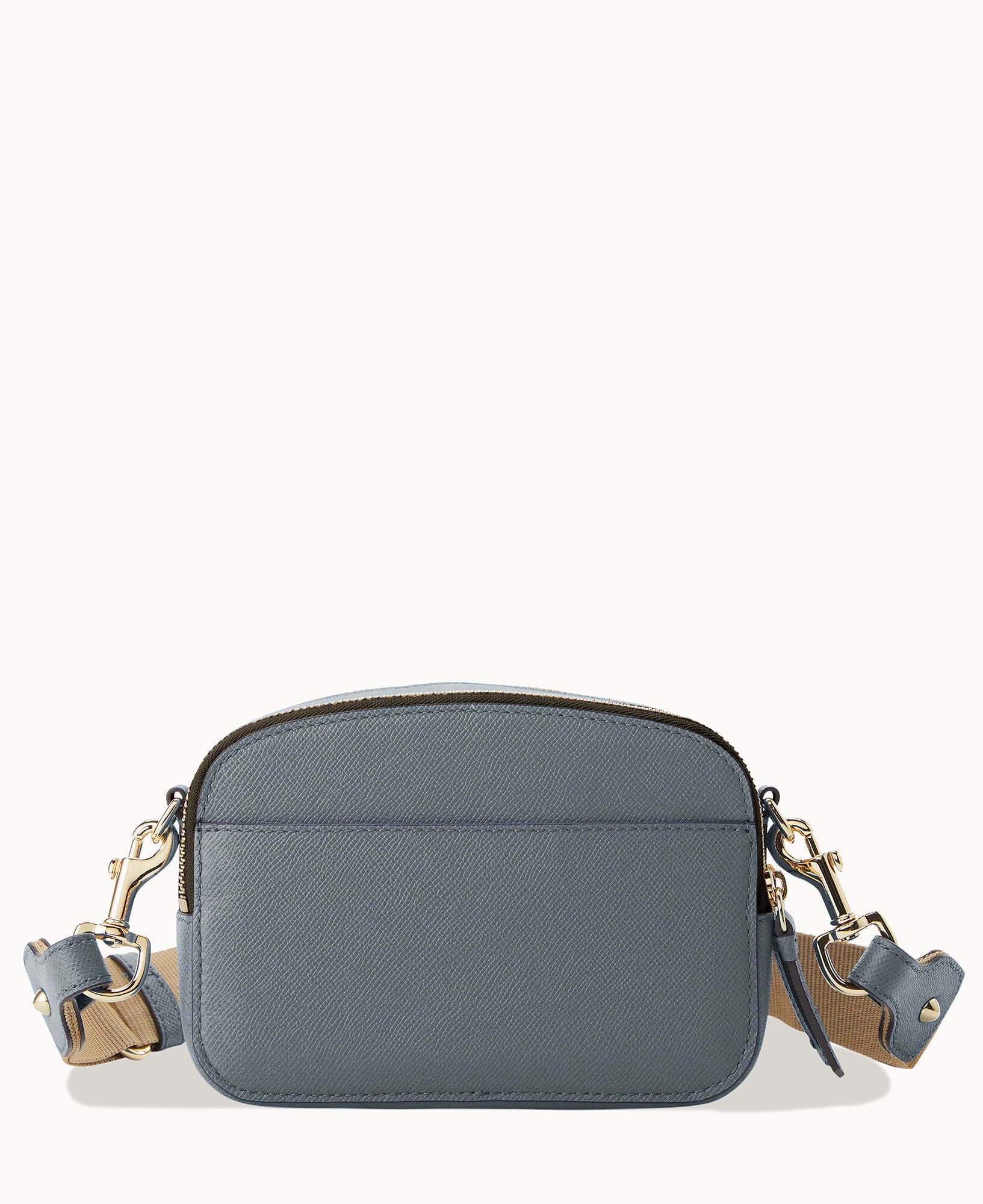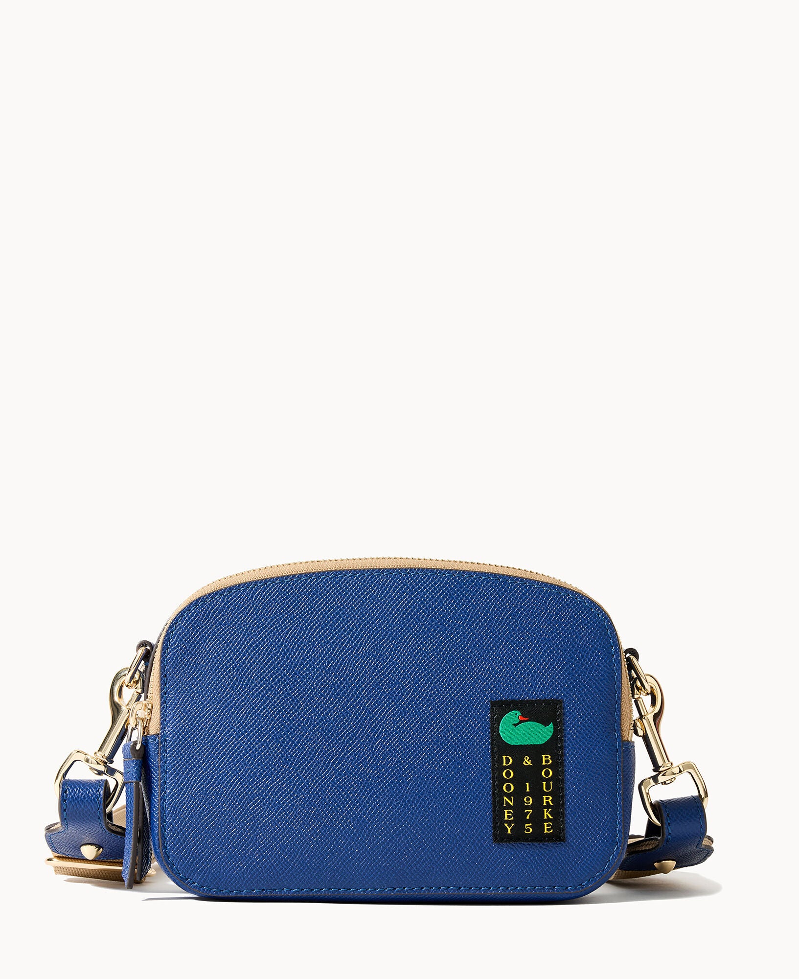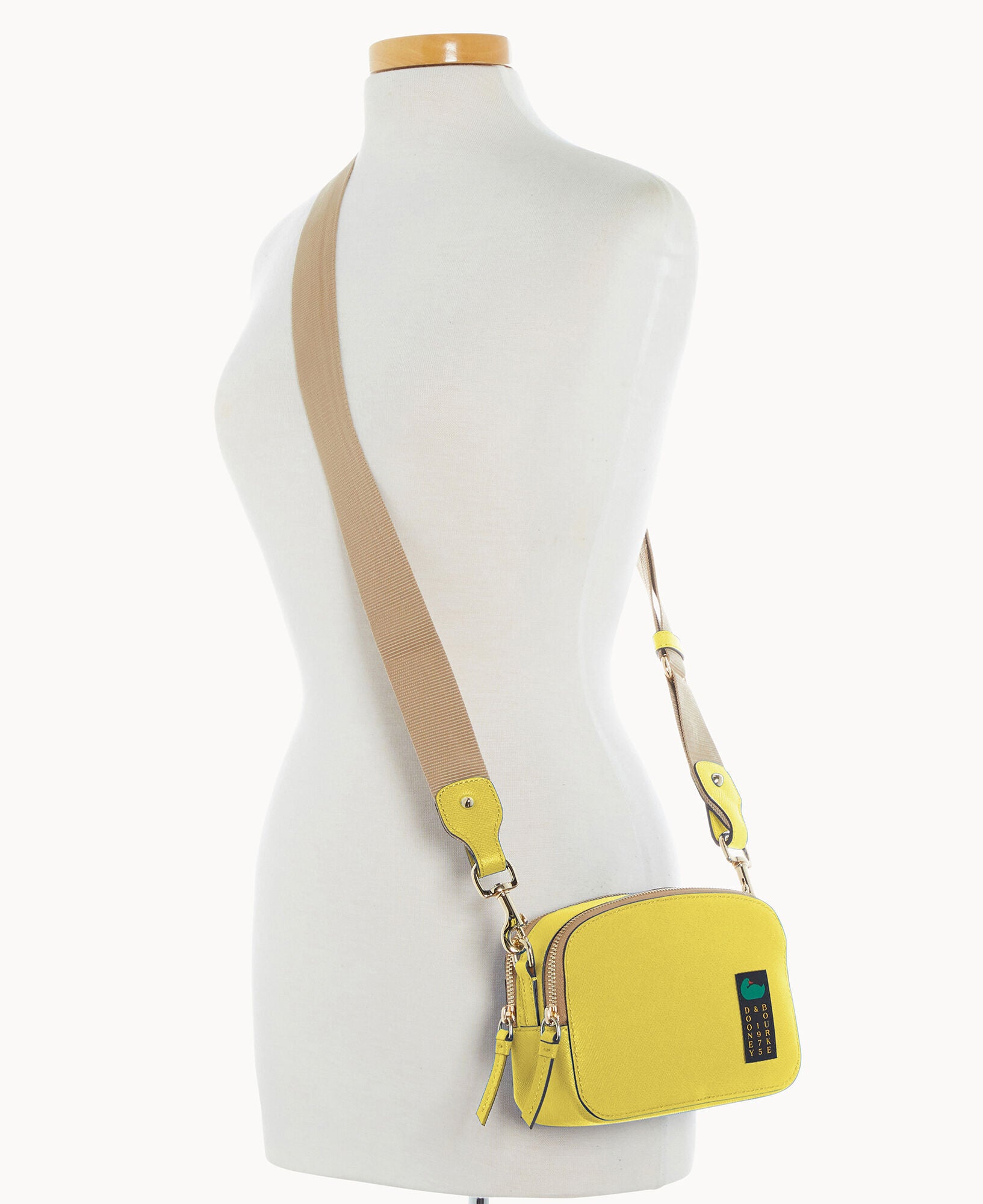 One outside pocket. Two zipper compartments. Two inside zip pockets. One inside pocket. Eight credit card slots. Inside key hook. Lined. Adjustable, detachable shoulder strap 26.75″.