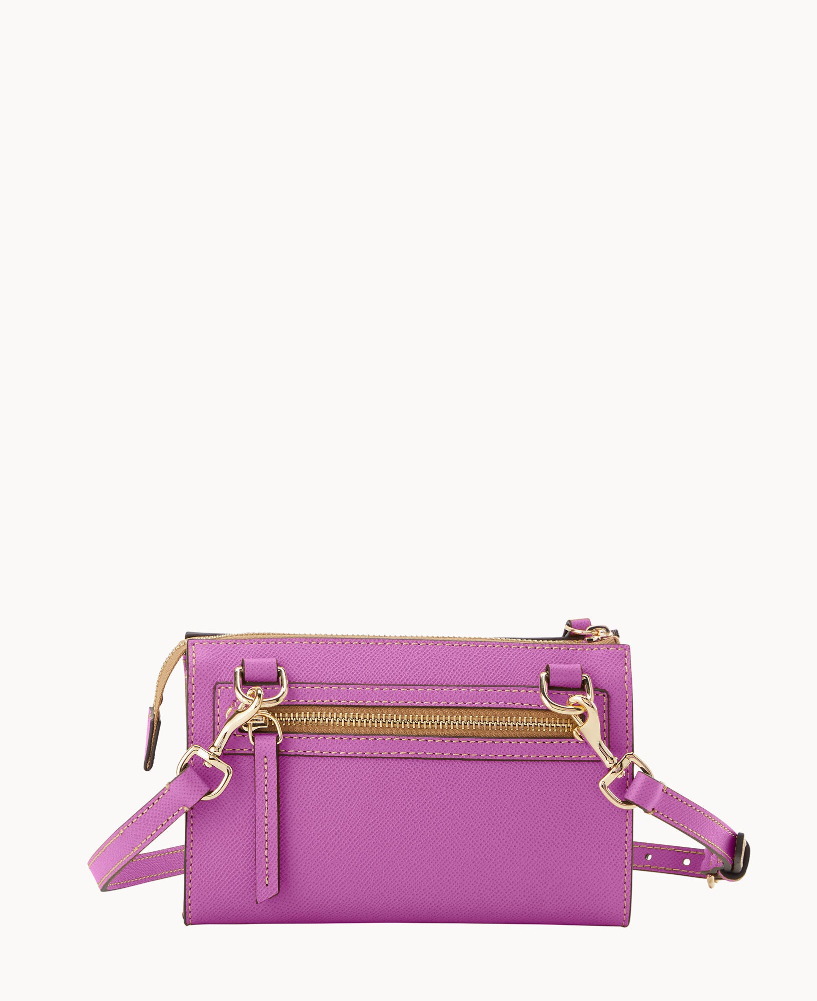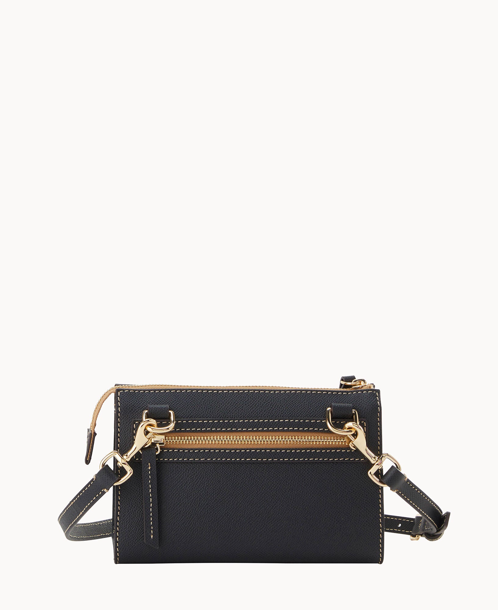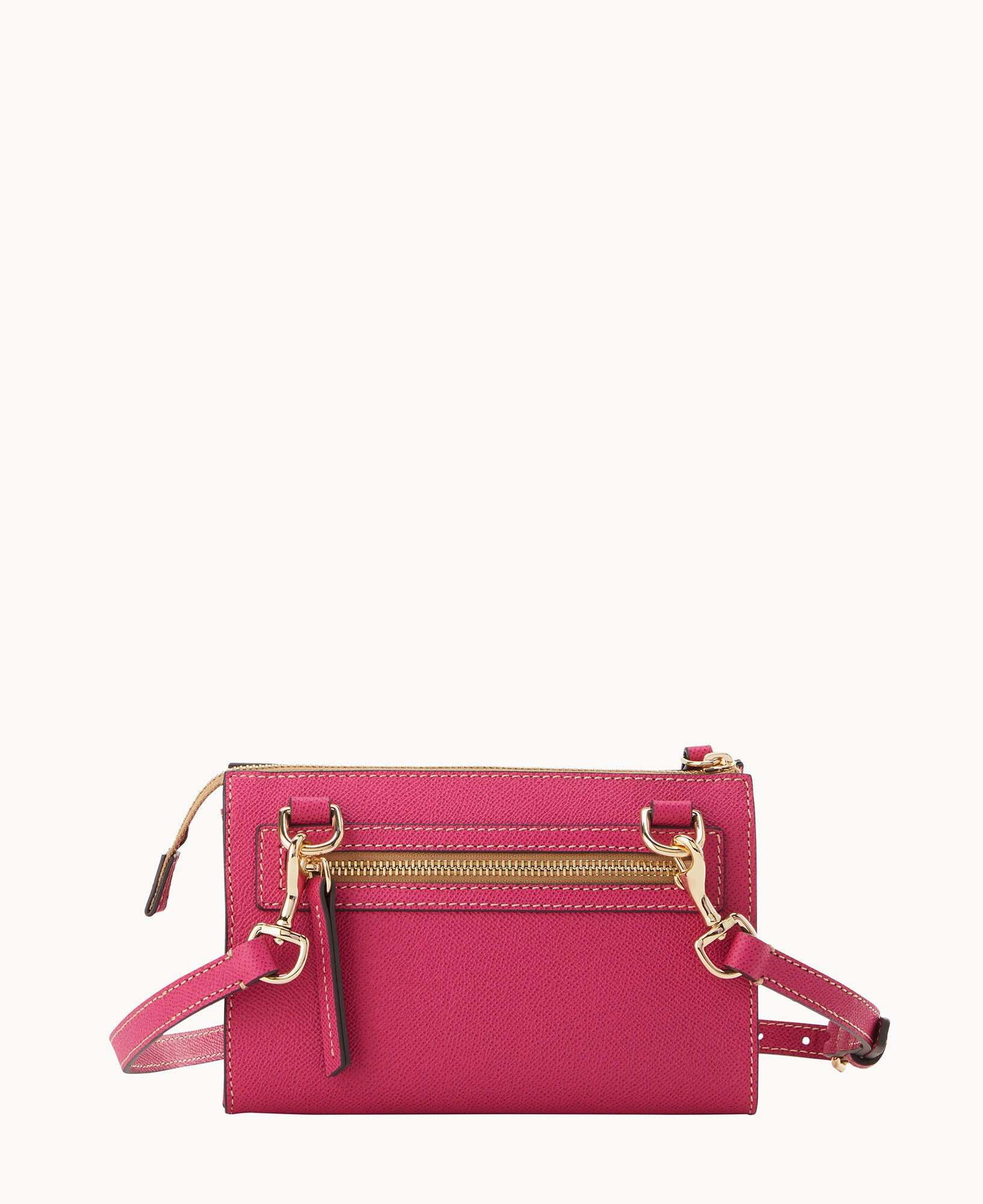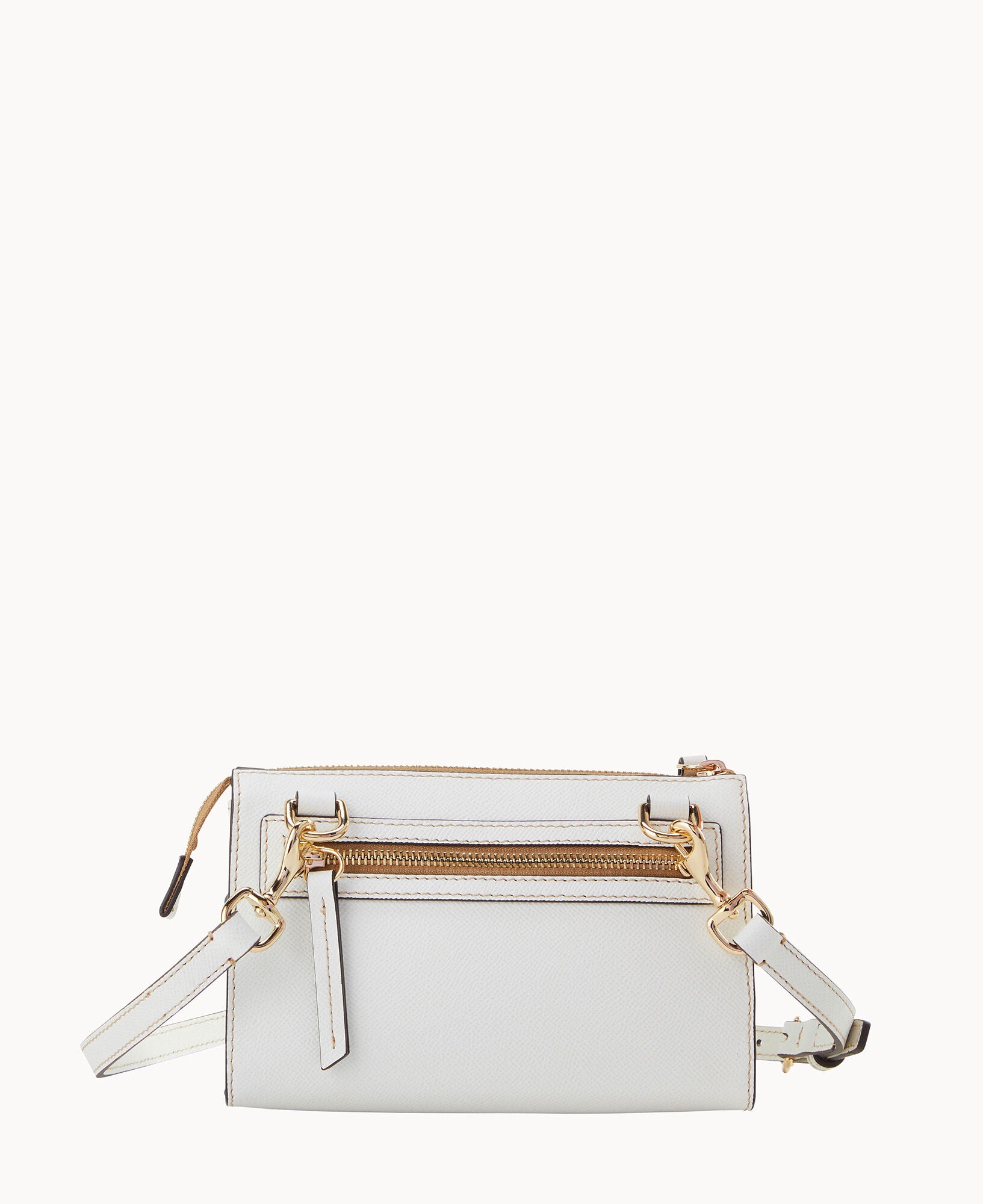 Outside zip pocket. Inside zip pocket. Inside pocket. Inside key hook. Adjustable strap. Detachable strap. Removable strap. Strap drop length 25″. Lined. Zipper closure.
