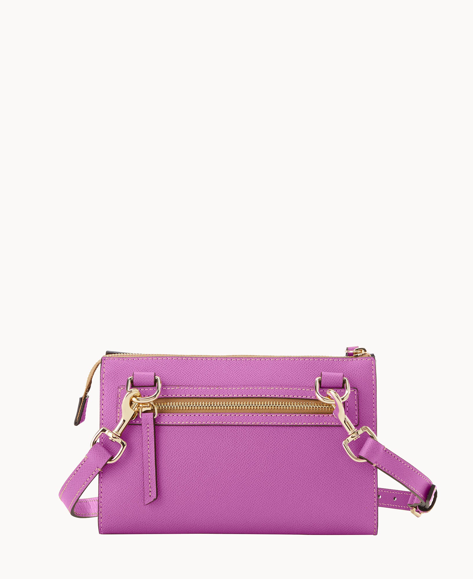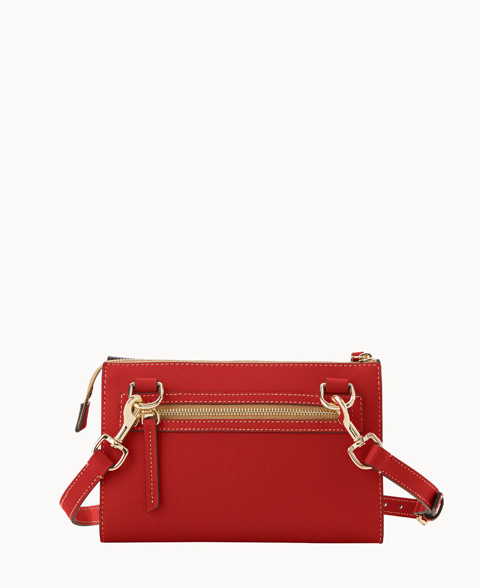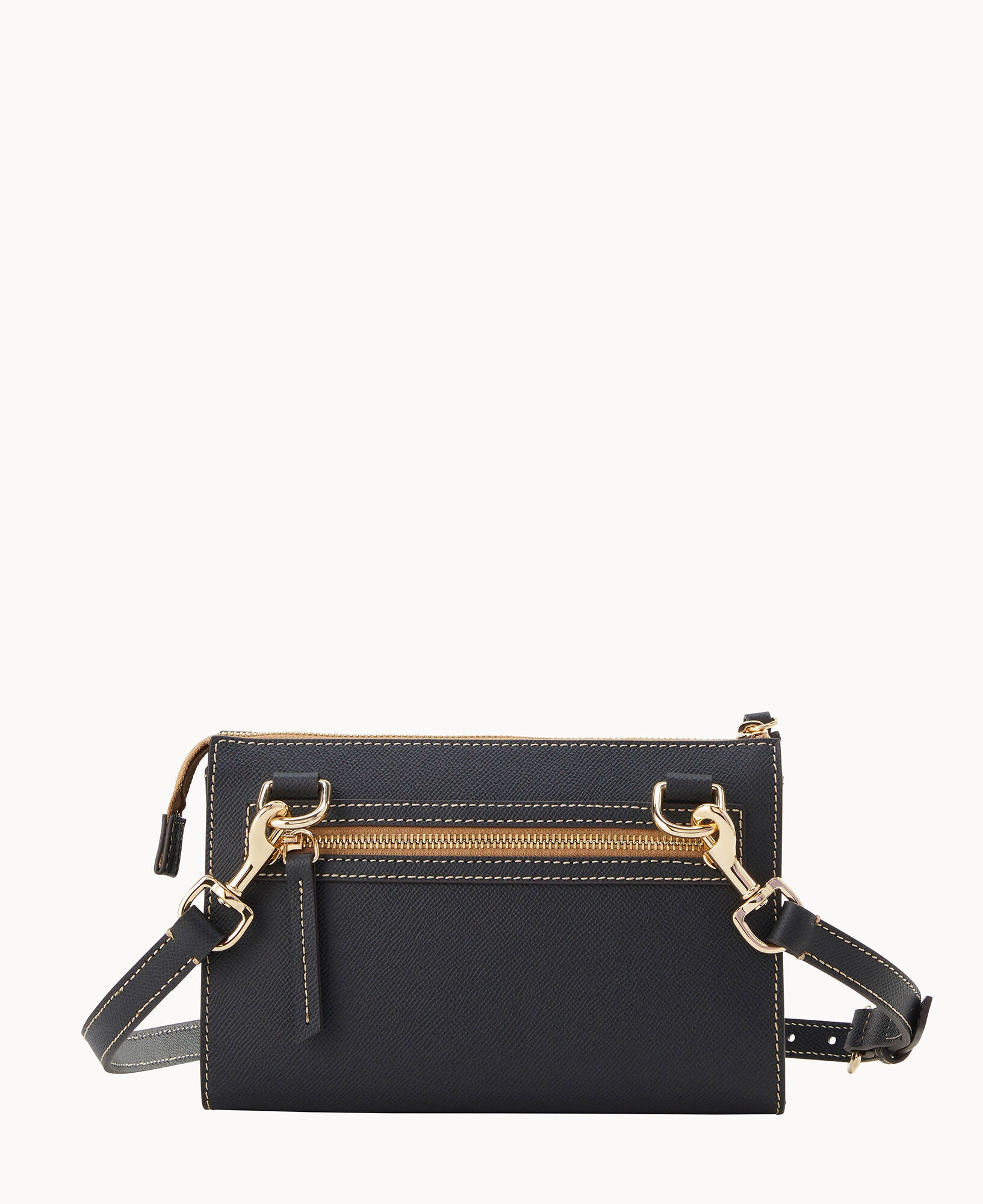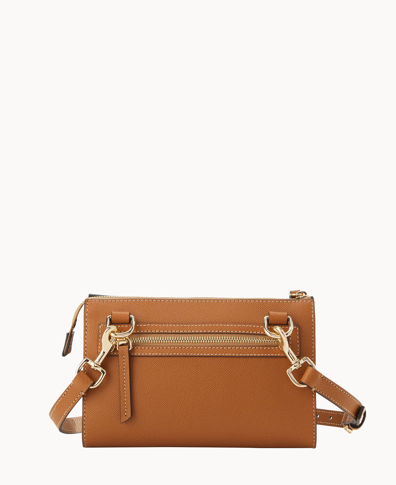 Outside zip pocket. Inside zip pocket. Inside pocket. Inside key hook. Adjustable strap. Detachable strap. Removable strap. Strap drop length 25″. Lined. Zipper closure.