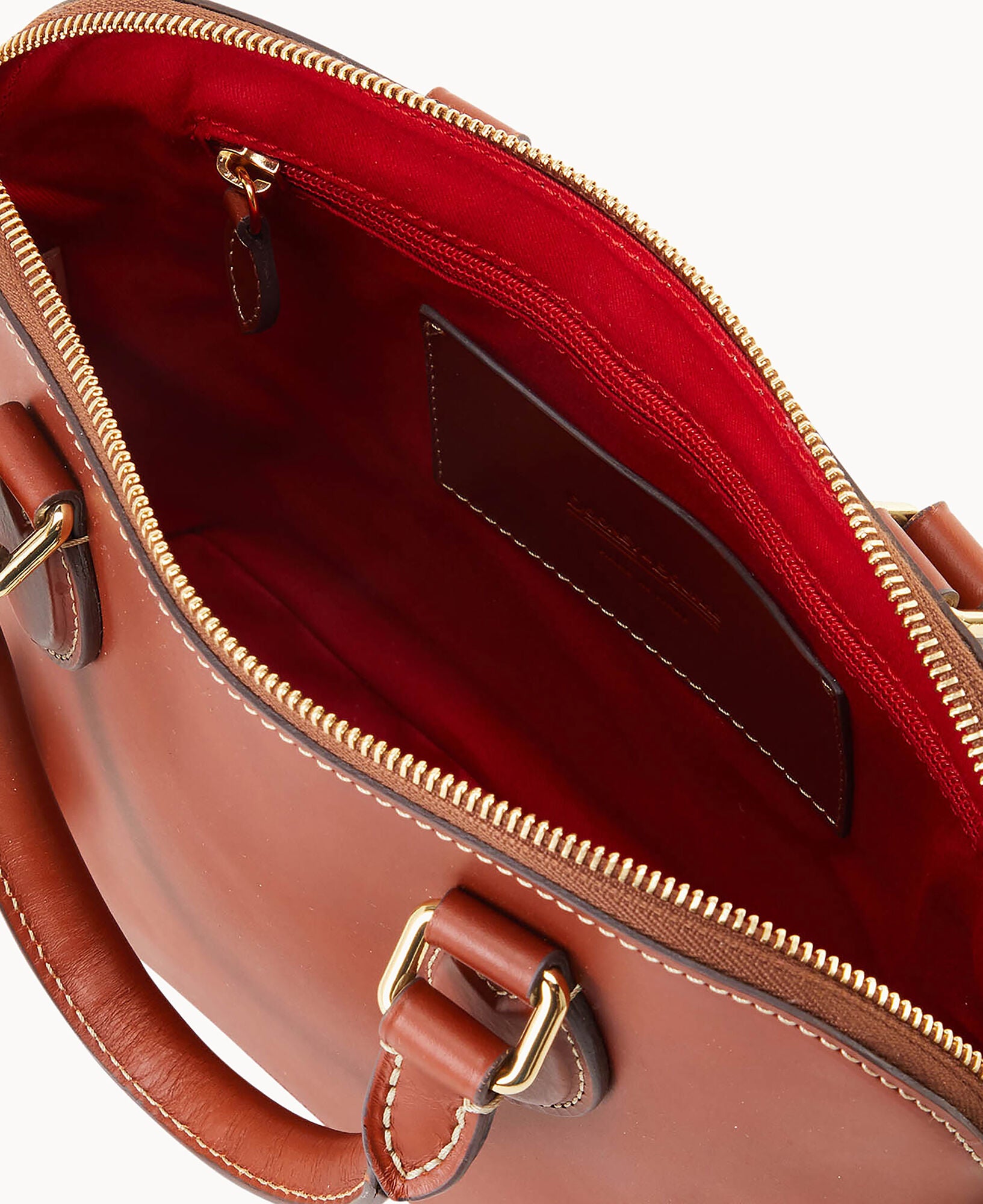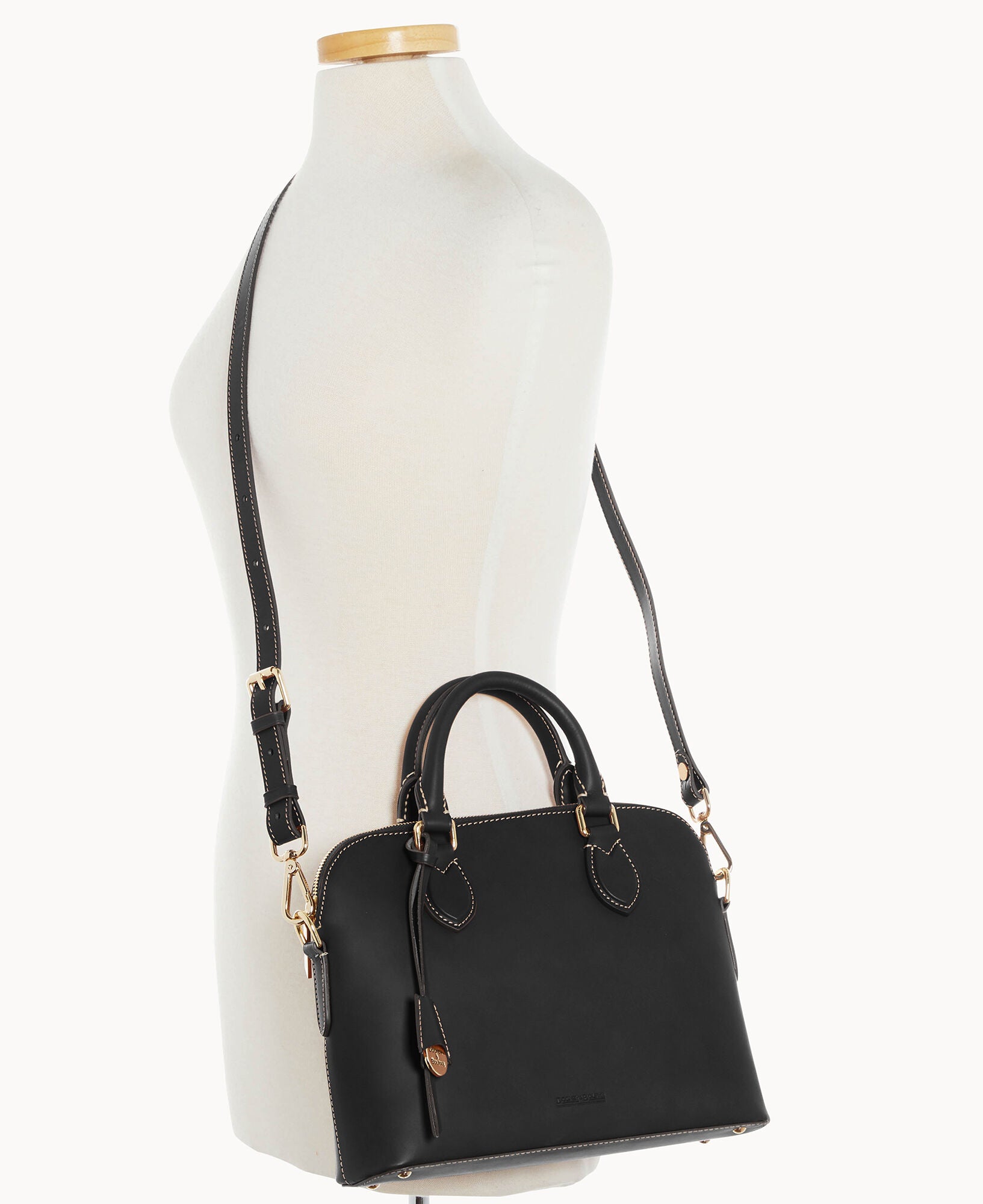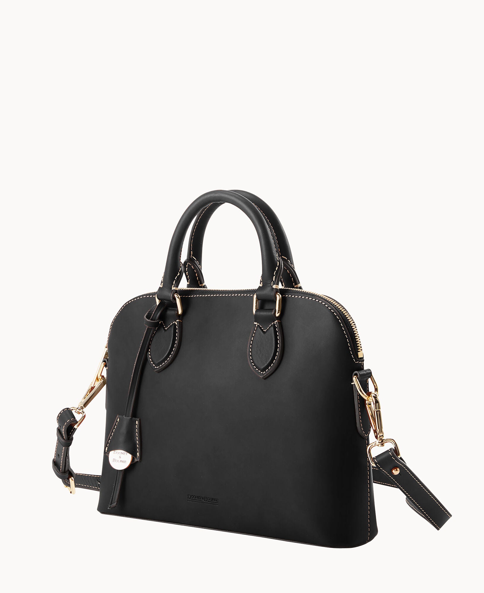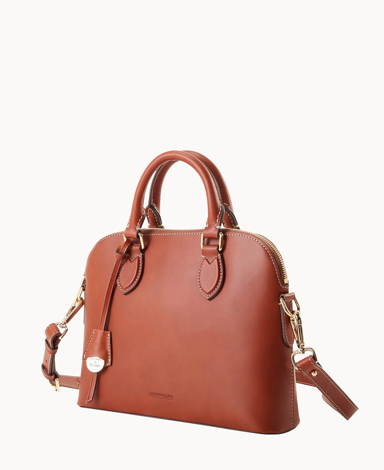 One inside slip pocket. One inside zip pocket. Cell phone pocket. Adjustable strap and detachable strap. Strap drop length 24″. Handle drop length 3.25″. Hanging medallion. Lined. Feet. Zipper closure.