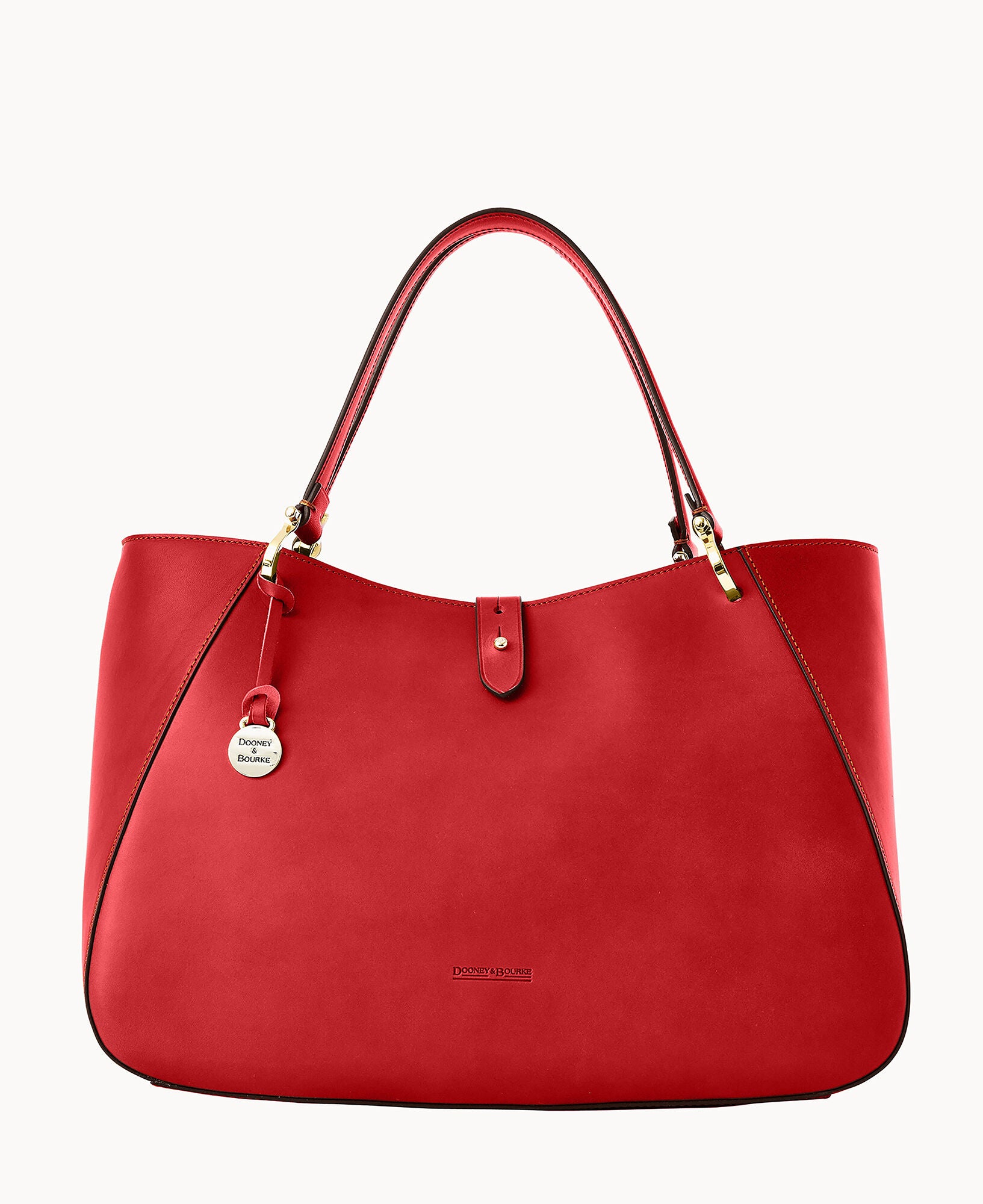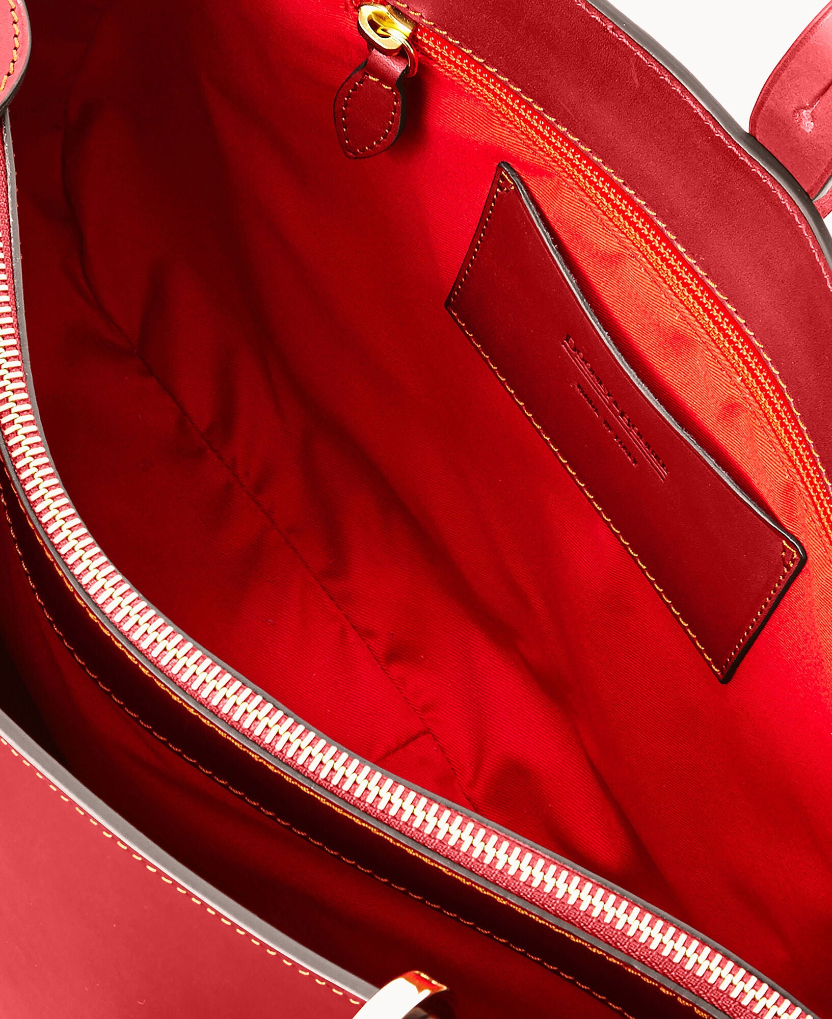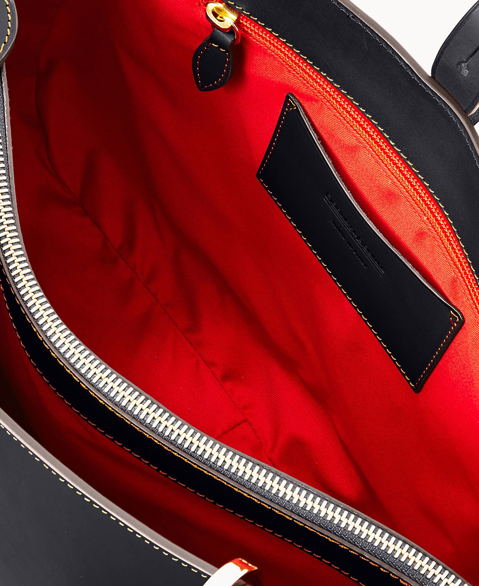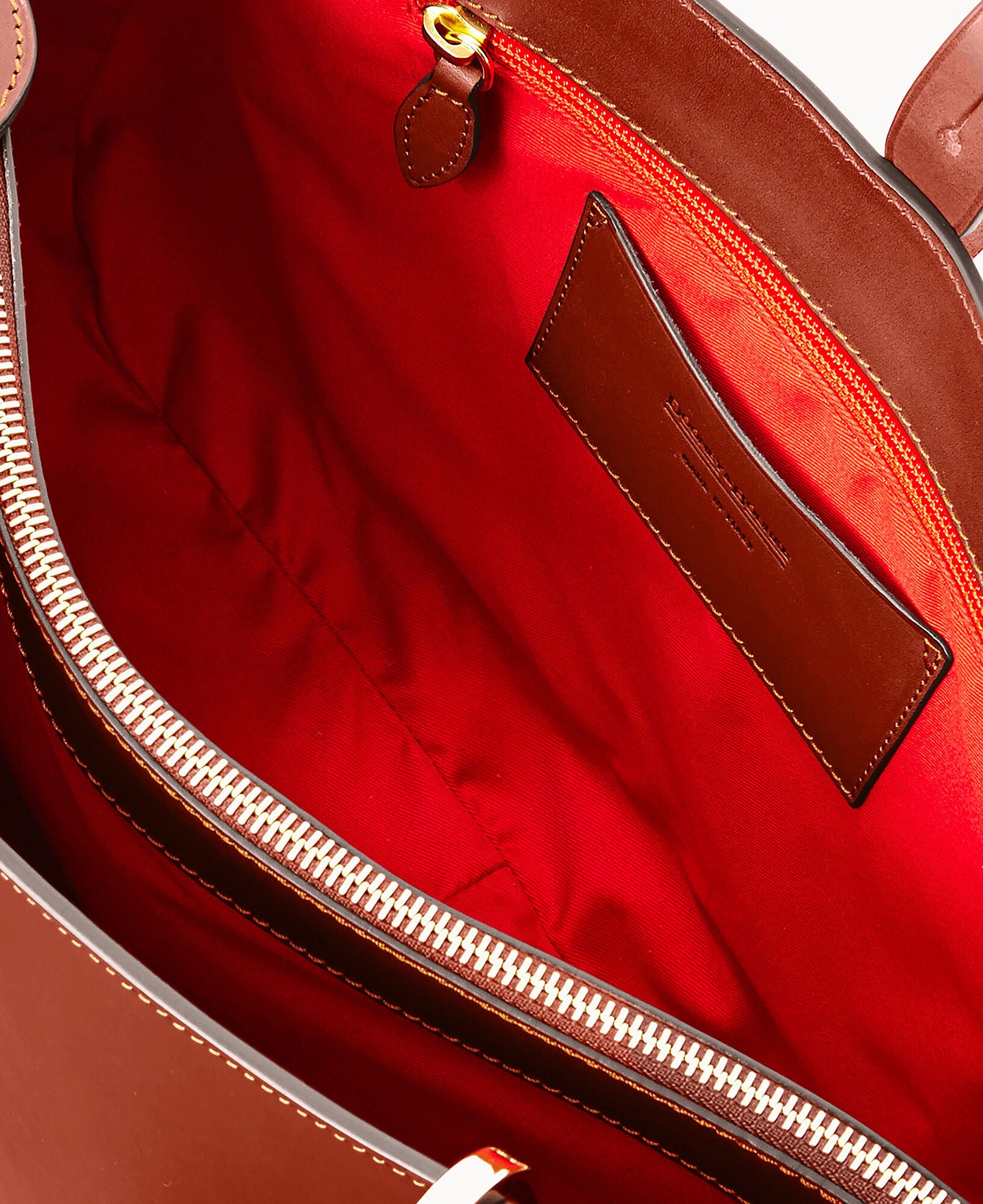 One inside zip pocket. One inside pocket. One inside credit card slot. Center zip divider compartment. Cell phone pocket. Handle drop length 7.75″. Lined. Tongue tab buckle closure.
