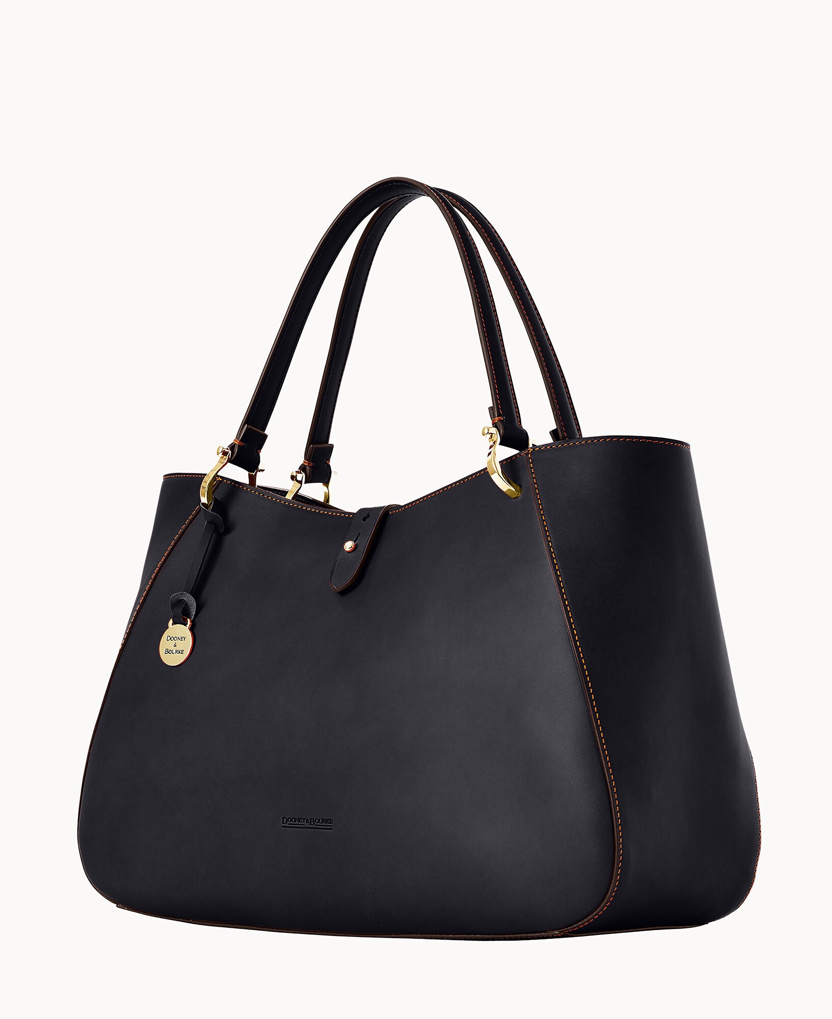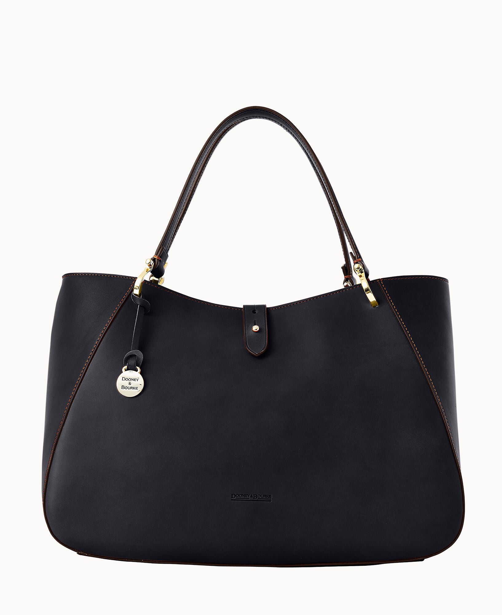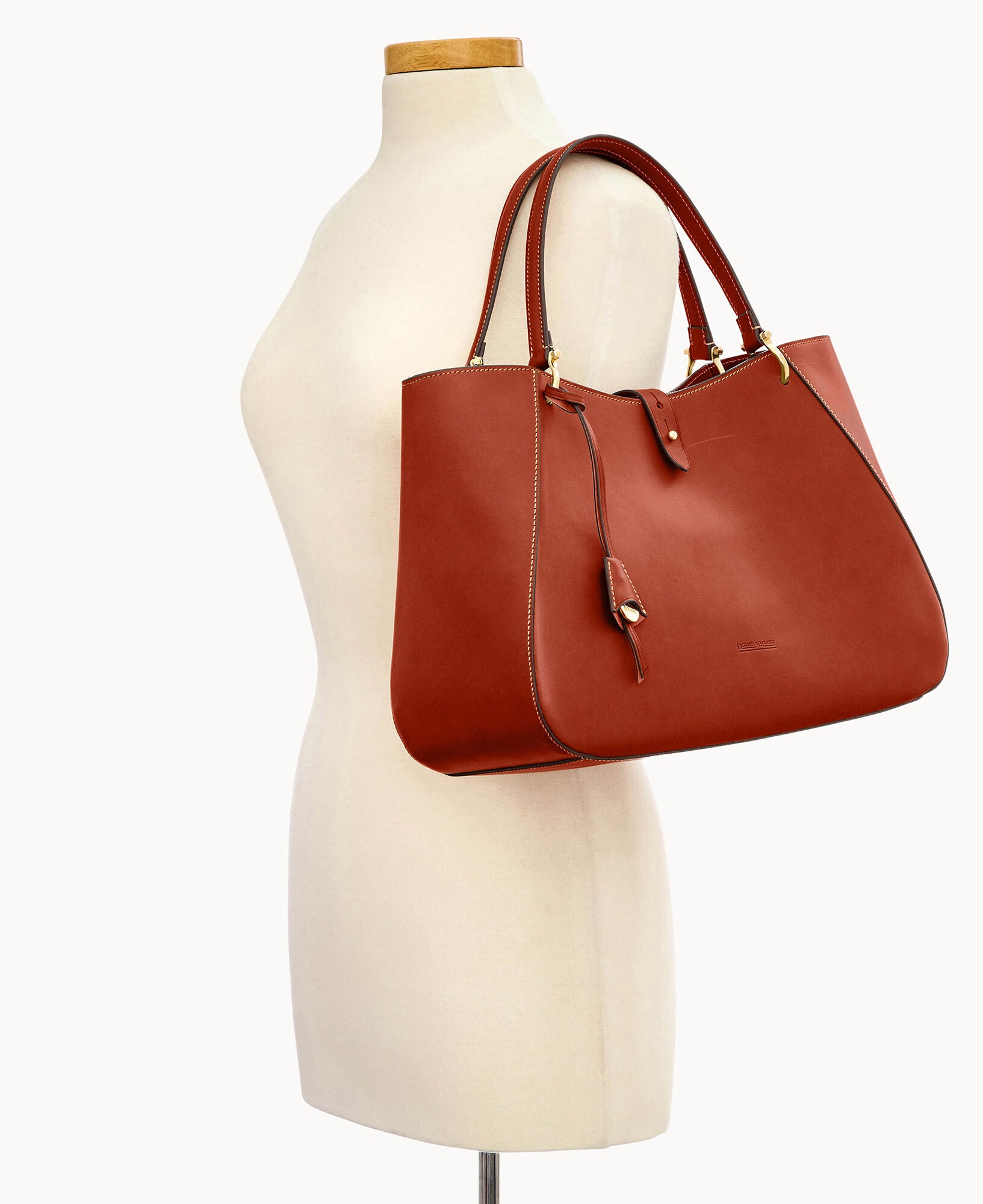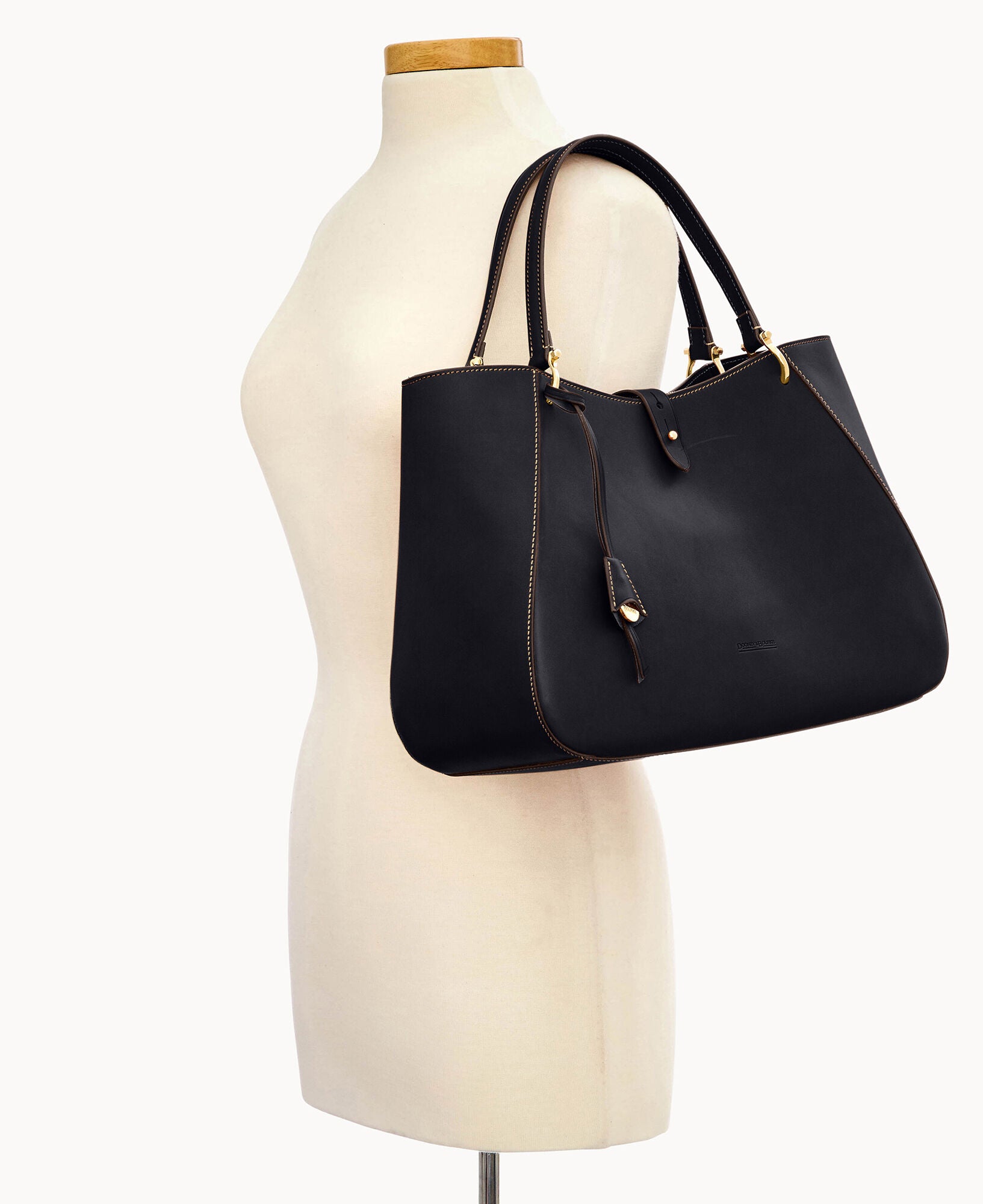 One inside zip pocket. One inside pocket. One inside credit card slot. Center zip divider compartment. Cell phone pocket. Handle drop length 7.75″. Lined. Tongue tab buckle closure.