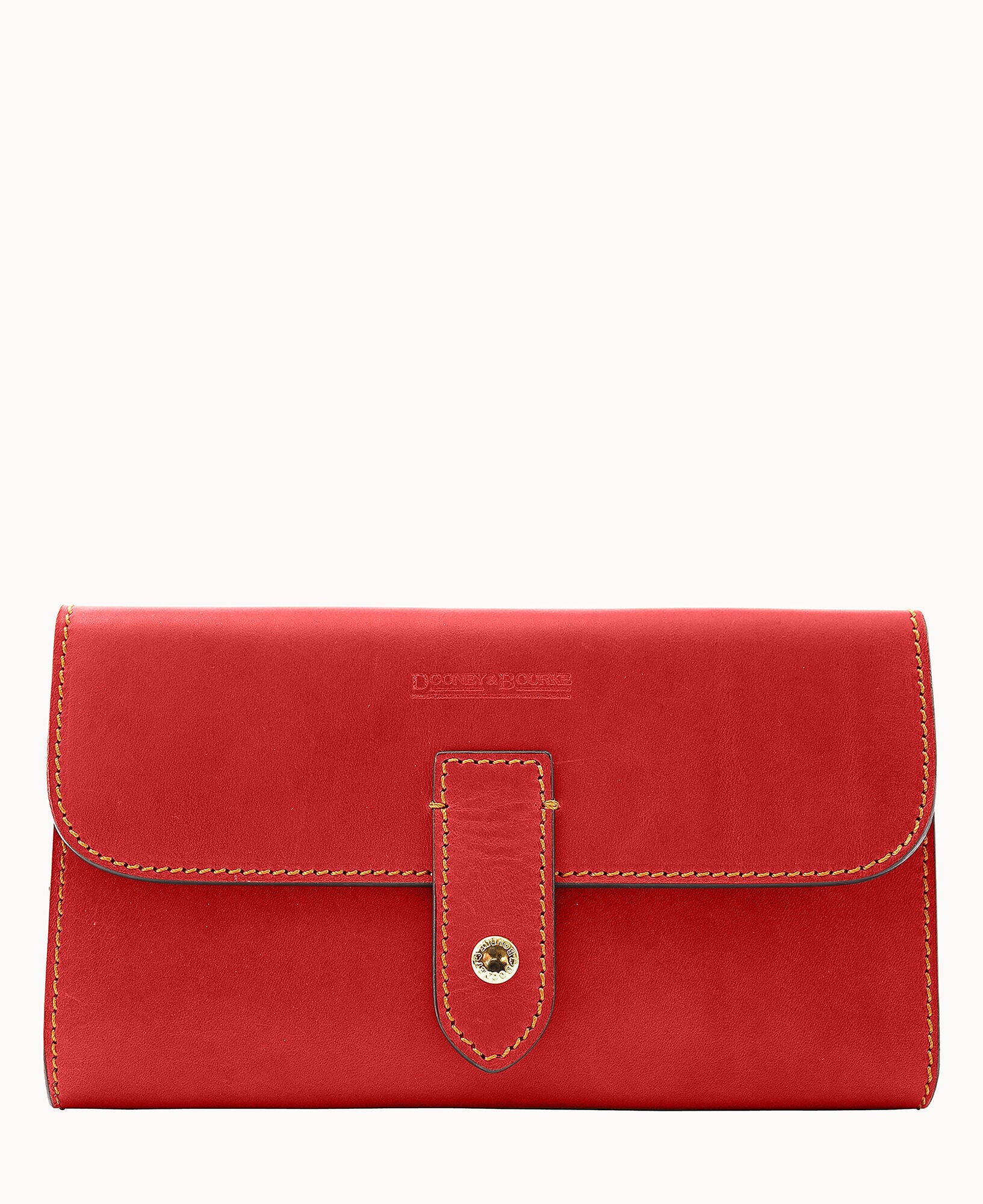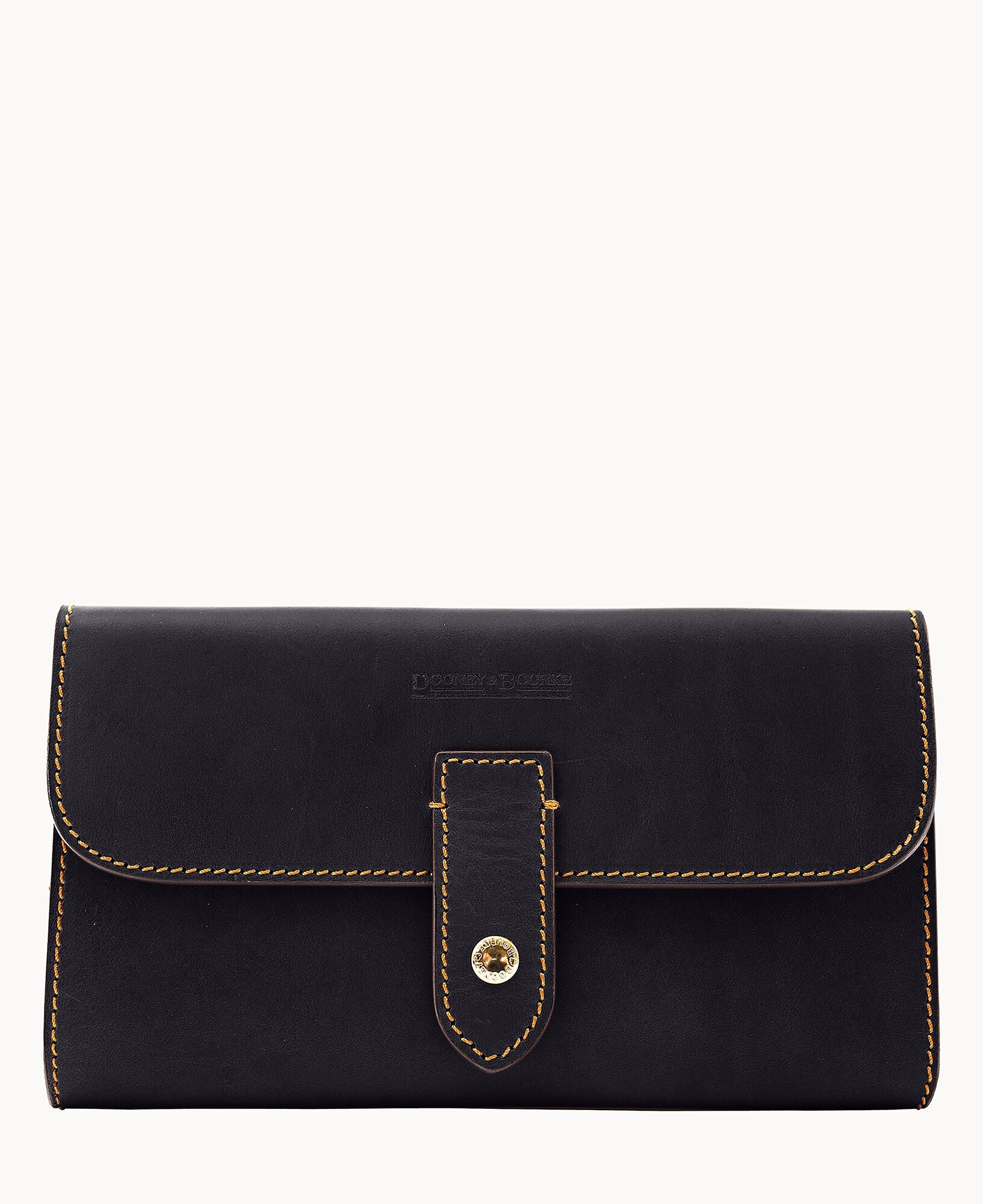 One outside zip pocket. One outside snap pocket. Outside pocket. Bill compartment. Two divided pockets. Six credit card slots. Lined. Snap closure.
