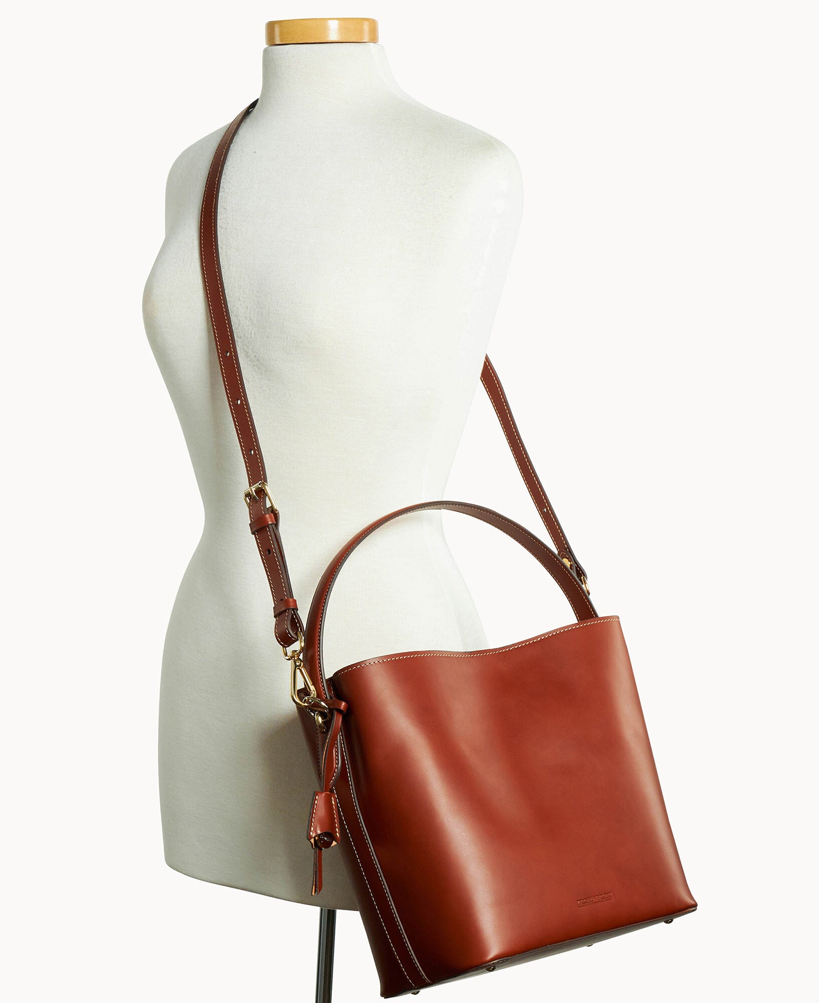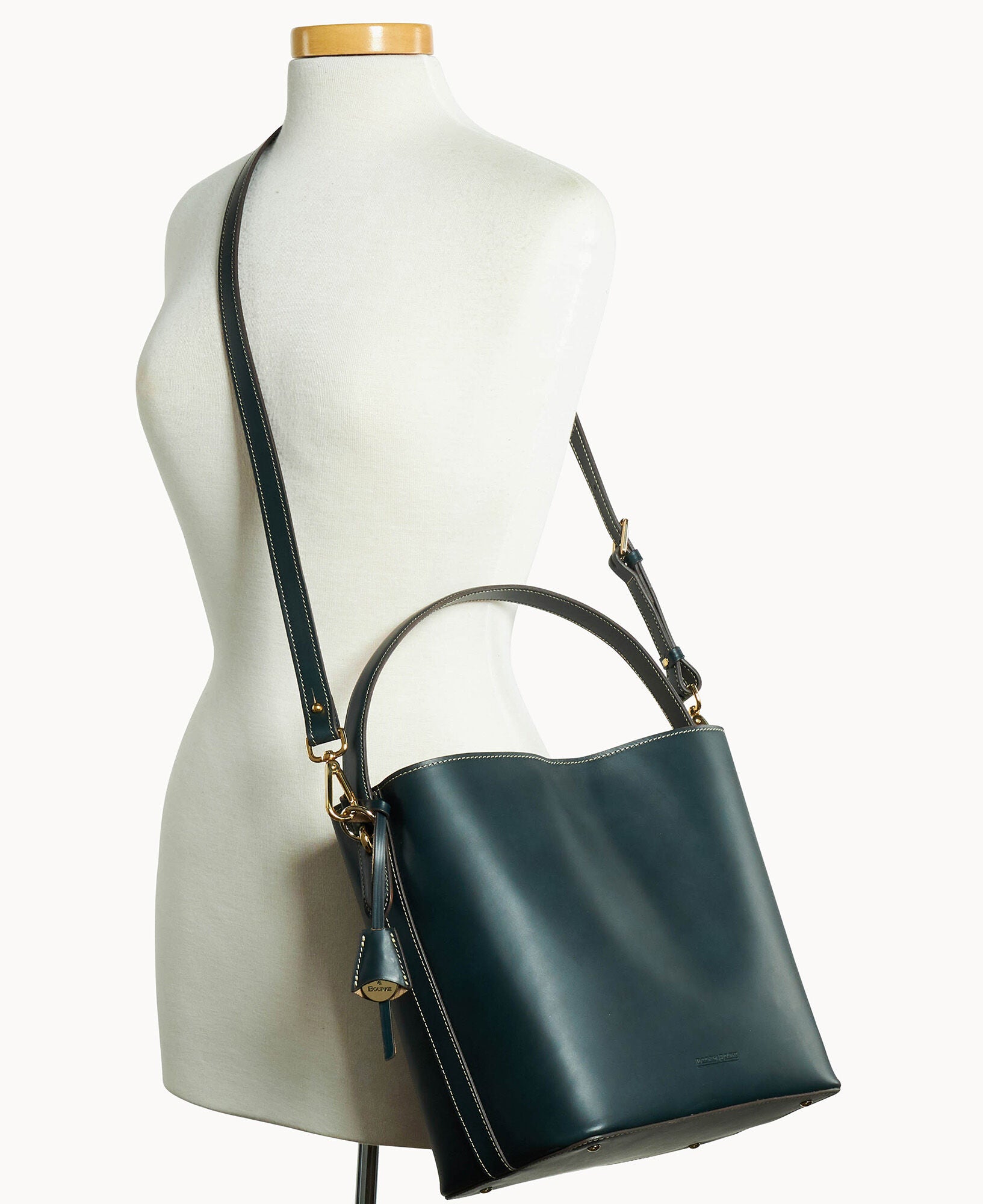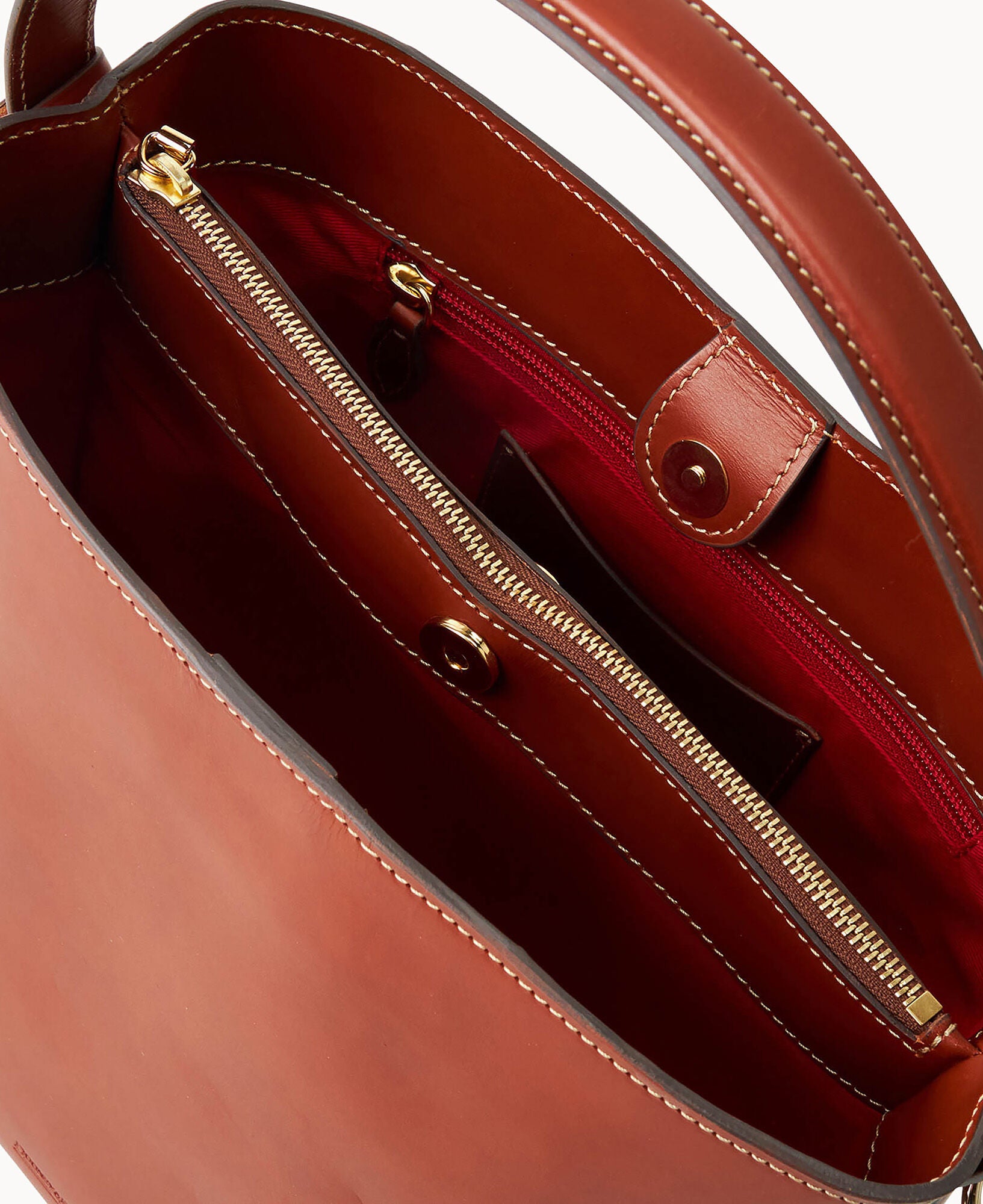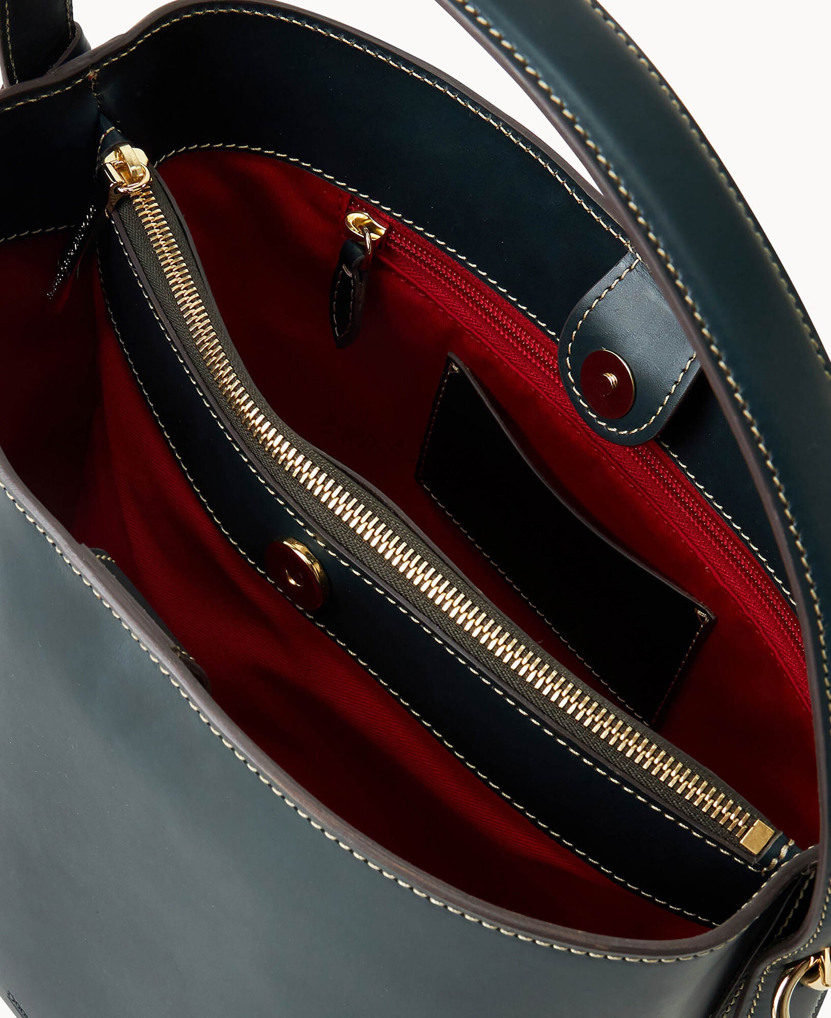 Two pockets. One center zip pocket. One inside zip pocket. One inisde slip pocket. One inside card slot. Shoulder strap drop length 21″. Handle drop length 6″. Adjustable and detachable strap. Lined. Feet. Magnetic snap closure. Removable medallion.