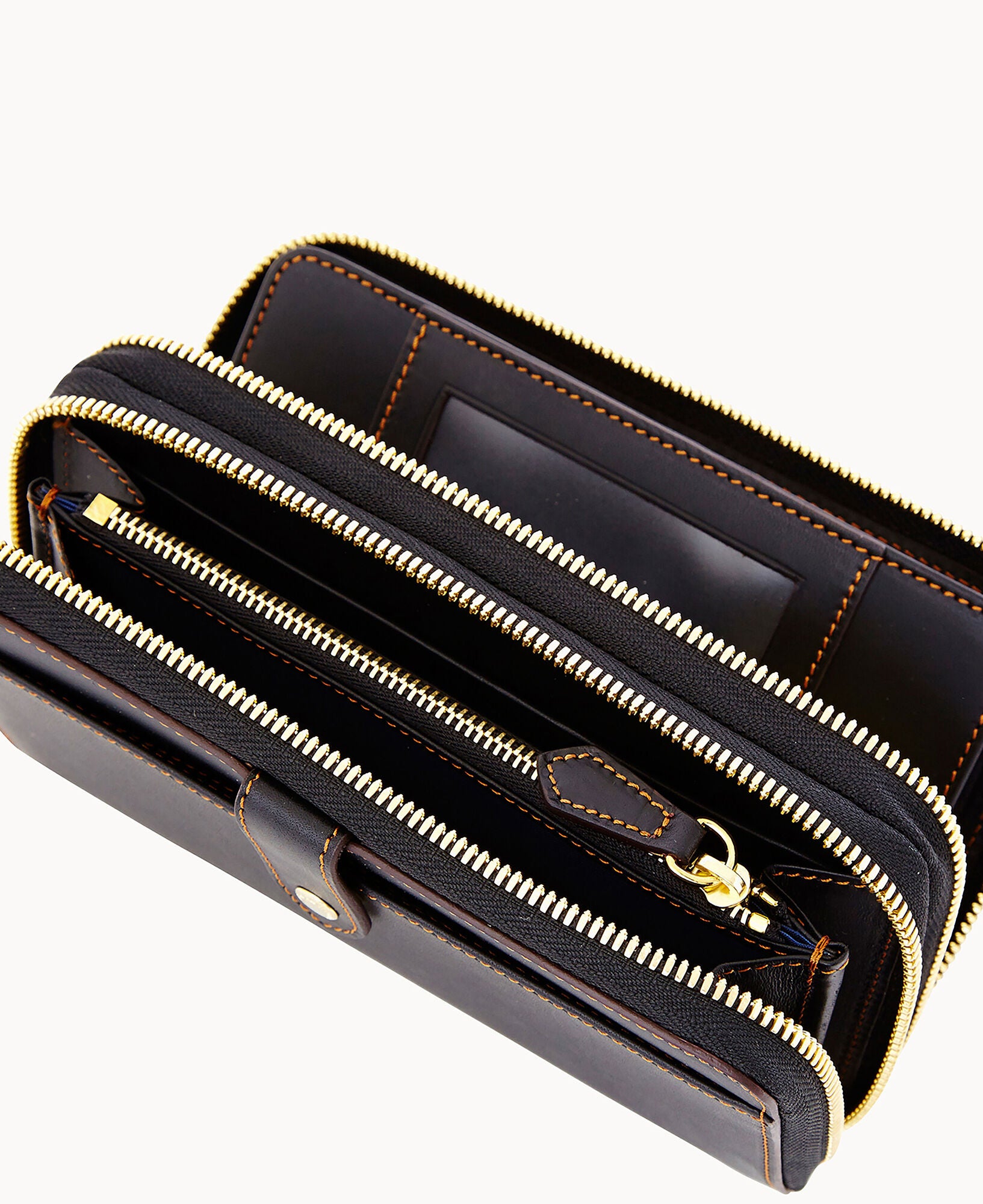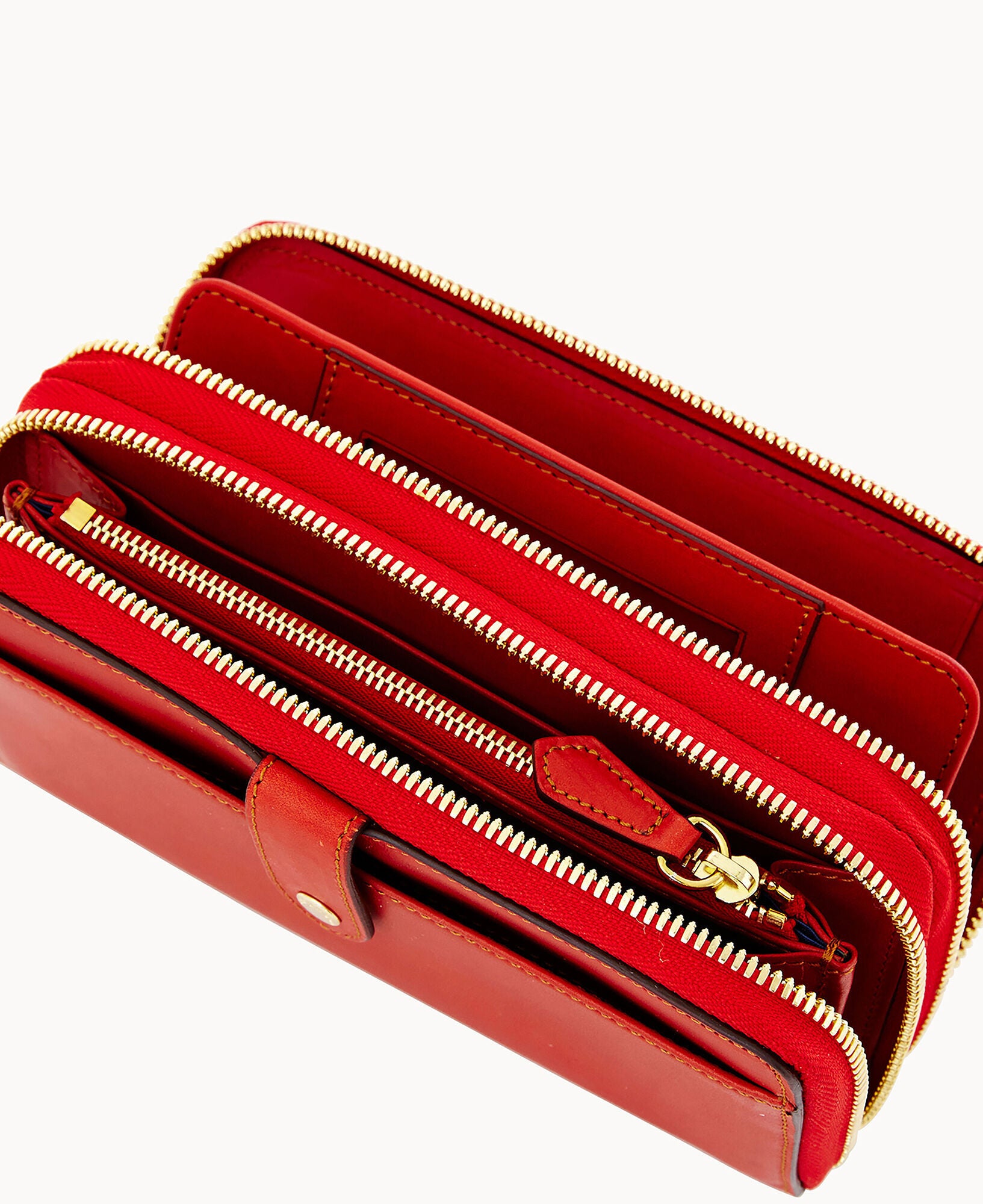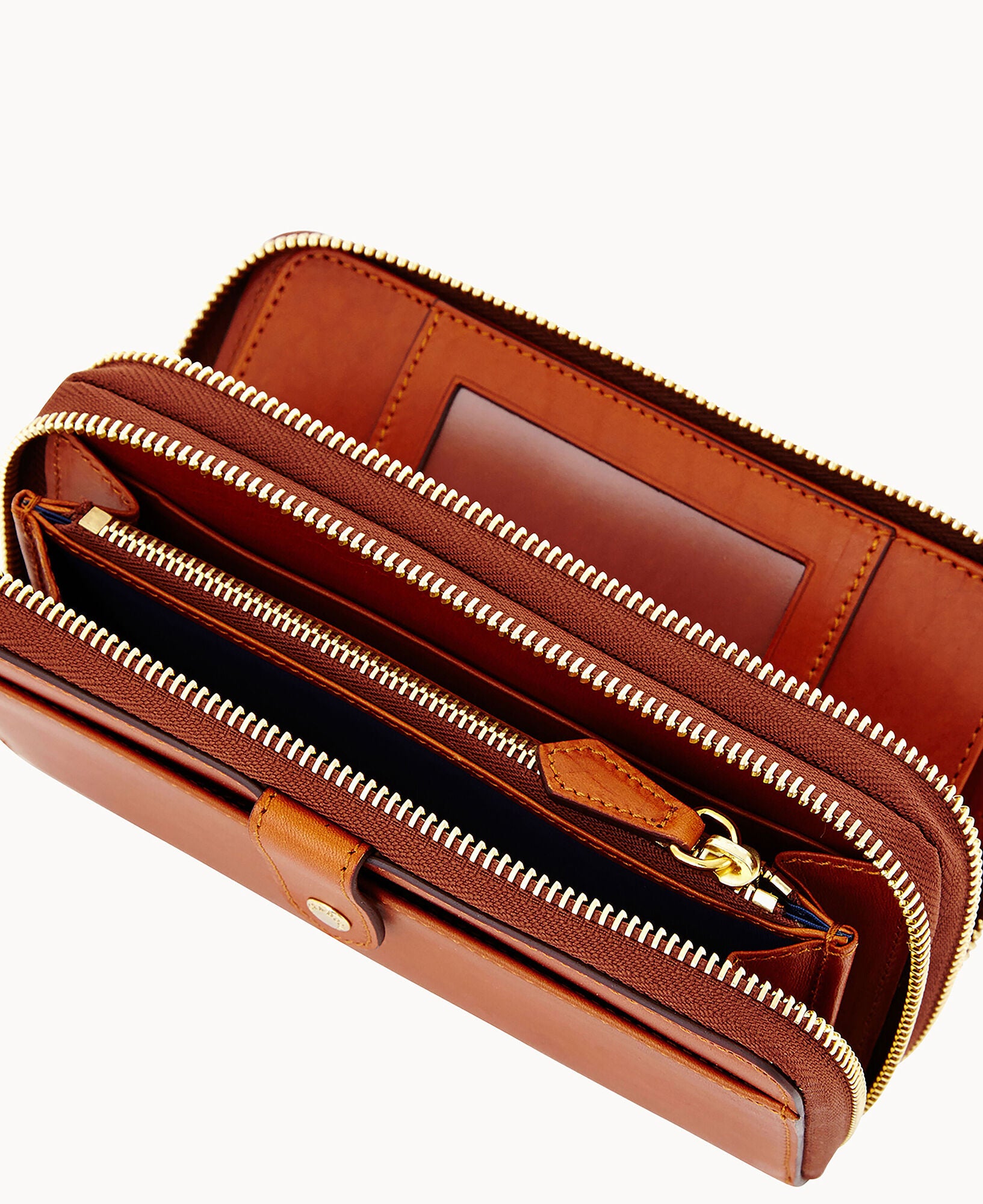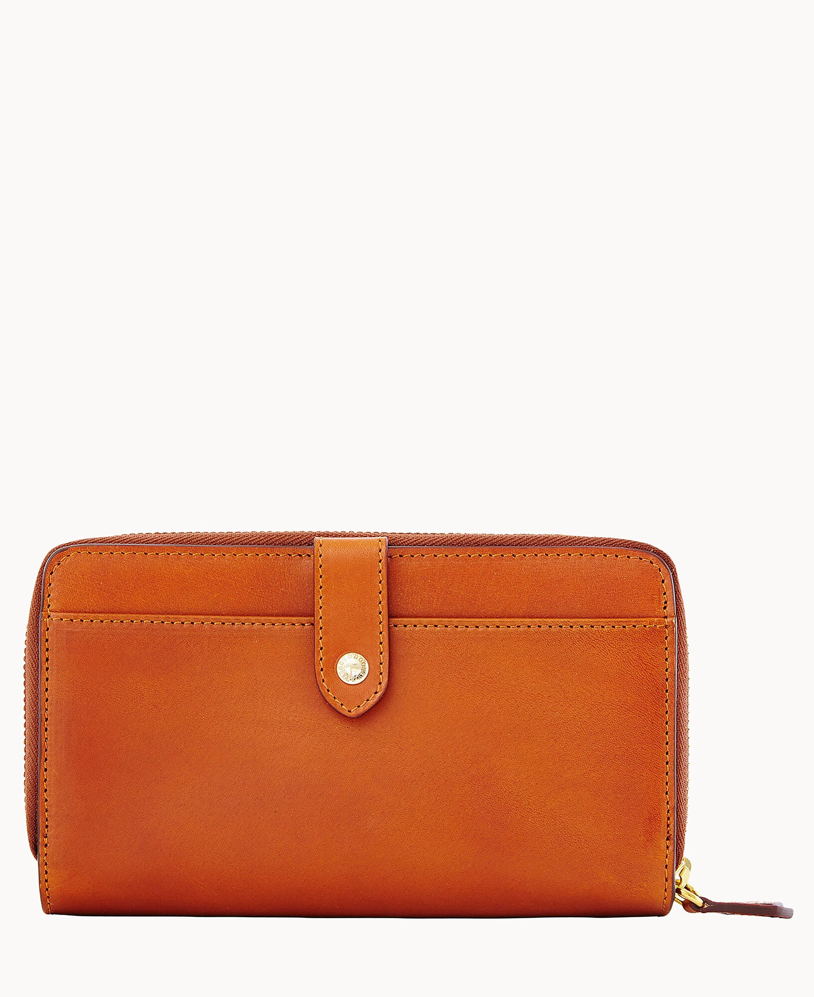 One outside zip pocket. One outside snap pocket. Outside pocket. Bill compartment. Two divided pockets. Six credit card slots. Lined. Zipper closure.
