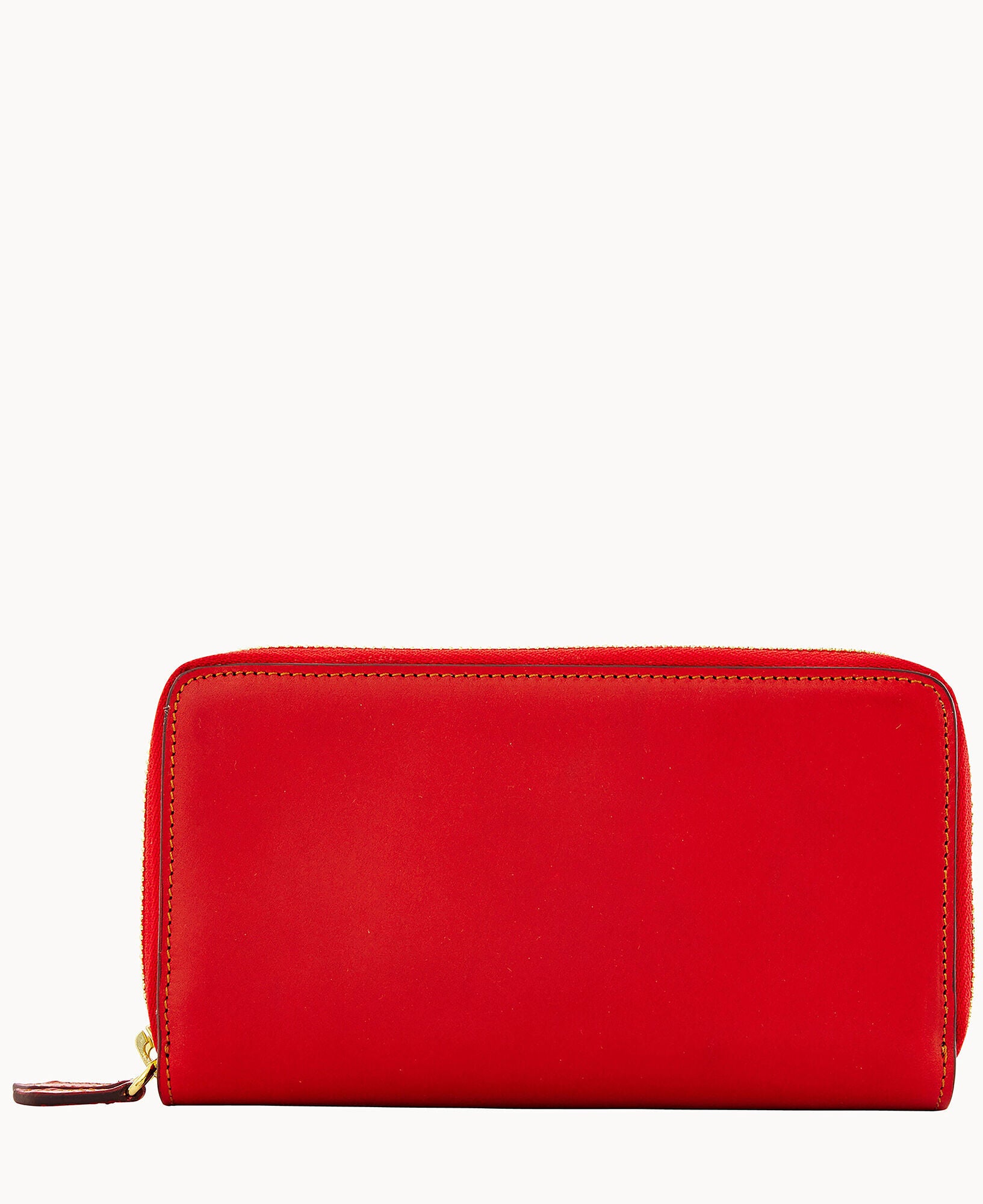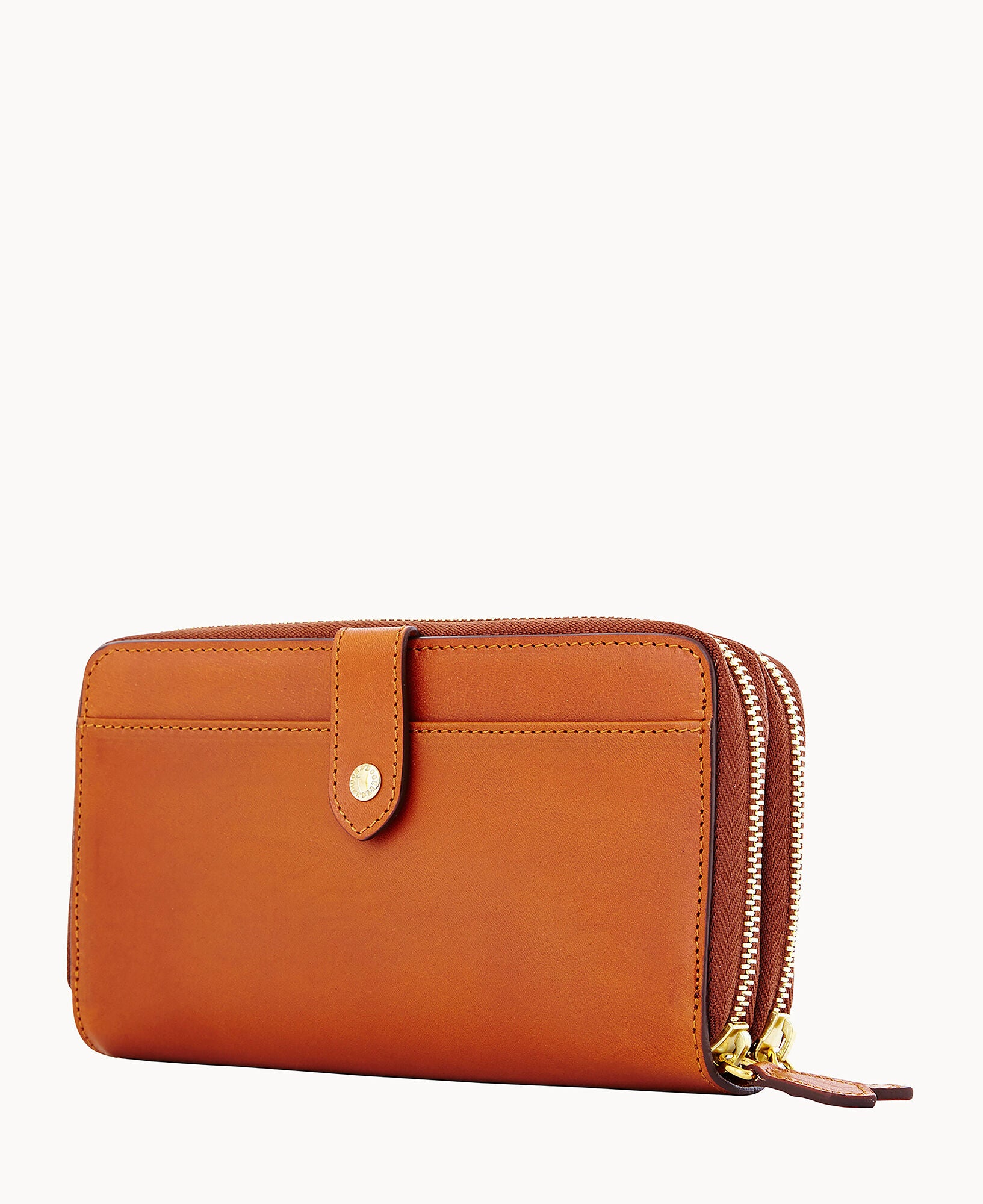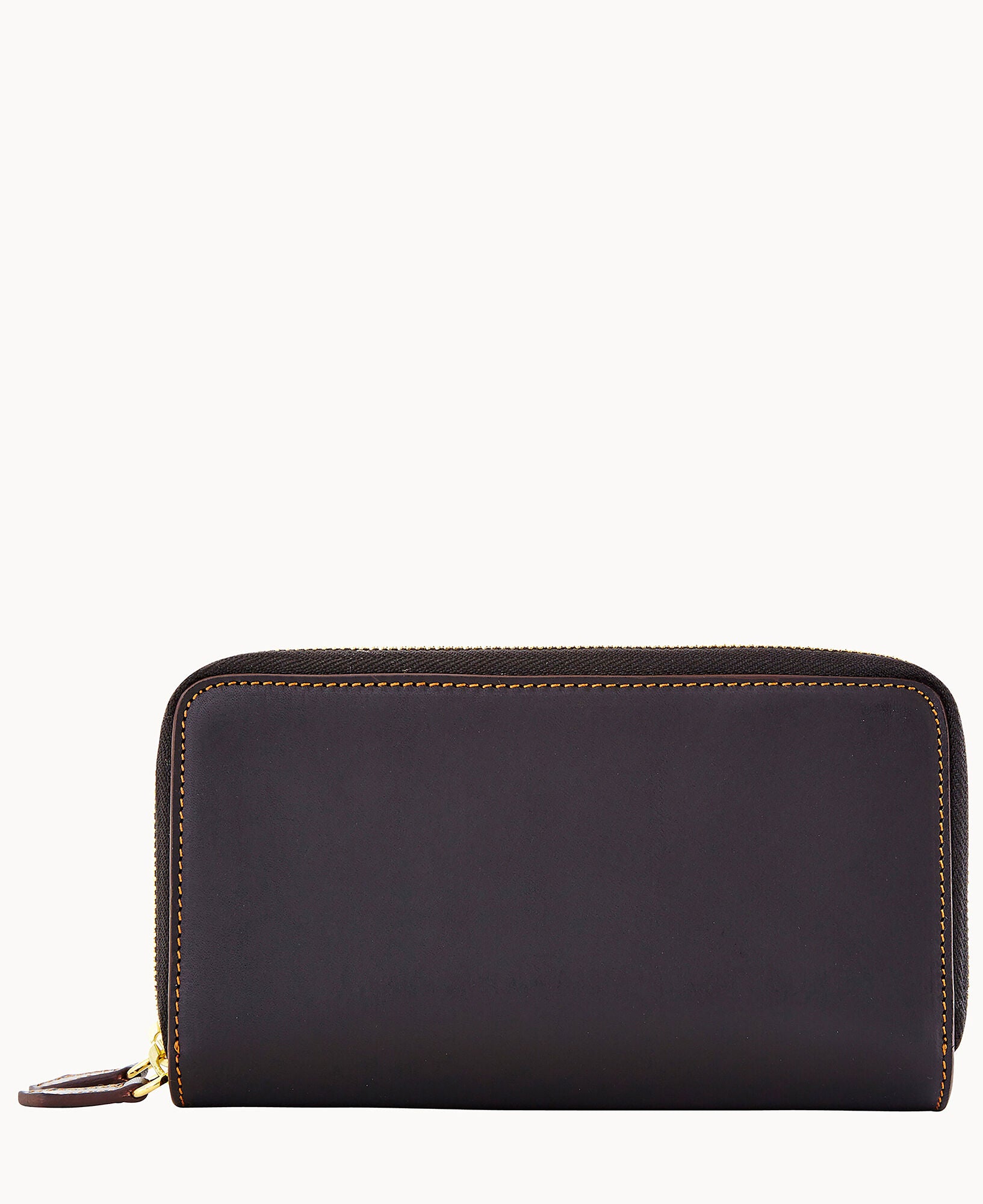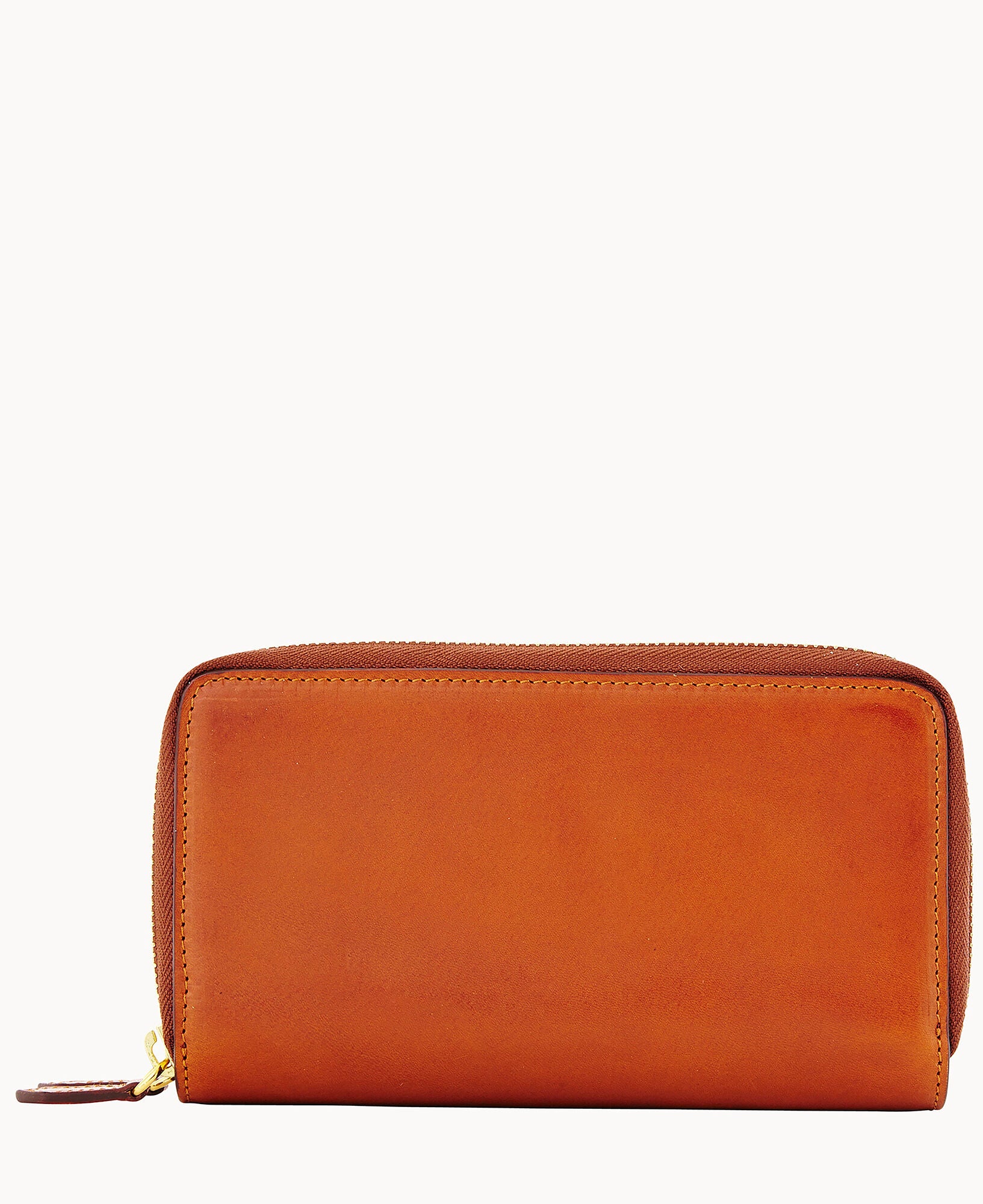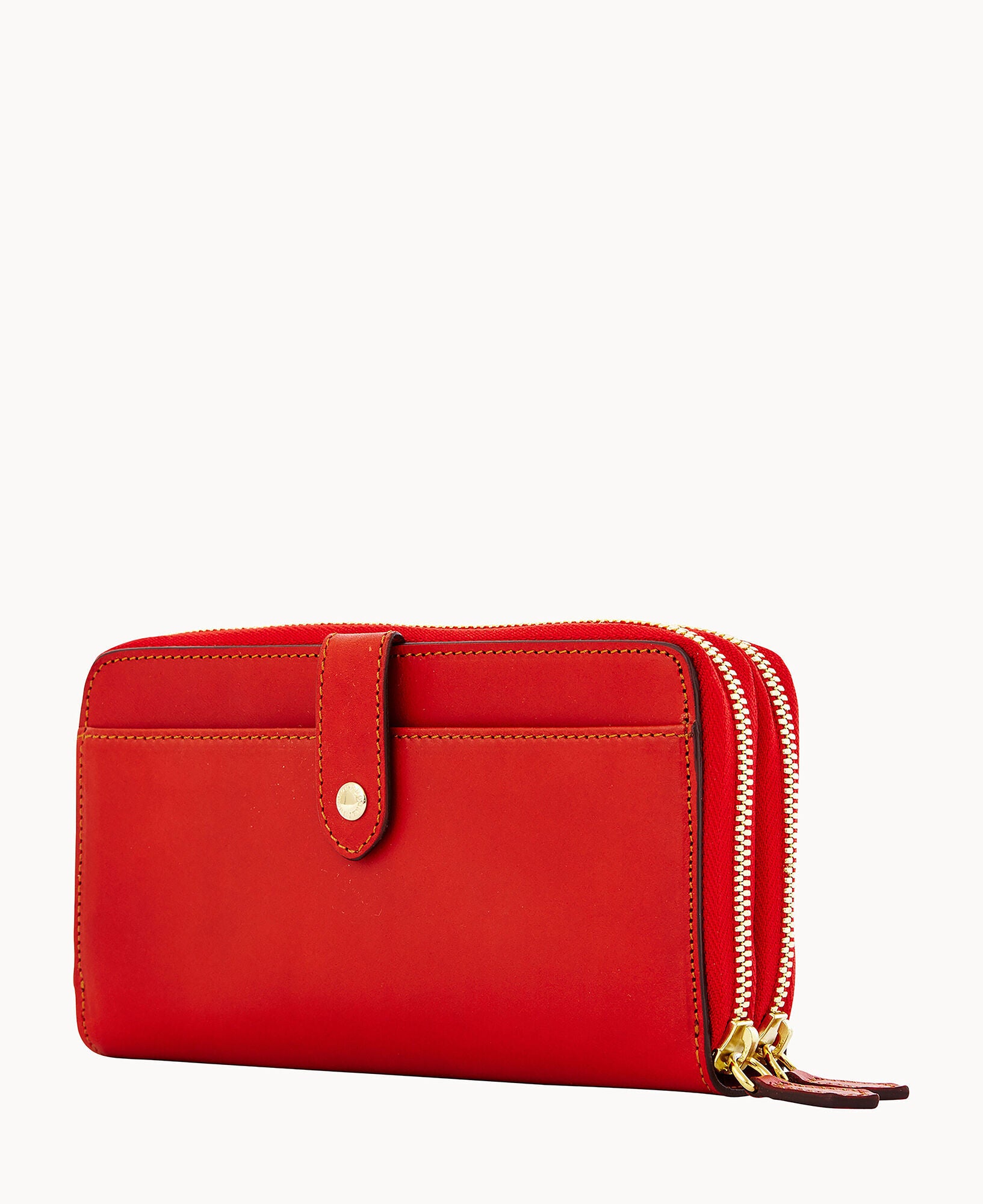One outside zip pocket. One outside snap pocket. Outside pocket. Bill compartment. Two divided pockets. Six credit card slots. Lined. Zipper closure.