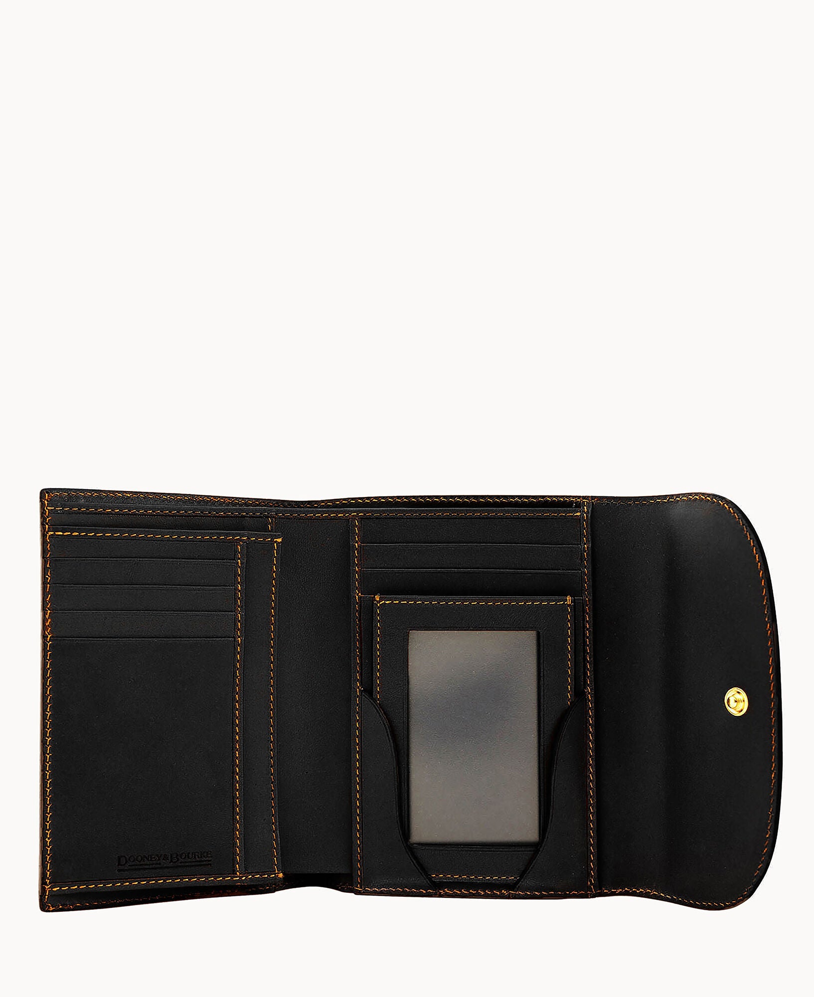 One outside zip pocket. One outside pocket. Six credit card slots. Bill compartment. Two divided pockets. Lined. Snap closure.
