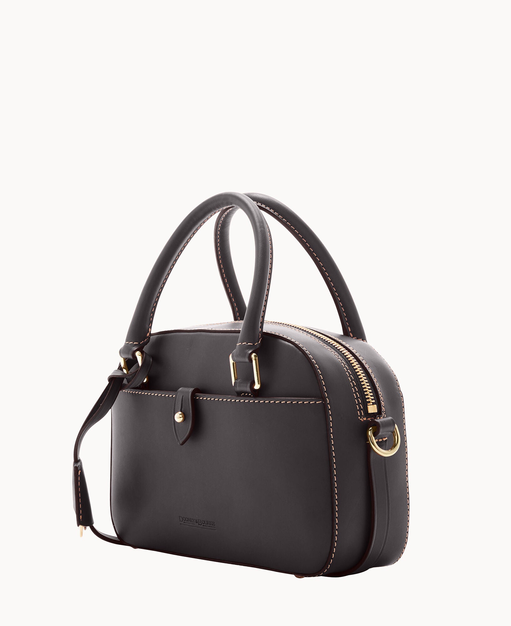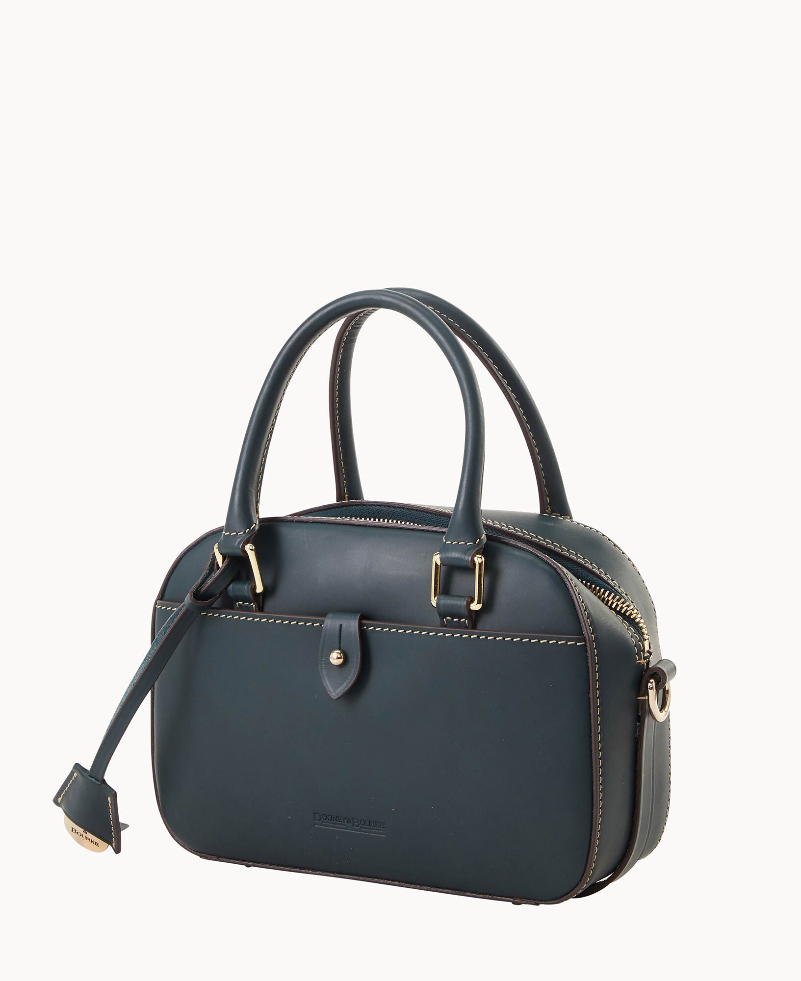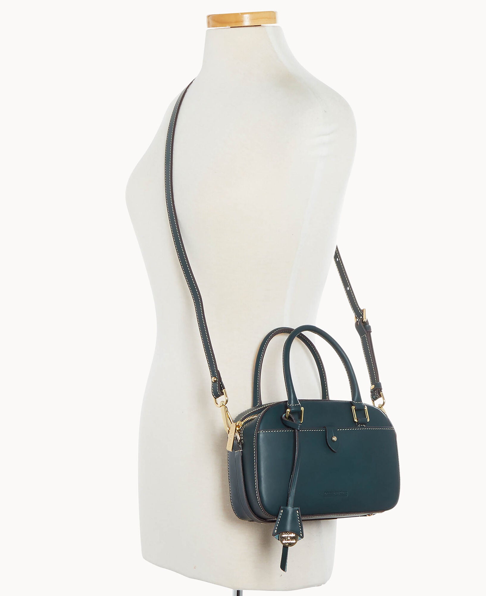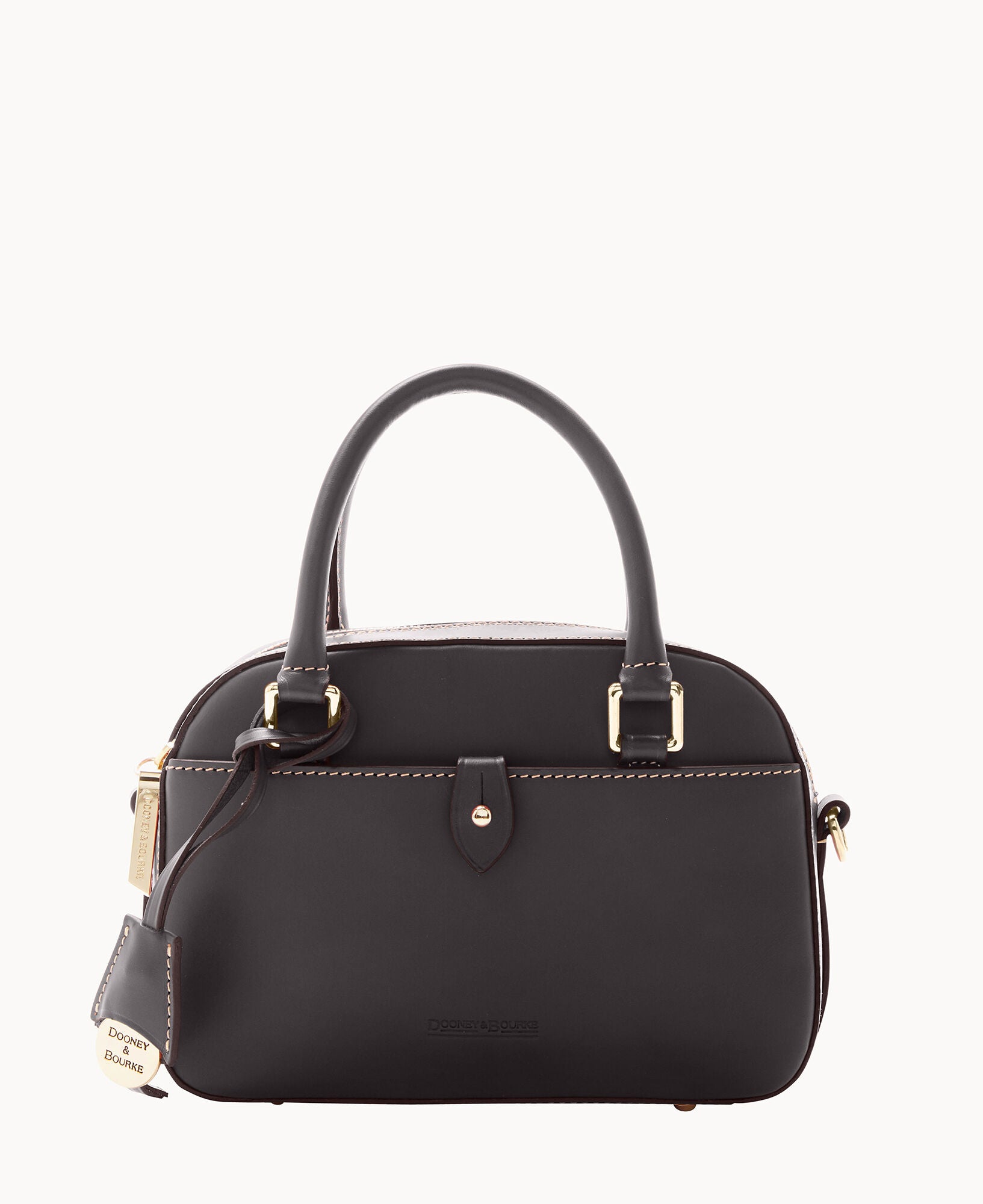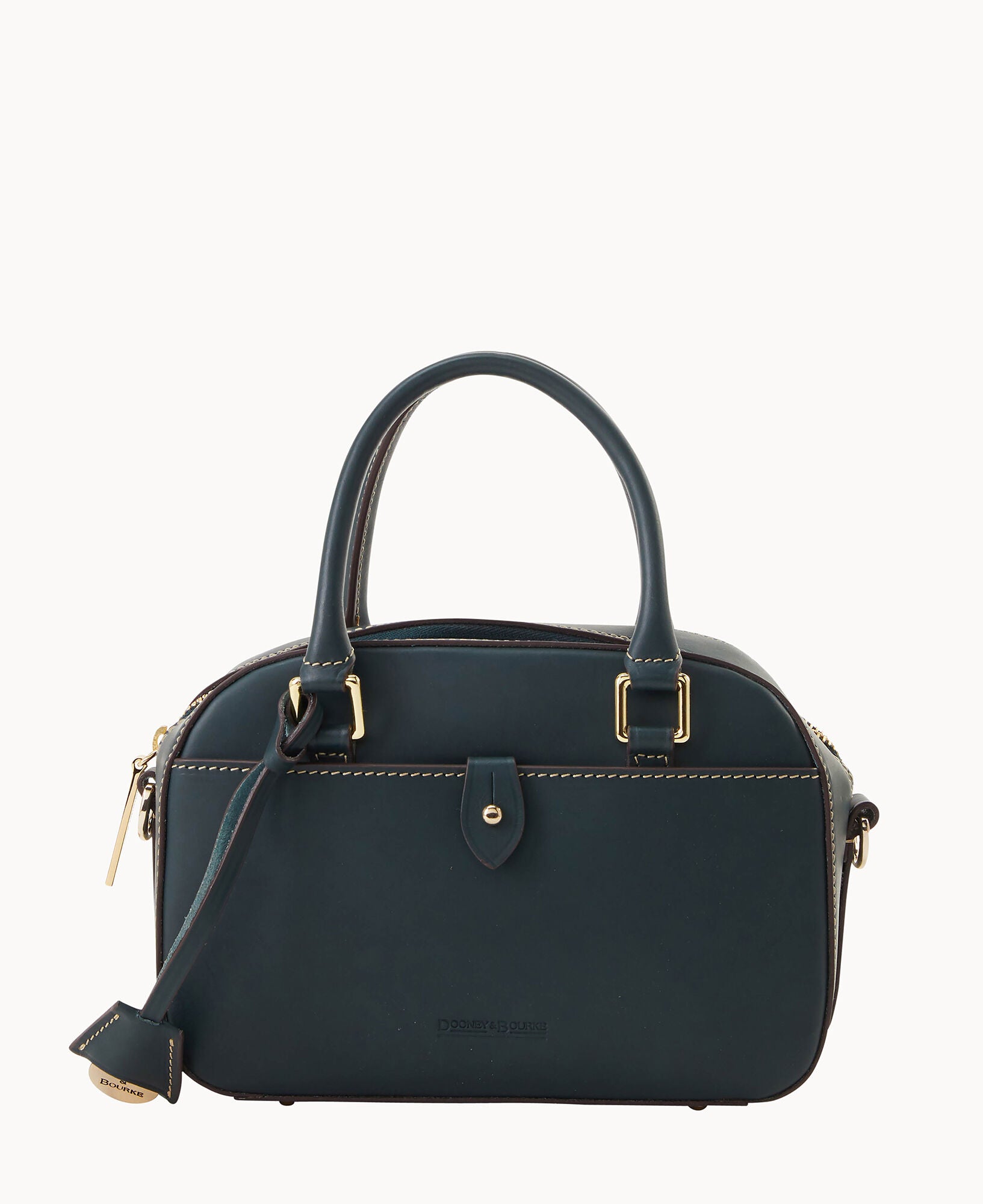One outside pocket with tongue tab closure. One inside slip pocket. One inside zip pocket. Strap drop length 23″. Handle drop length 3.25″. Adjustable and detachable strap. Removable medallion. Lined. Feet. Zipper closure.