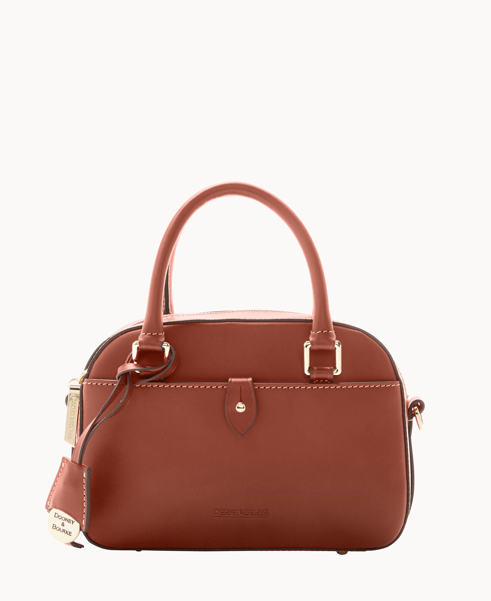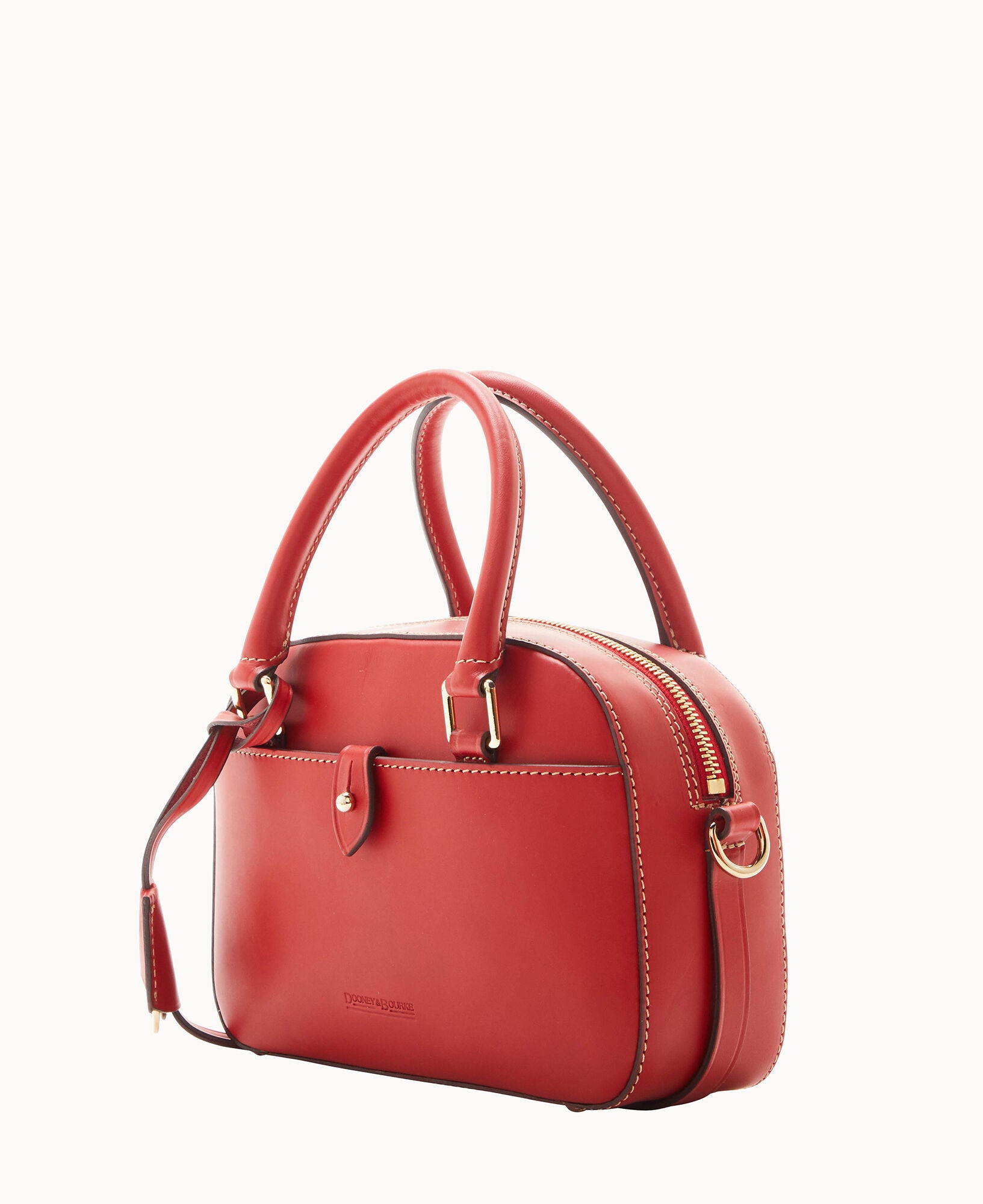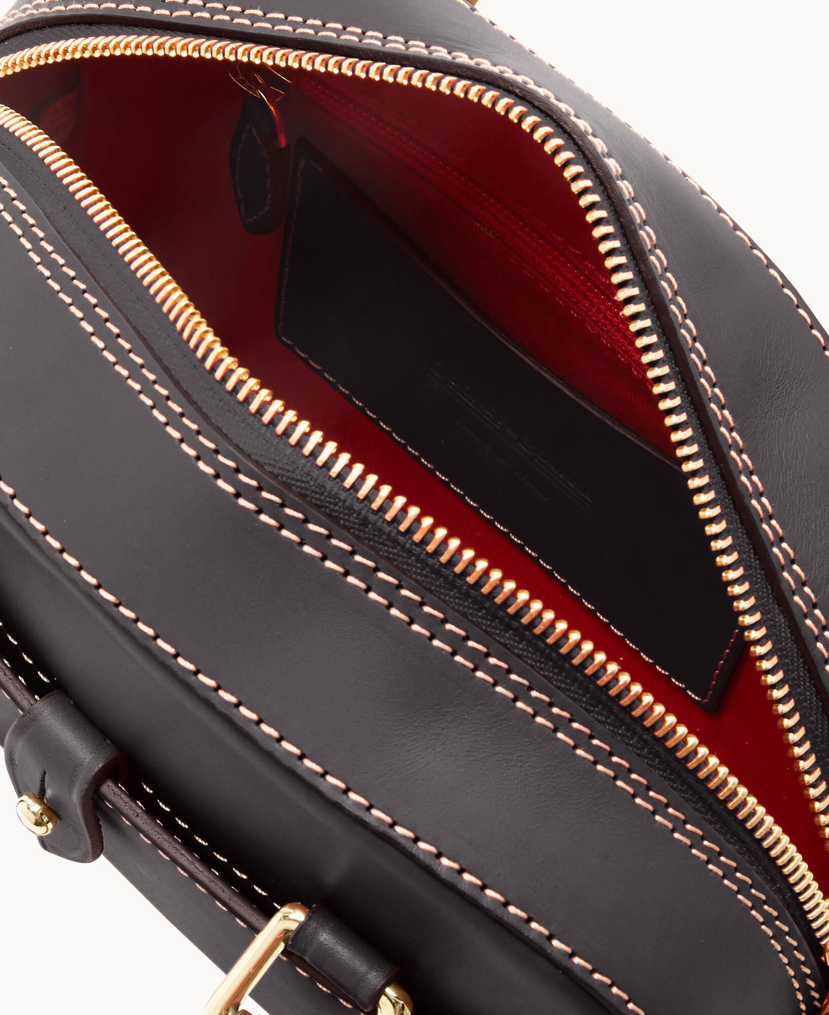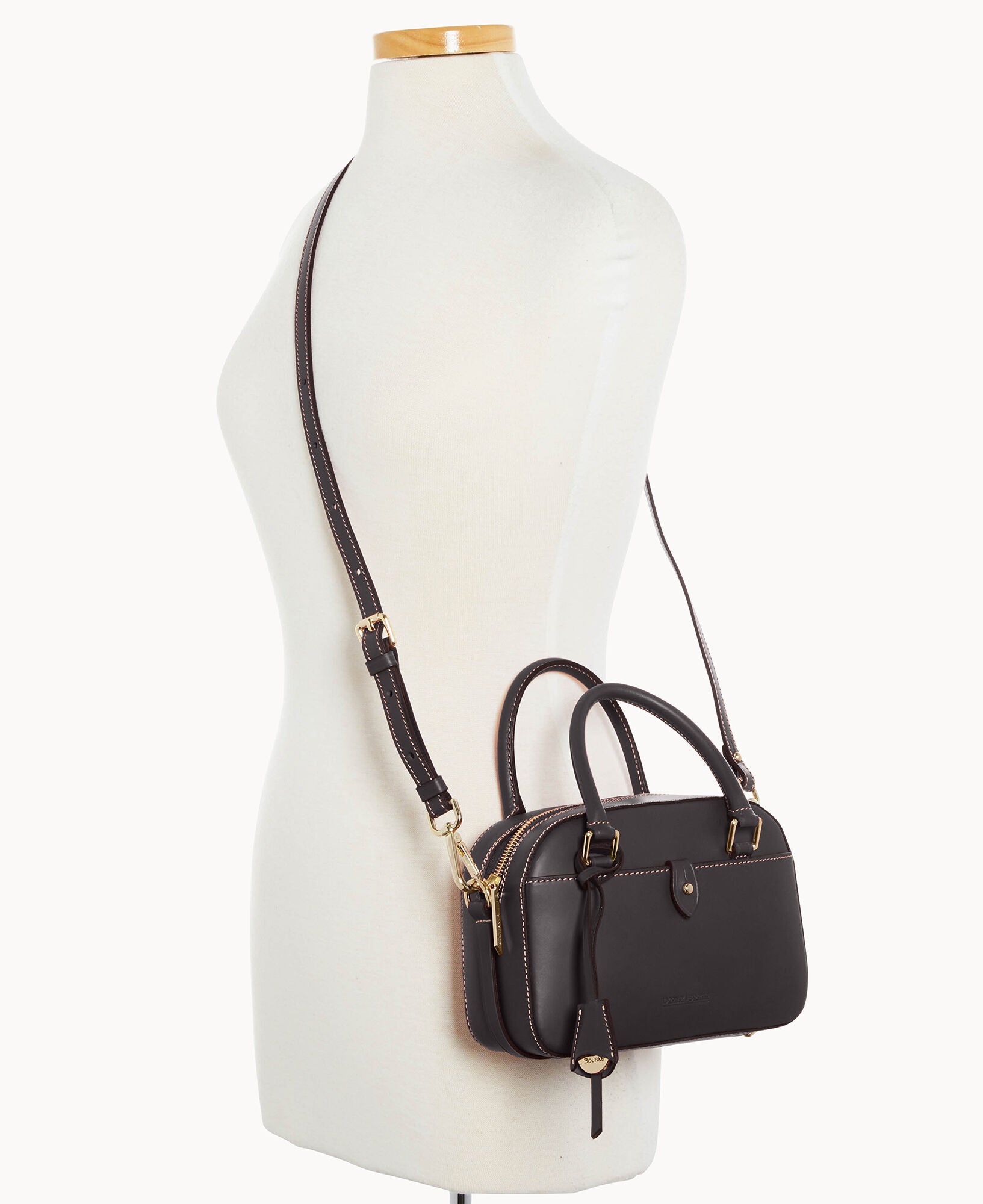 One outside pocket with tongue tab closure. One inside slip pocket. One inside zip pocket. Strap drop length 23″. Handle drop length 3.25″. Adjustable and detachable strap. Removable medallion. Lined. Feet. Zipper closure.