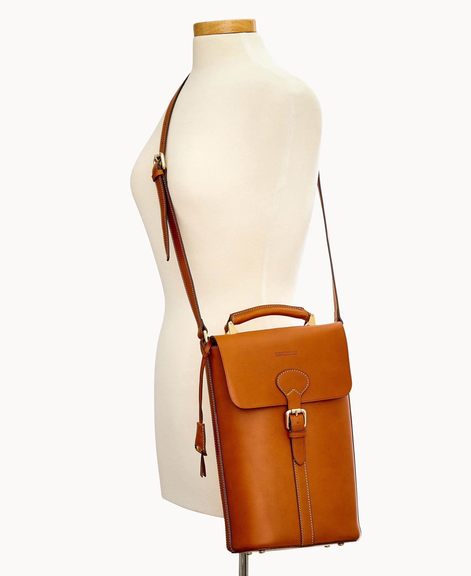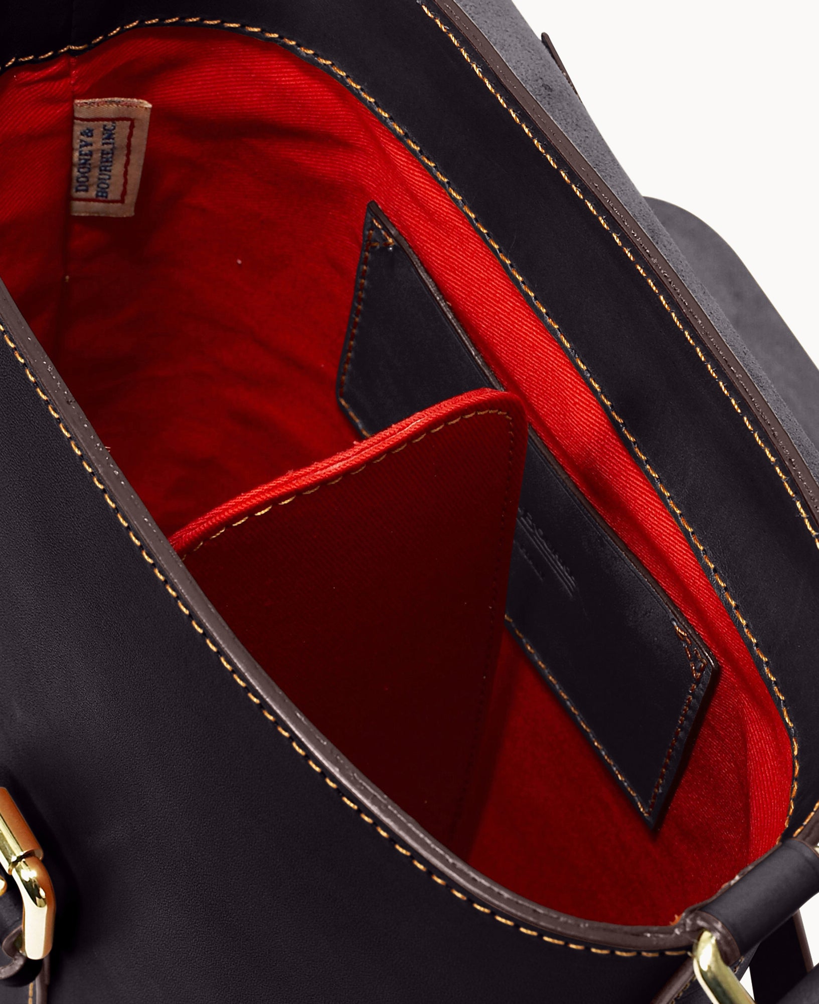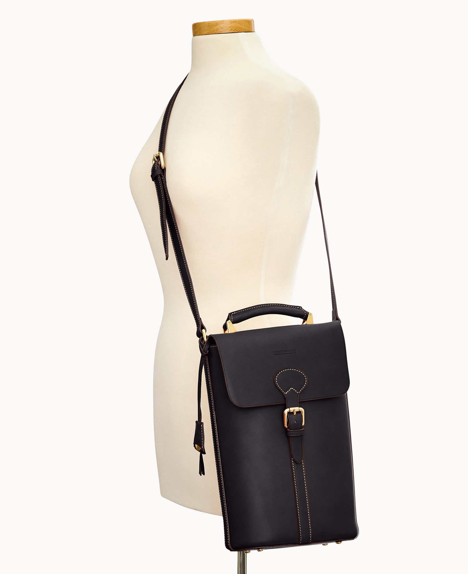 Suede removable divider. Adjustable shoulder strap. Strap drop length 19″. Buckle closure.