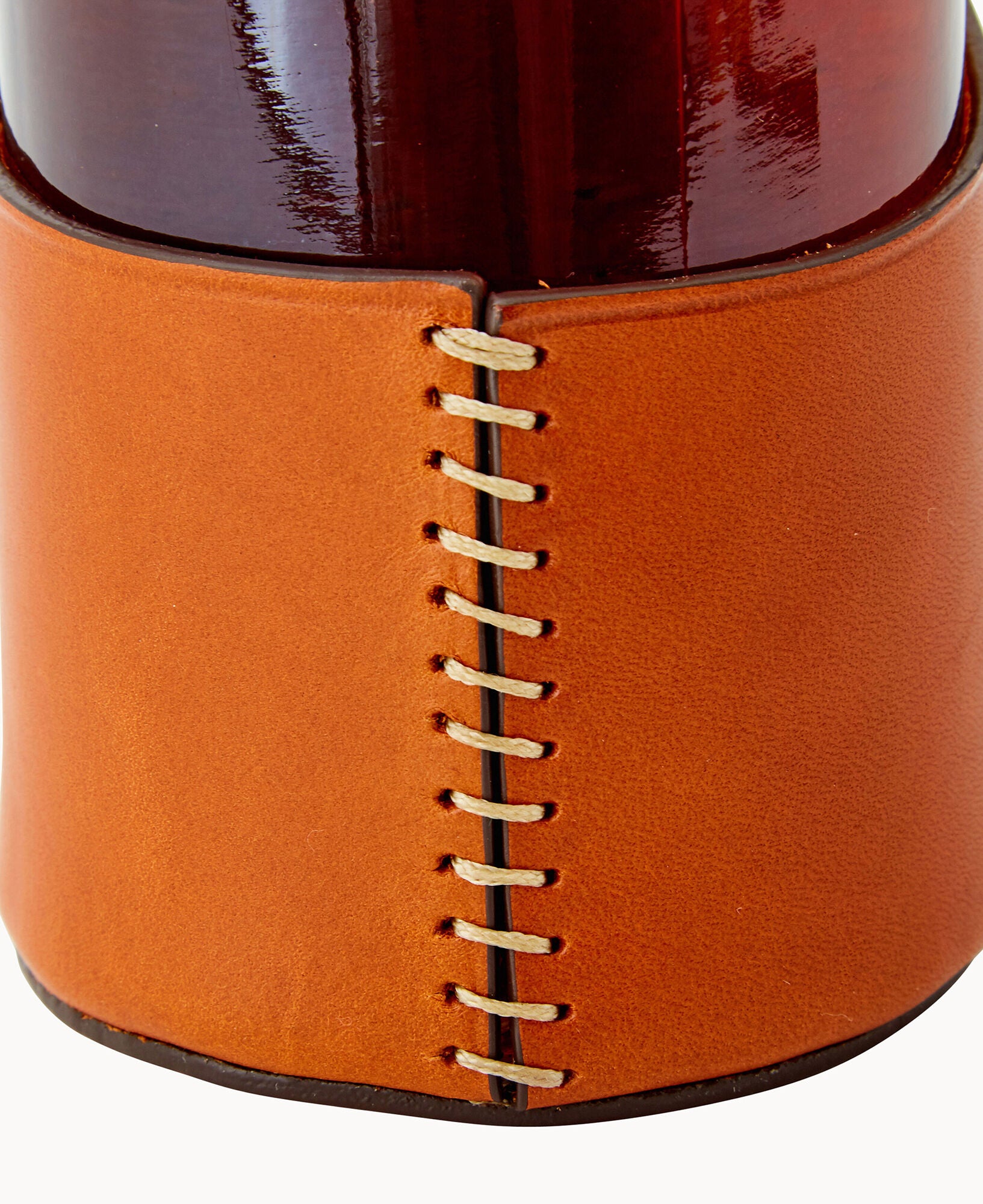 Hand stitched. Holds standard sized 750ml wine bottle. Handle for easy carry. Tongue tab buckle closure.