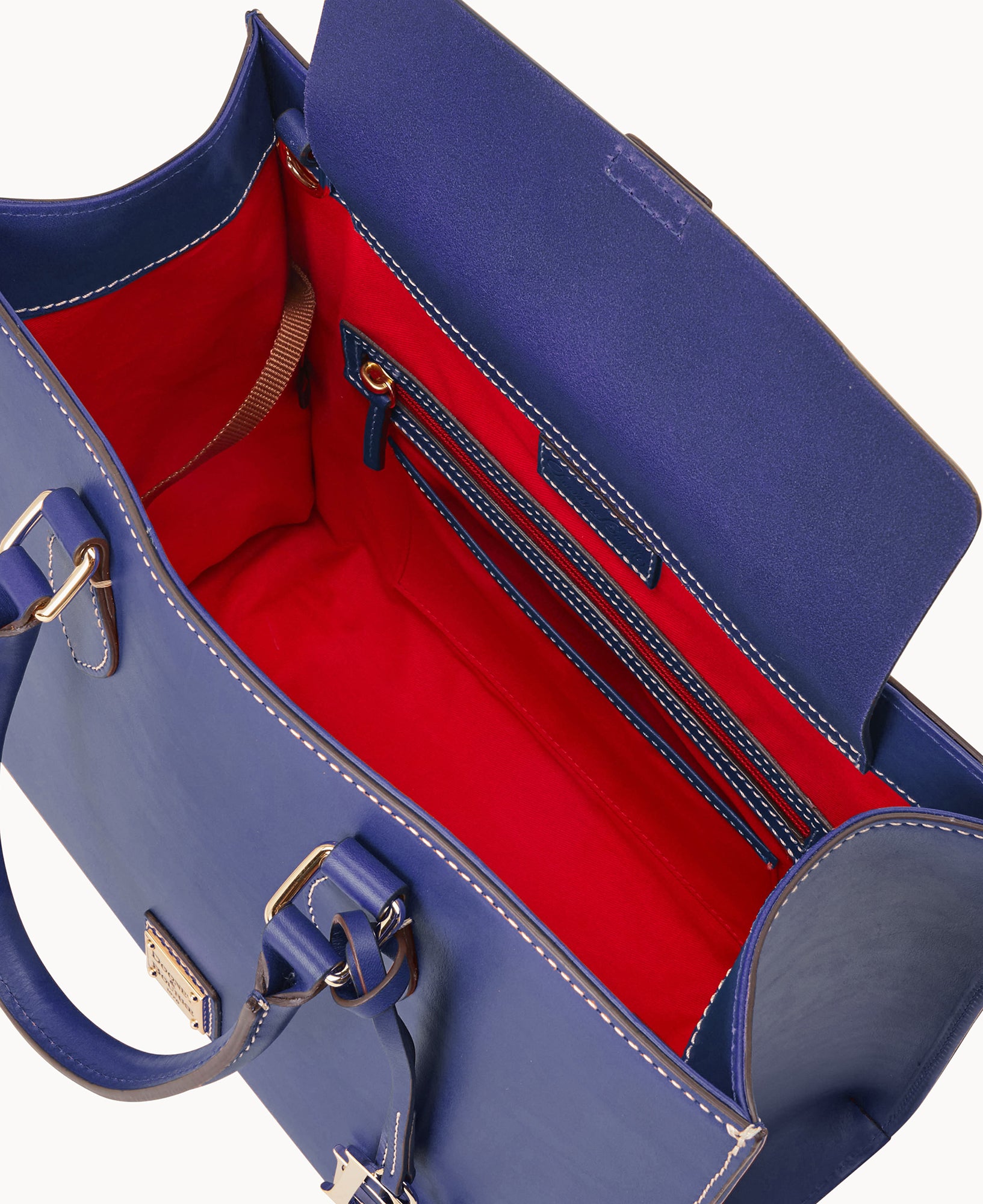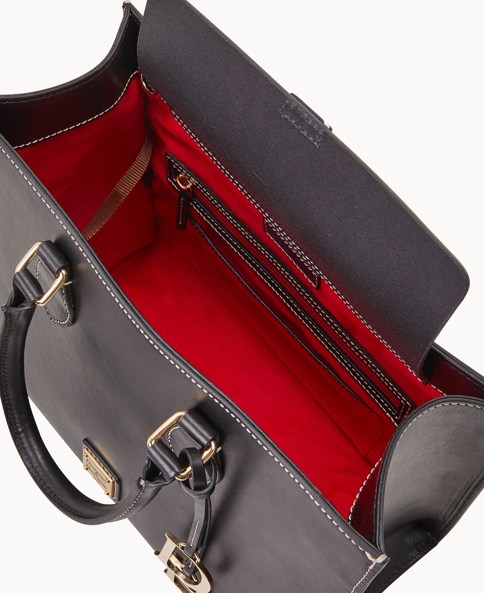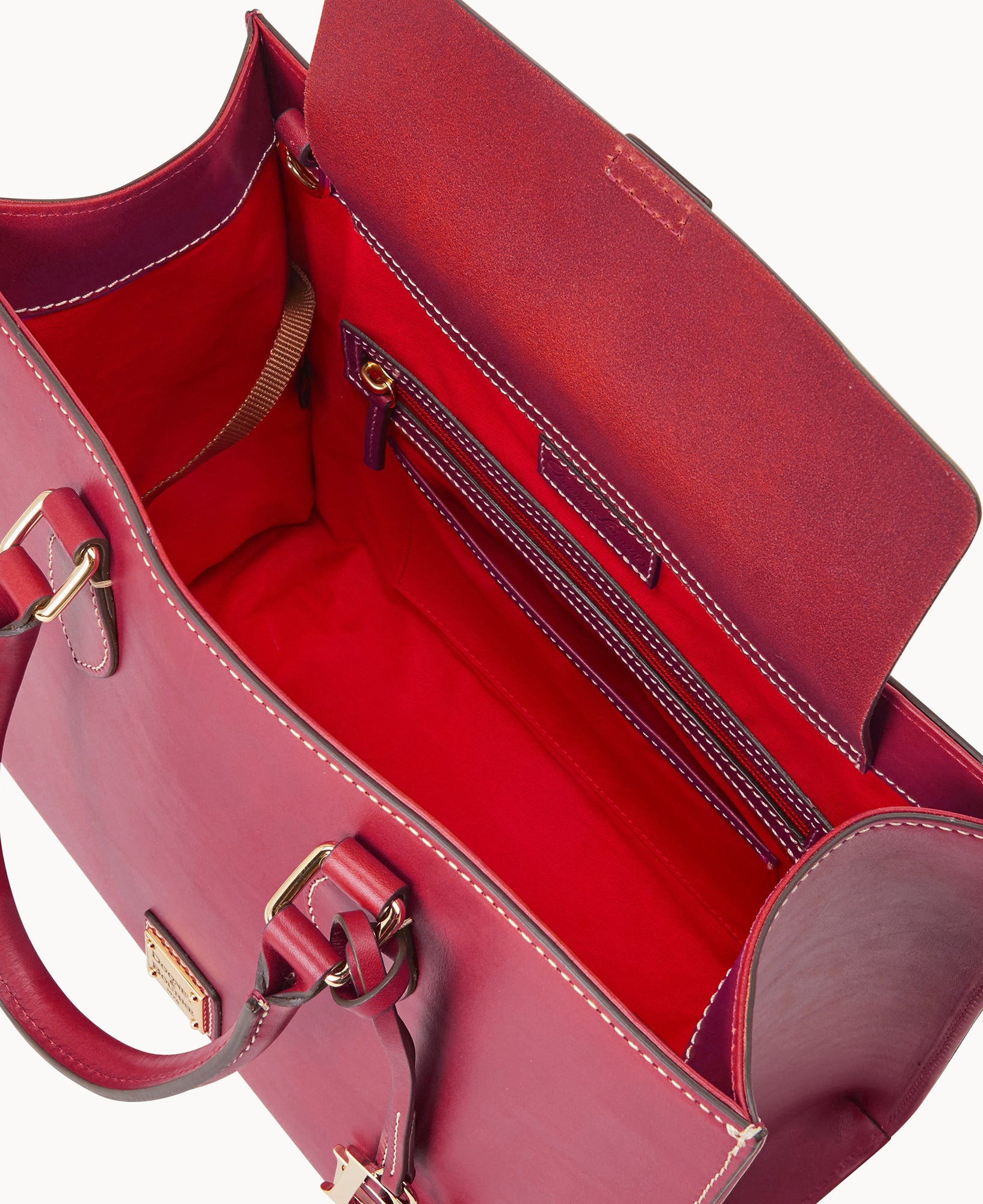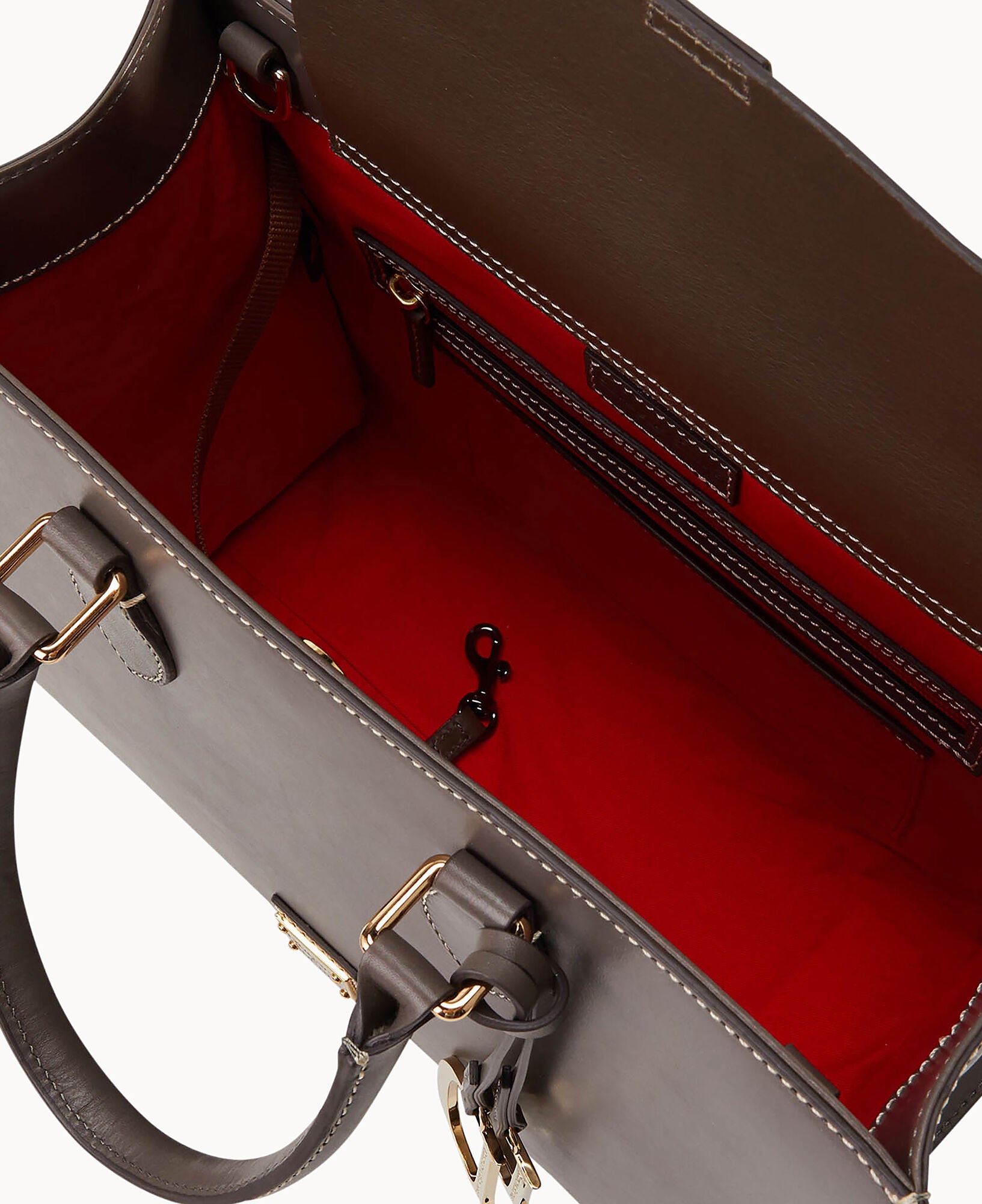 One inside zip pocket. Three inside pockets. Inside key hook. Handle drop length 5″. Adjustable, detachable shoulder strap. Lined. Feet. Magnetic snap flap closure.