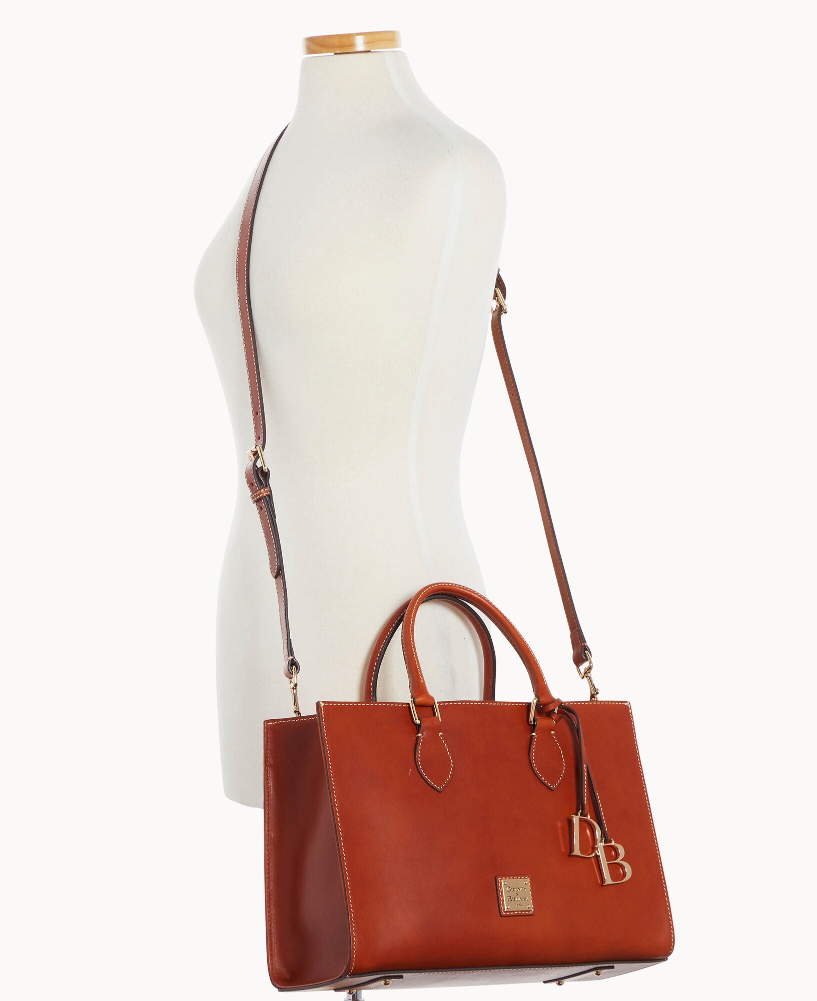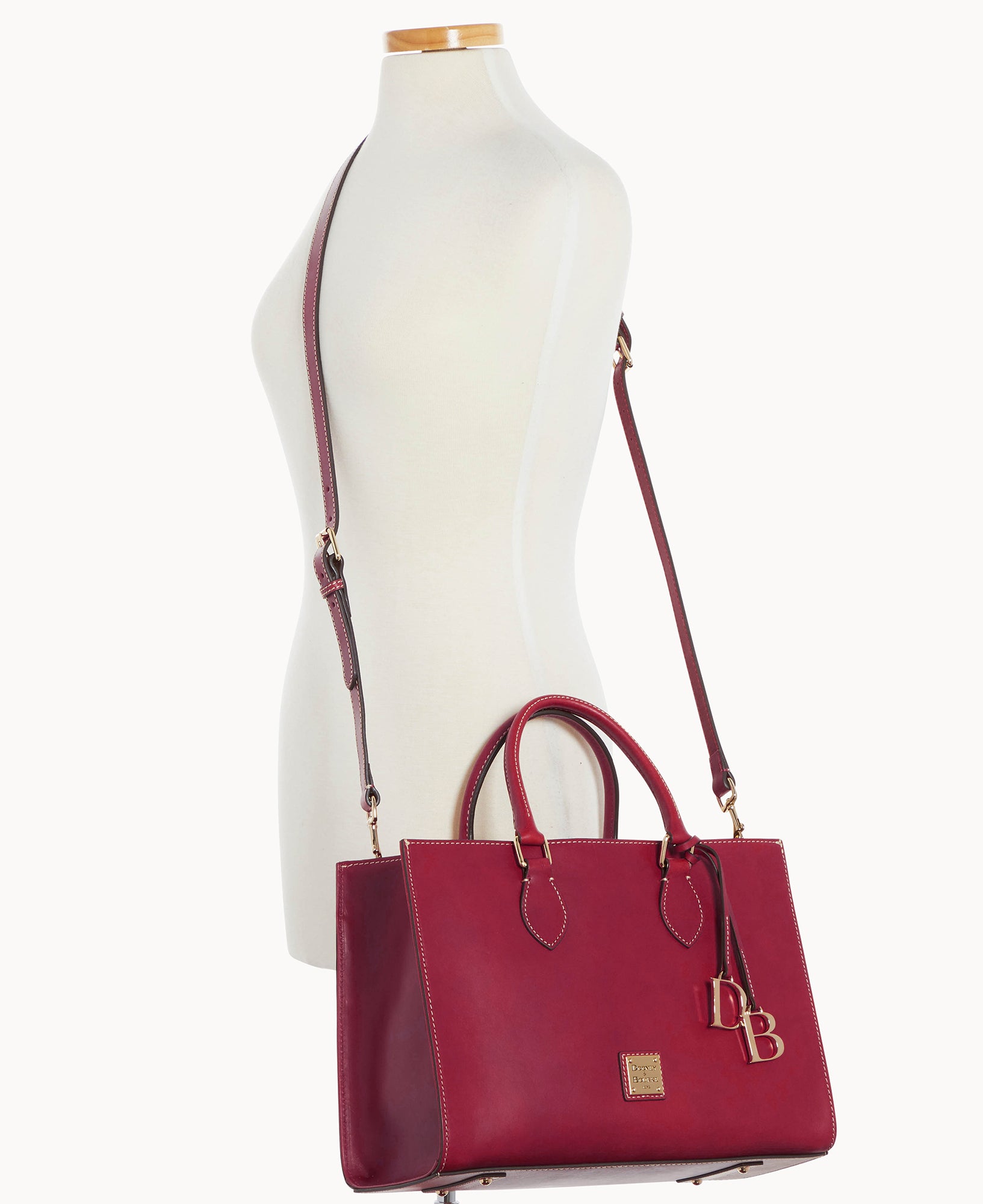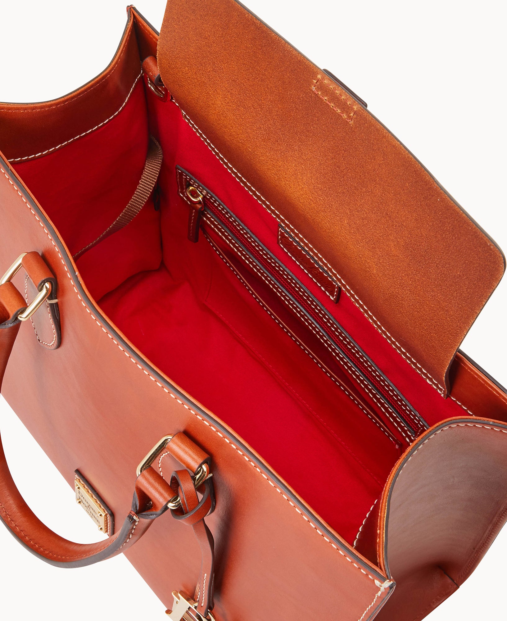 One inside zip pocket. Three inside pockets. Inside key hook. Handle drop length 5″. Adjustable, detachable shoulder strap. Lined. Feet. Magnetic snap flap closure.