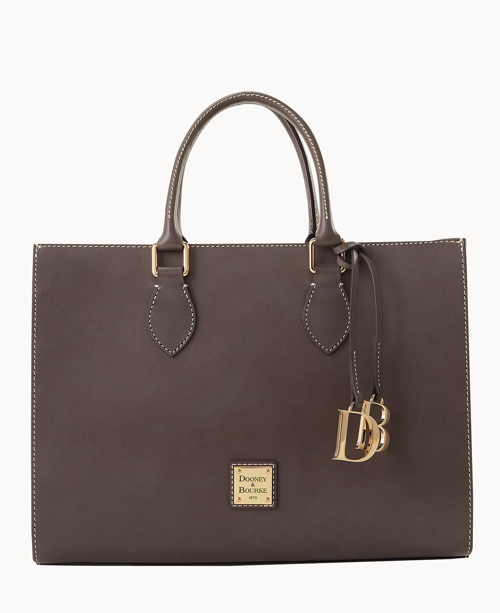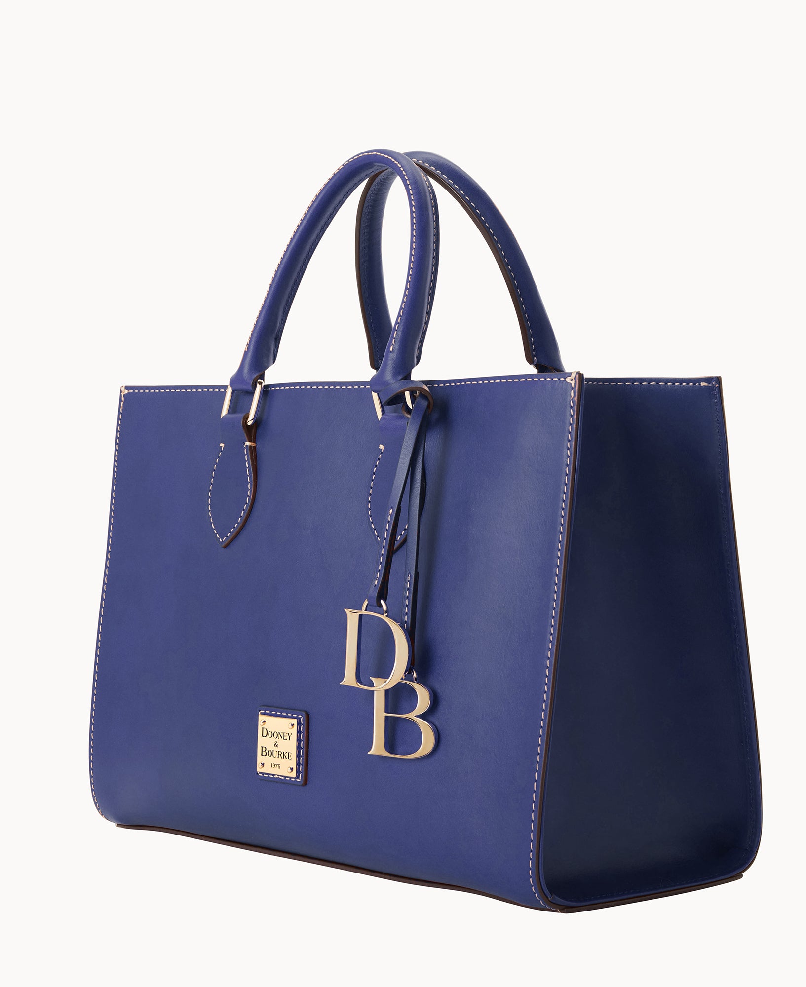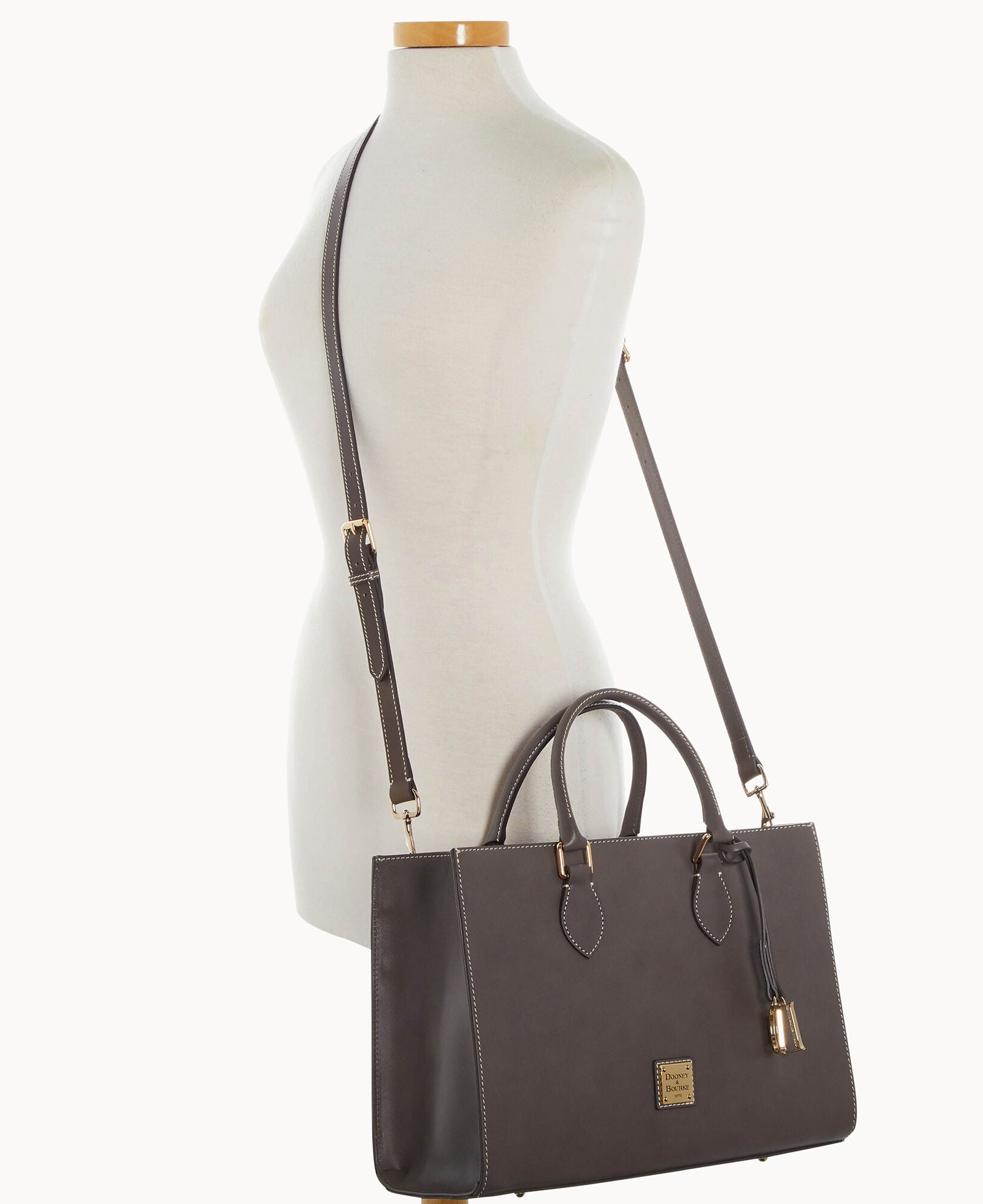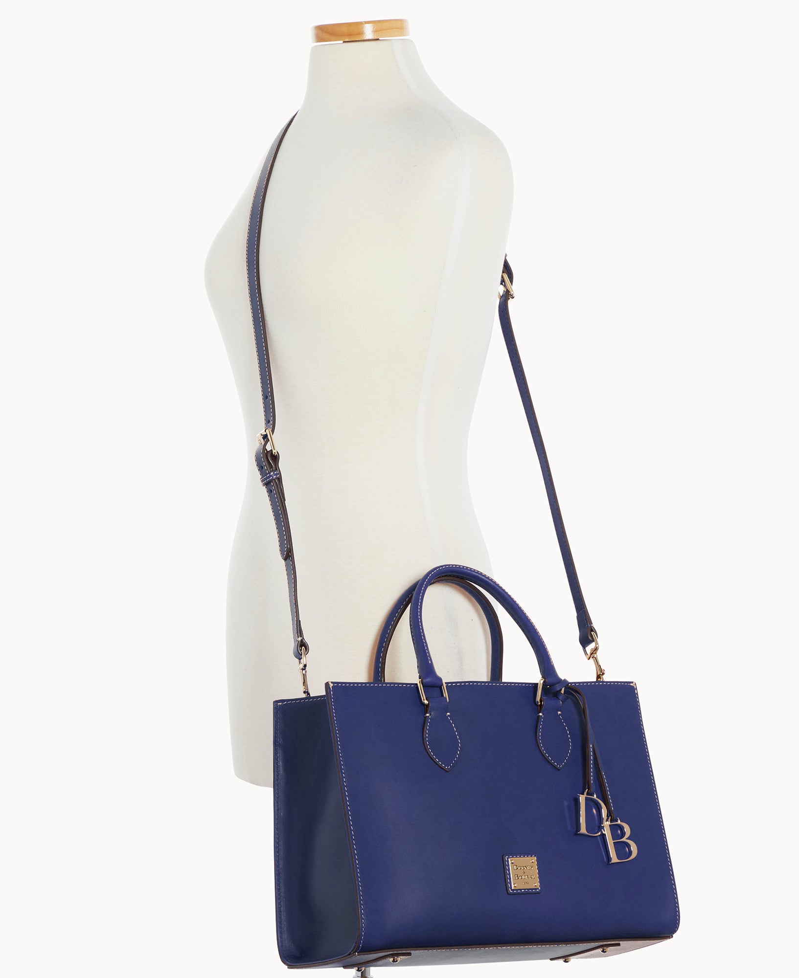 One inside zip pocket. Three inside pockets. Inside key hook. Handle drop length 5″. Adjustable, detachable shoulder strap. Lined. Feet. Magnetic snap flap closure.