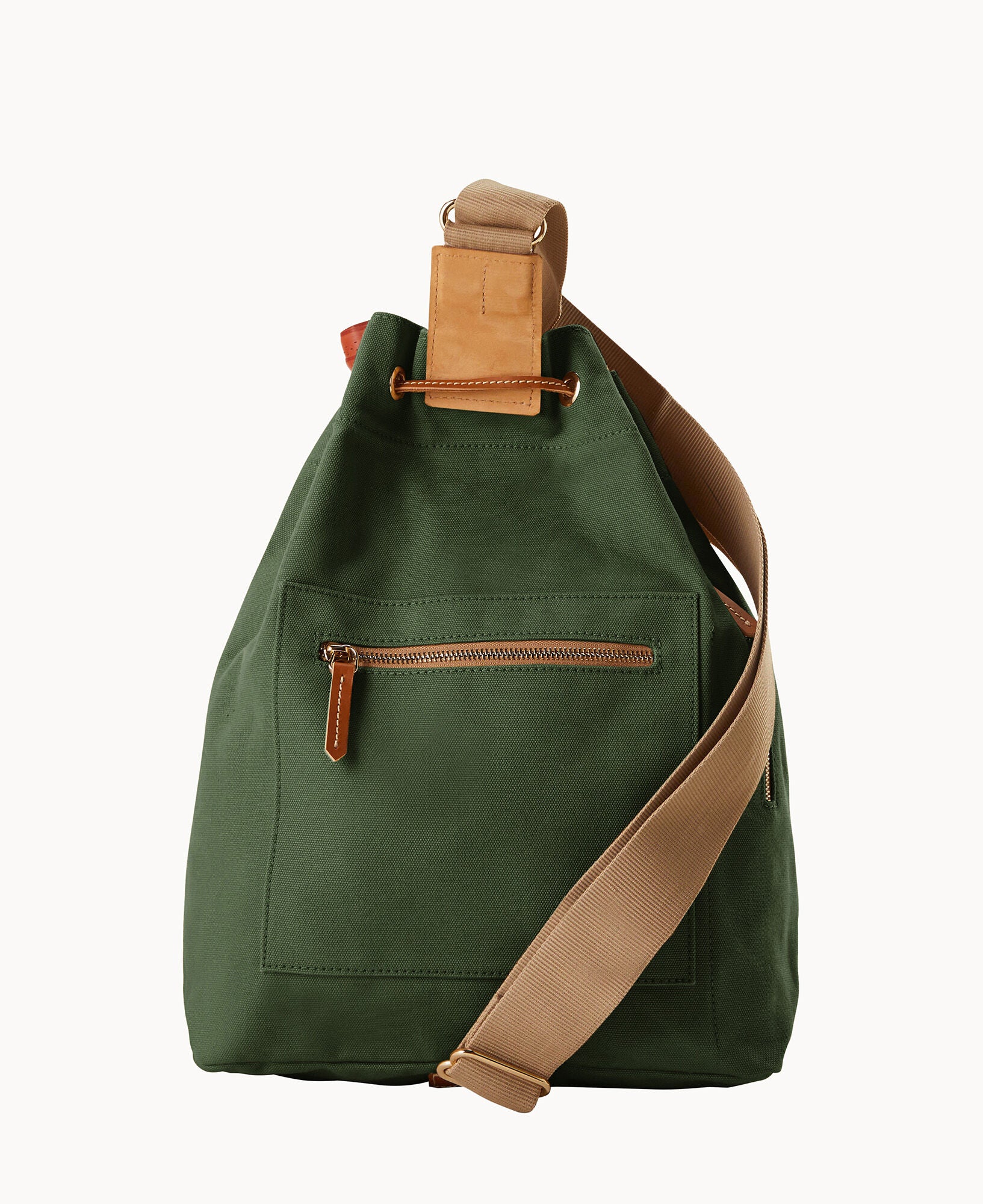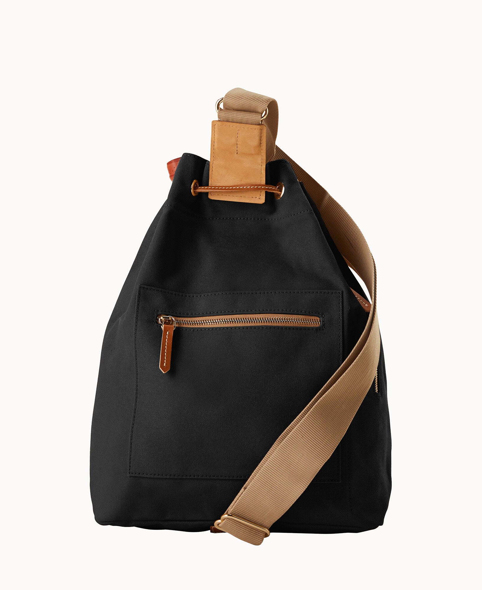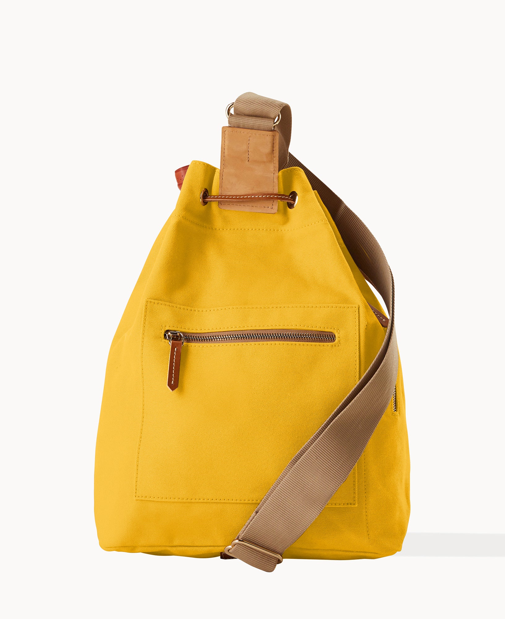 Two outside zip pockets. One inside bottle pocket. Adjustable strap. Drawstring closure.