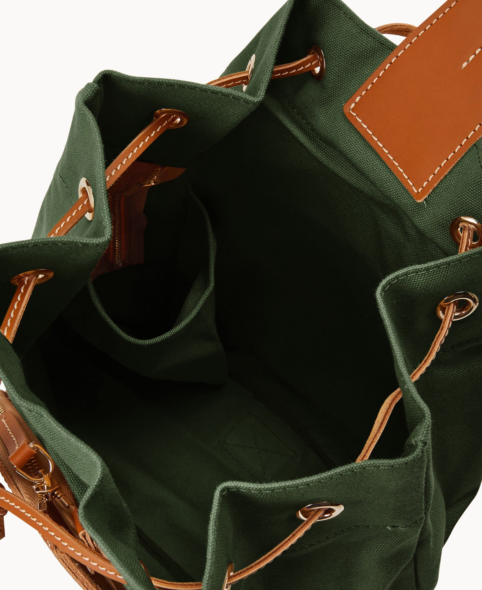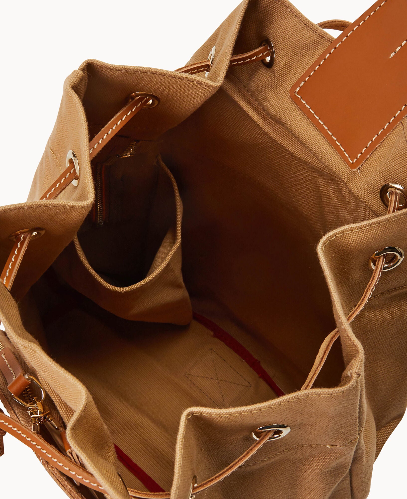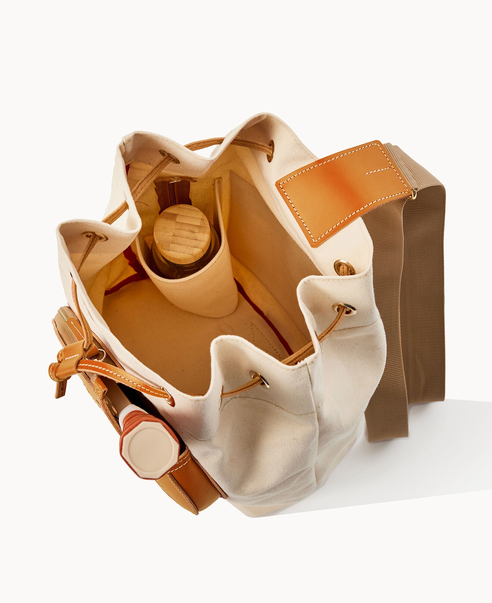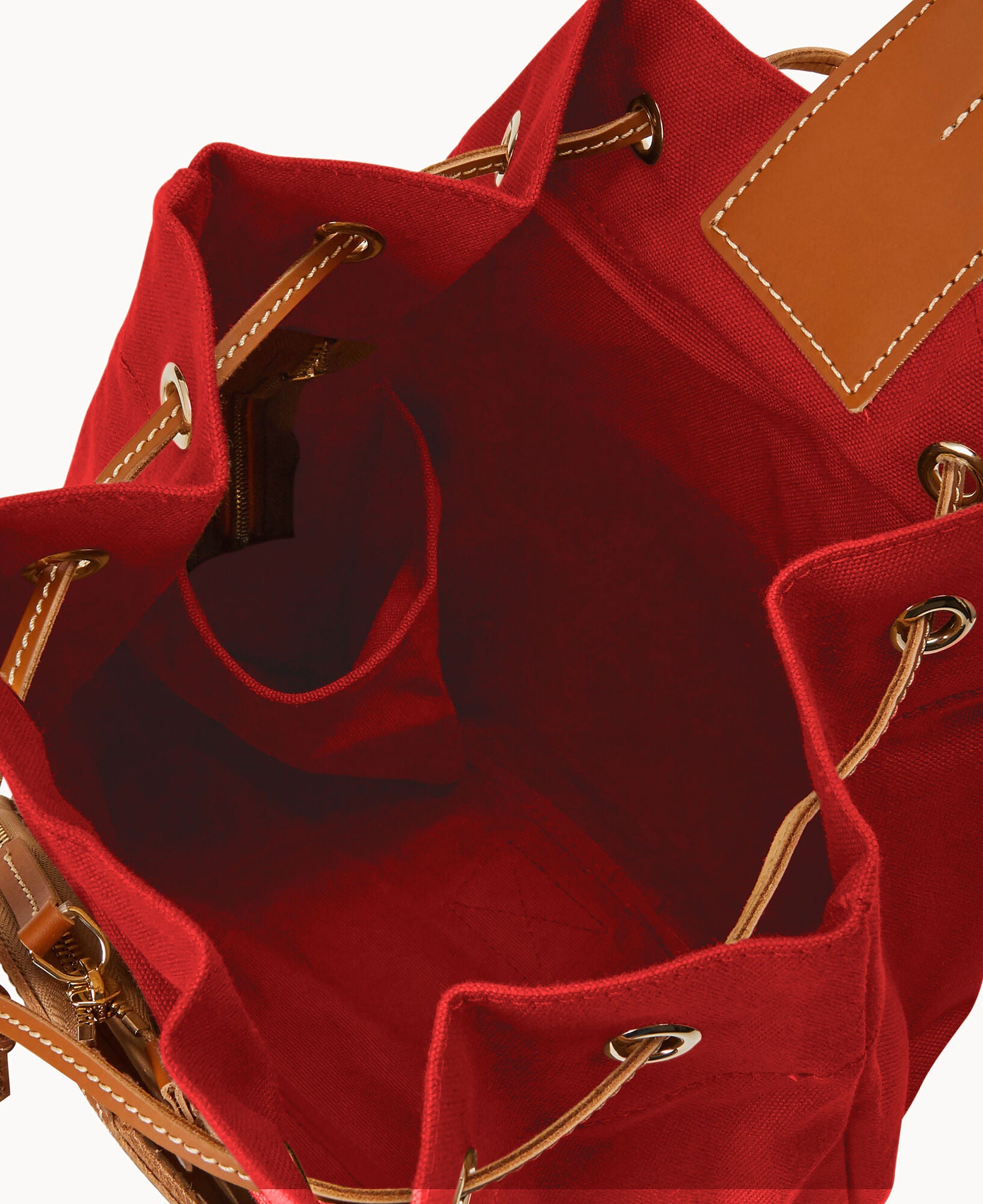 Two outside zip pockets. One inside bottle pocket. Adjustable strap. Drawstring closure.