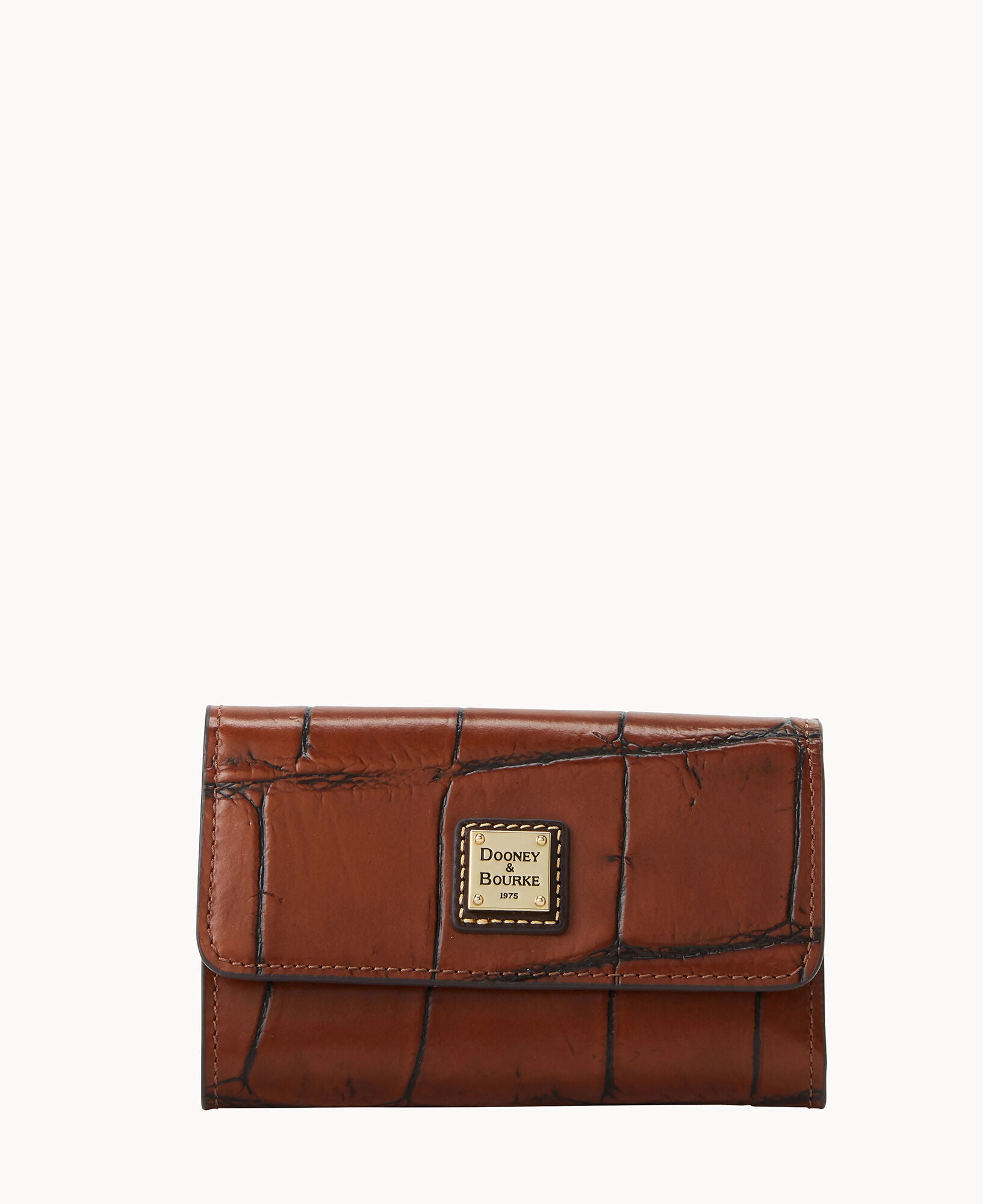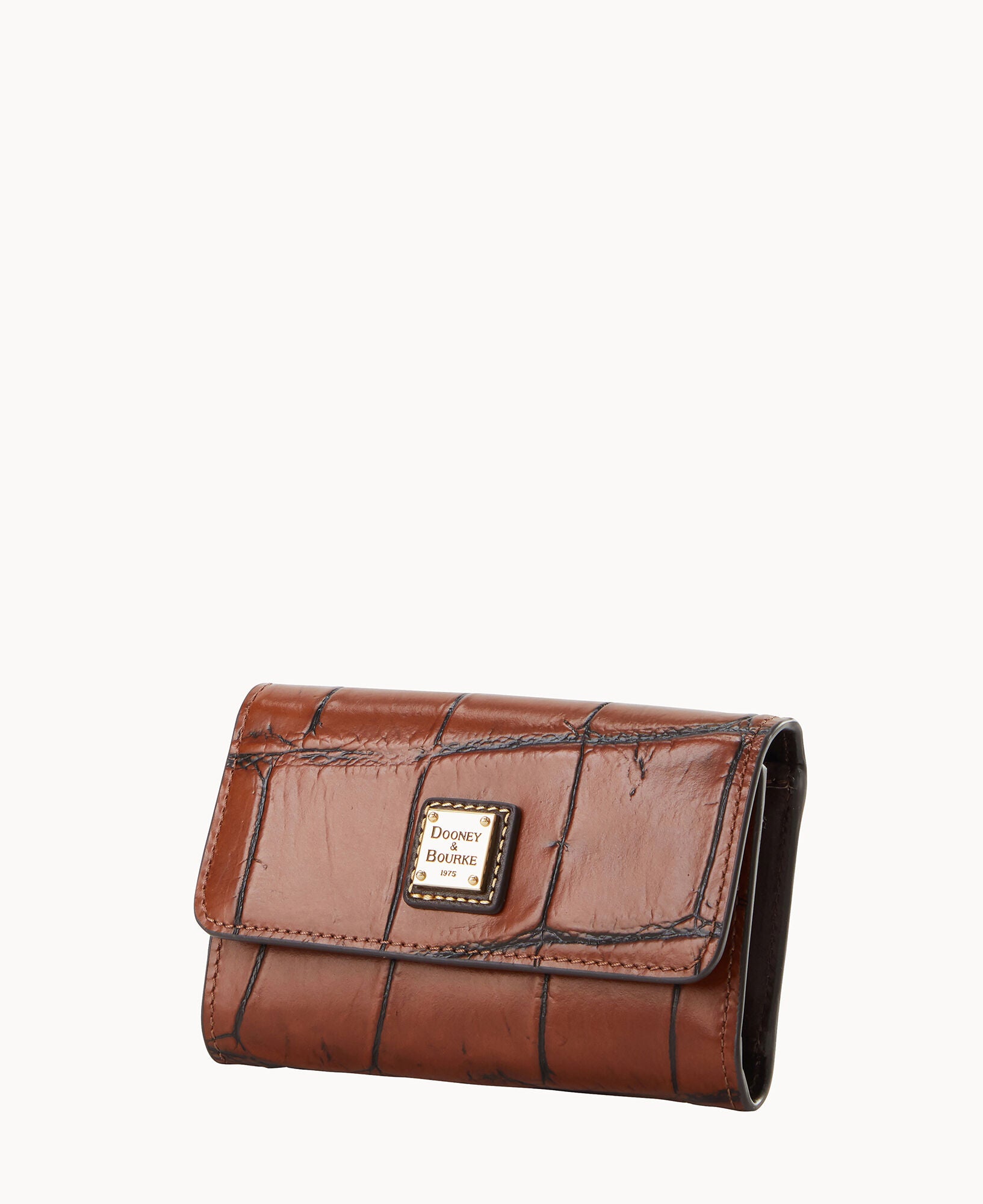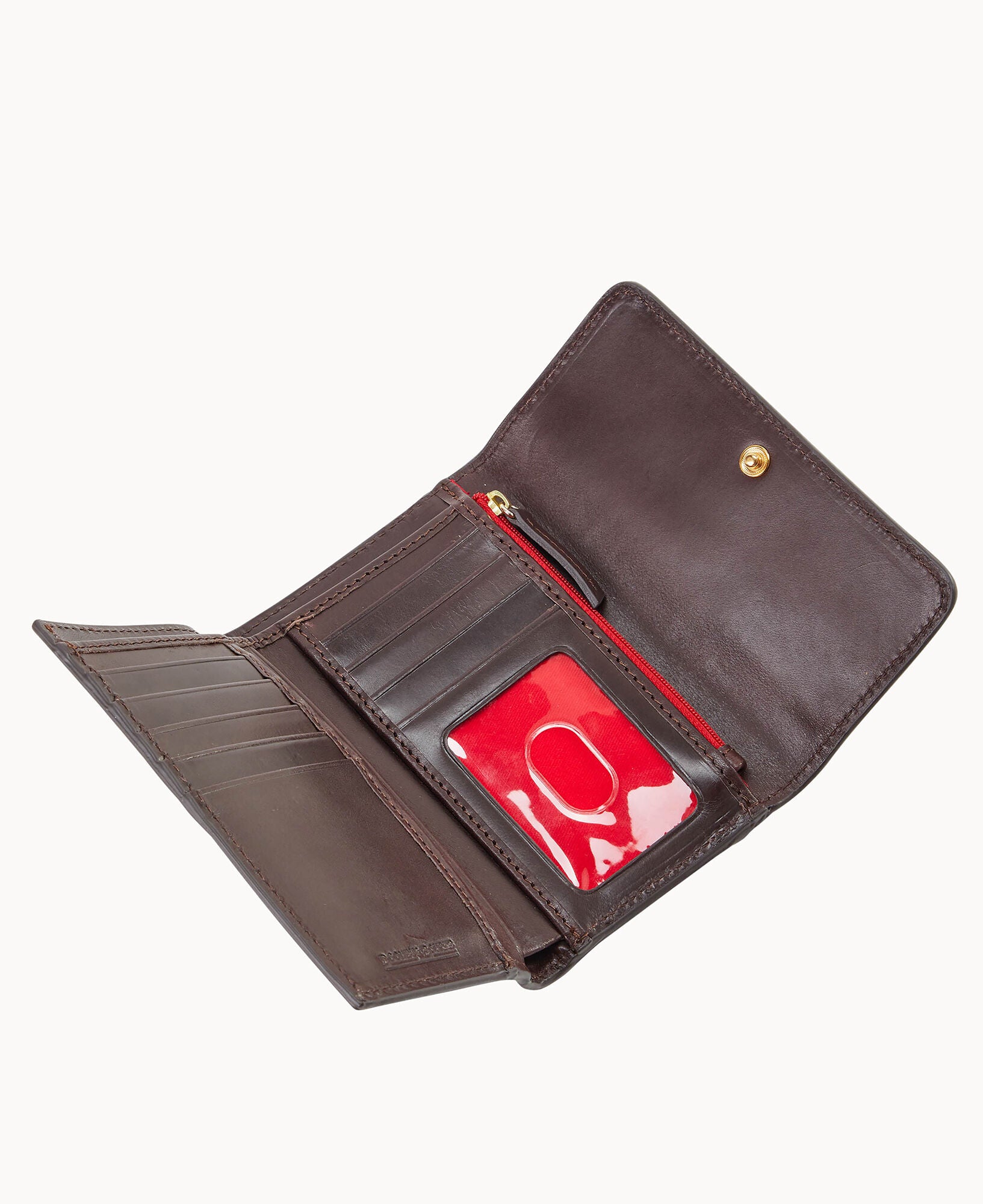 One inside zip pocket. ID window. Billfold compartment. Eight credit card slots. Flap closure.