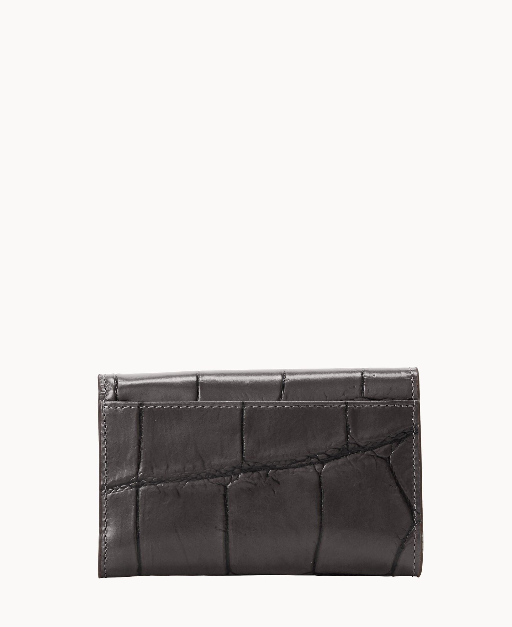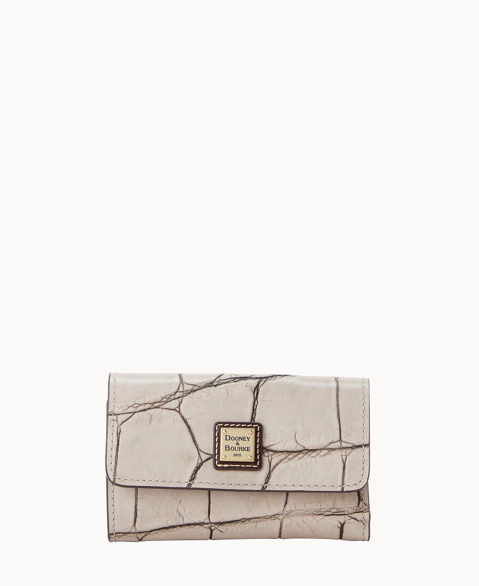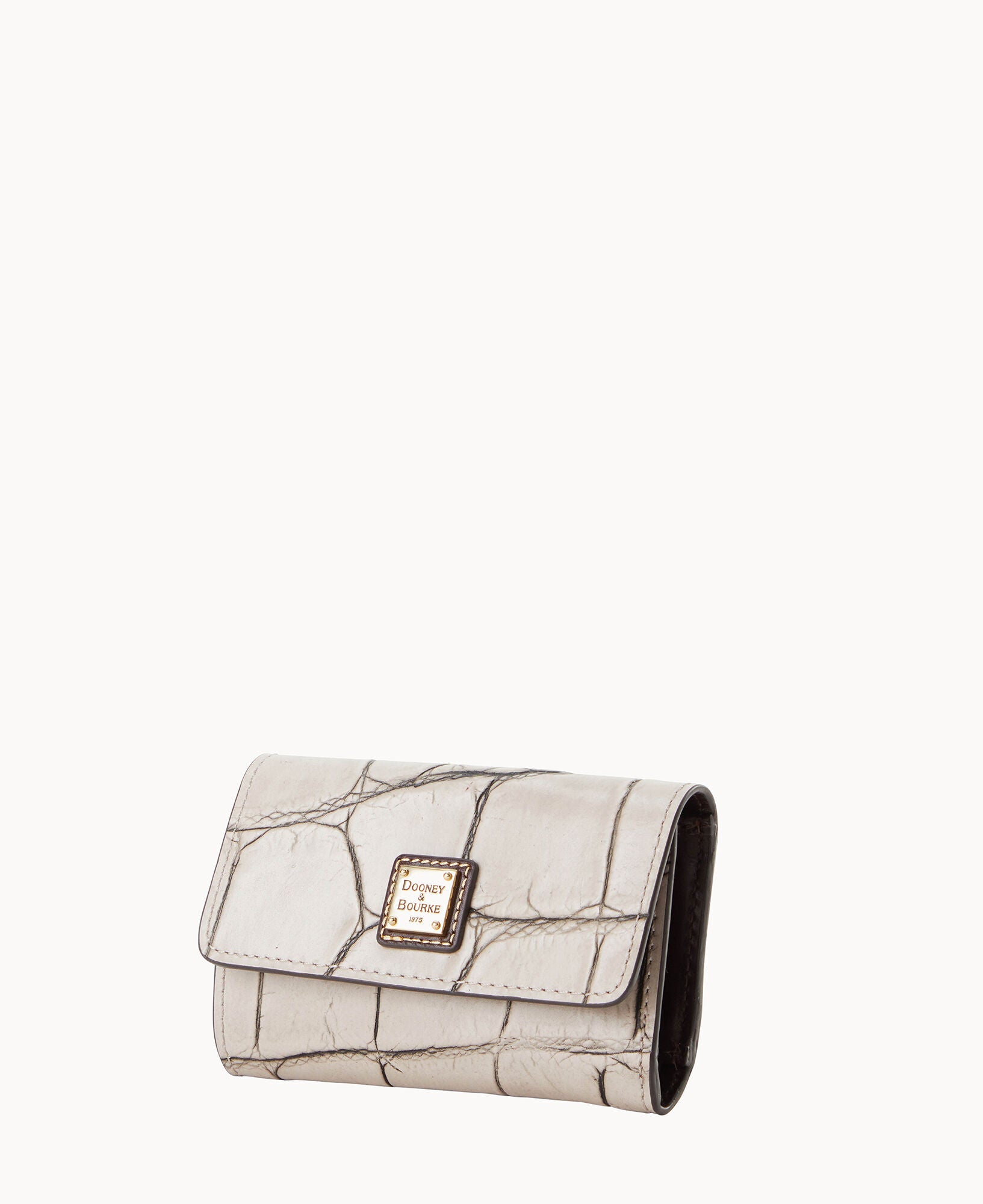 One inside zip pocket. ID window. Billfold compartment. Eight credit card slots. Flap closure.