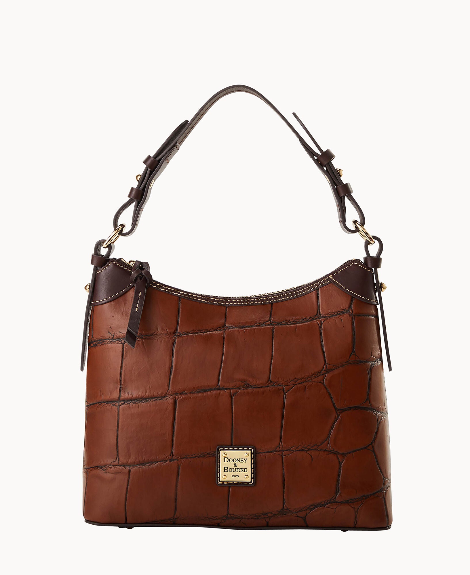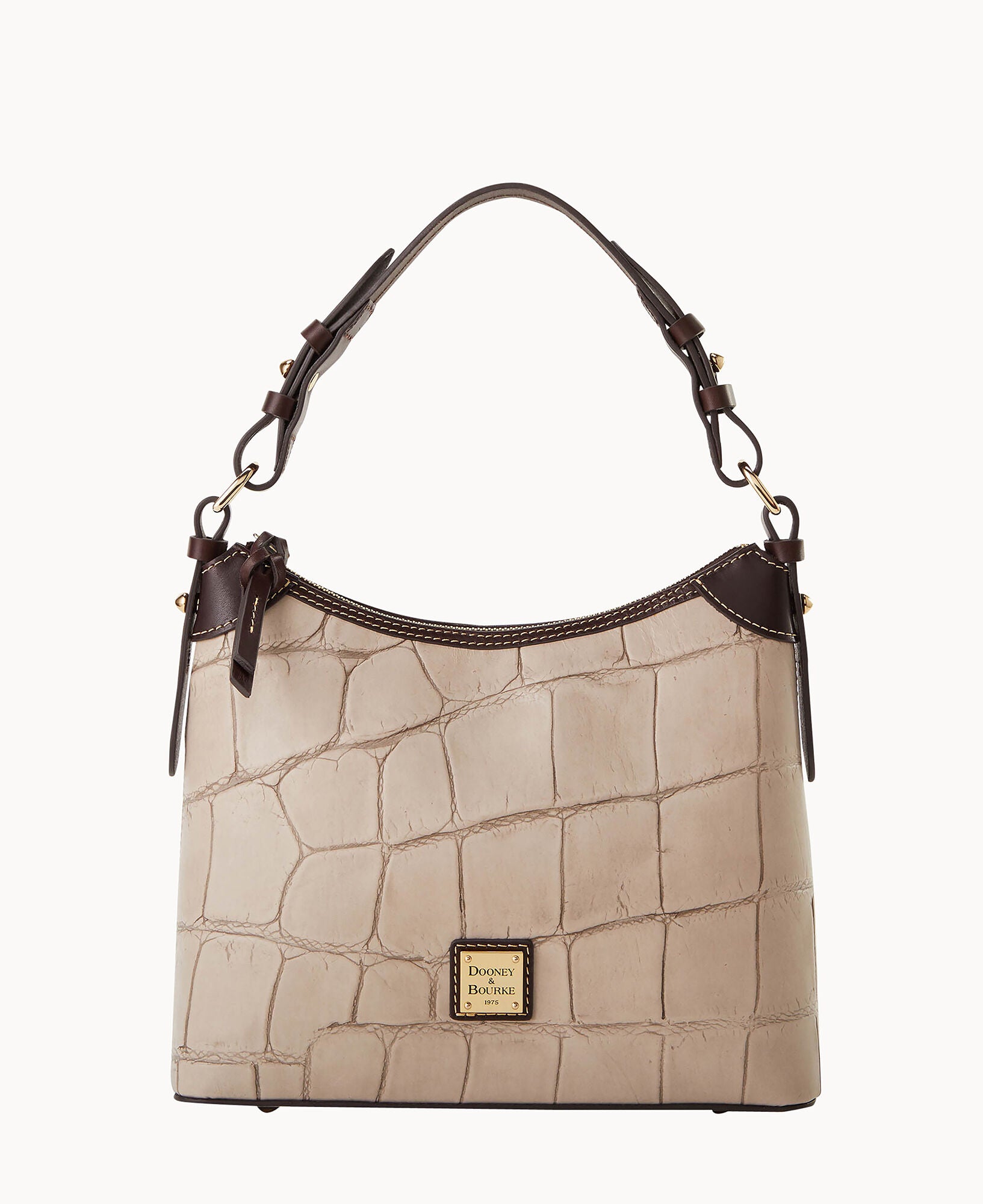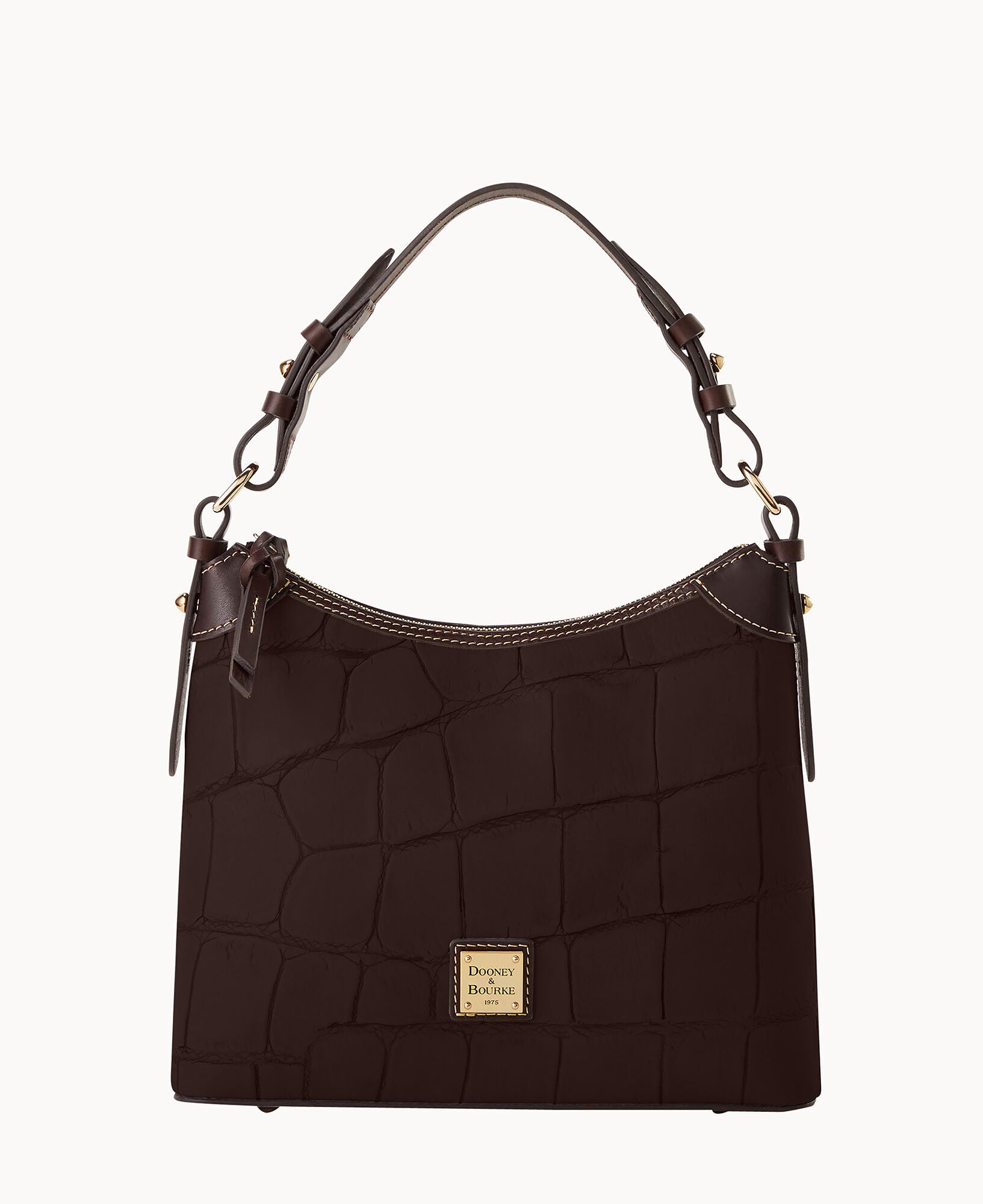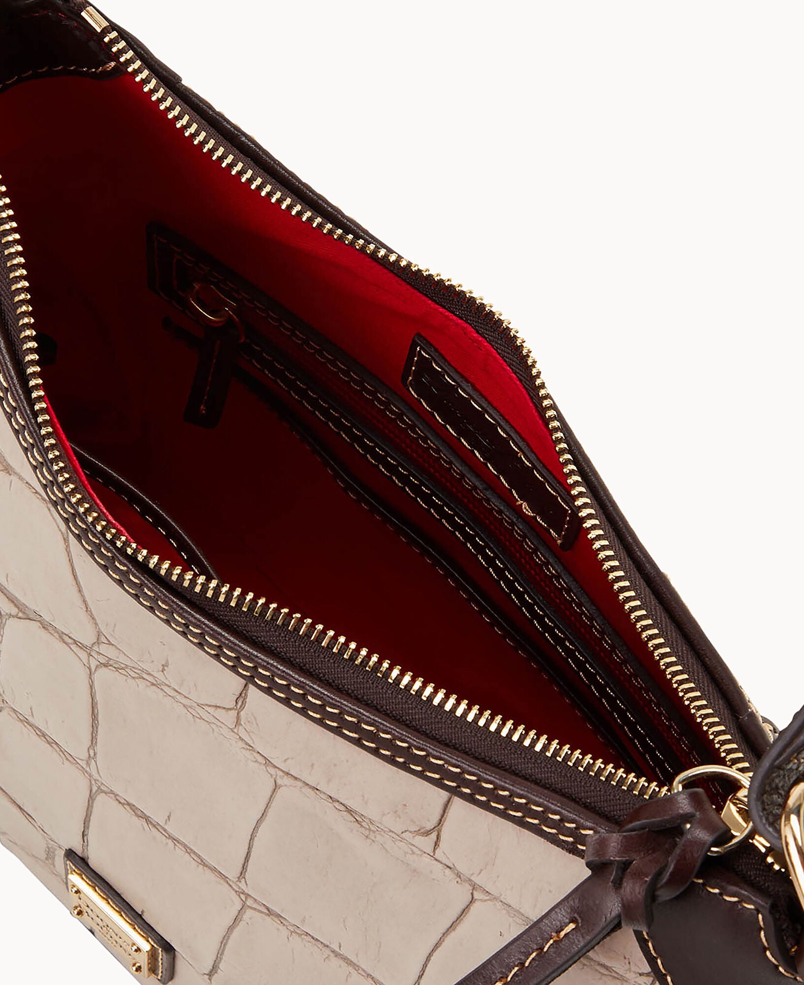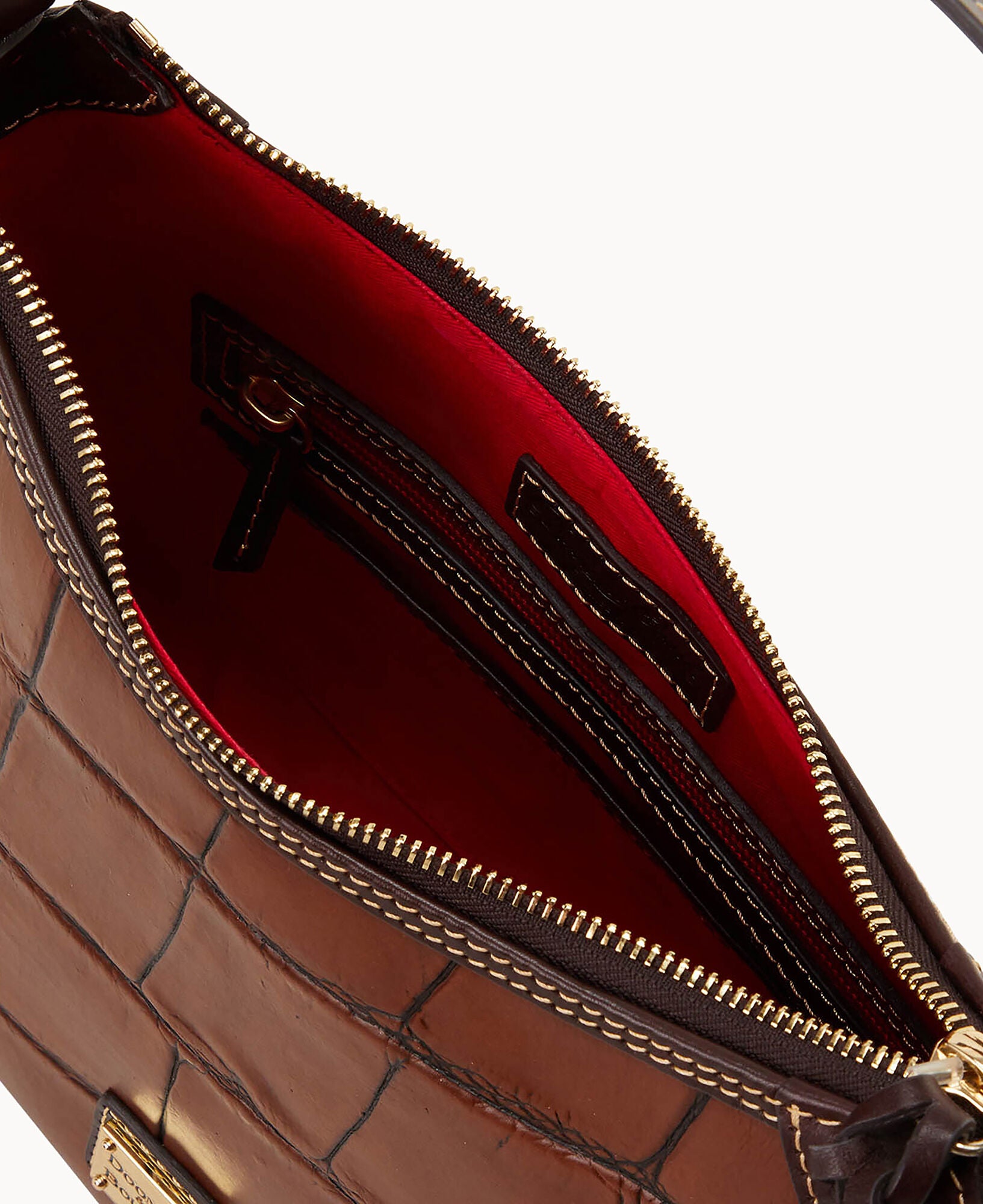 Outside zip pocket. Inside zip pocket. Two inside pockets. One inside cell phone pocket. Inside key hook. Lined. Feet. Zipper closure.