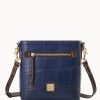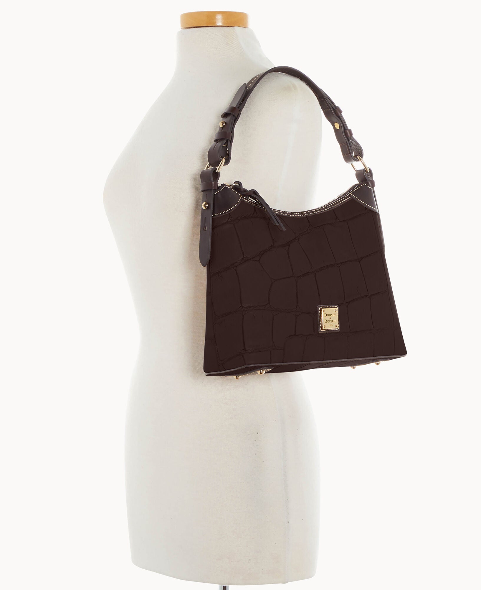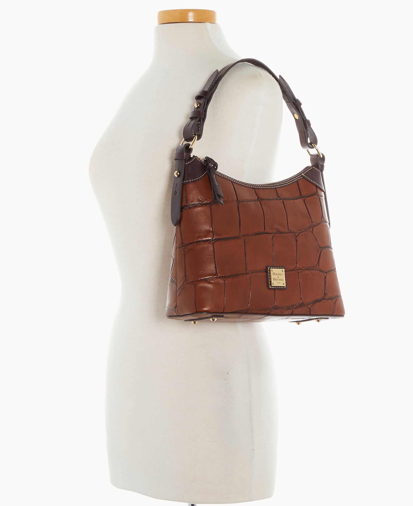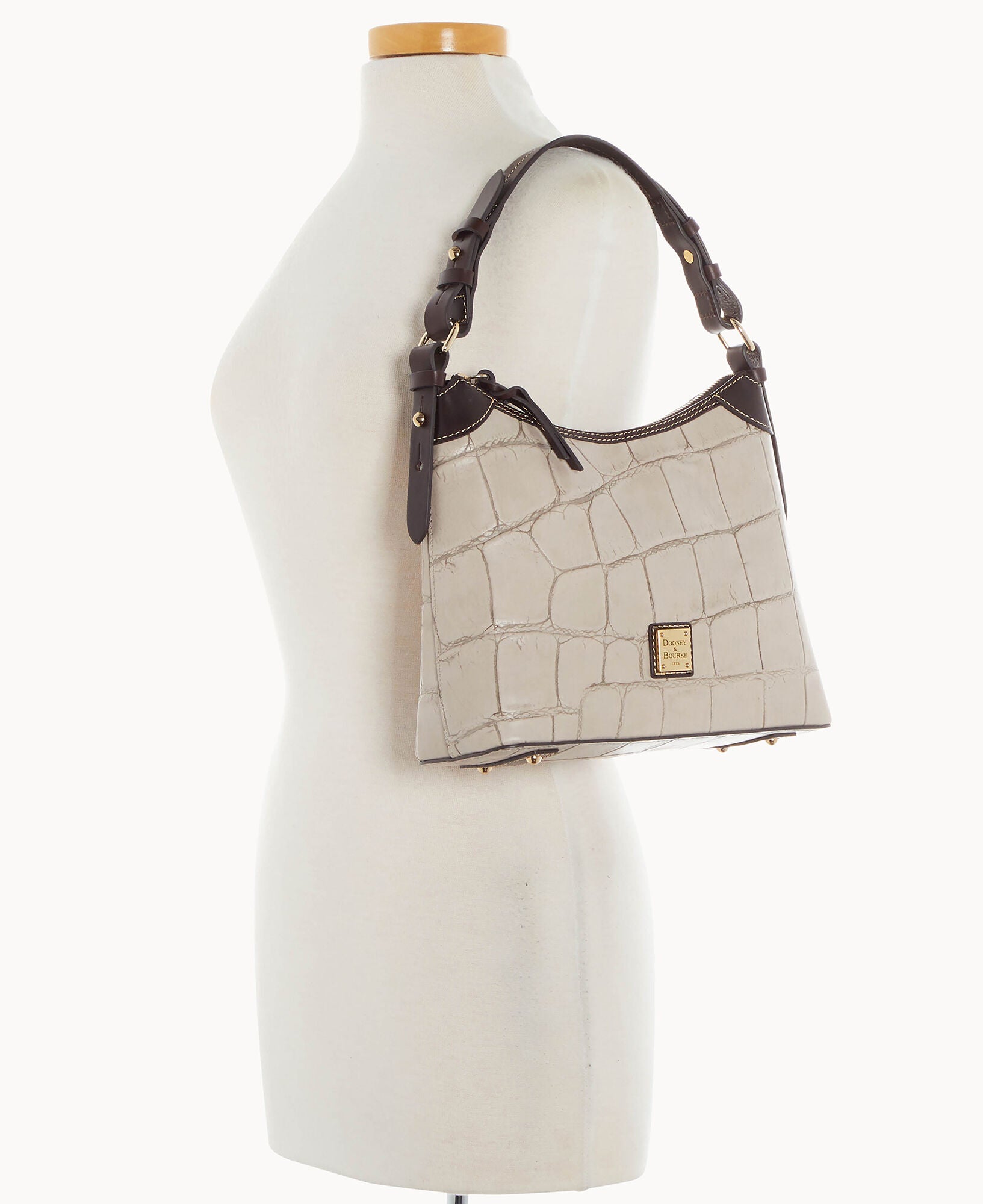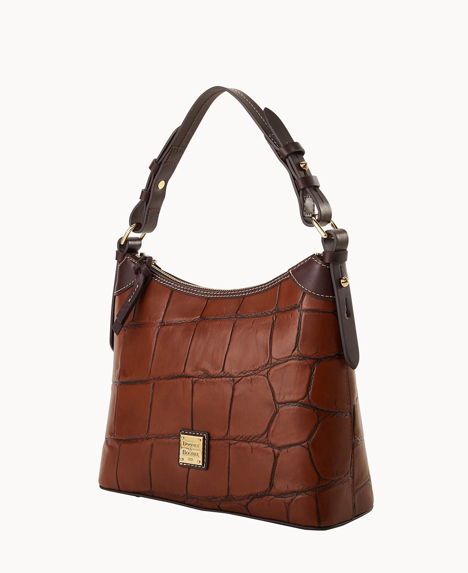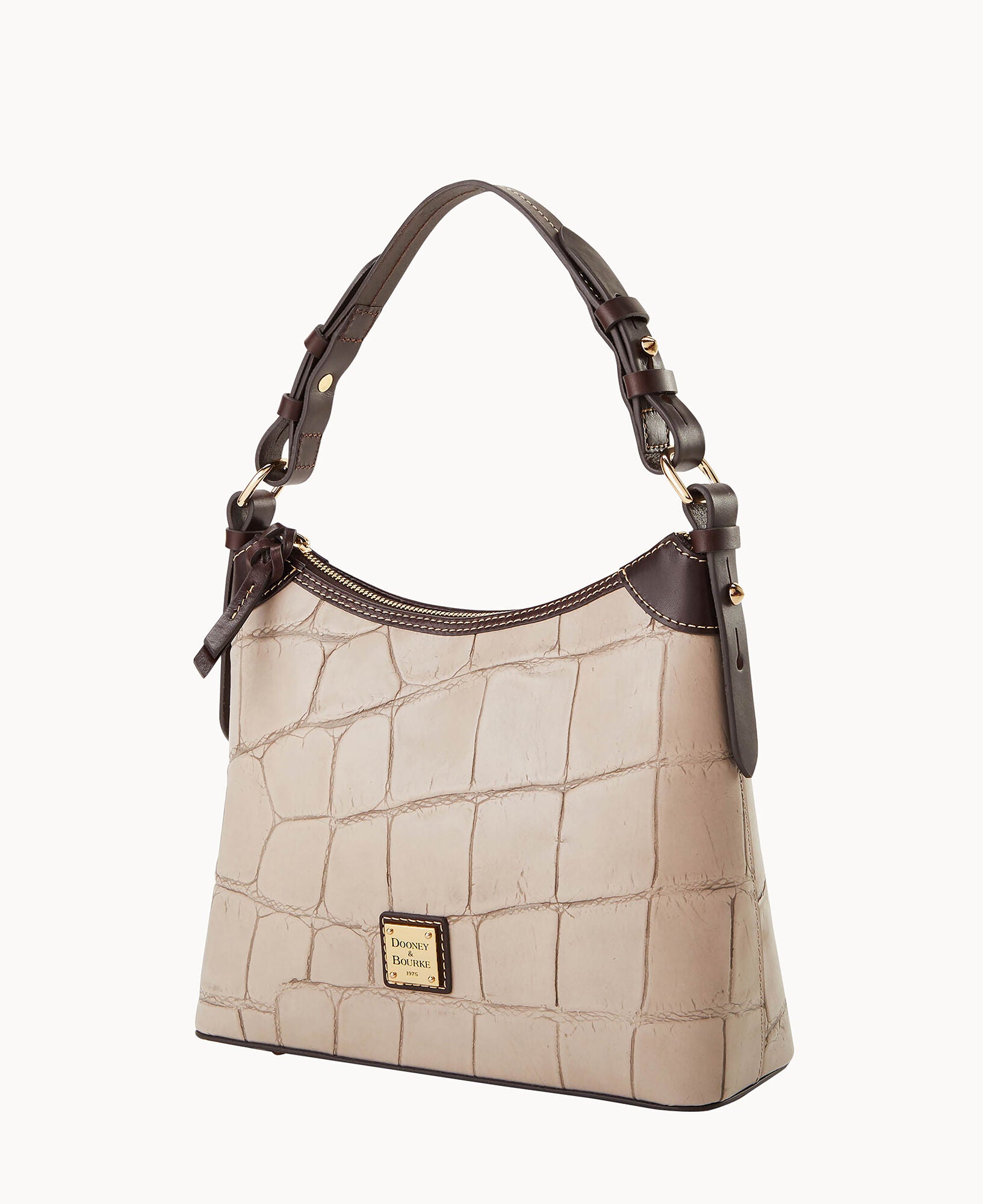 Outside zip pocket. Inside zip pocket. Two inside pockets. One inside cell phone pocket. Inside key hook. Lined. Feet. Zipper closure.
