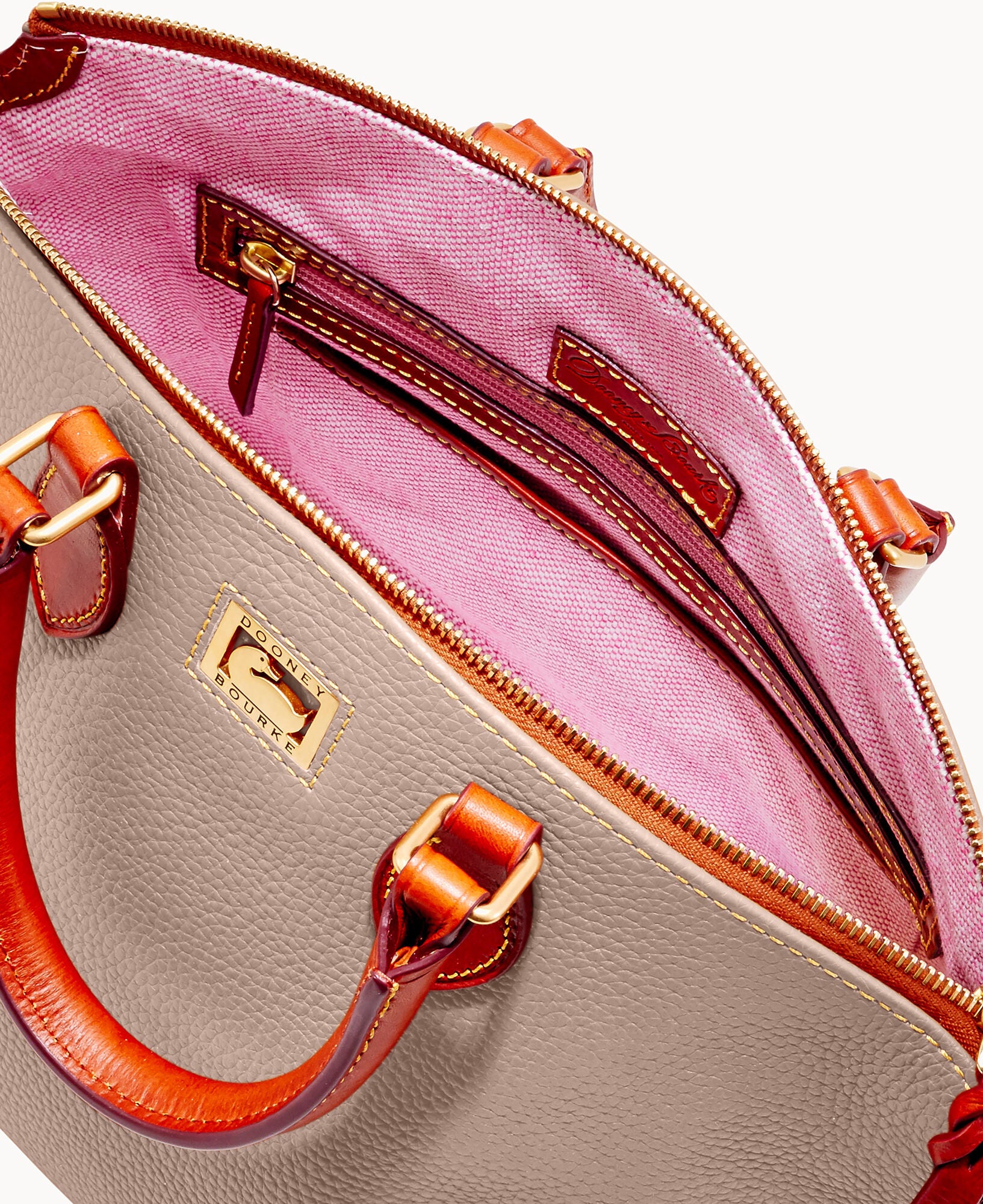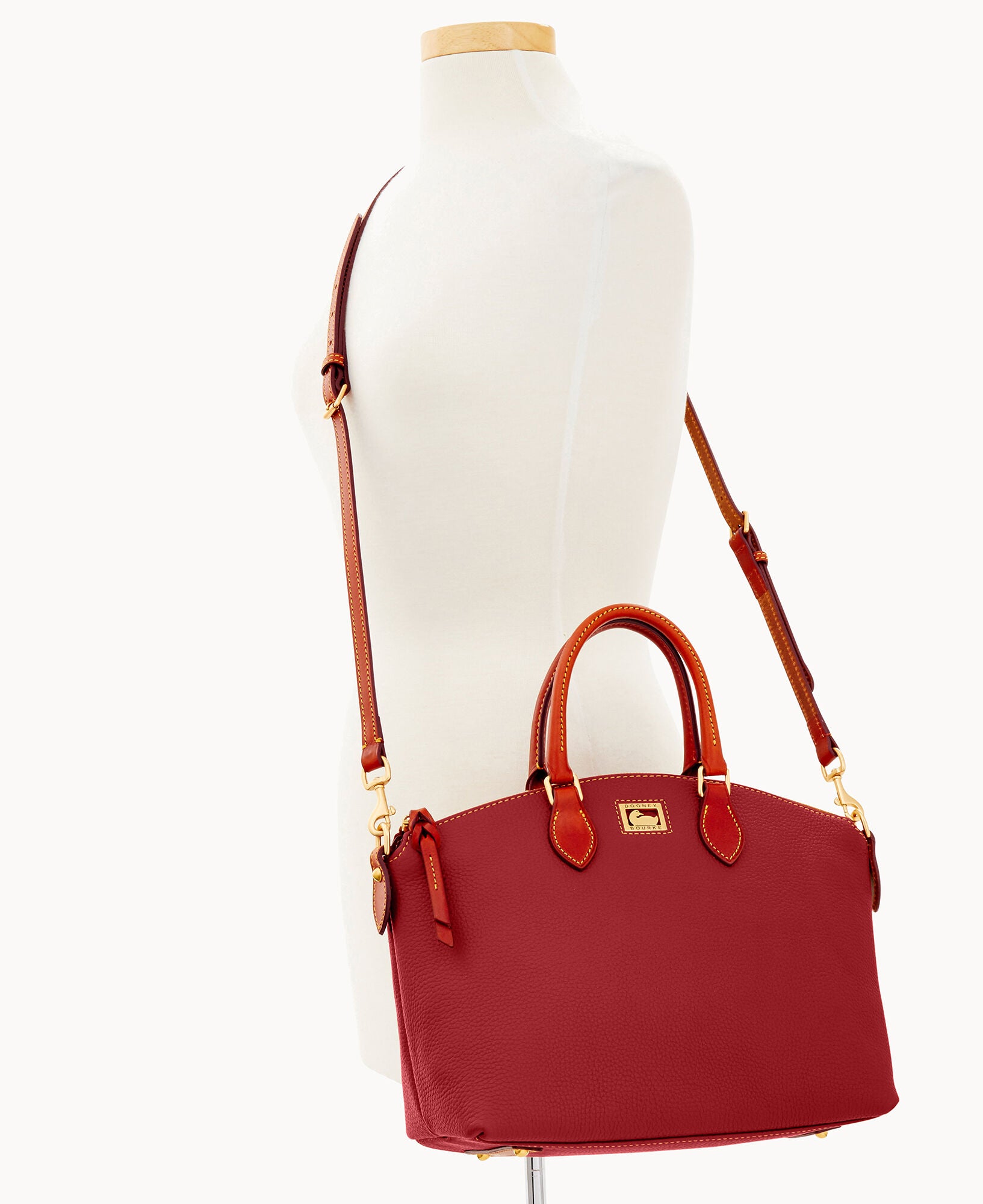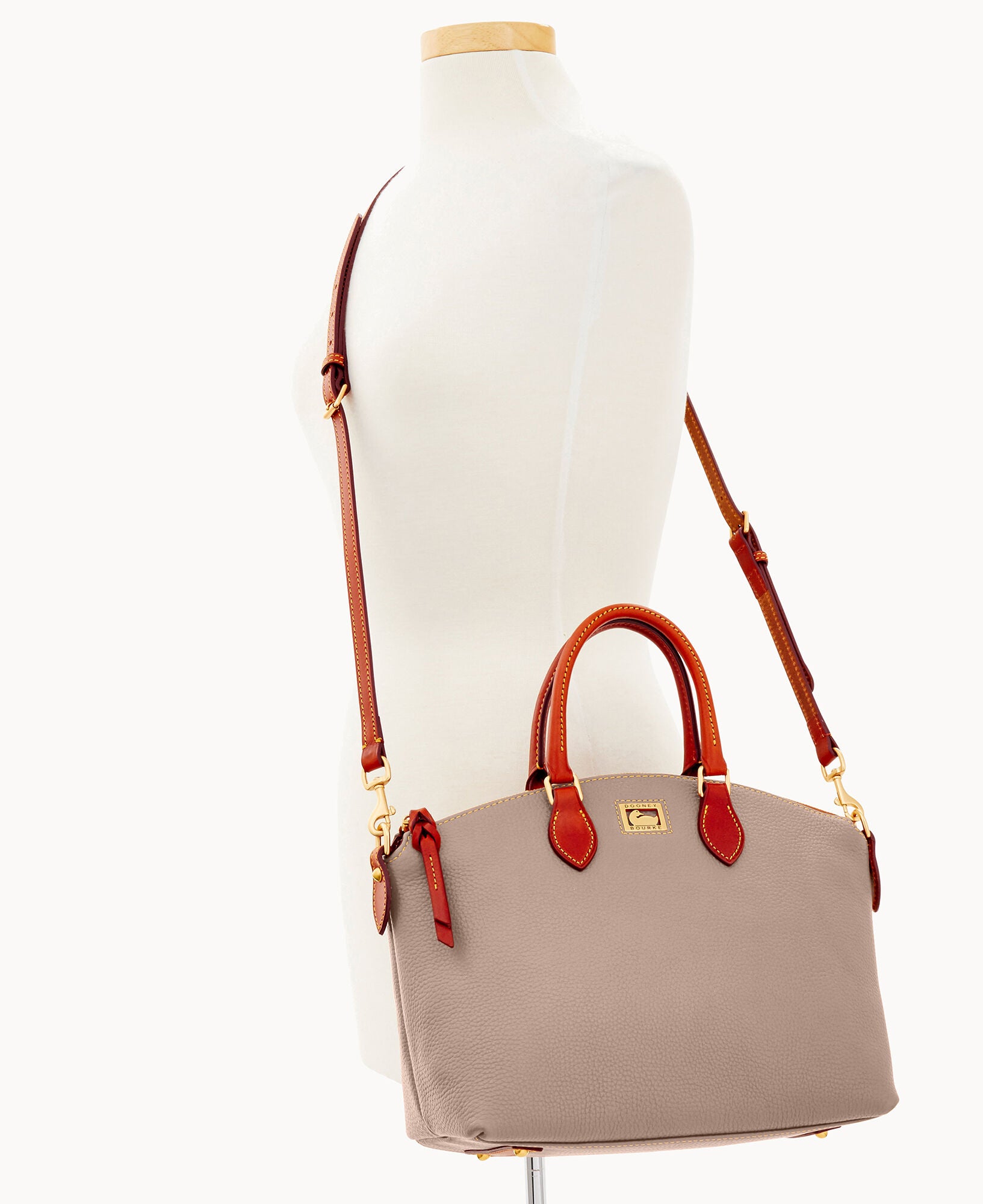 One inside zip pocket. Two inside pockets. Cell phone pocket. Inside key hook. Handle drop length 4.5″. Adjustable, detachable shoulder strap. Strap drop length 13″. Lined. Feet. Zipper closure.