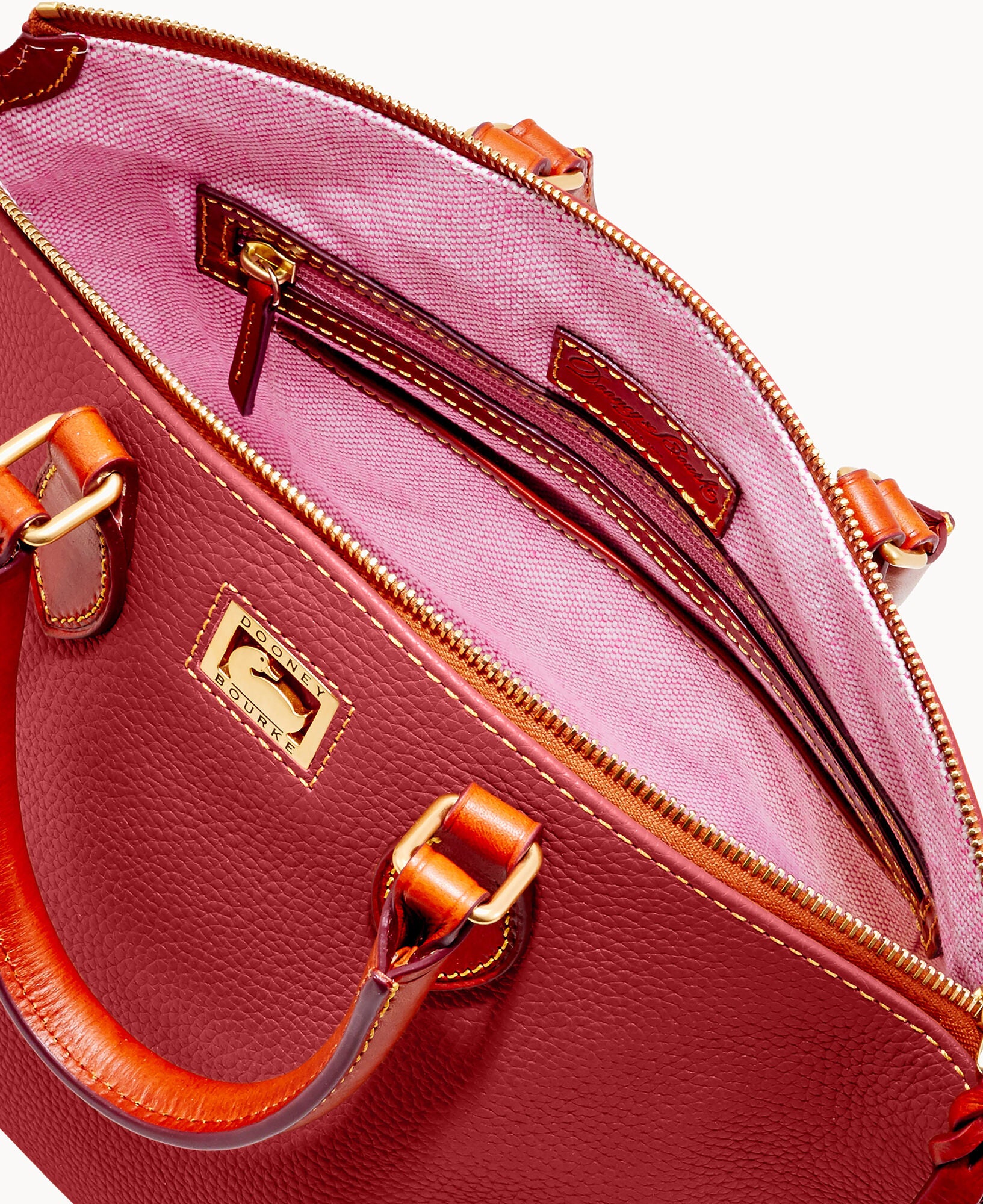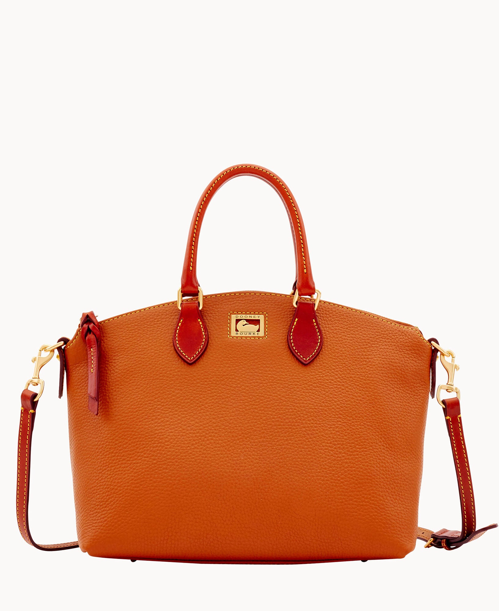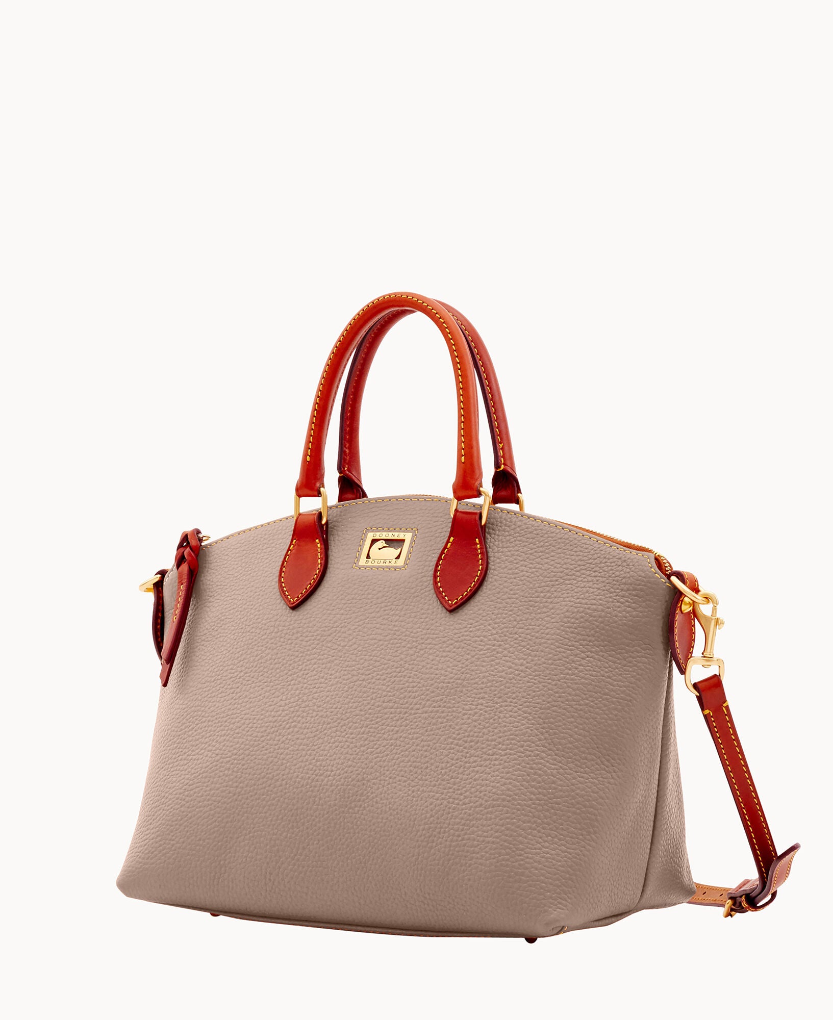 One inside zip pocket. Two inside pockets. Cell phone pocket. Inside key hook. Handle drop length 4.5″. Adjustable, detachable shoulder strap. Strap drop length 13″. Lined. Feet. Zipper closure.