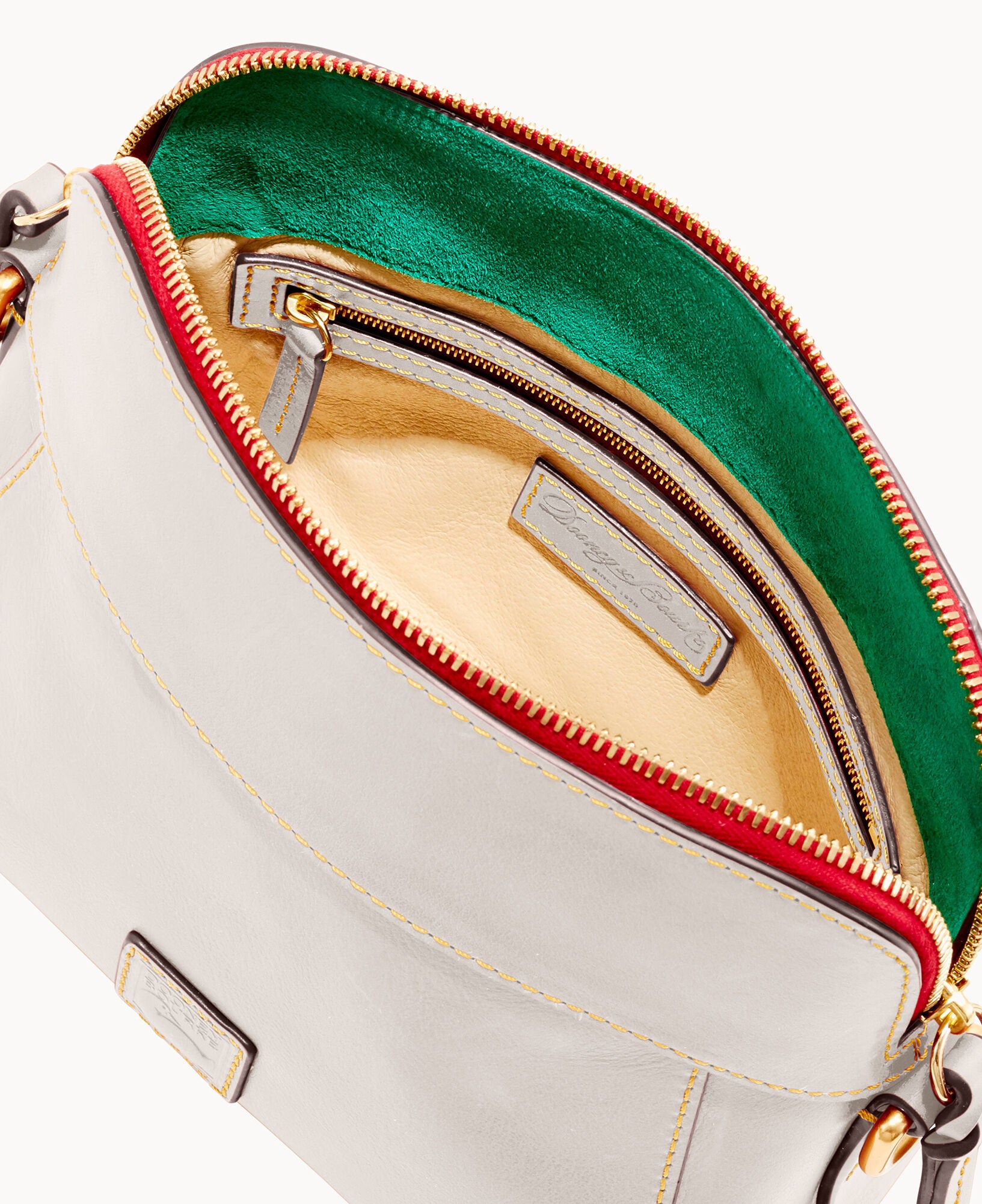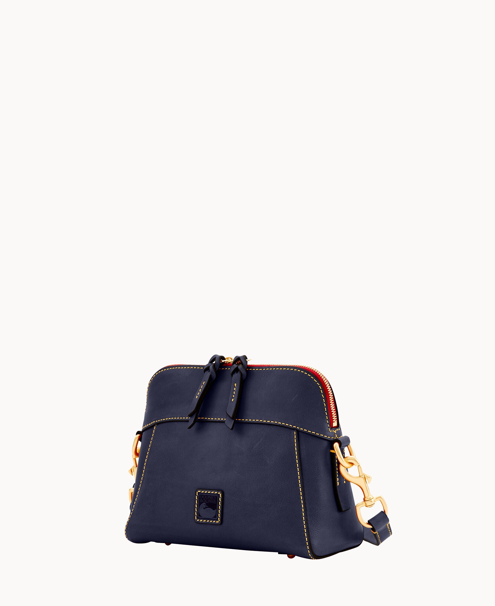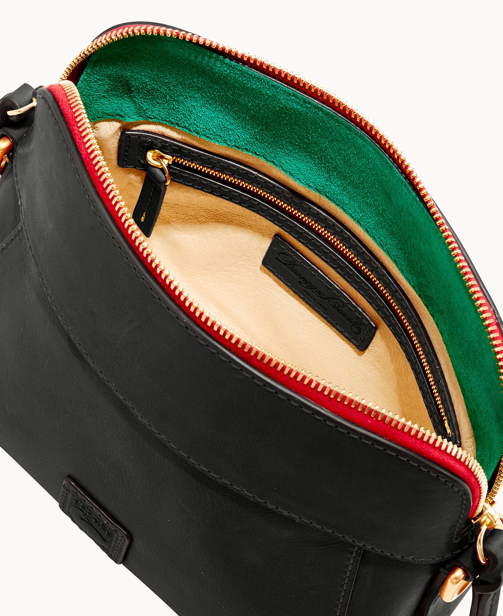 One inside zip pocket. Two inside pockets. Cell phone pocket. Inside key hook. Strap drop length 22.5″. Lined. Feet. Zipper closure.