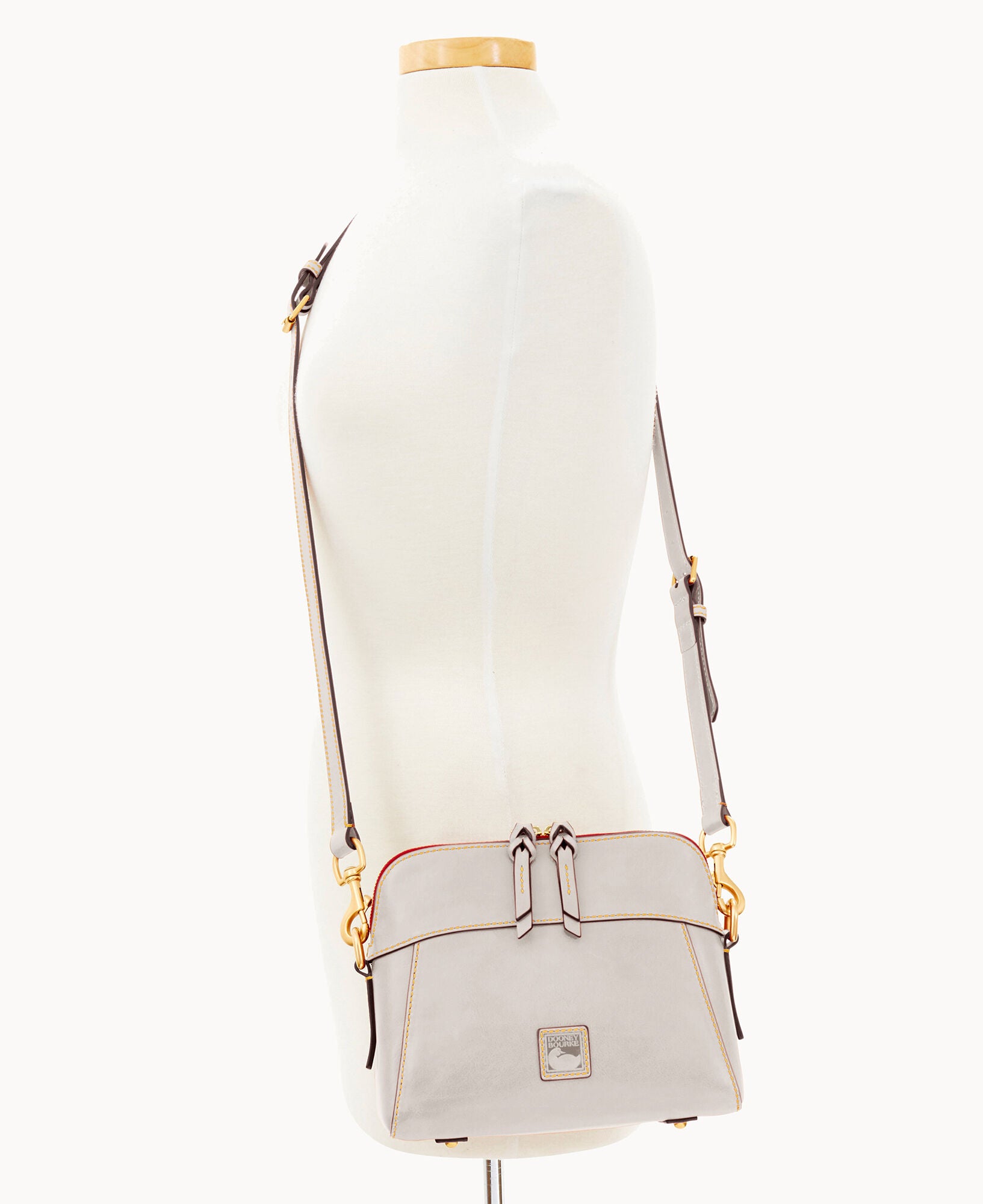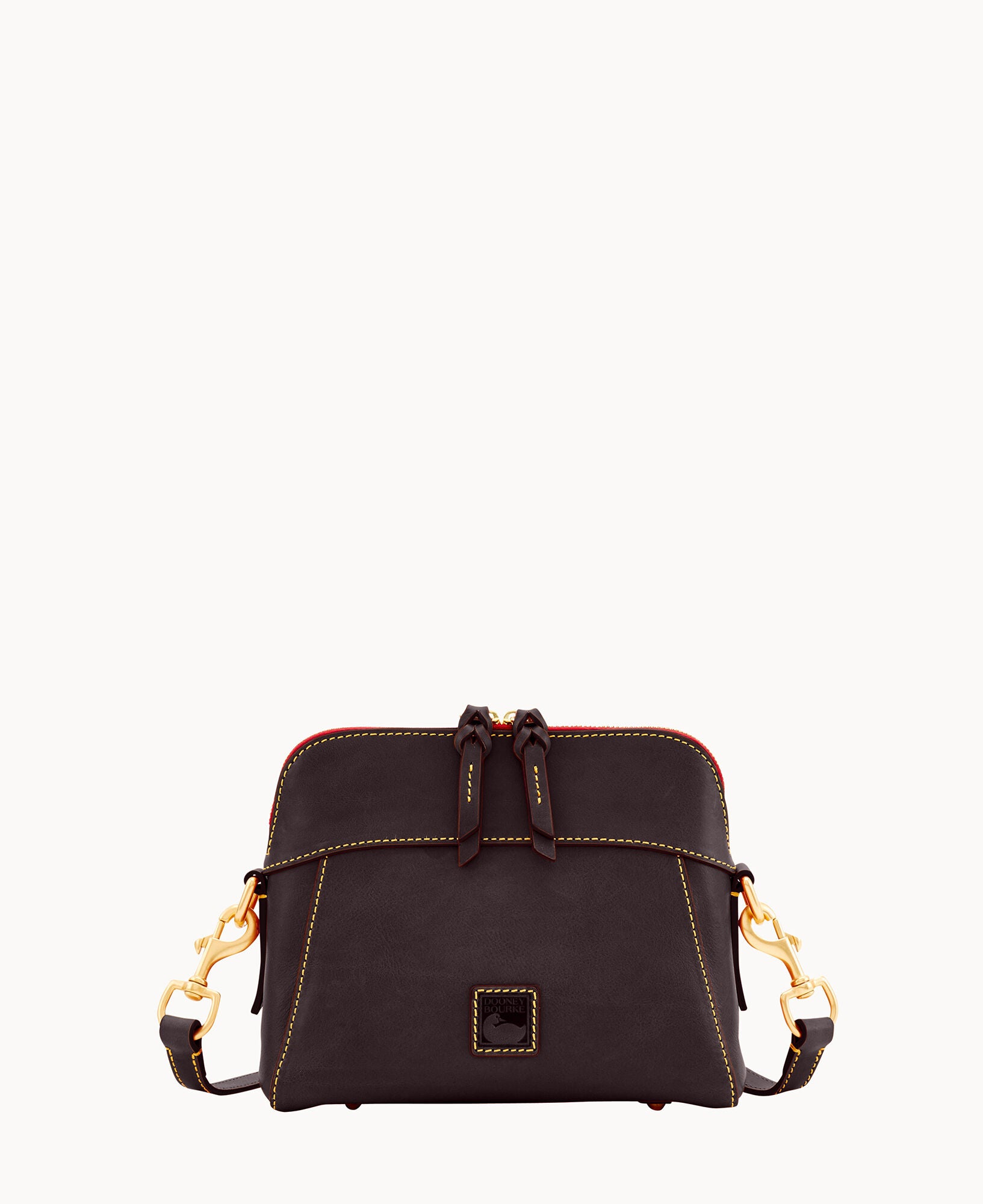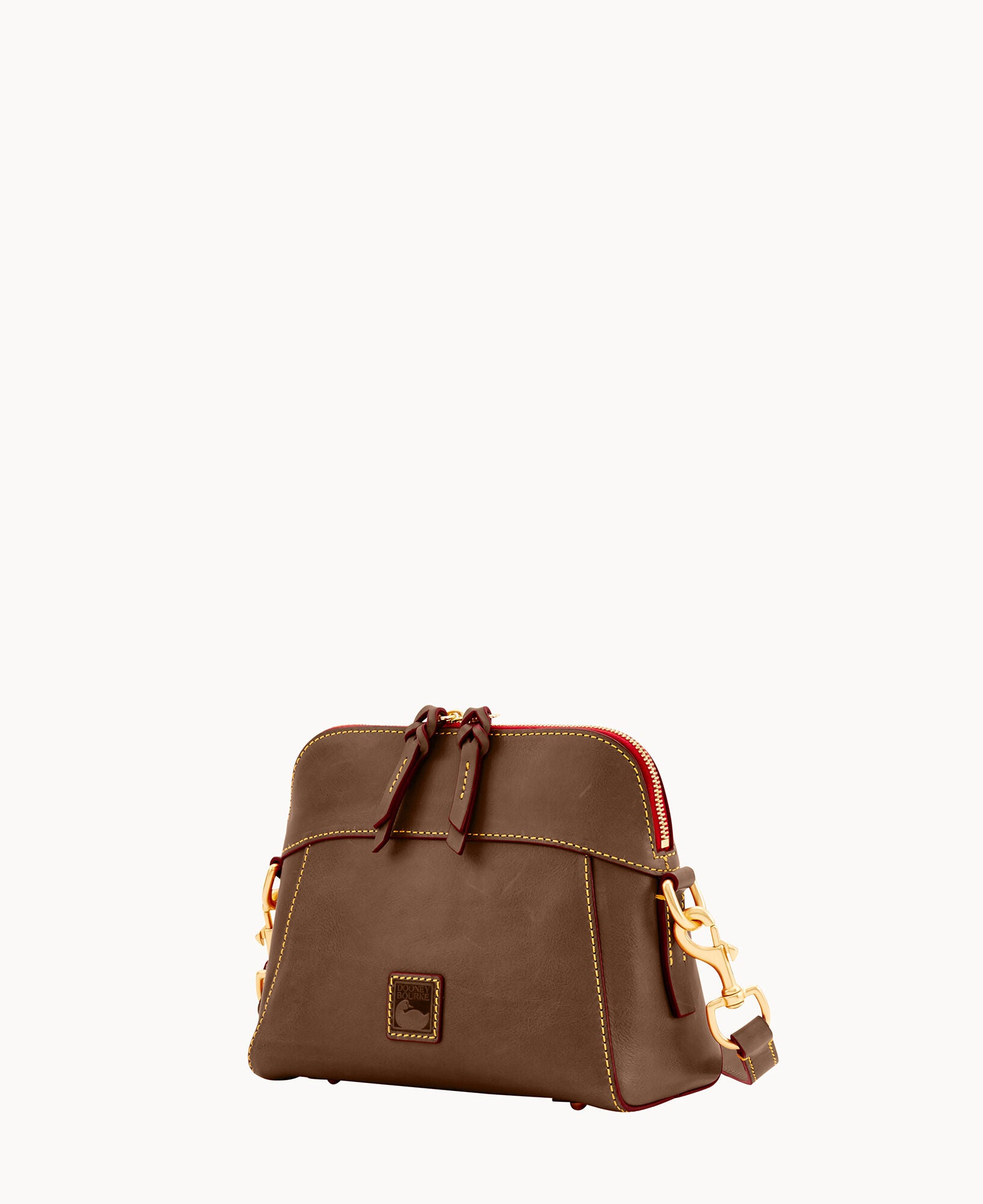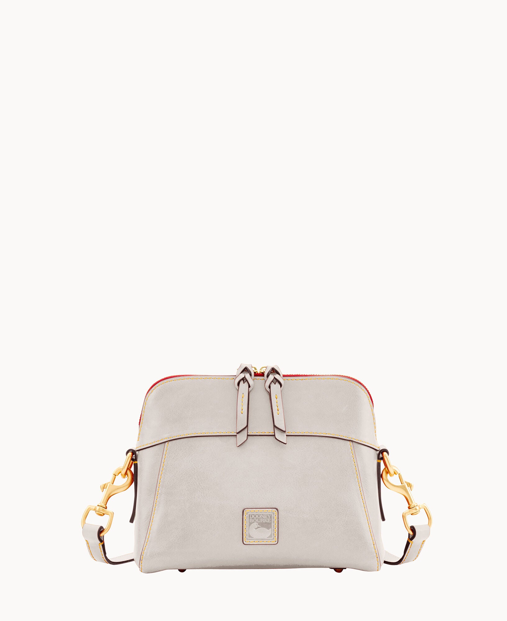 One inside zip pocket. Two inside pockets. Cell phone pocket. Inside key hook. Strap drop length 22.5″. Lined. Feet. Zipper closure.