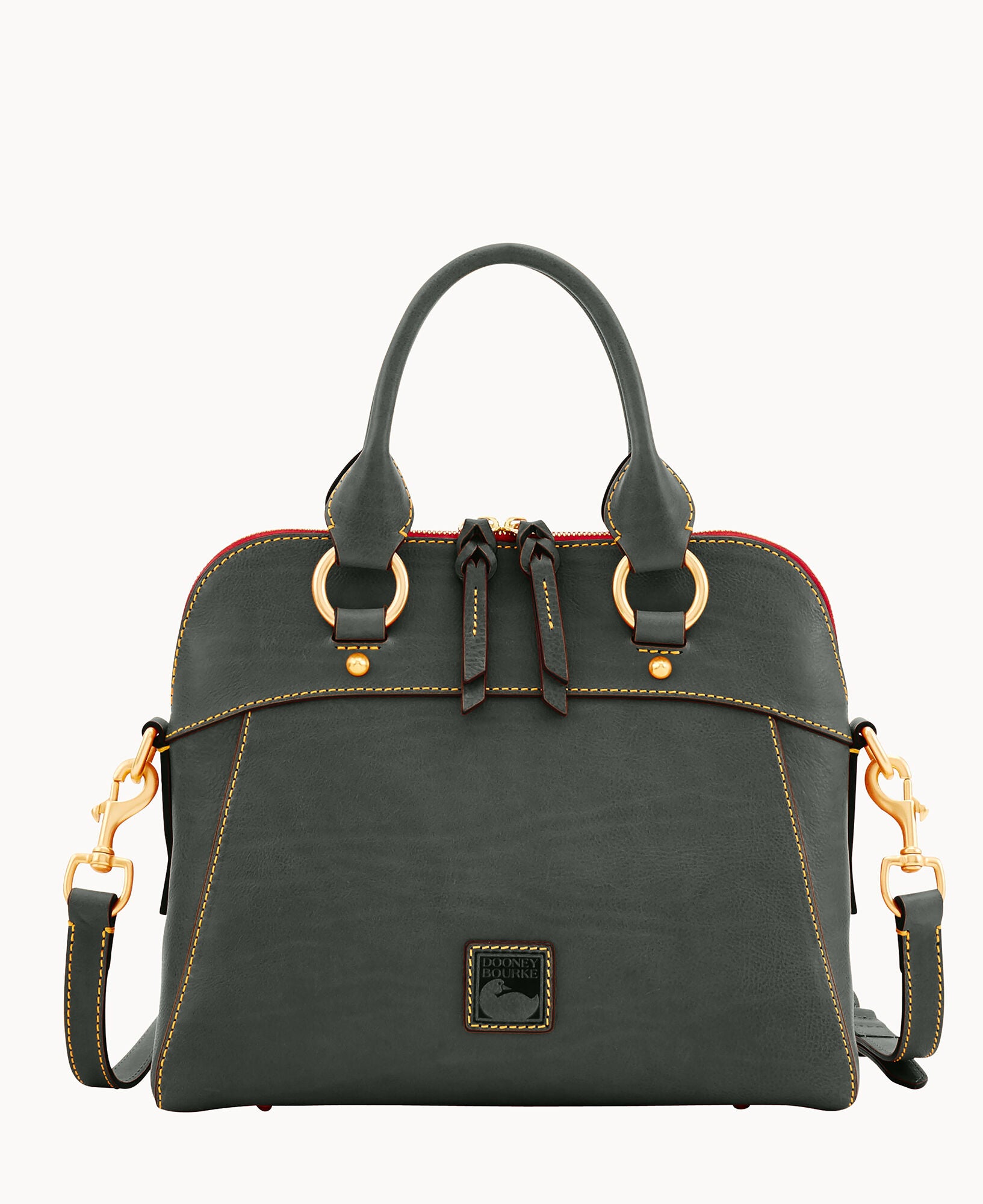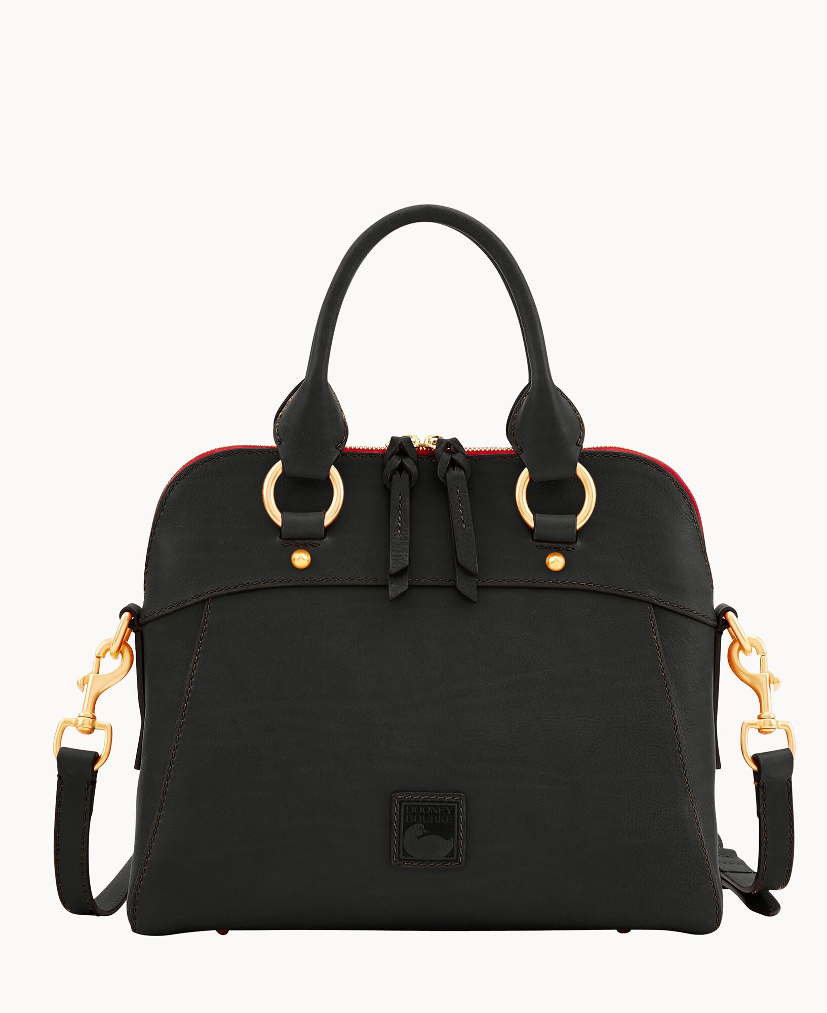 One inside zip pocket. Two inside pockets. Cell phone pocket. Inside key hook. Handle drop length 5″. Adjustable and detachable strap. Strap drop length 22.5″. Lined. Feet. Zipper closure.