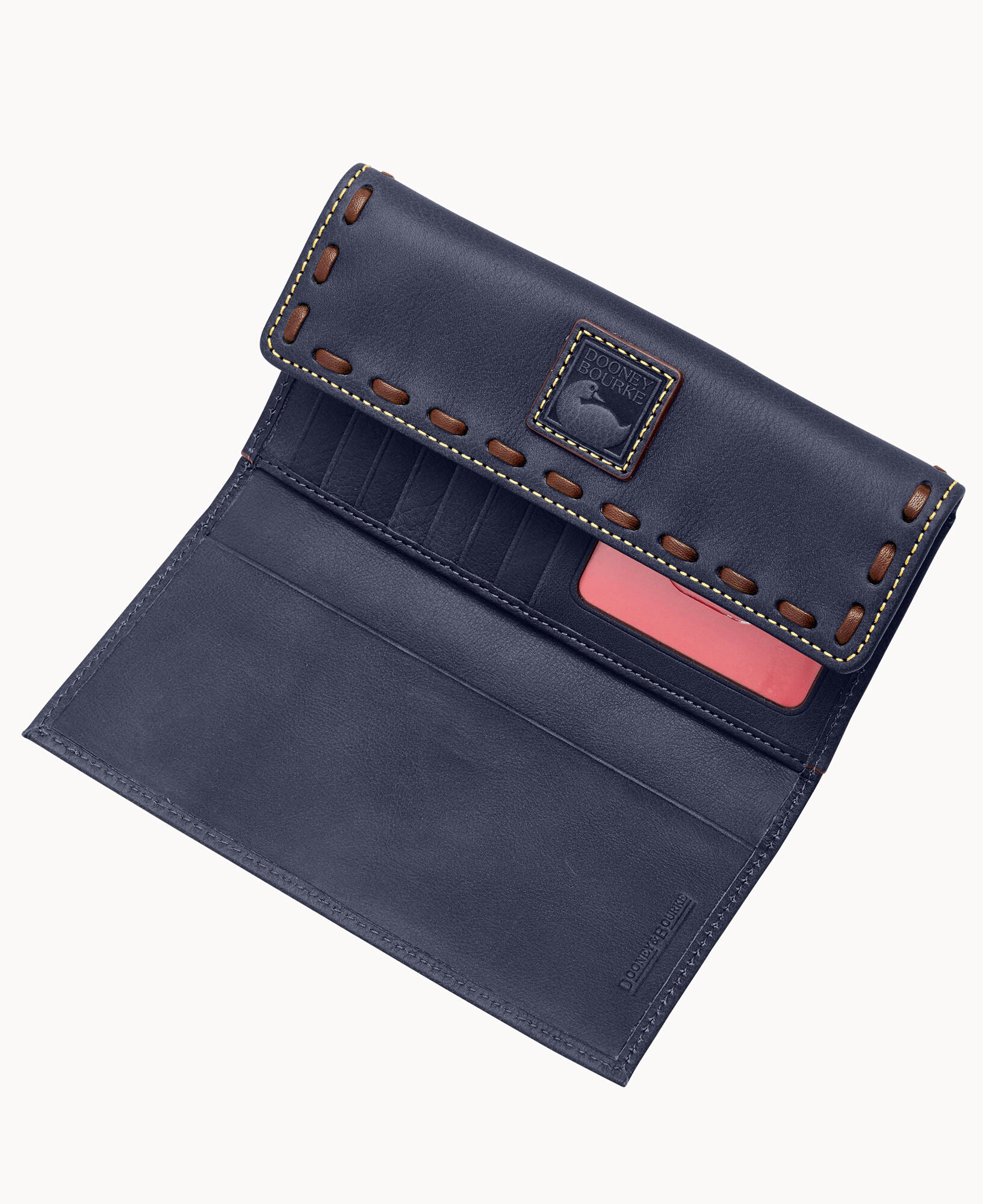 One outside zip pocket. One inside pocket. License pocket with window. Two bill compartments. Seven credit card slots. Lined. Feet. Snap closure.