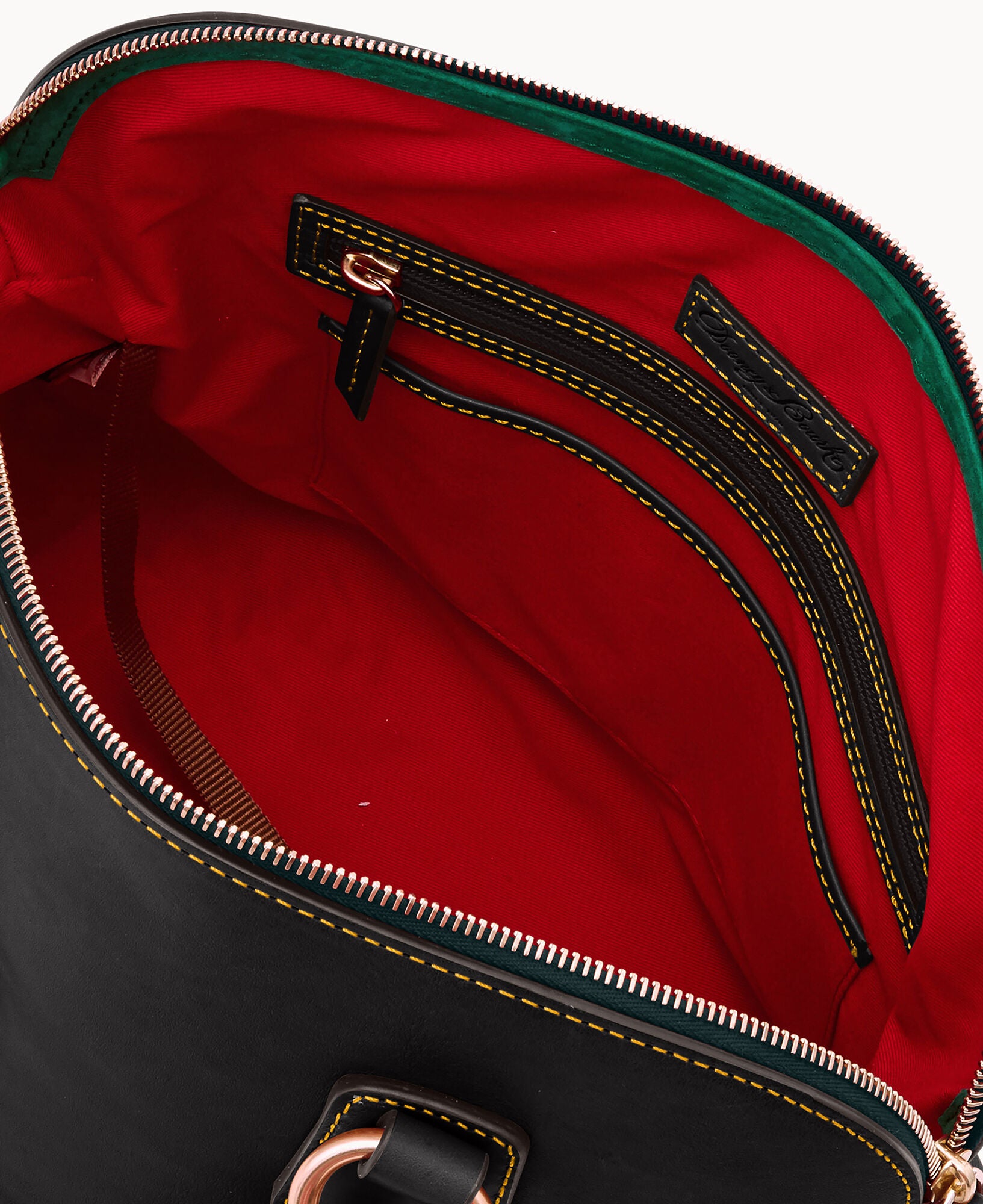 One outside pocket. One inside zip pocket. Two inside pockets. Cell phone pocket. Inside key hook. Strap drop length 8″. Lined. Feet. Zipper closure.
