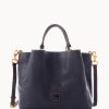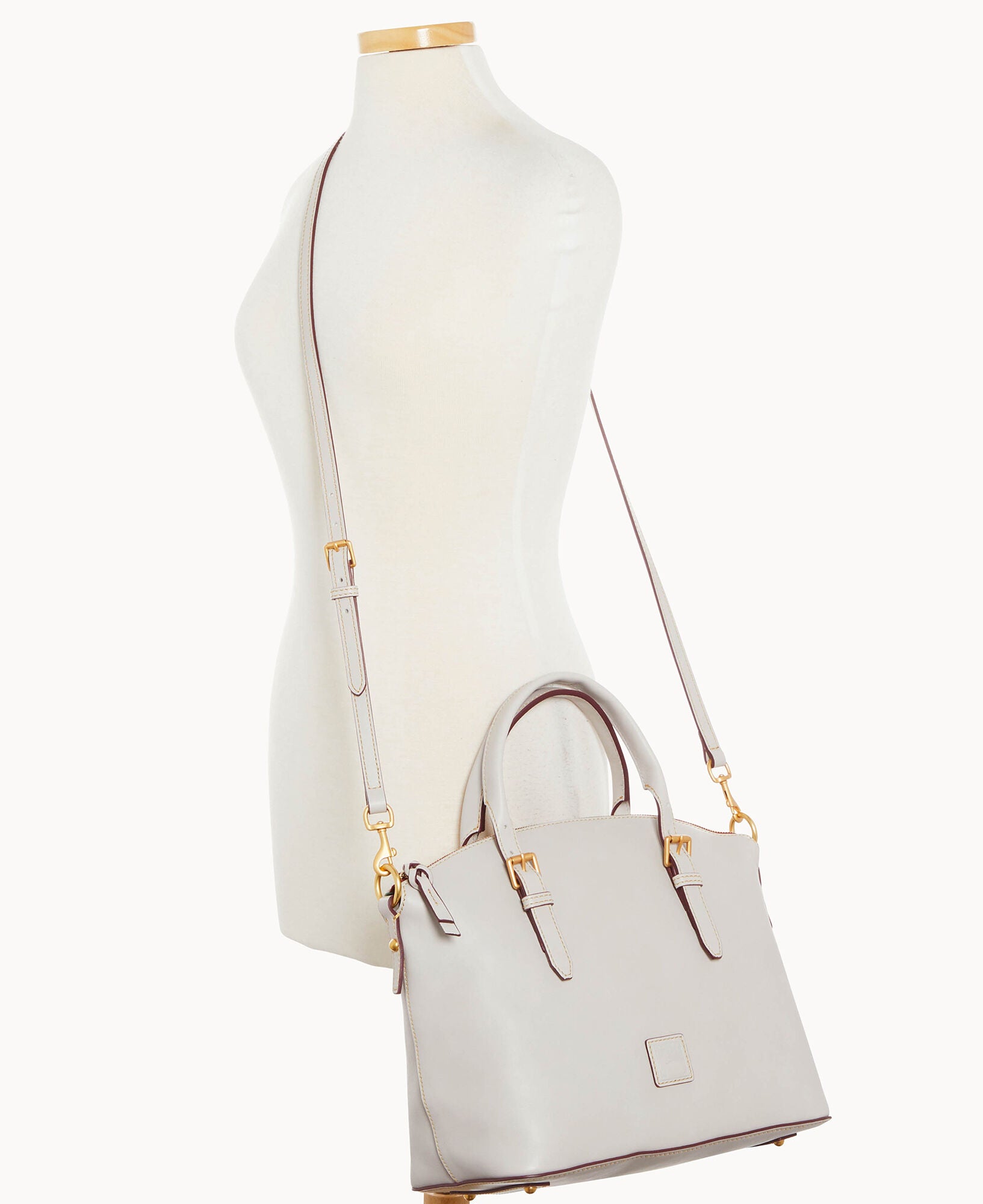 One inside zip pocket. Two inside pockets. Cell phone pocket. Inside key hook. Adjustable handle. Handle drop length 4″. Adjustable, detachable strap. Strap drop length 25″. Lined. Feet. Zipper closure.