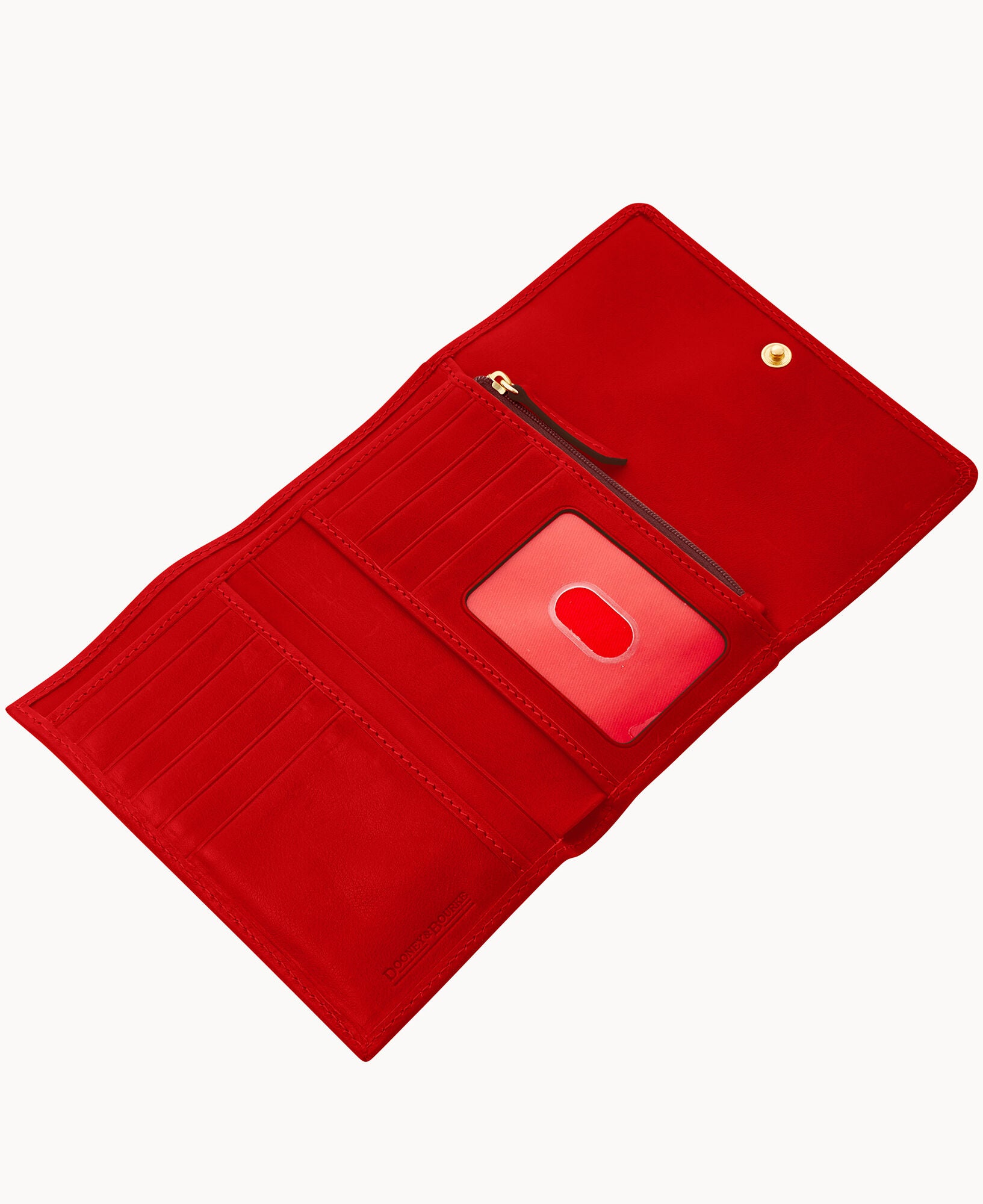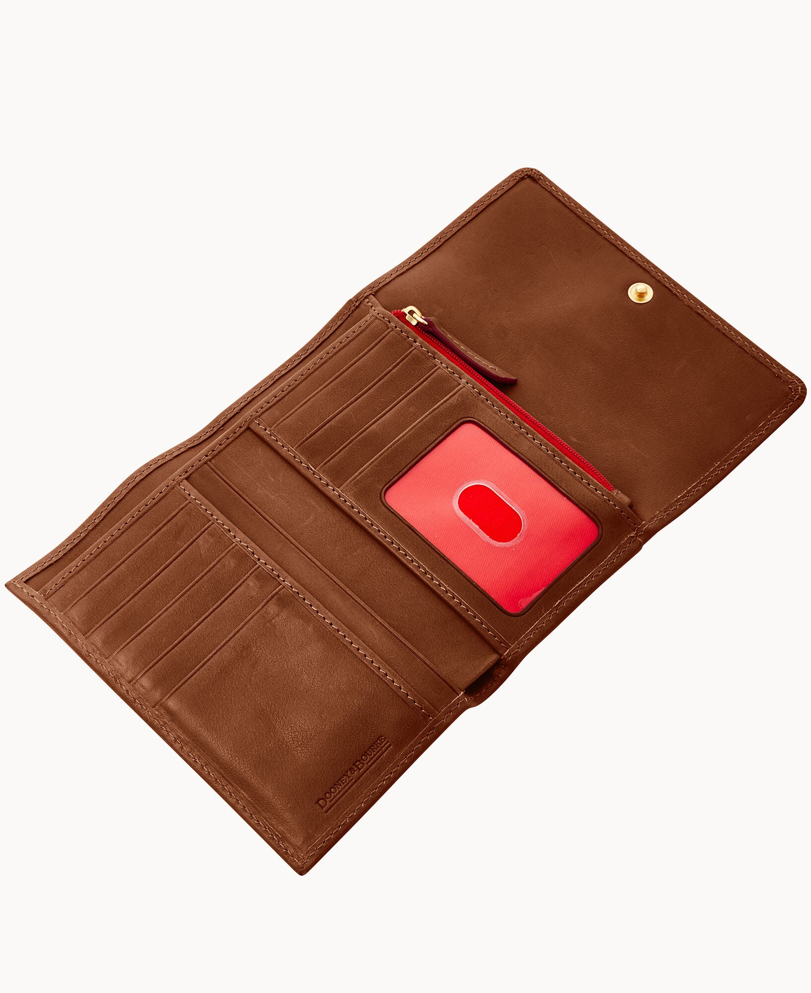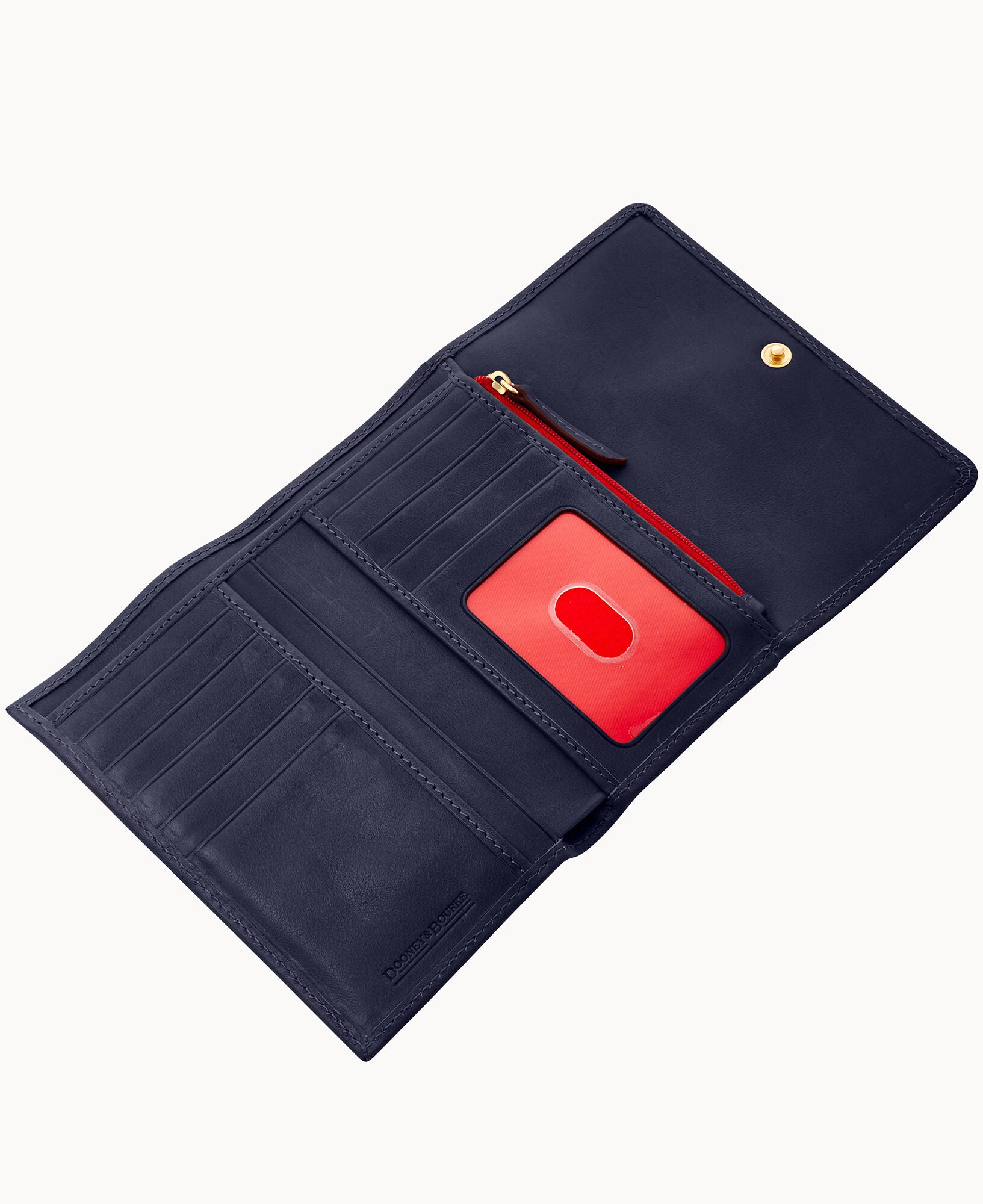 One inside zip pocket. ID window. Billfold compartment. Eight credit card slots. Flap closure.
