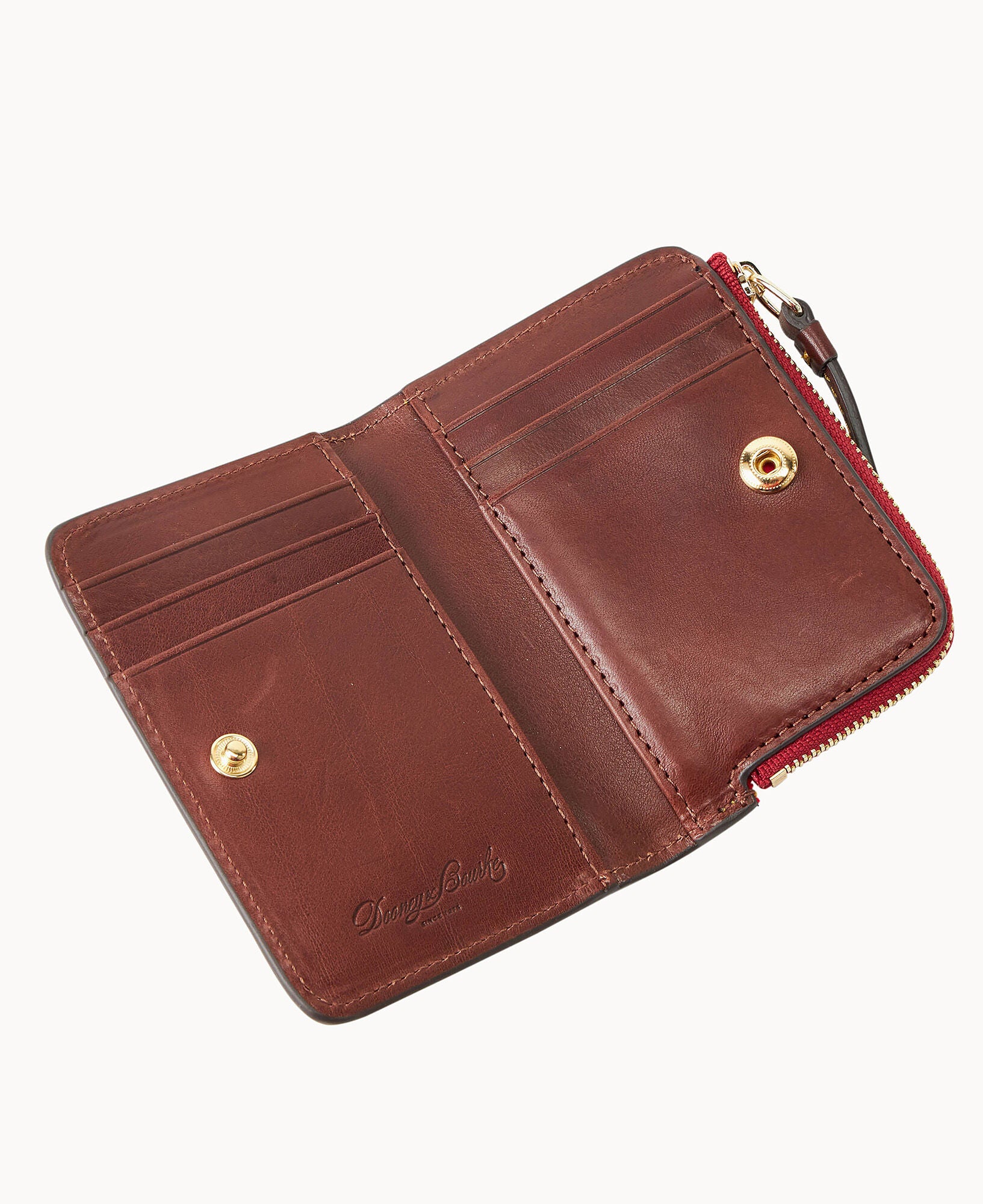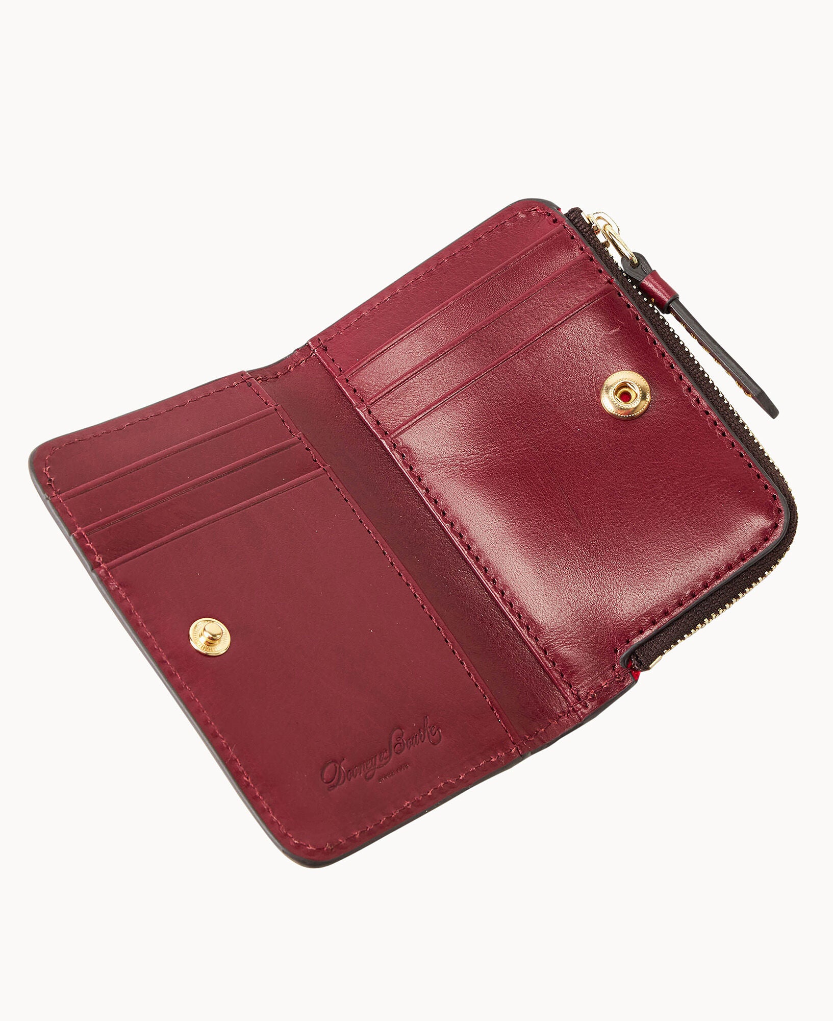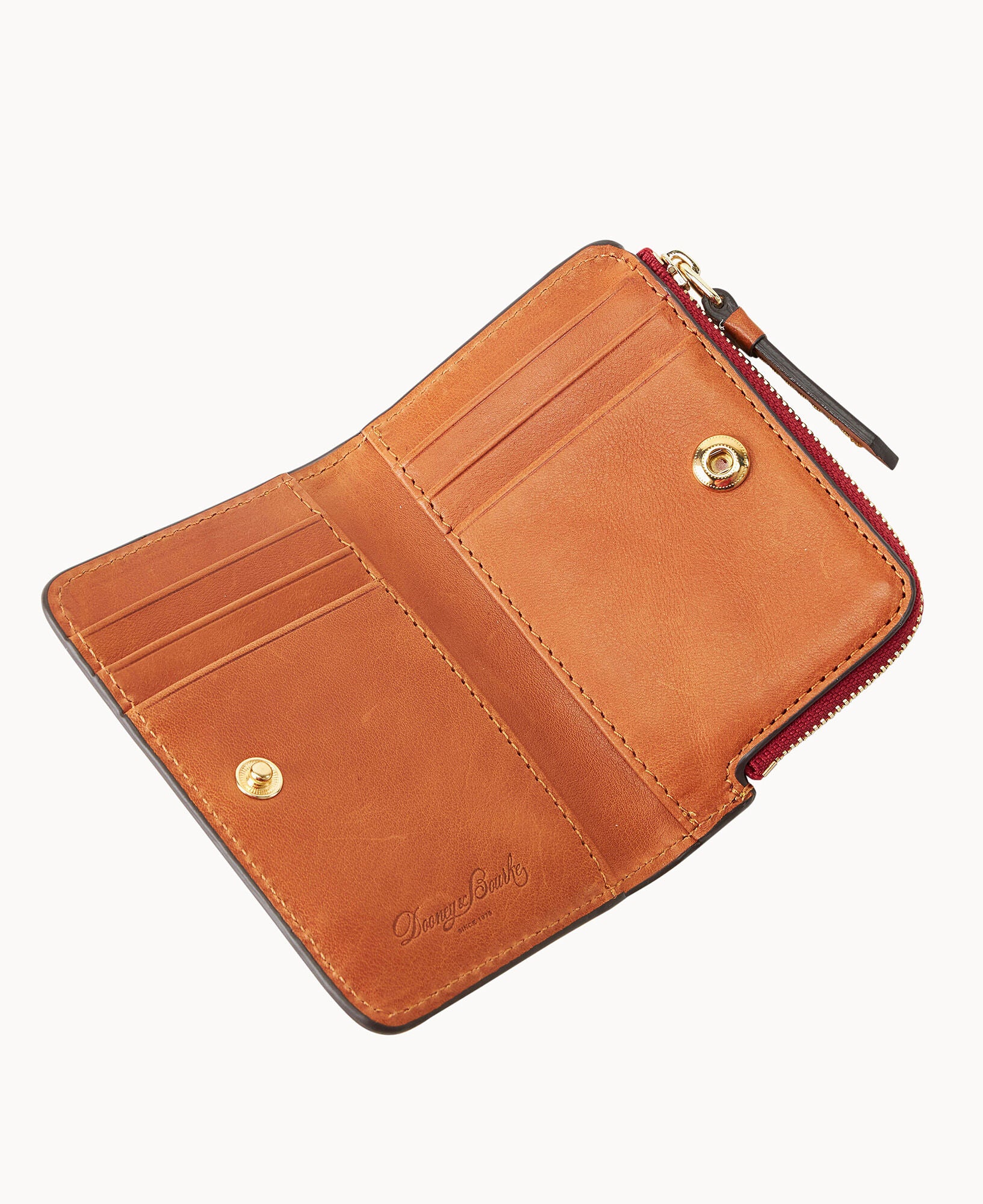 Six credit card slots. Two pockets. One zipper pocket. Snap closure.