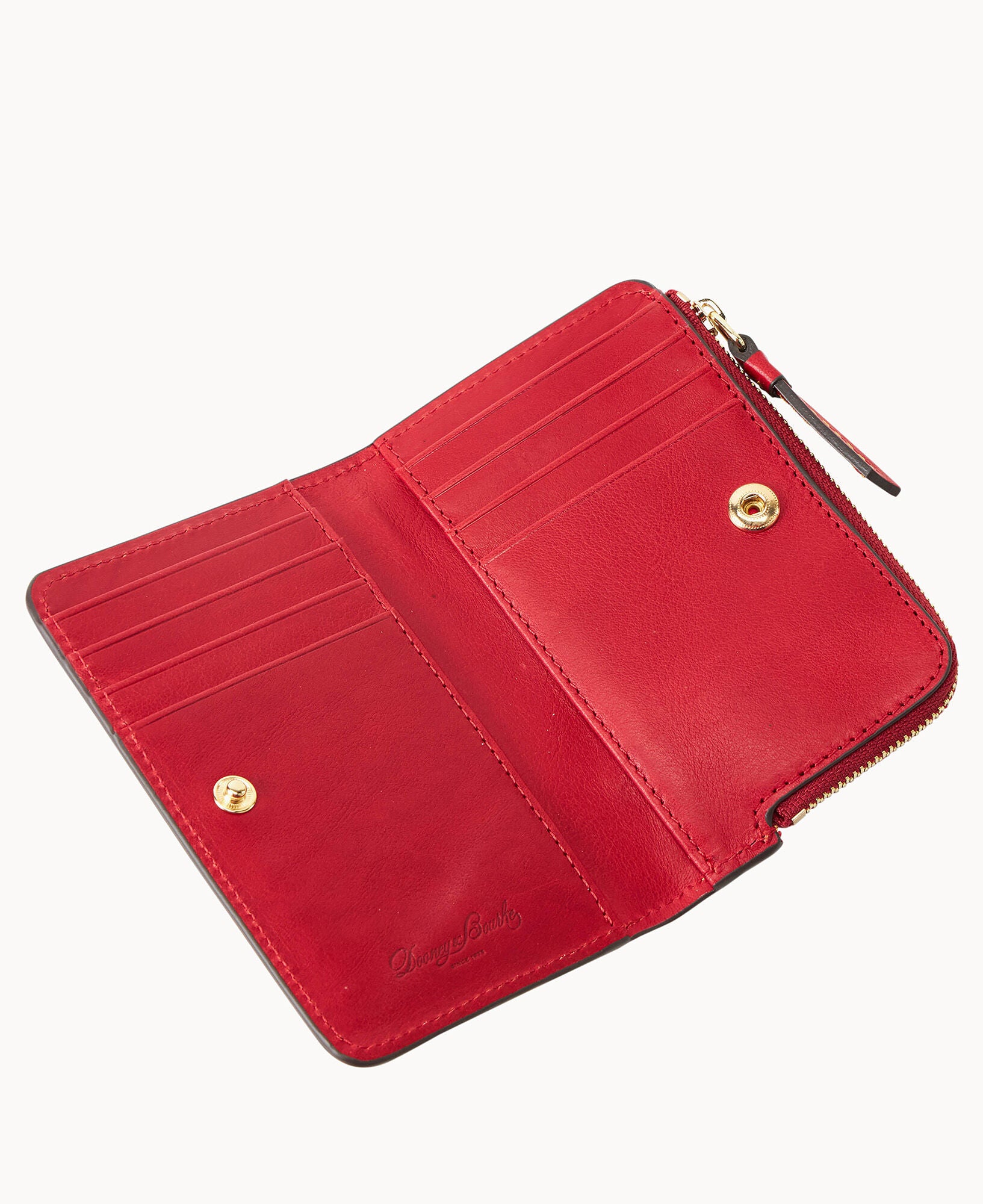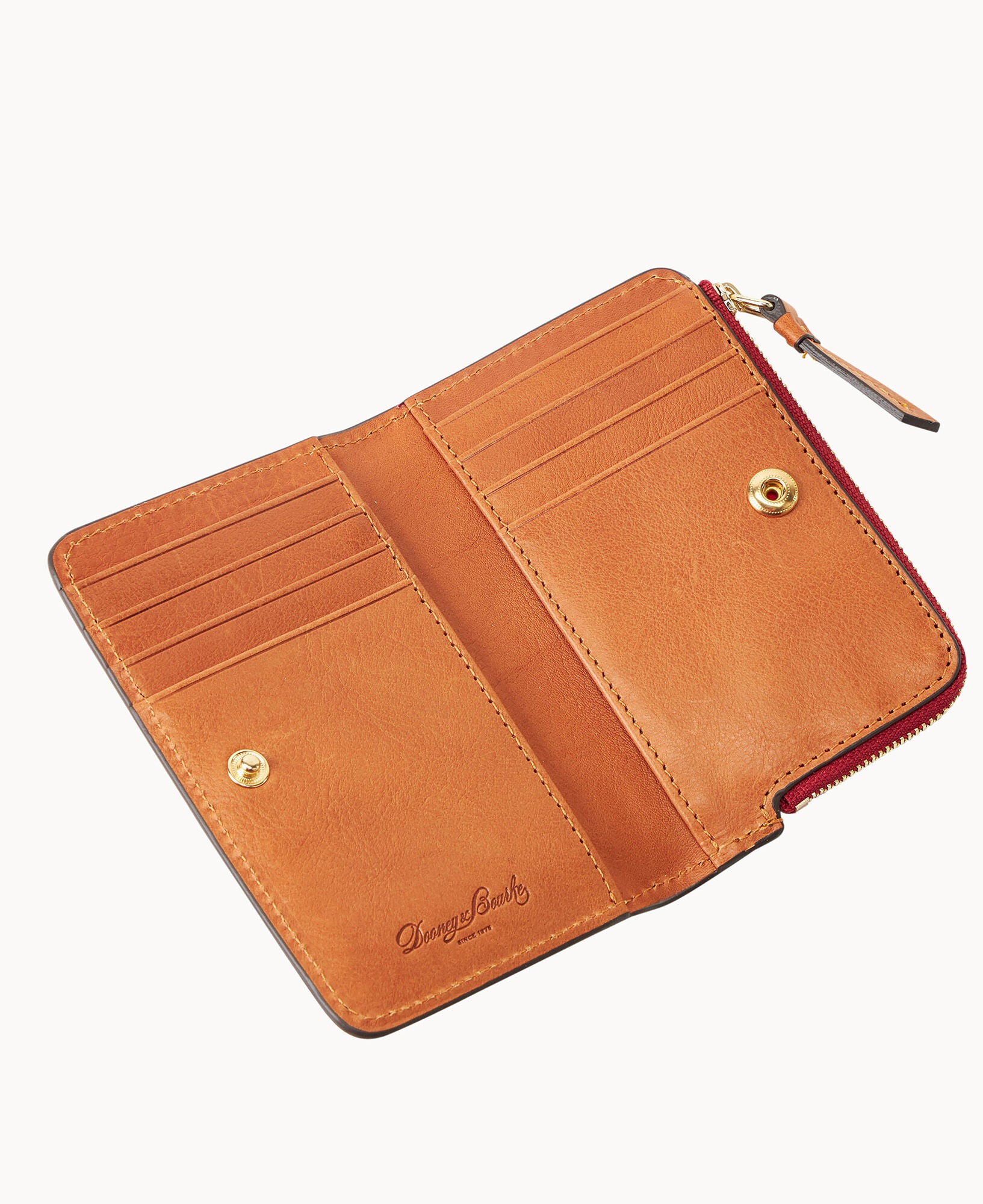 Eight credit card slots. Two pockets. One zipper pocket. Snap closure.