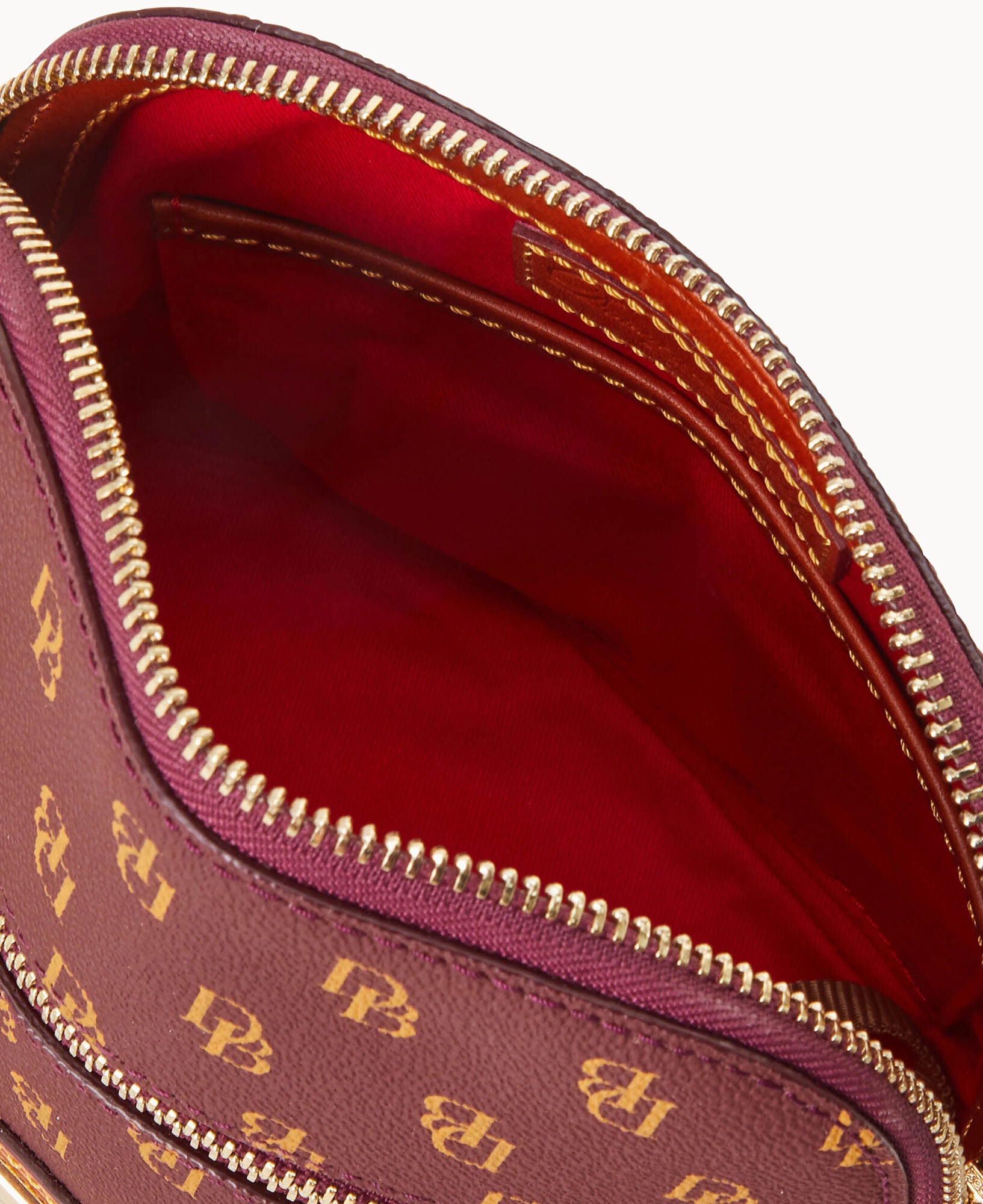 One outside zip pocket. Two inside pockets. Inside key hook. Adjustable, detachable shoulder strap. Strap drop length 24.5″. Lined. Feet. Zipper closure.