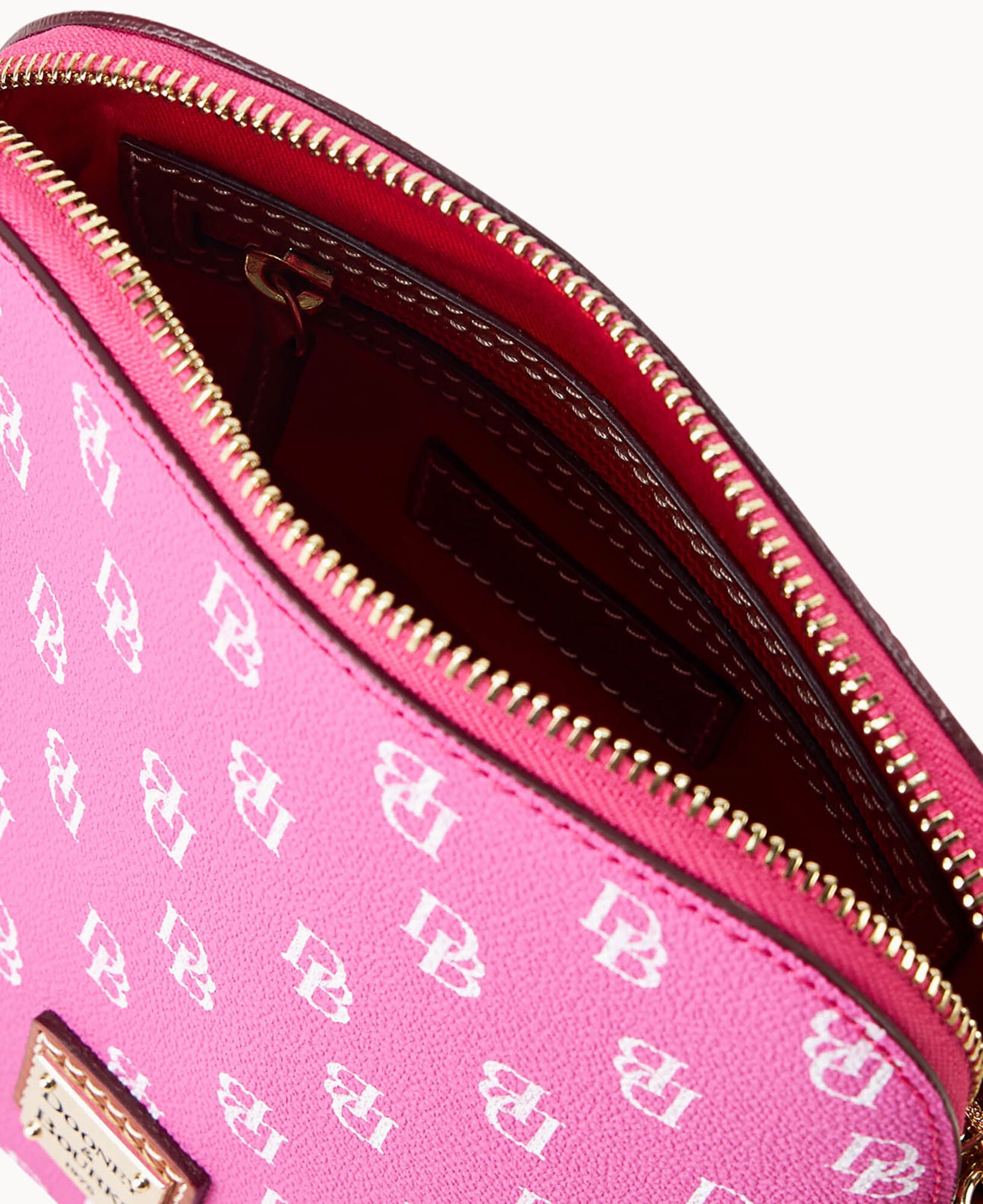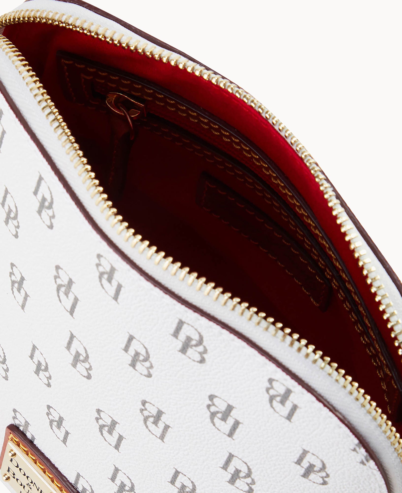 One outside zip pocket. One inside zip pocket. One inside pocket. Inside key hook. Adjustable shoulder strap. Strap drop length 23.75″. Lined. Feet. Zipper closure.