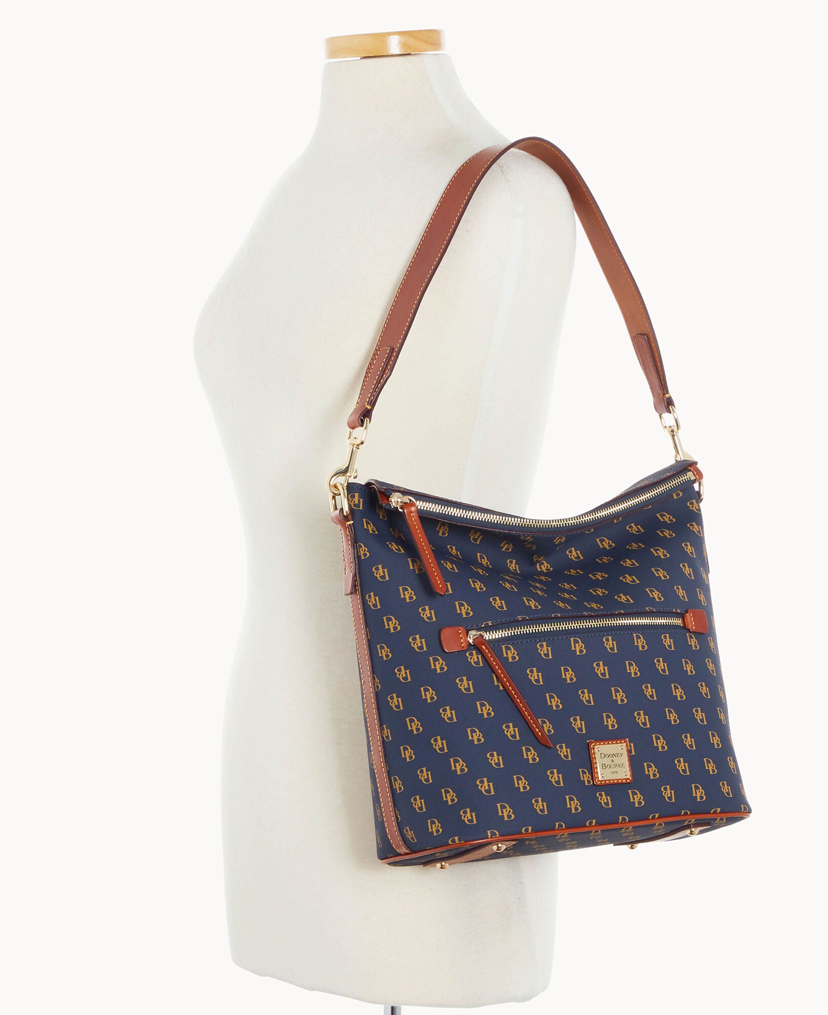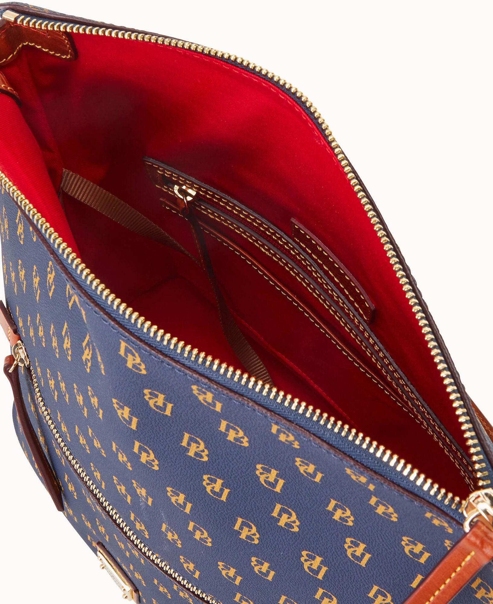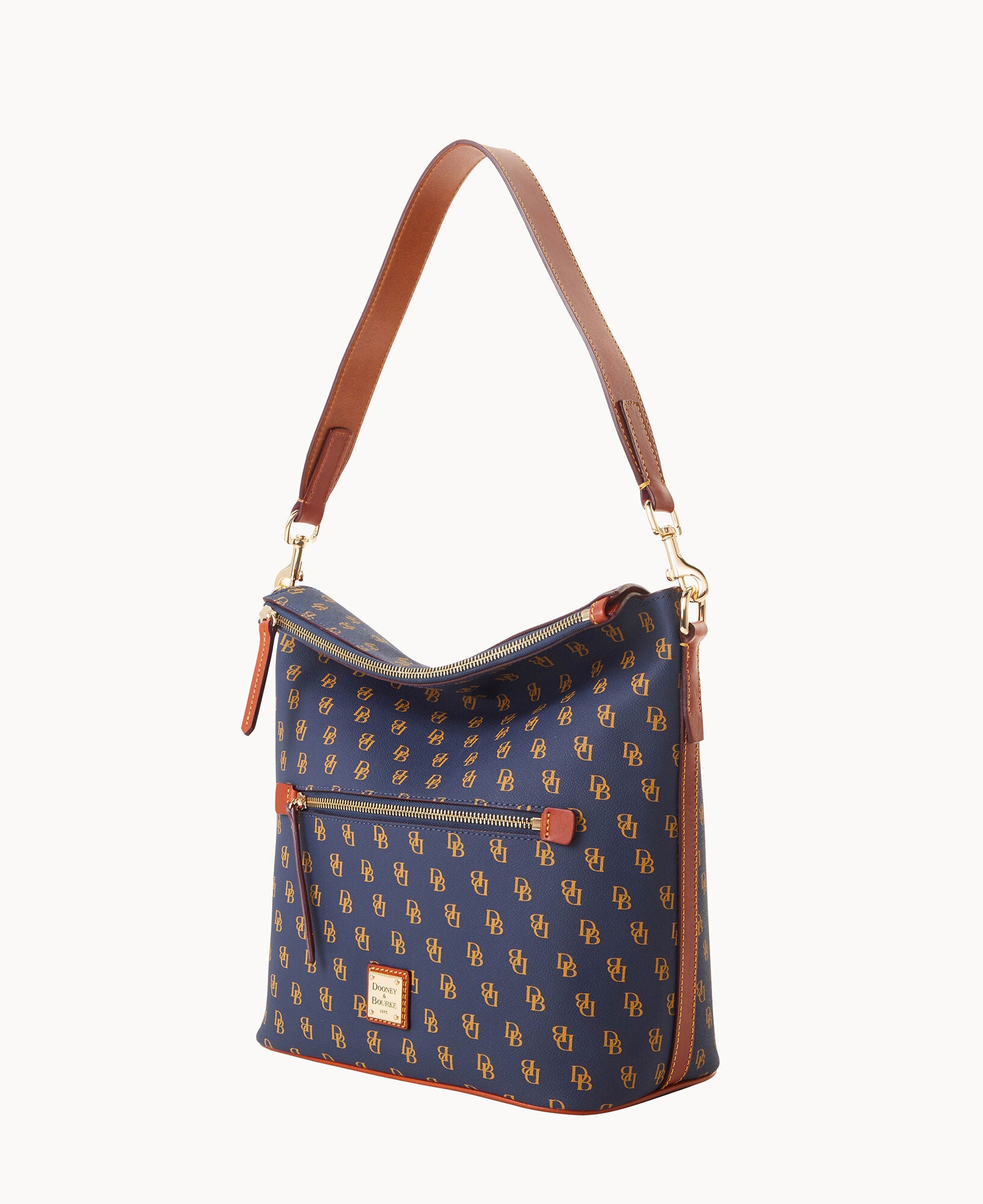 One outside zip pocket. One inside zip pocket. Two inside pockets. Cell phone pocket. Inside key hook. Handle length 13″. Lined. Zipper closure.