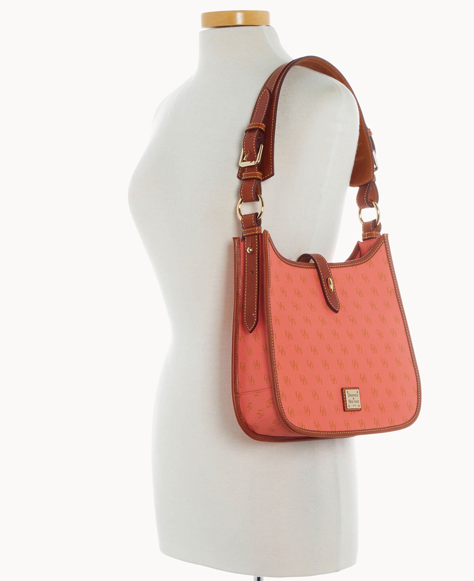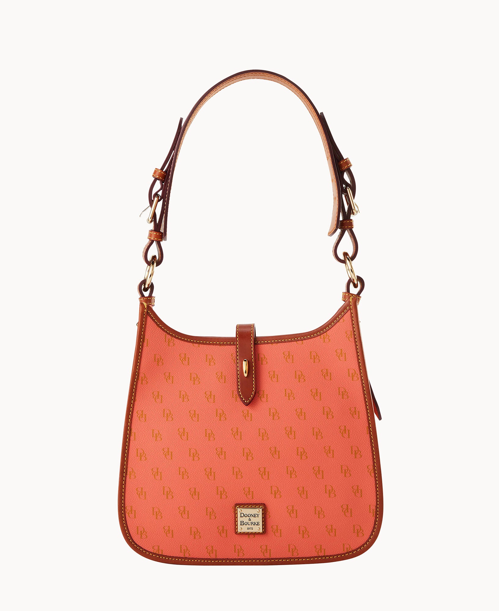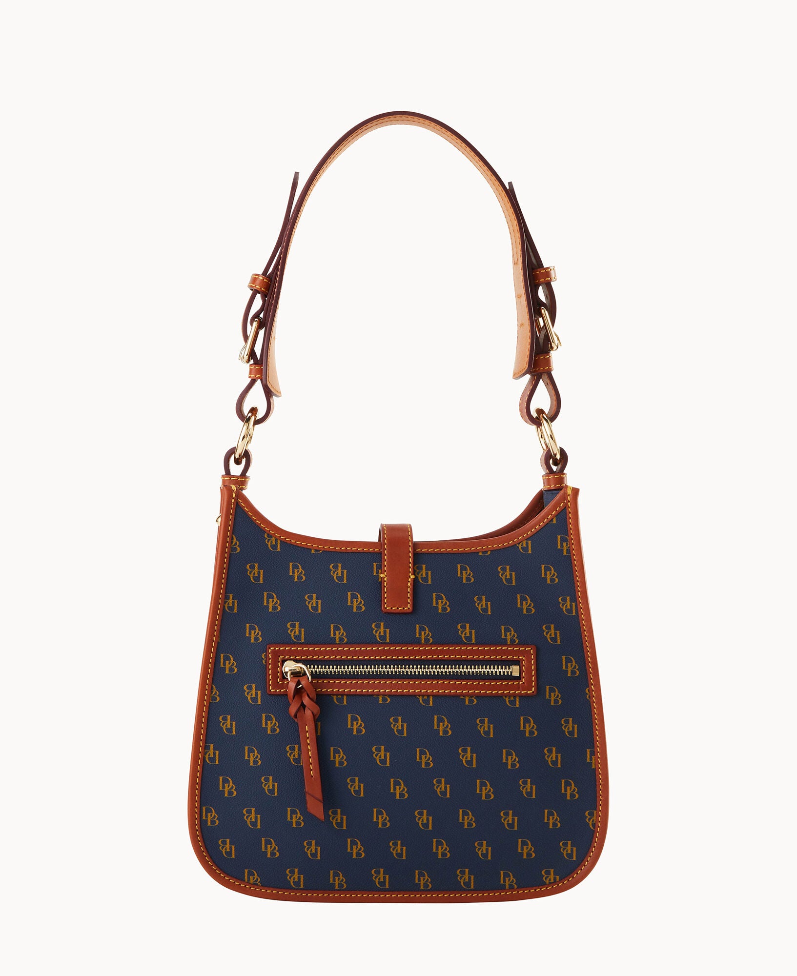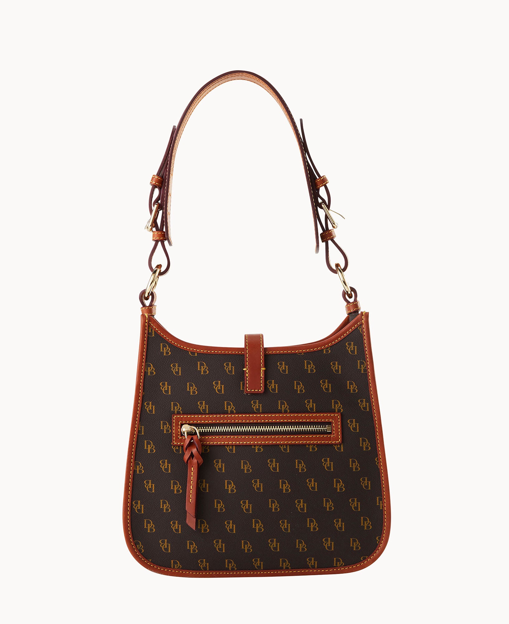One outside zip pocket. One inside zip pocket. Two inside pockets. Inside key hook. Adjustable shoulder strap. Strap drop length 12″. Lined. Tongue tab buckle closure.