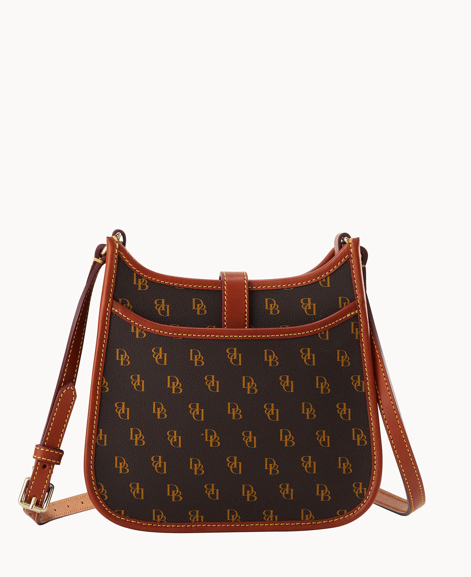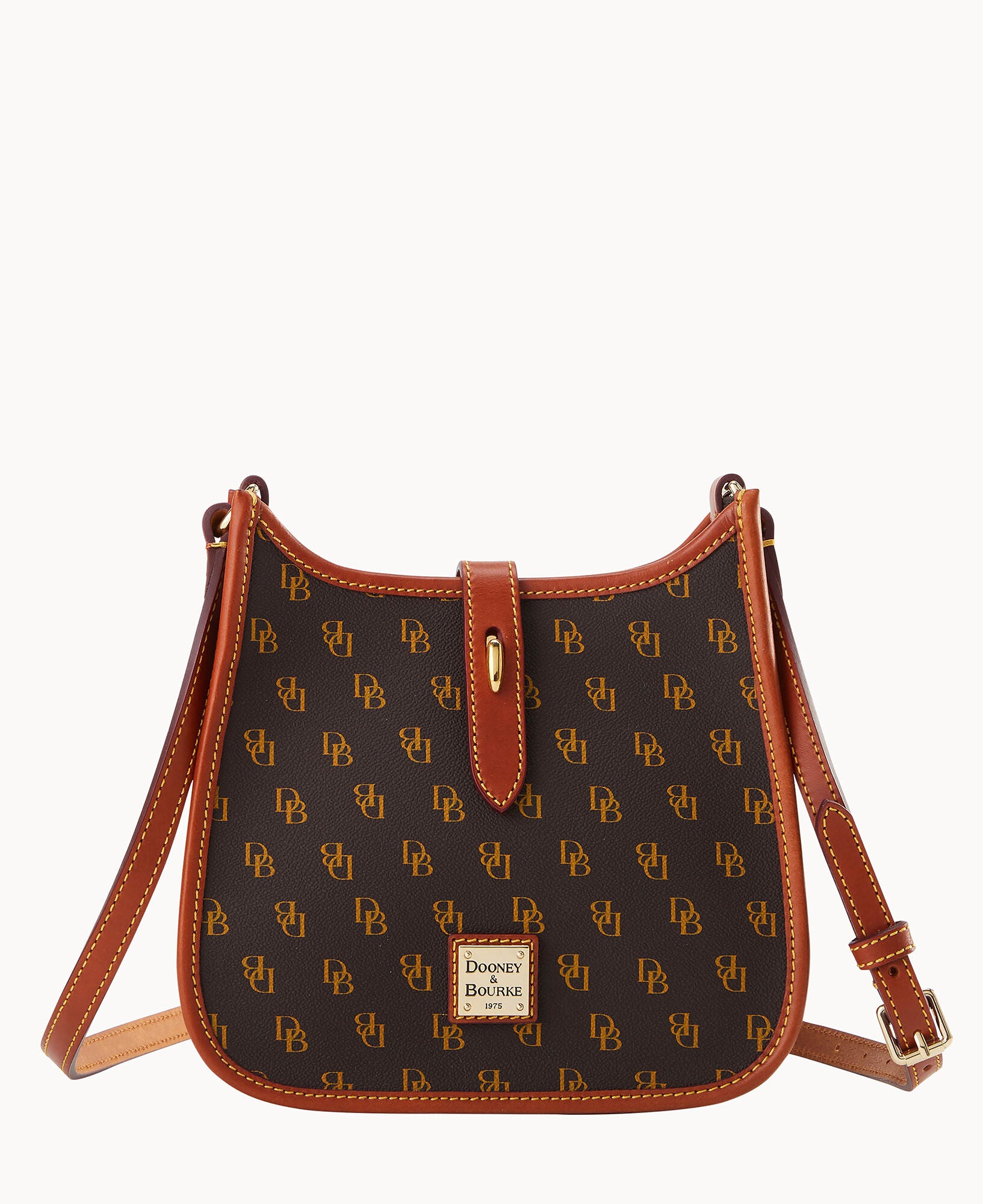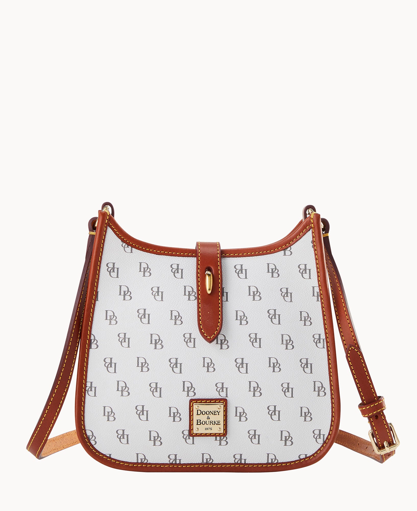One outside pocket. One inside zip pocket. One inside pocket. Inside key hook. Adjustable, detachable shoulder strap. Strap drop length 22.5″. Lined. Tongue tab buckle closure.