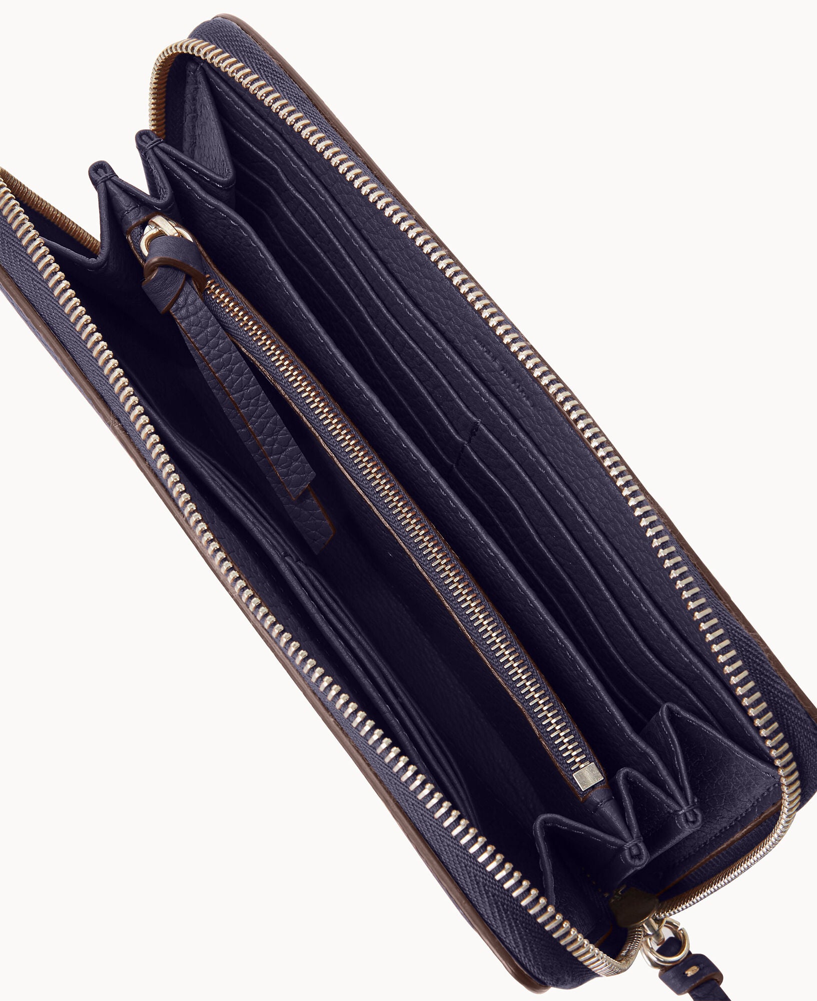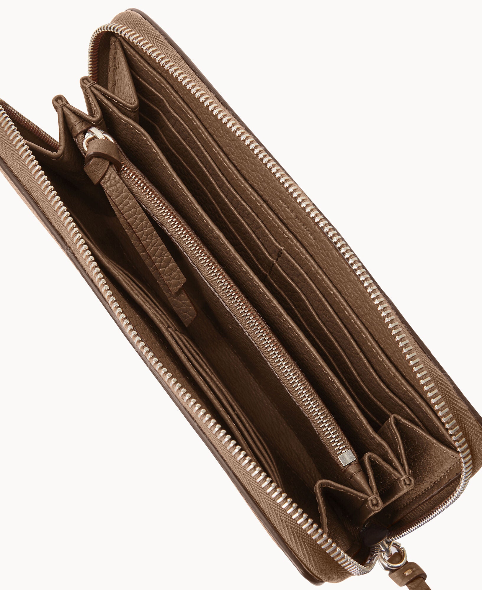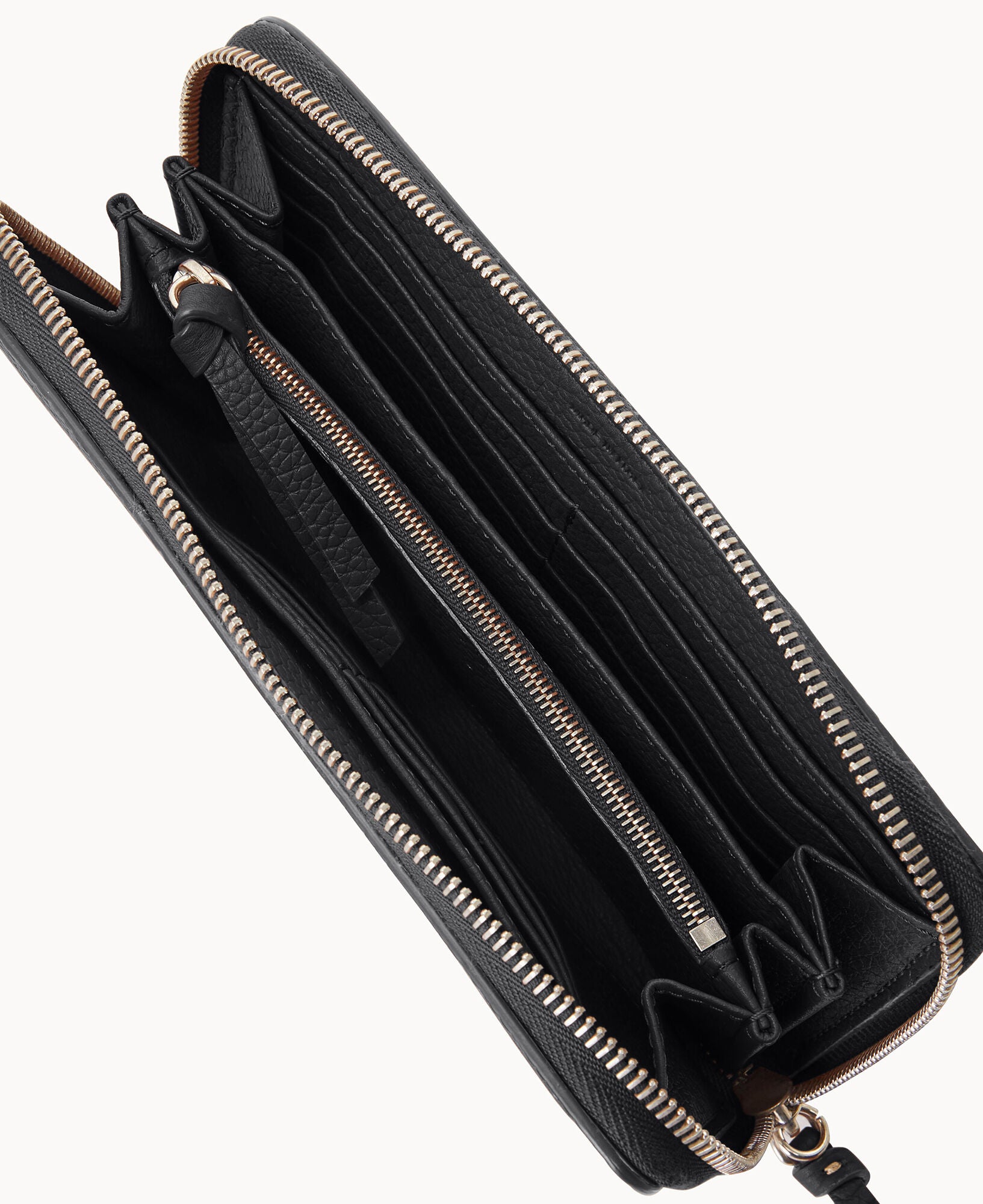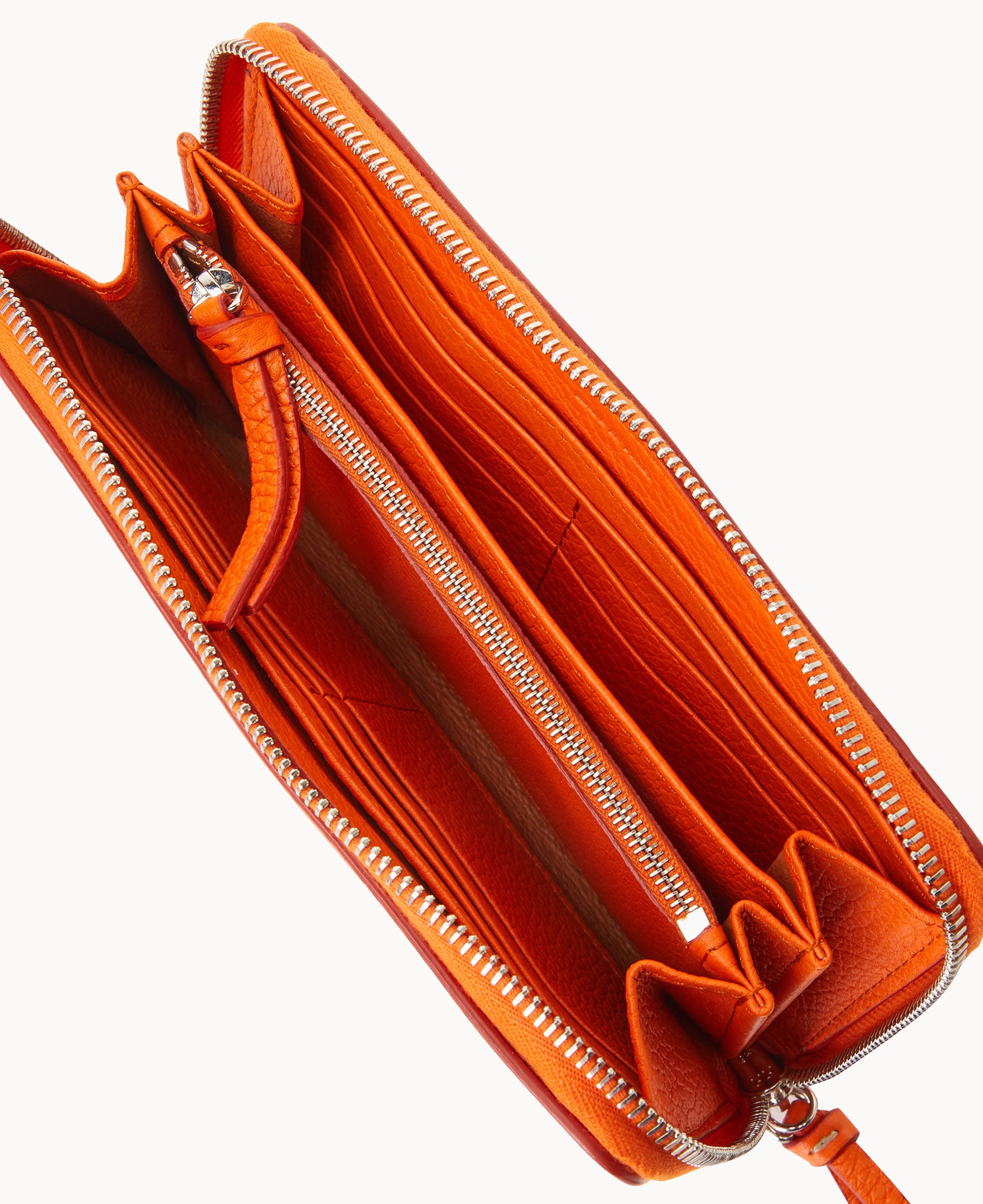 Two compartments. One zip compartment. Twelve credit card slots. Detachable wrist strap. Strap length 7″. Lined. Zipper closure.