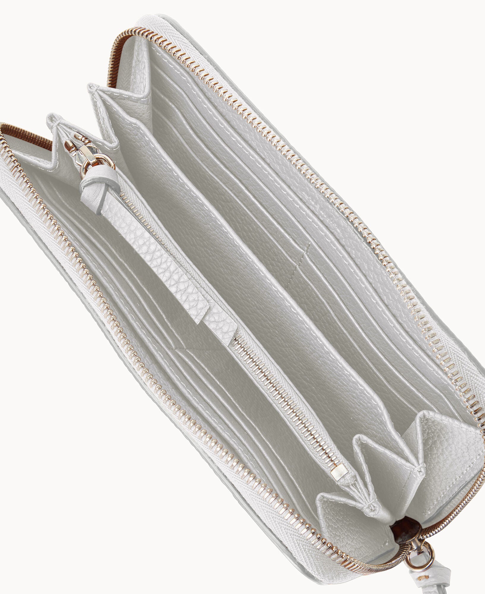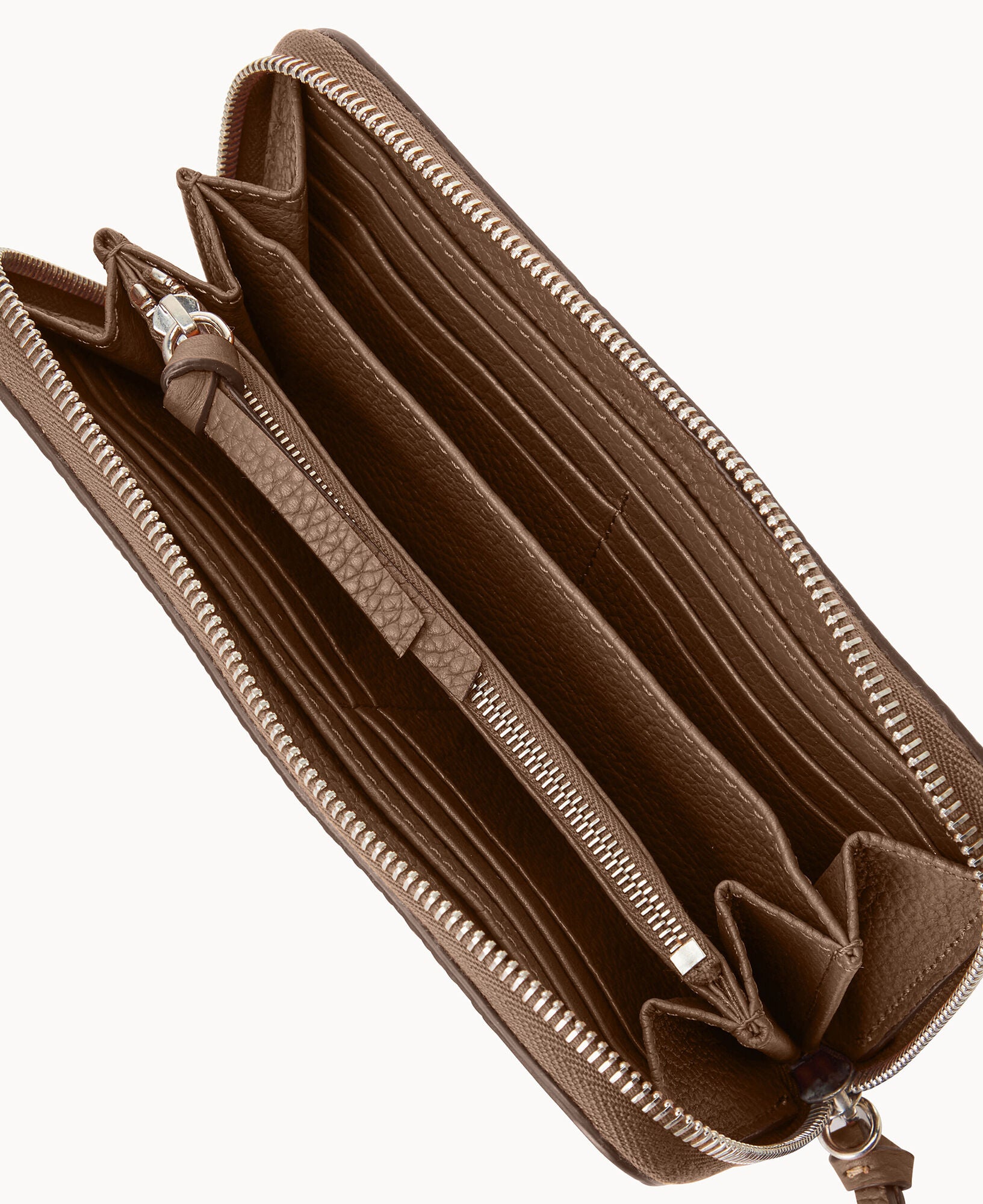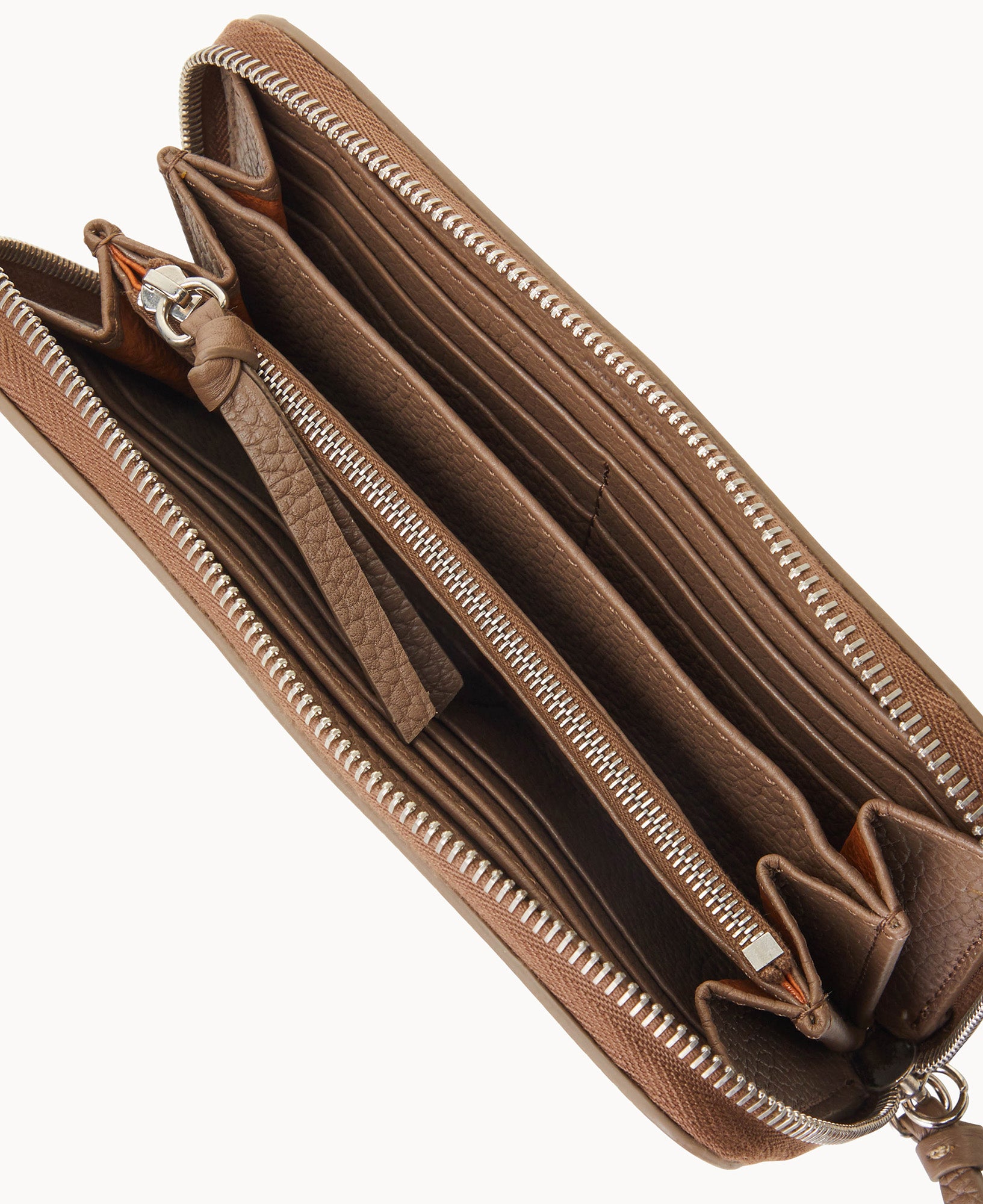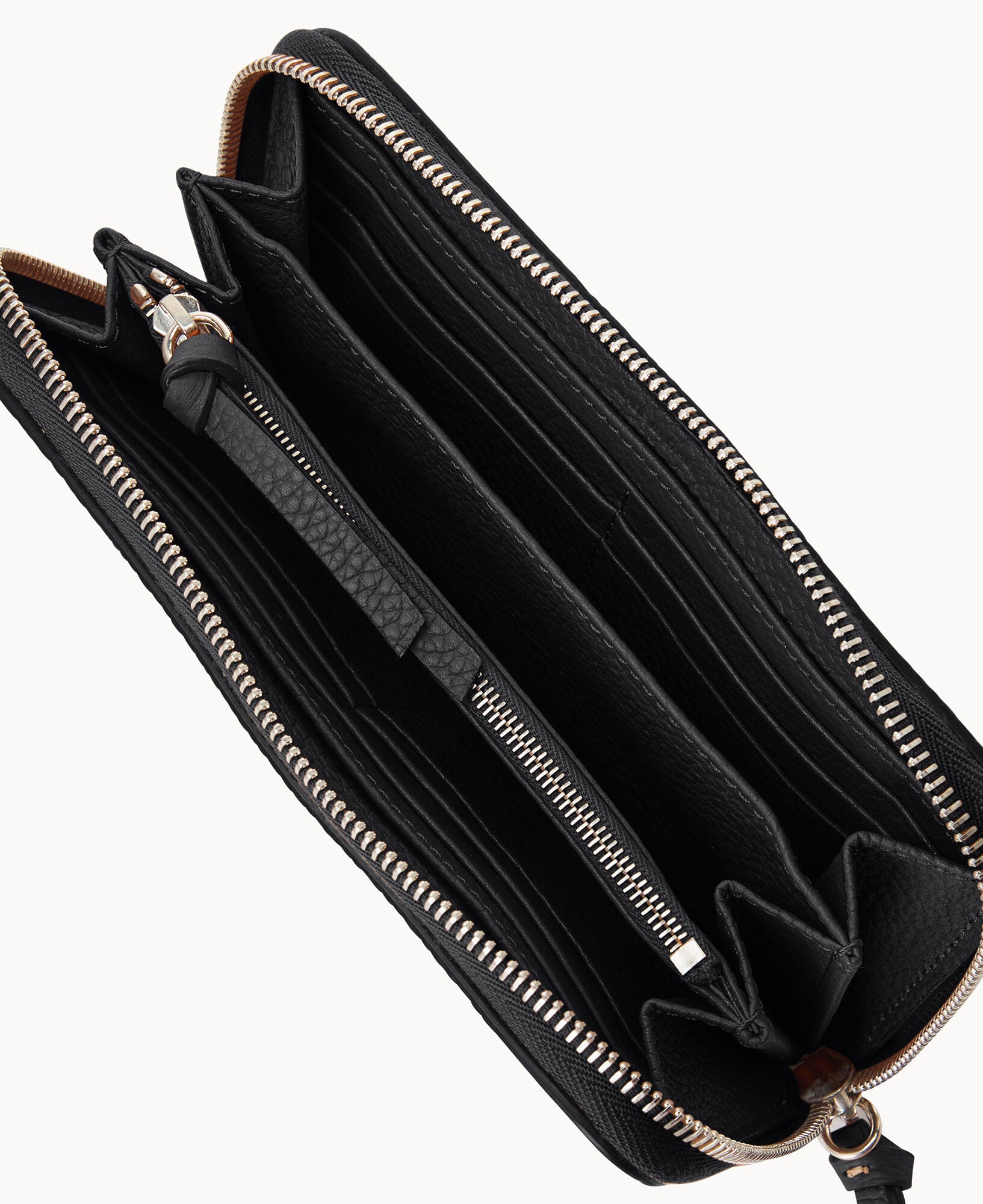 One inside zip pocket. Three inside pockets. Twelve credit card slots. Detachable wrist strap. Lined. Zipper closure.