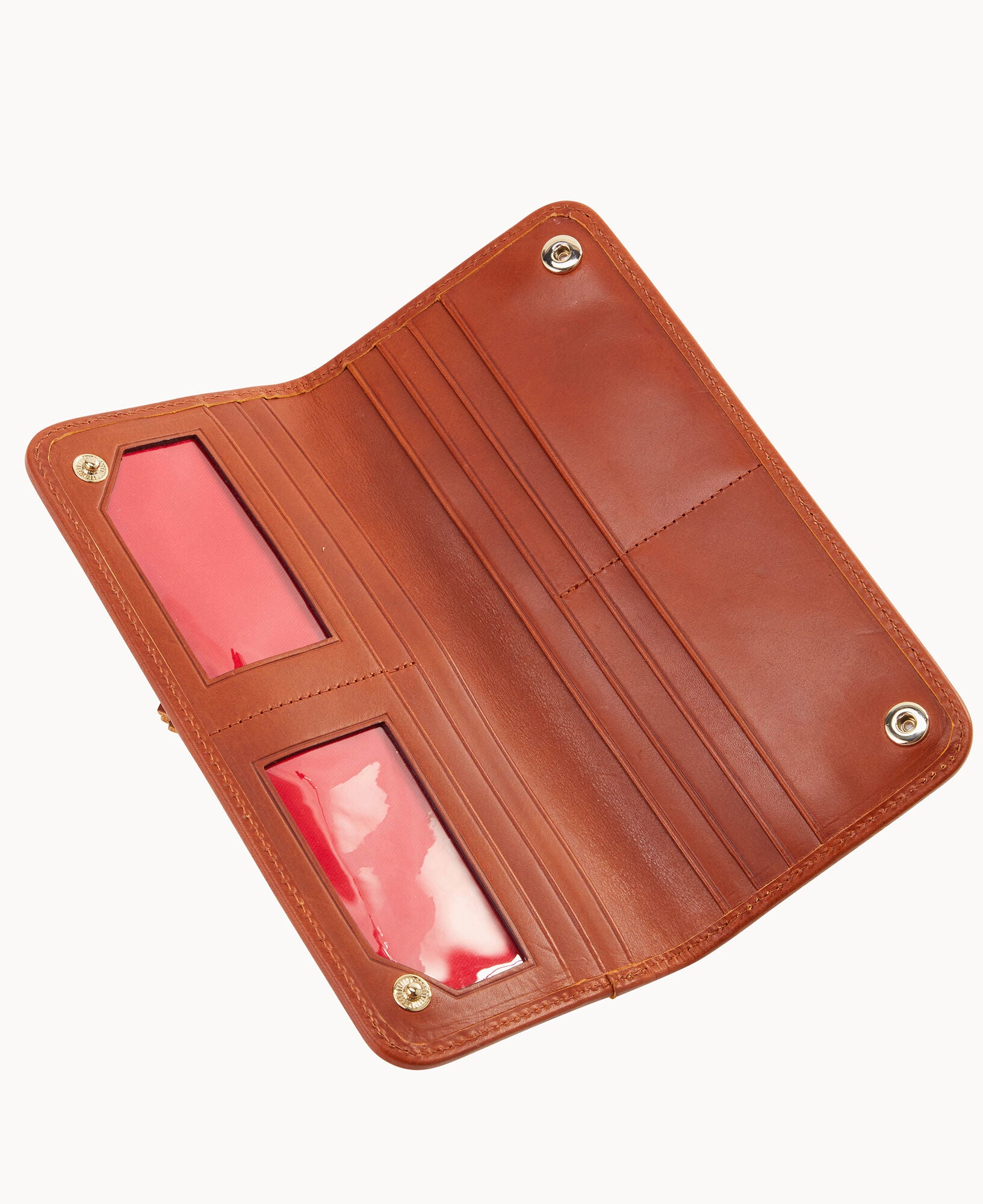 One outside zip pocket. License pocket with window. ID window. Two bill compartments. Six credit card slots. Lined. Snap closure.